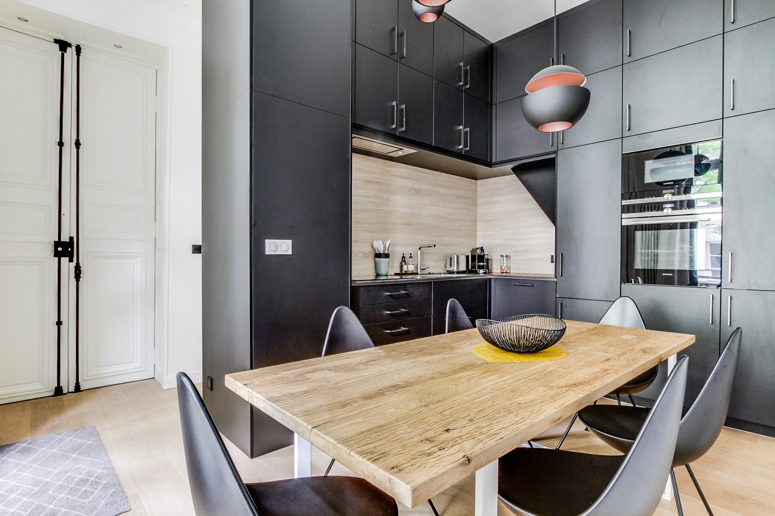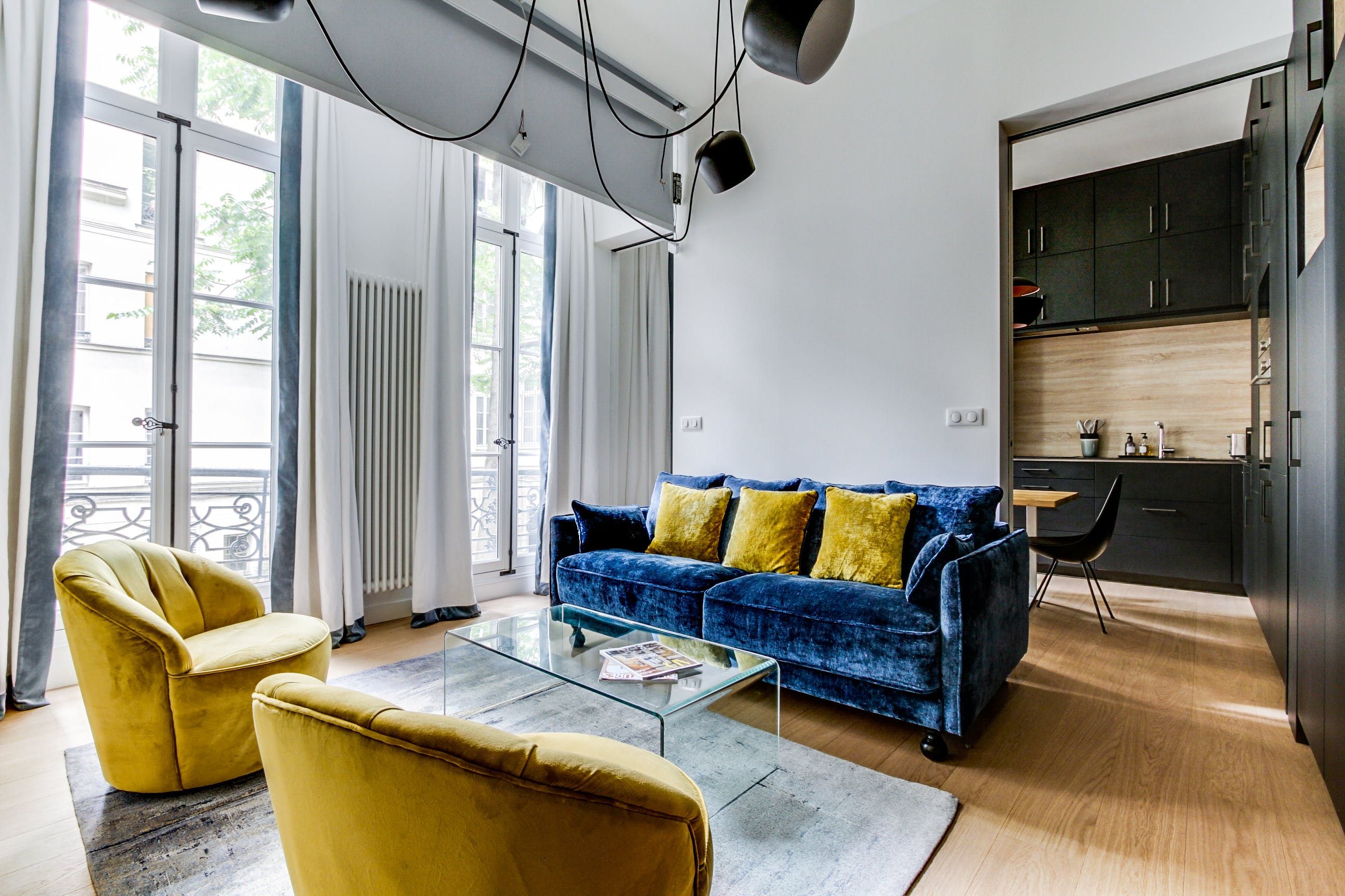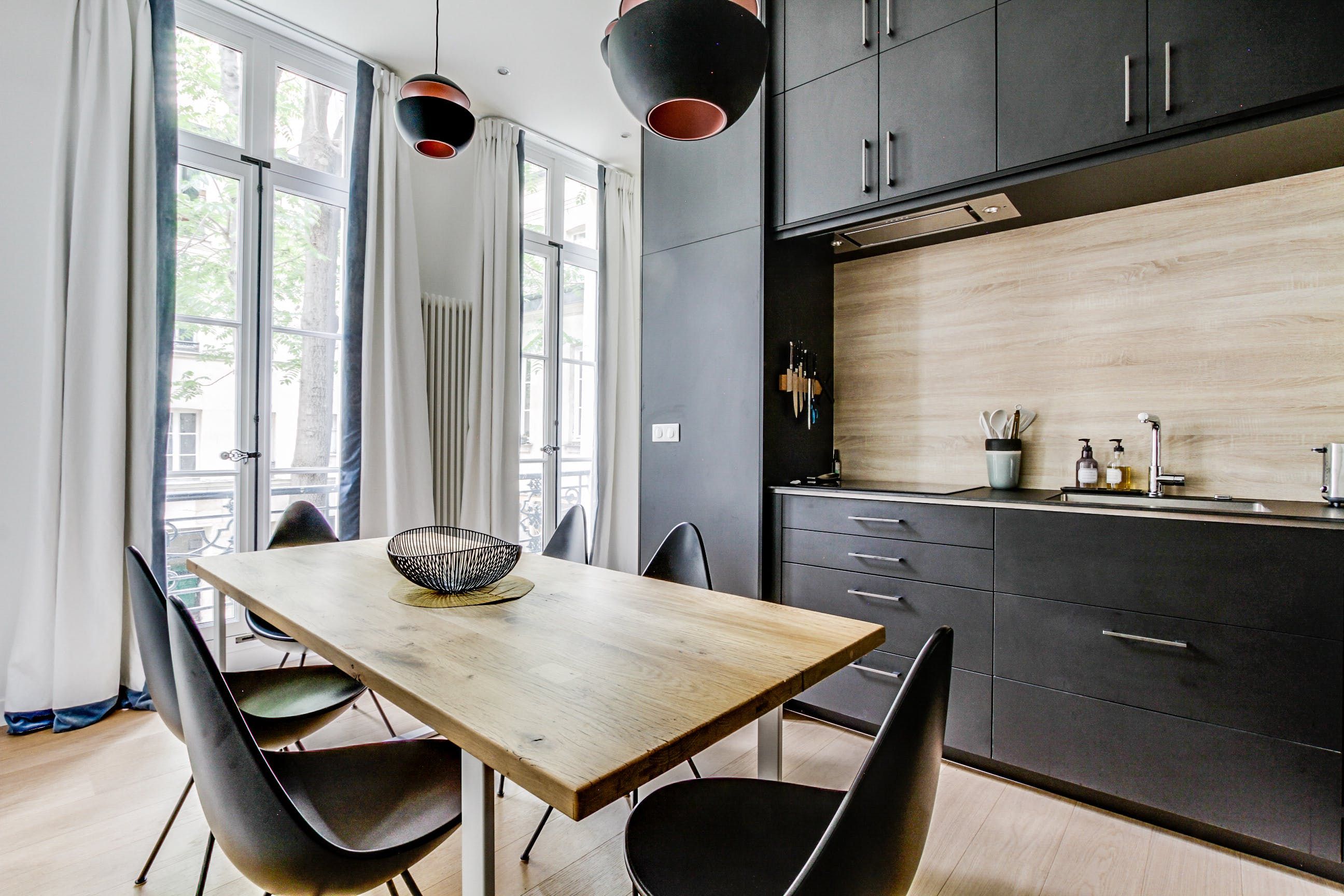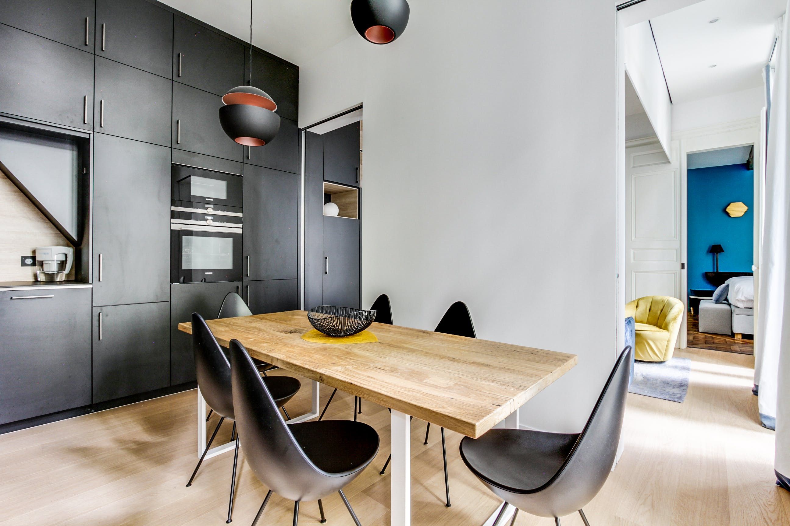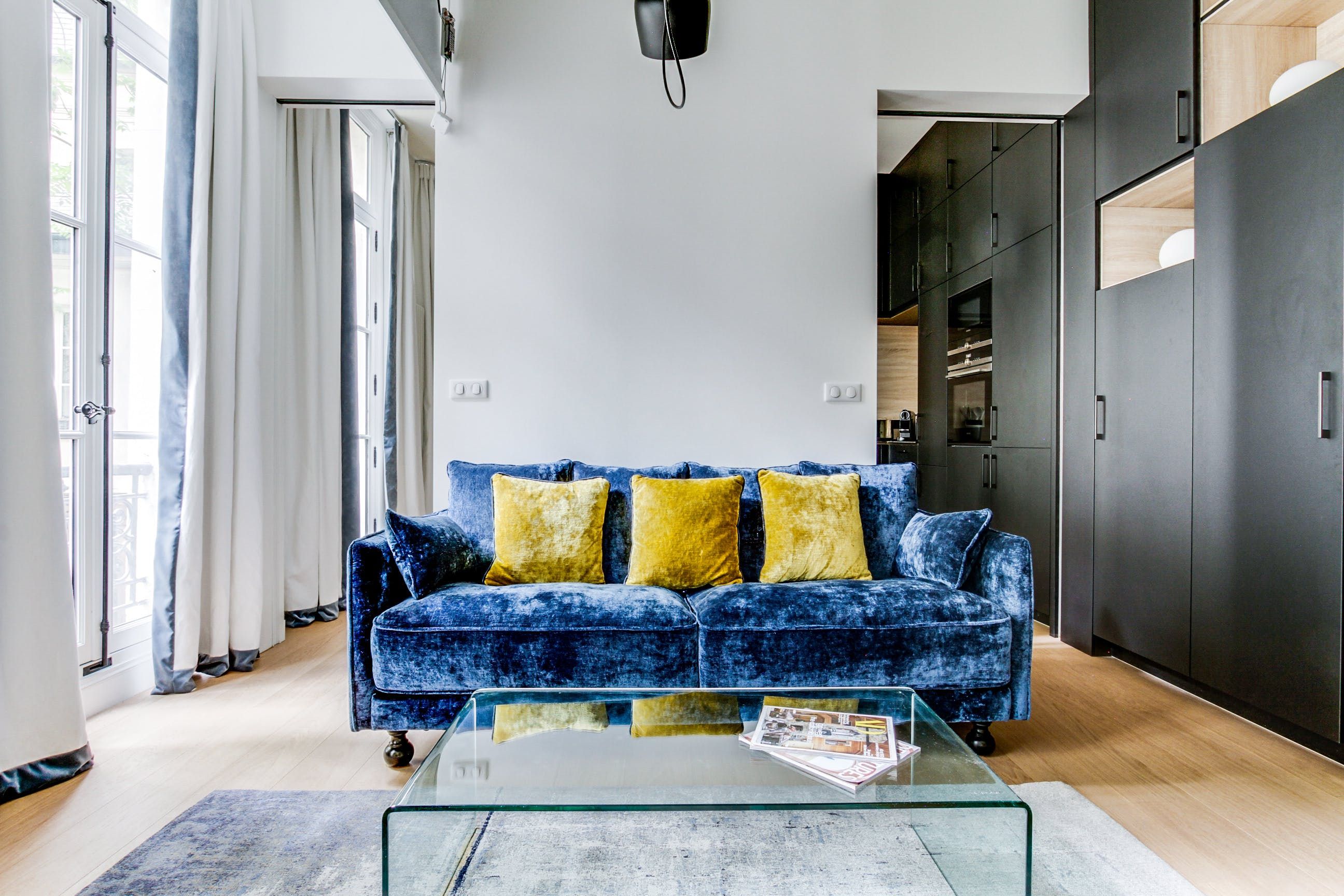Classic, French floor-to-ceiling windows flood the living room with natural light, and the midnight-blue velvet sofa is an inviting spot to put your feet up after a long day exploring the city. Striking black cupboards lead from the living room to the dine-in kitchen, which has everything you need for self-catering. The plush bedroom has an original fireplace and towering bed for a good night’s sleep.
