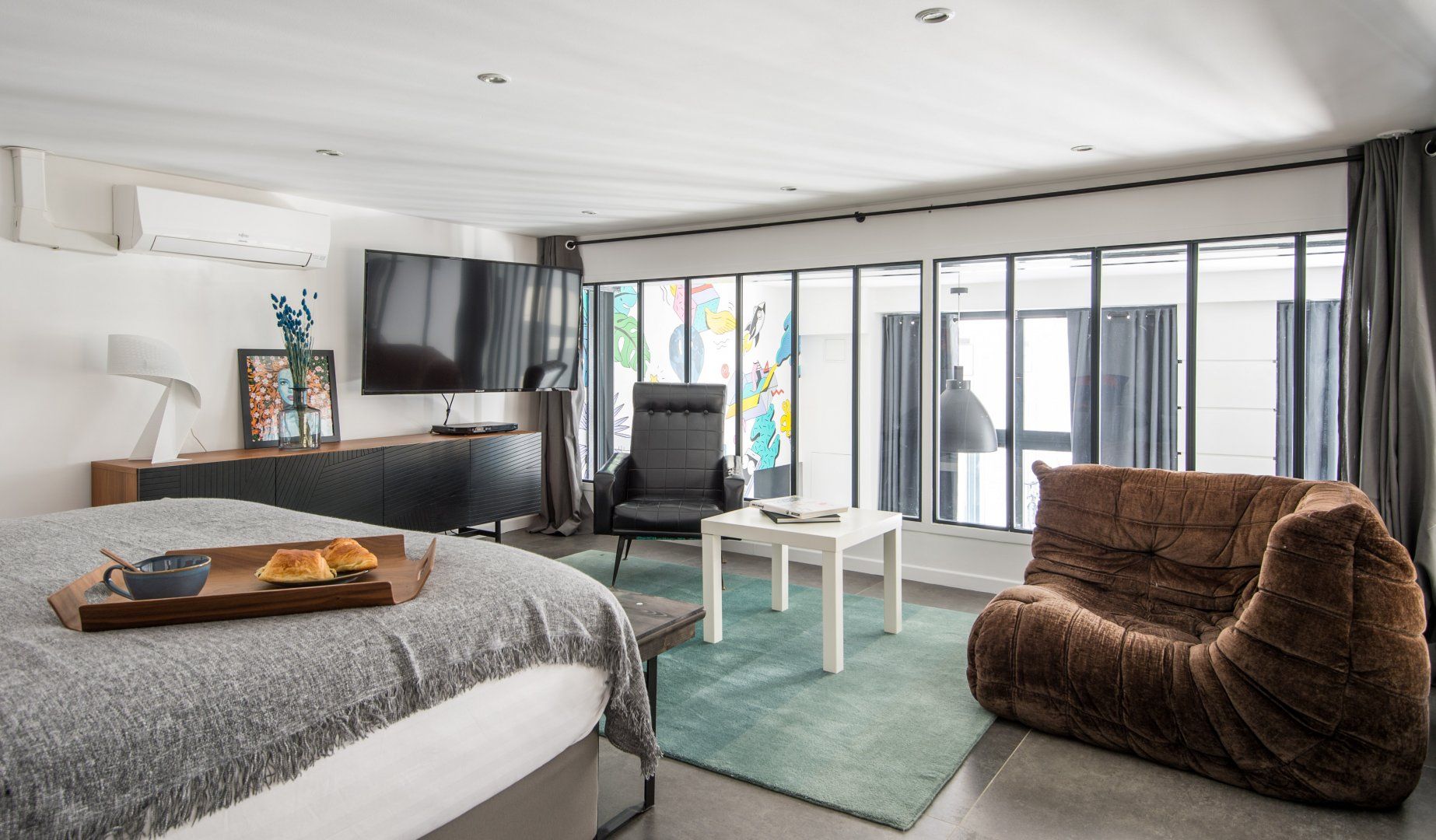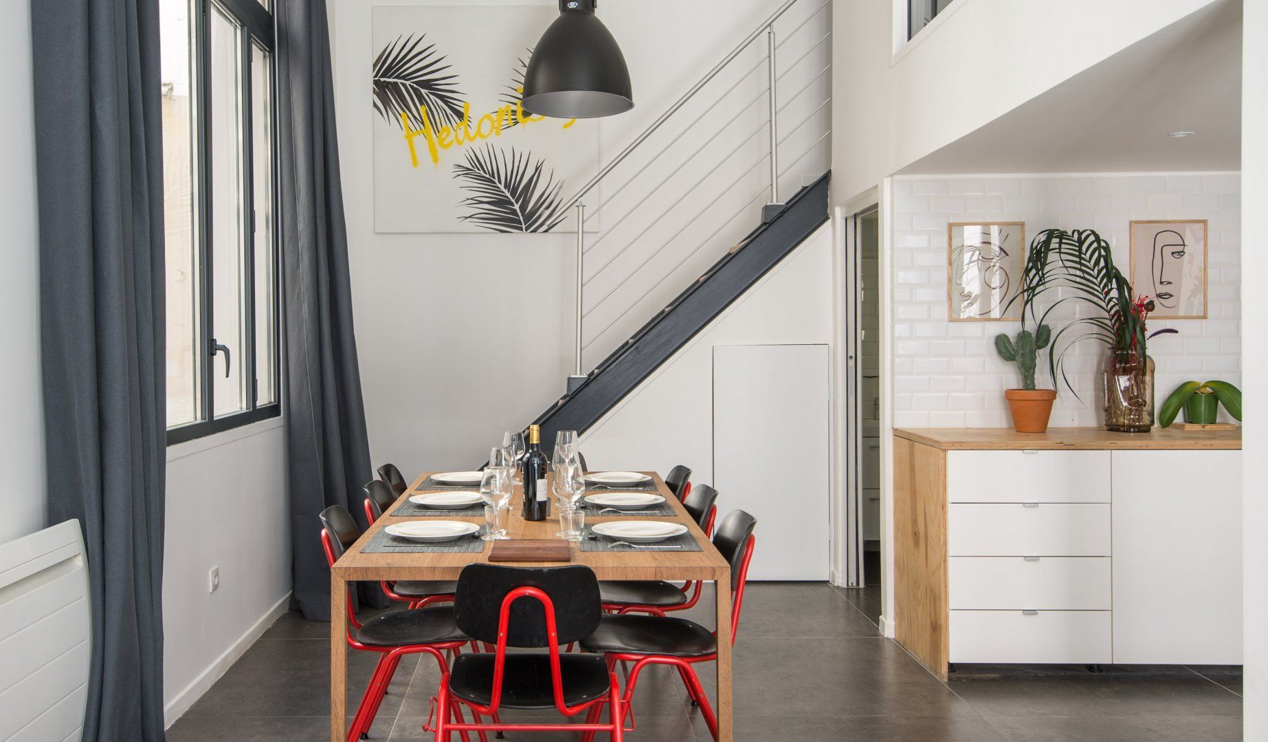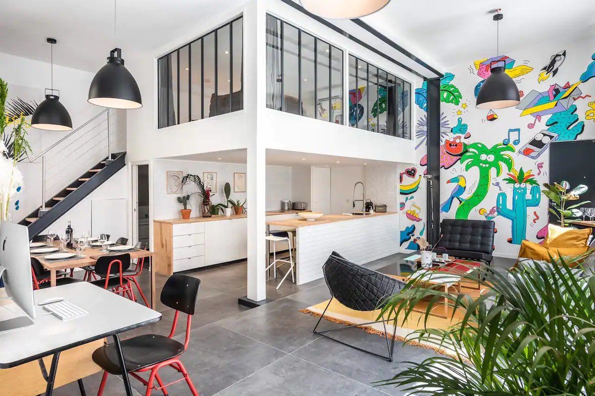 This artist’s loft might boast some incredibly quirky decor, but it certainly does not feel out of place in the hip Canal Saint-Martin area. Tucked away on a quiet block within this arty quarter, the clean, white facade simply cannot prepare you for the interiors. A joyous cacophony of art and design sings out to you from the moment you step inside. With a unique cartoon mural and Keith Haring-style feature walls, feast your eyes on a space that feels nothing like traditional Paris. The light-hearted and colourful decor is contrasted by the classy dining area, and the sophisticated architecture of the mezzanine bedroom floor. As much as you might like to stay in, the local area is also full of vibrant surprises. Ten minutes away on foot, head for dinner and drinks at the Cour des Petites Écuries, a cool area for eating out with local creative types. And just fifteen minutes from home, one of the city’s oldest districts, Le Marais, is the place to go for unique shops, cafés, and cocktails. Of course, some classic sights of Paris are close by. Place de la République is only a five-minute walk and is also home to a metro stop – ideal for exploring further afield.