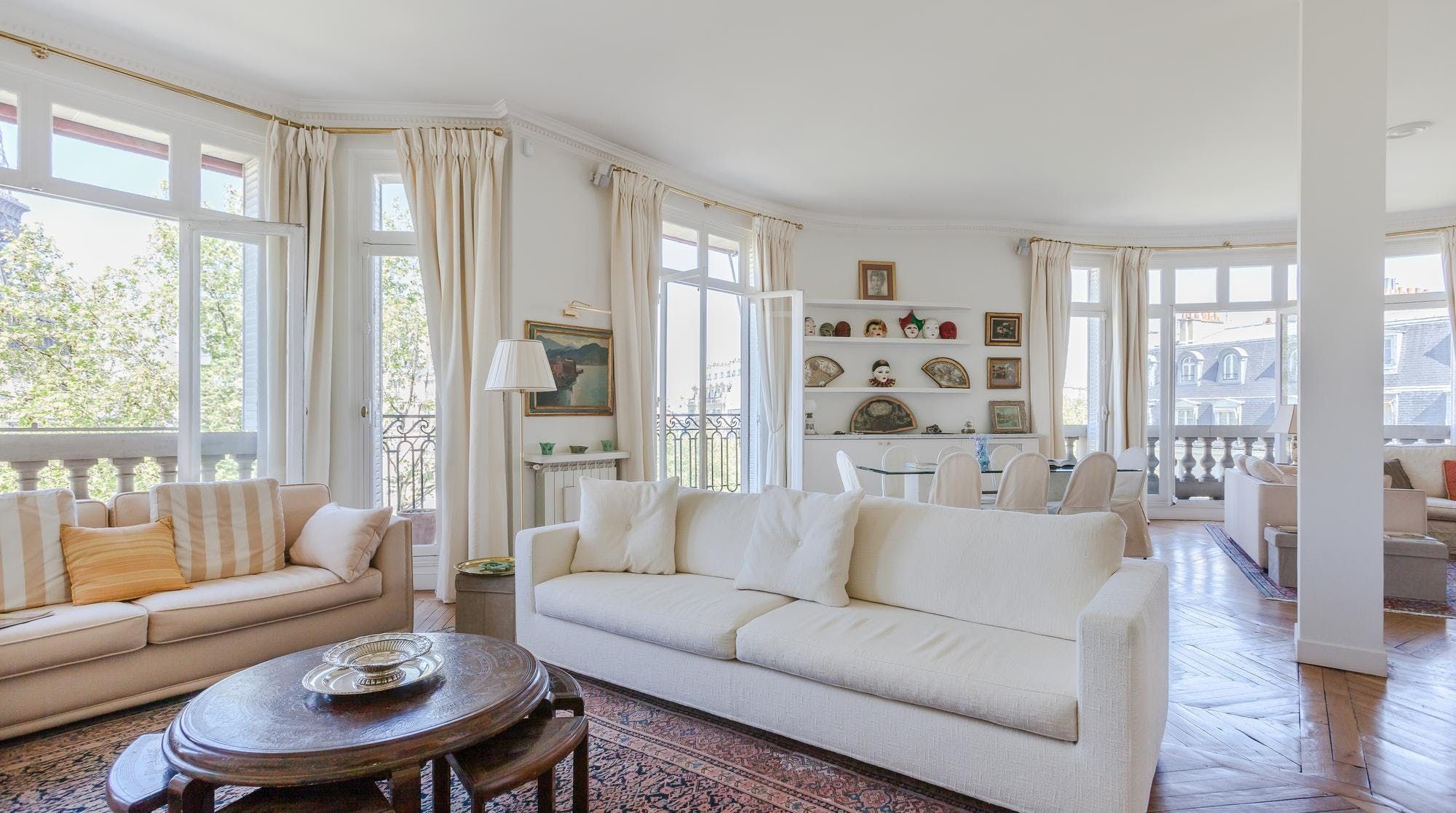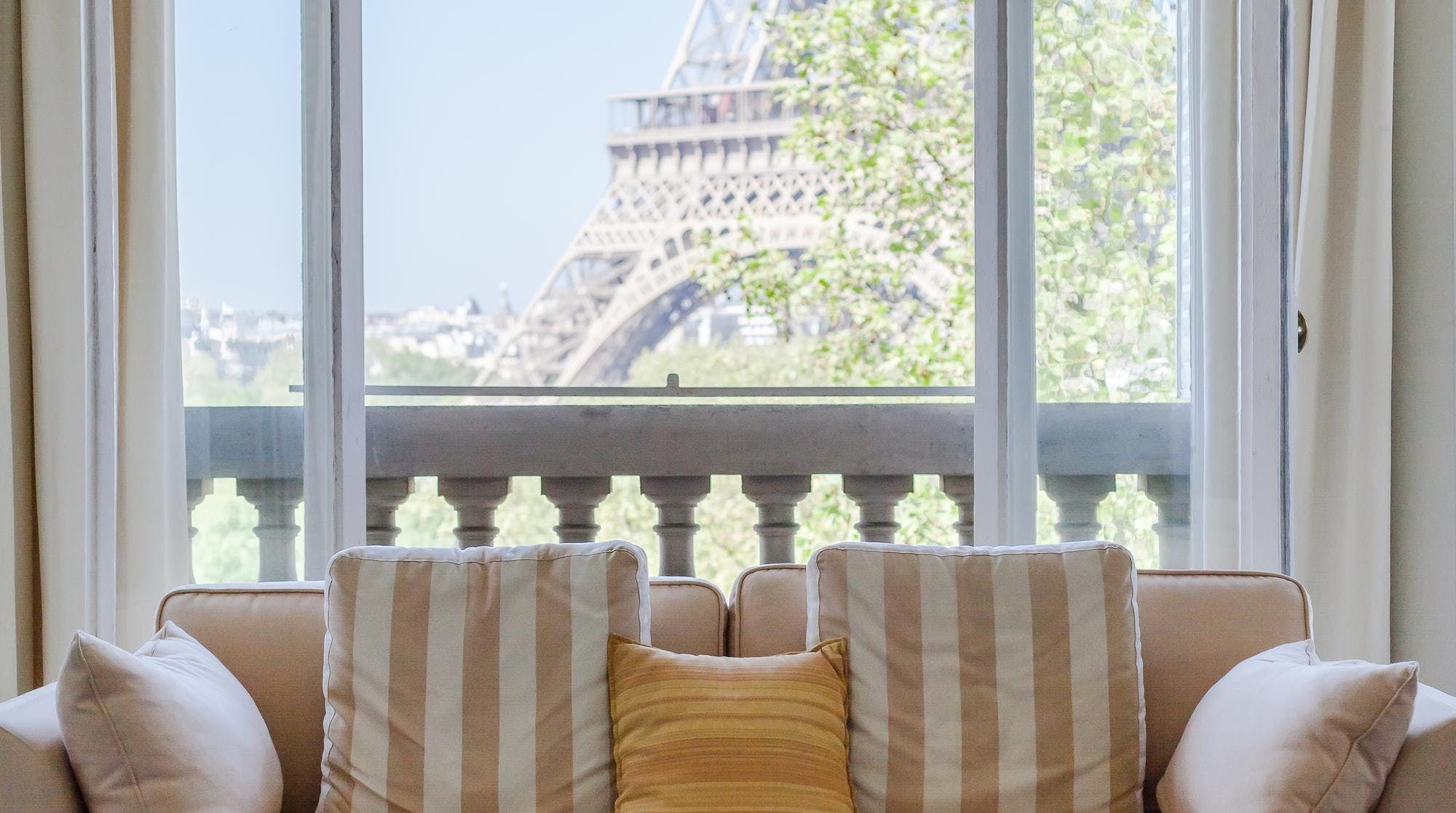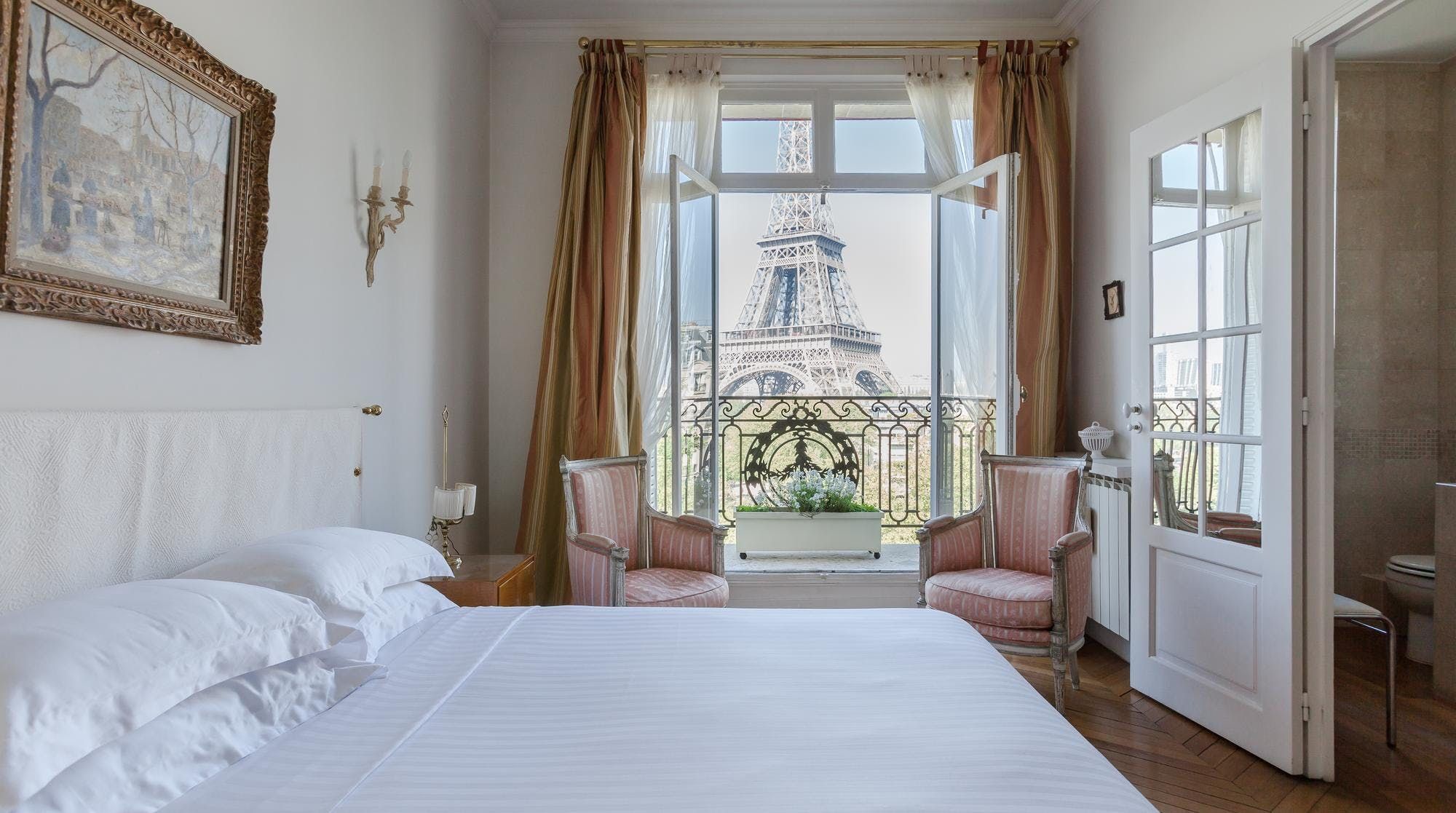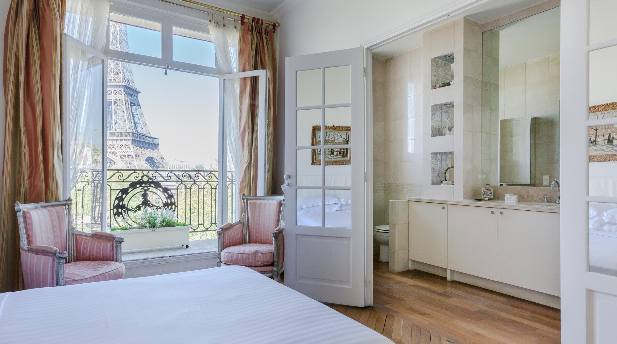 This elegant two-bedroom apartment on the edge of the Champs de Mars gardens boasts some of the most spectacular views of the Eiffel Tower from almost every room. The light flooding in through the large bay windows in the sitting room also make this space perfect for a late afternoon apéritif. In short, it's the ideal home for a group of friends or two couples looking for a quintessential Parisian apartment with romantic charm.