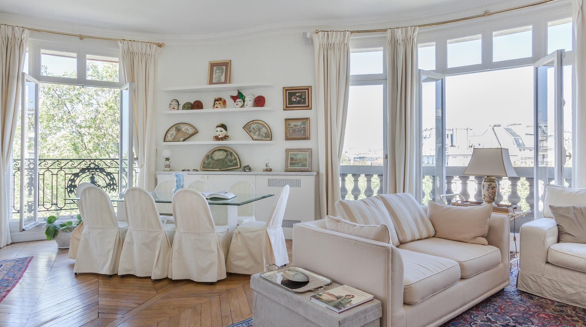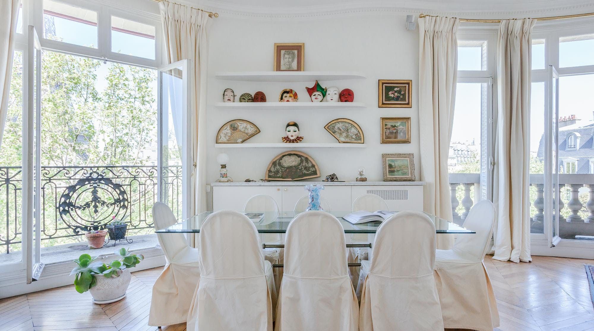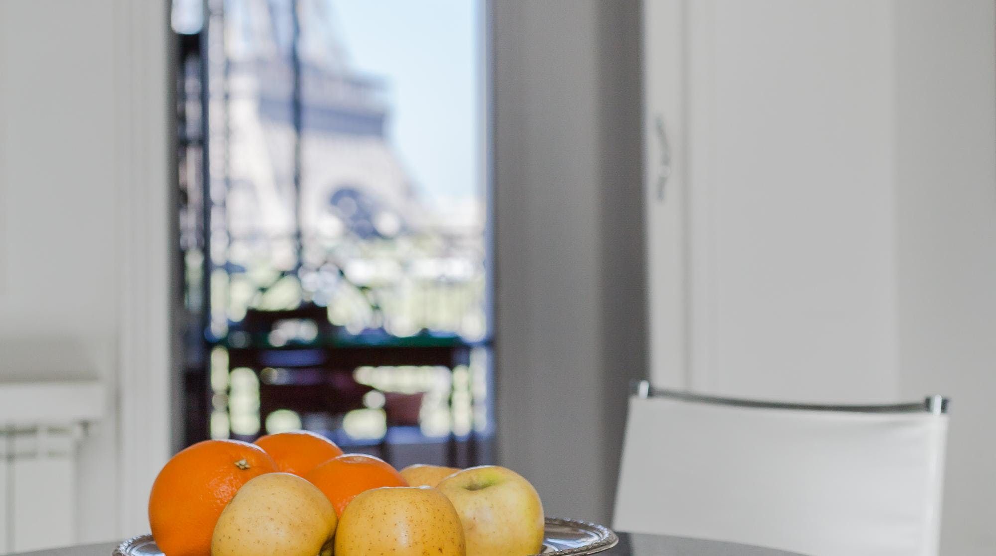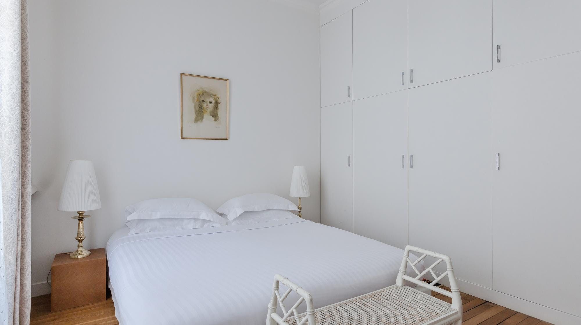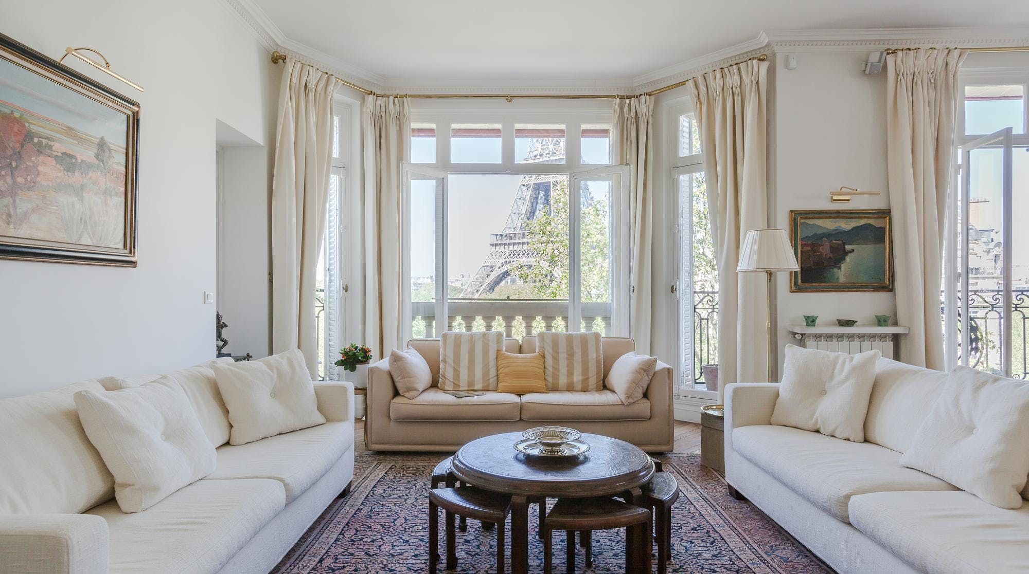 This elegant two-bedroom apartment on the edge of the Champs de Mars gardens boasts some of the most spectacular views of the Eiffel Tower from almost every room. The light flooding in through the large bay windows in the sitting room also make this space perfect for a late afternoon apéritif. In short, it's the ideal home for a group of friends or two couples looking for a quintessential Parisian apartment with romantic charm.