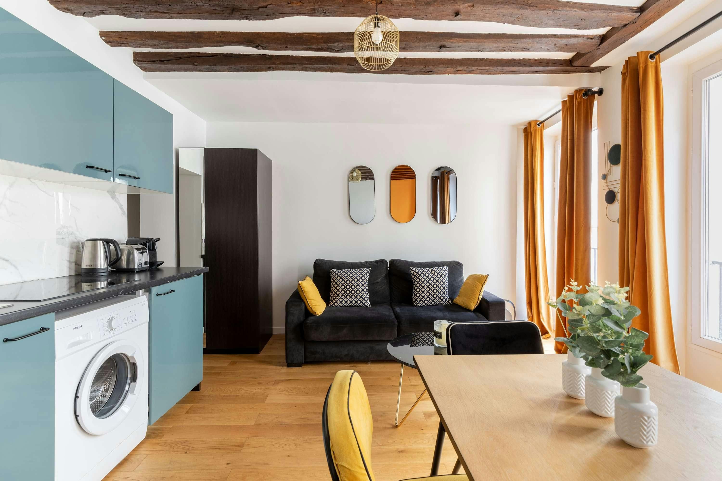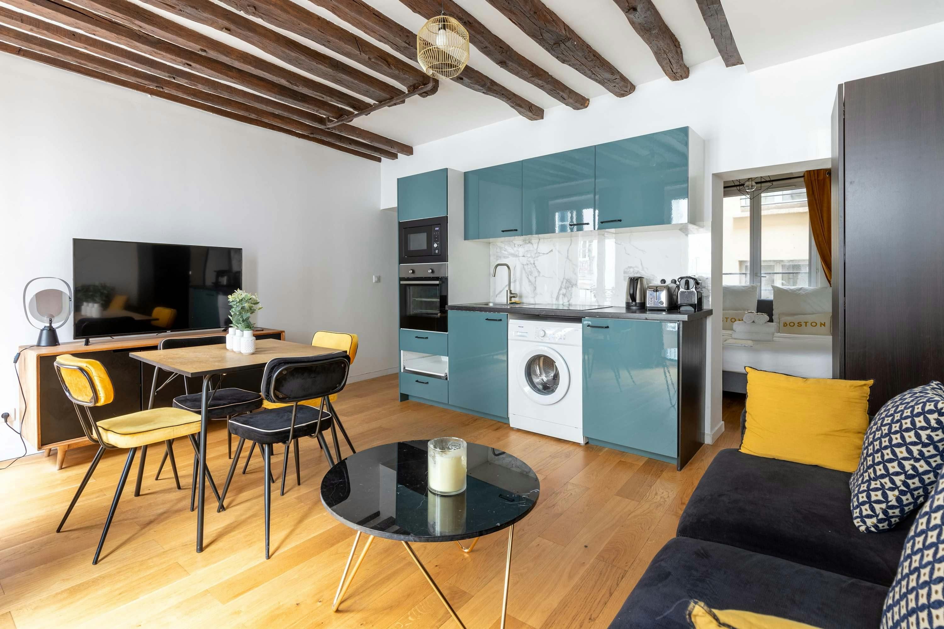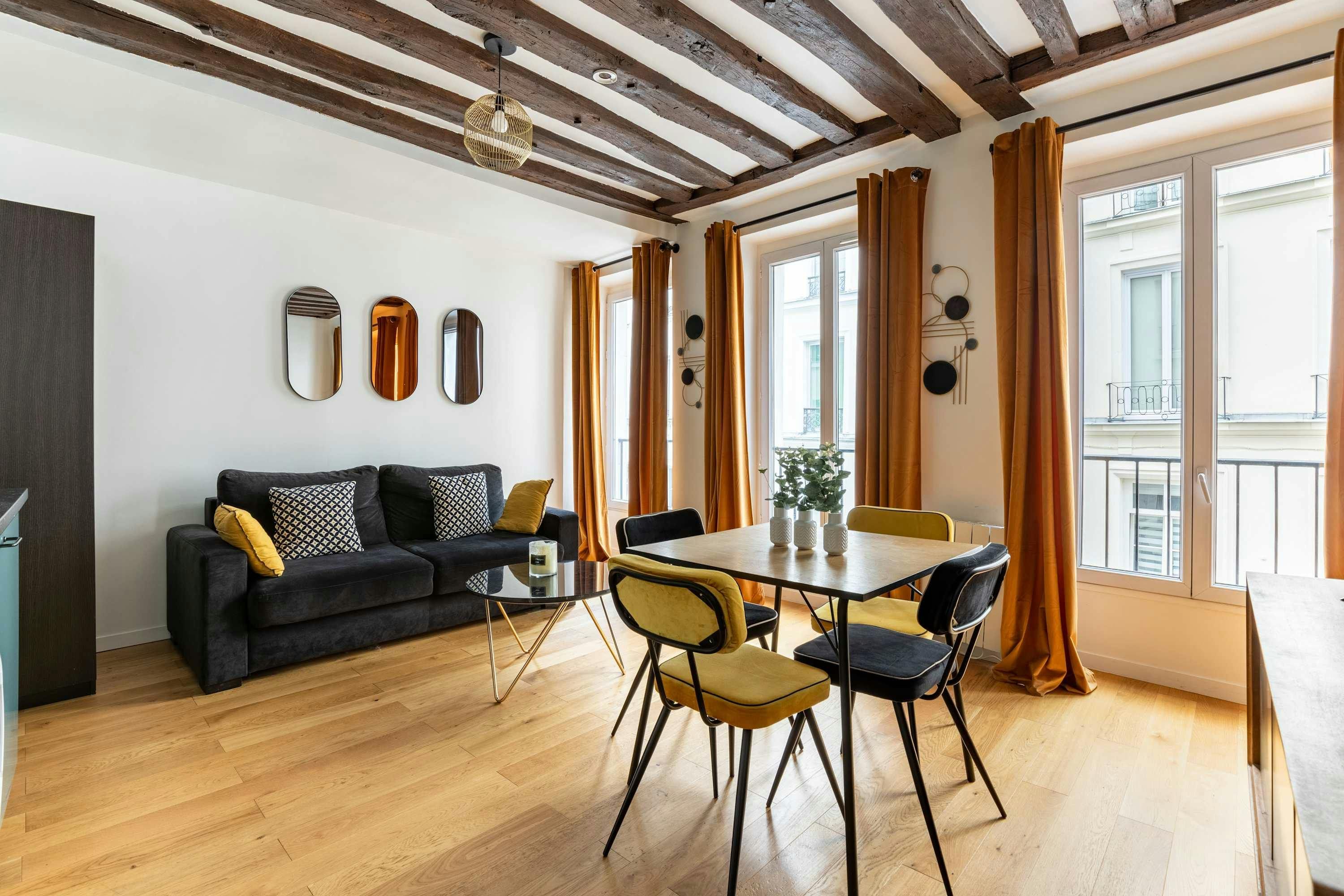 Snug but stylish, this apartment is a great option for a city getaway. The bedroom is on the cosy side, but the living space is where you'll do most of your relaxing – just note that two guests will sleep on a sofa bed. The compact kitchen is perfect for light bites, and character features like wooden beams and Juliet balconies add a Parisian touch. On your doorstep, you'll find plenty to keep you busy – including boutiques, restaurants, and metro stations. You can also walk to landmarks like the Louvre and Palais Garnier – win, win.