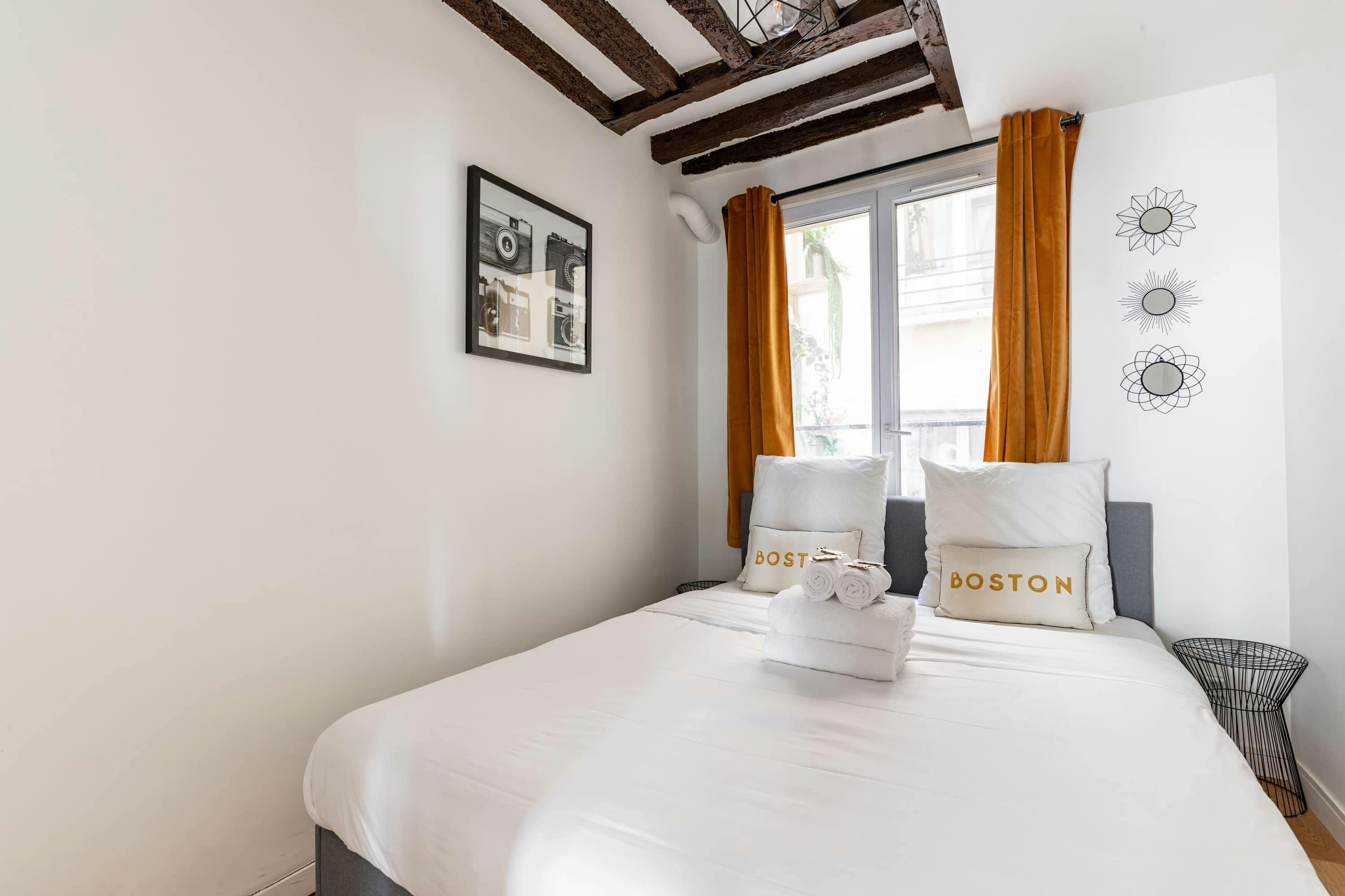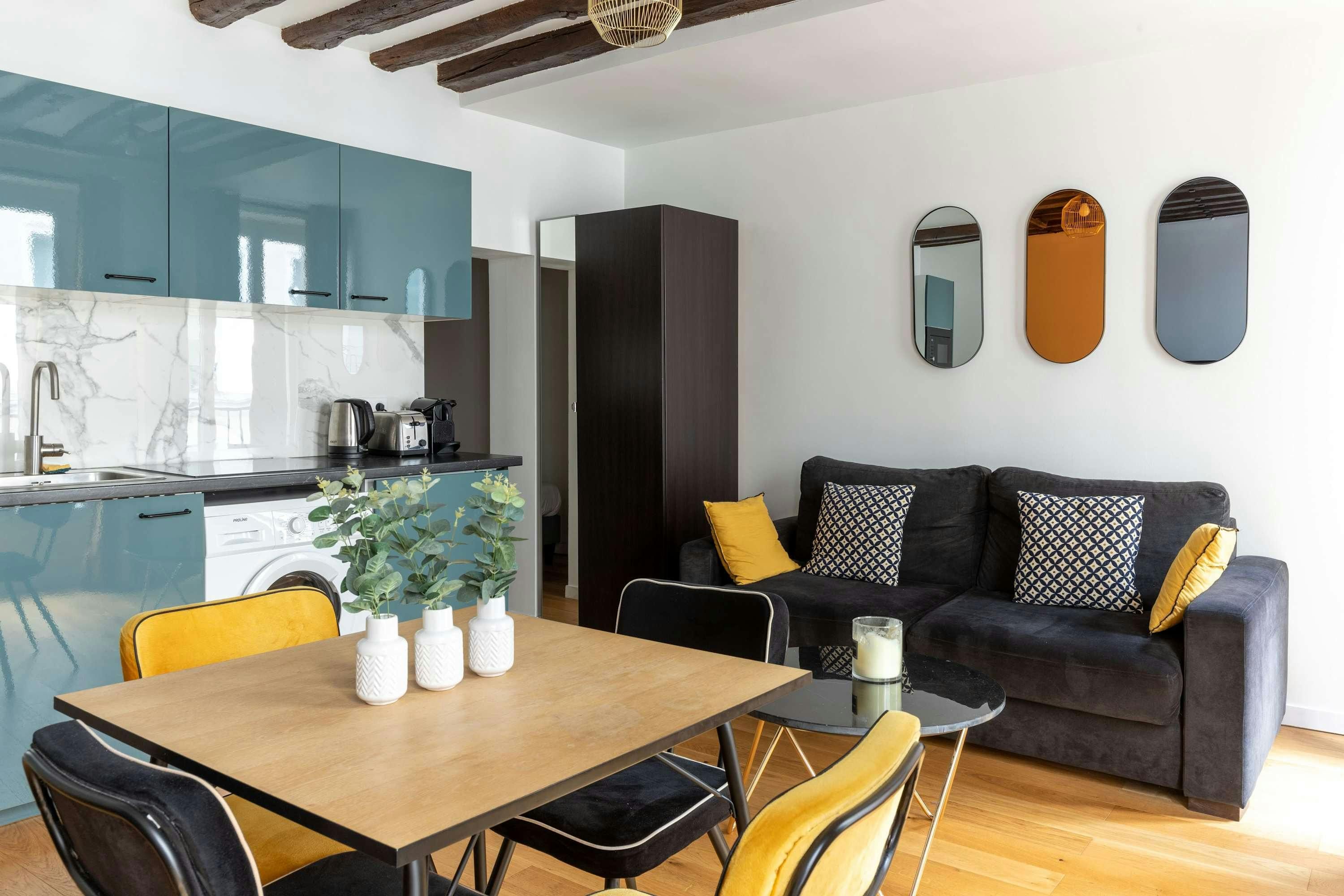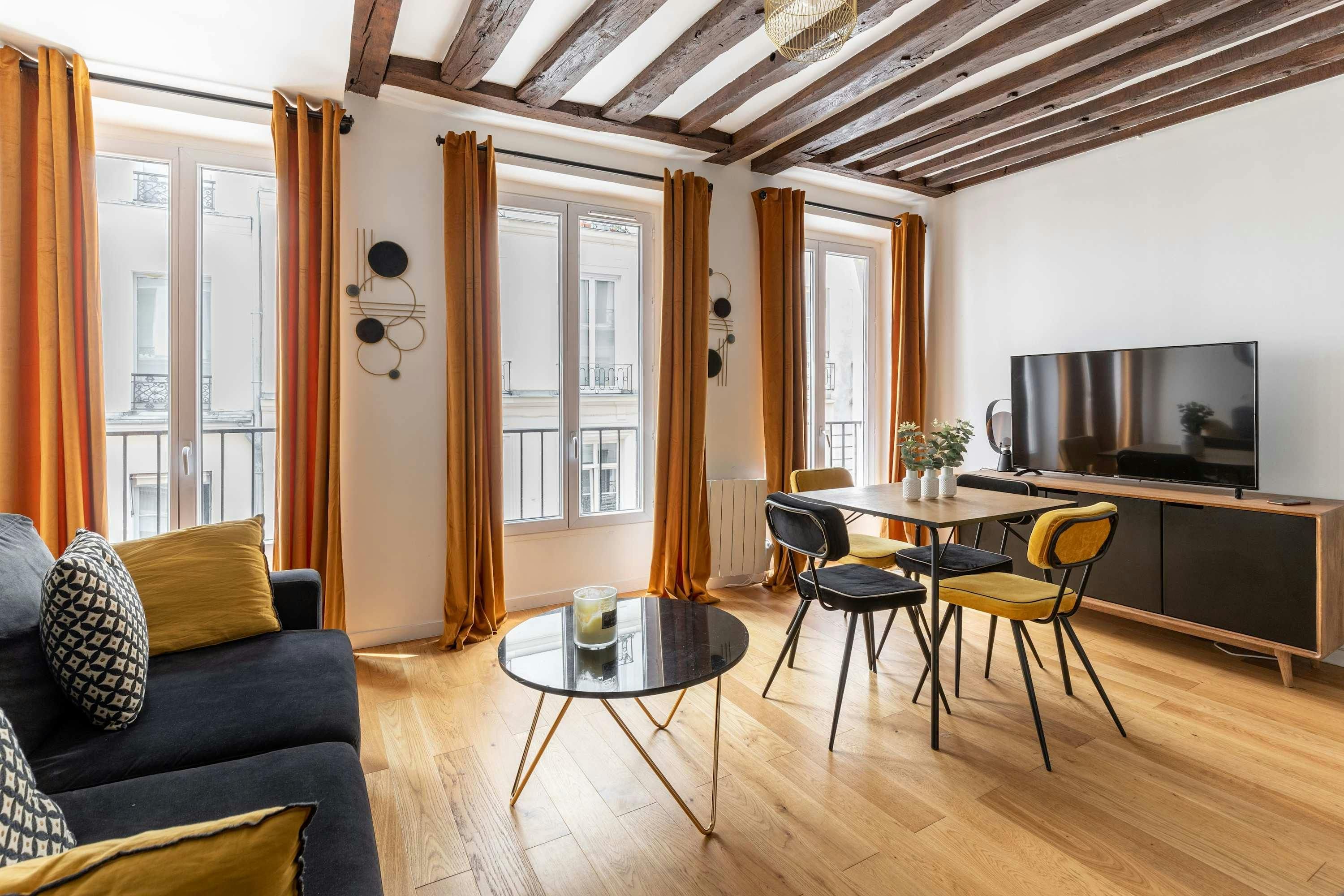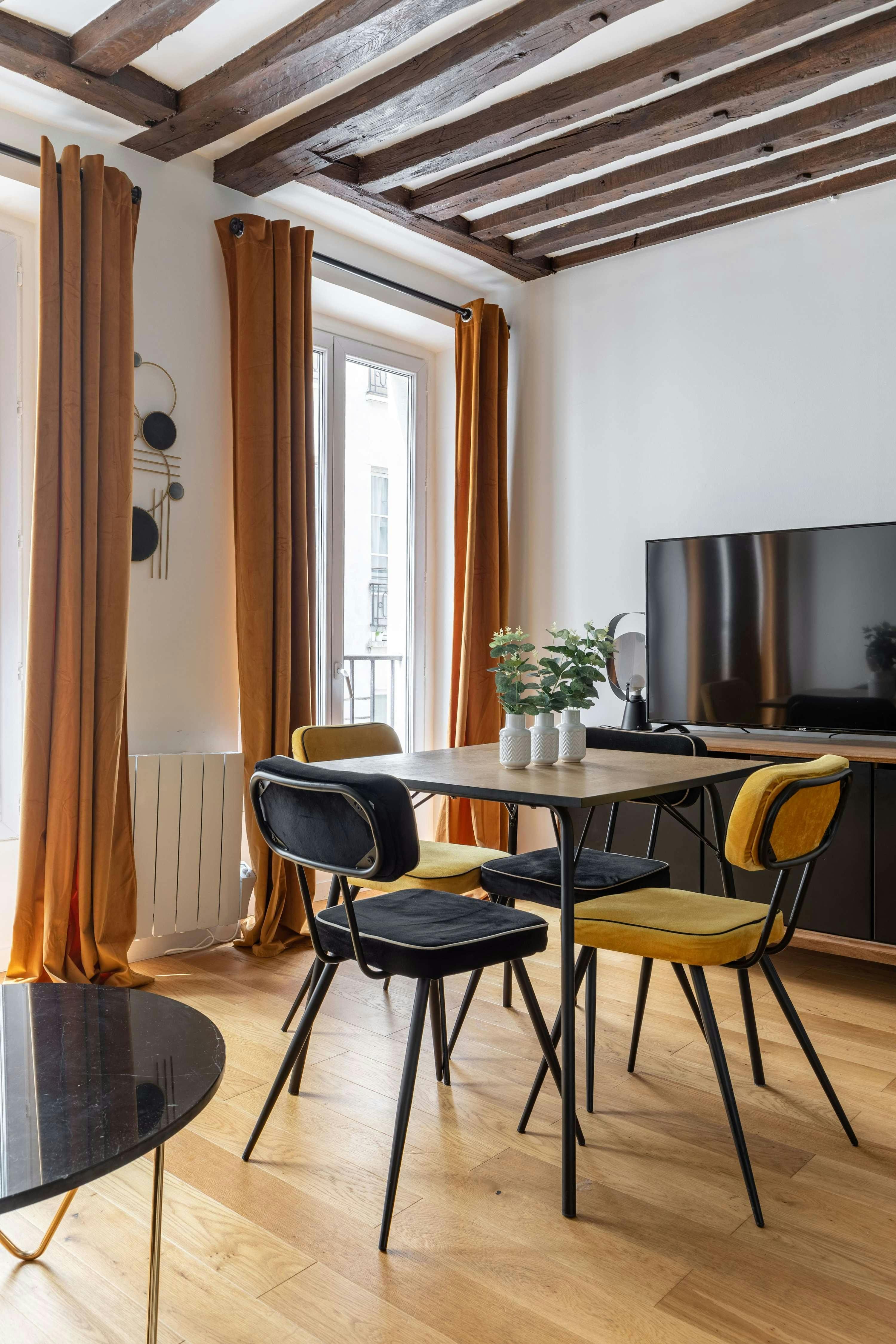 Snug but stylish, this apartment is a great option for a city getaway. The bedroom is on the cosy side, but the living space is where you'll do most of your relaxing – just note that two guests will sleep on a sofa bed. The compact kitchen is perfect for light bites, and character features like wooden beams and Juliet balconies add a Parisian touch. On your doorstep, you'll find plenty to keep you busy – including boutiques, restaurants, and metro stations. You can also walk to landmarks like the Louvre and Palais Garnier – win, win.