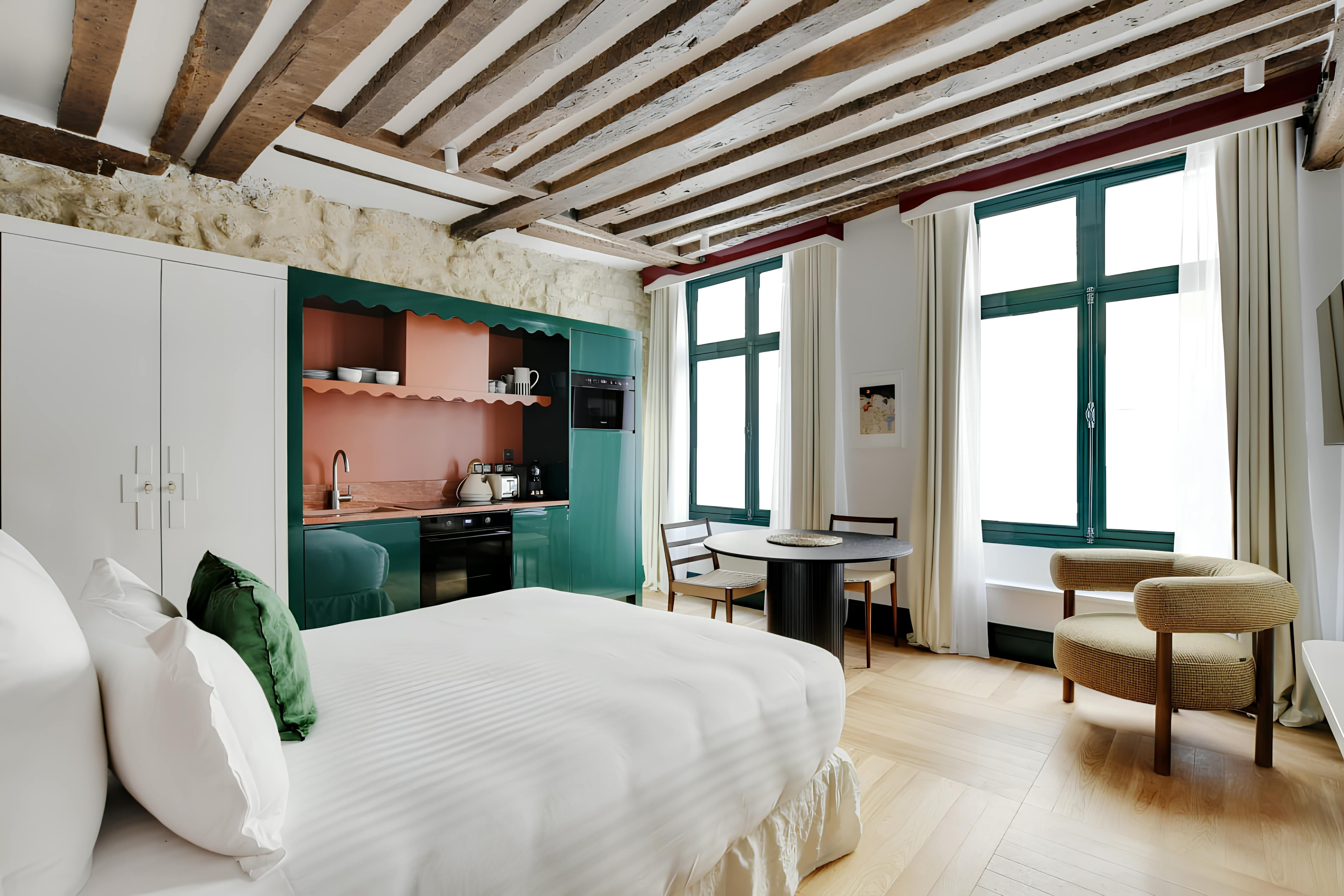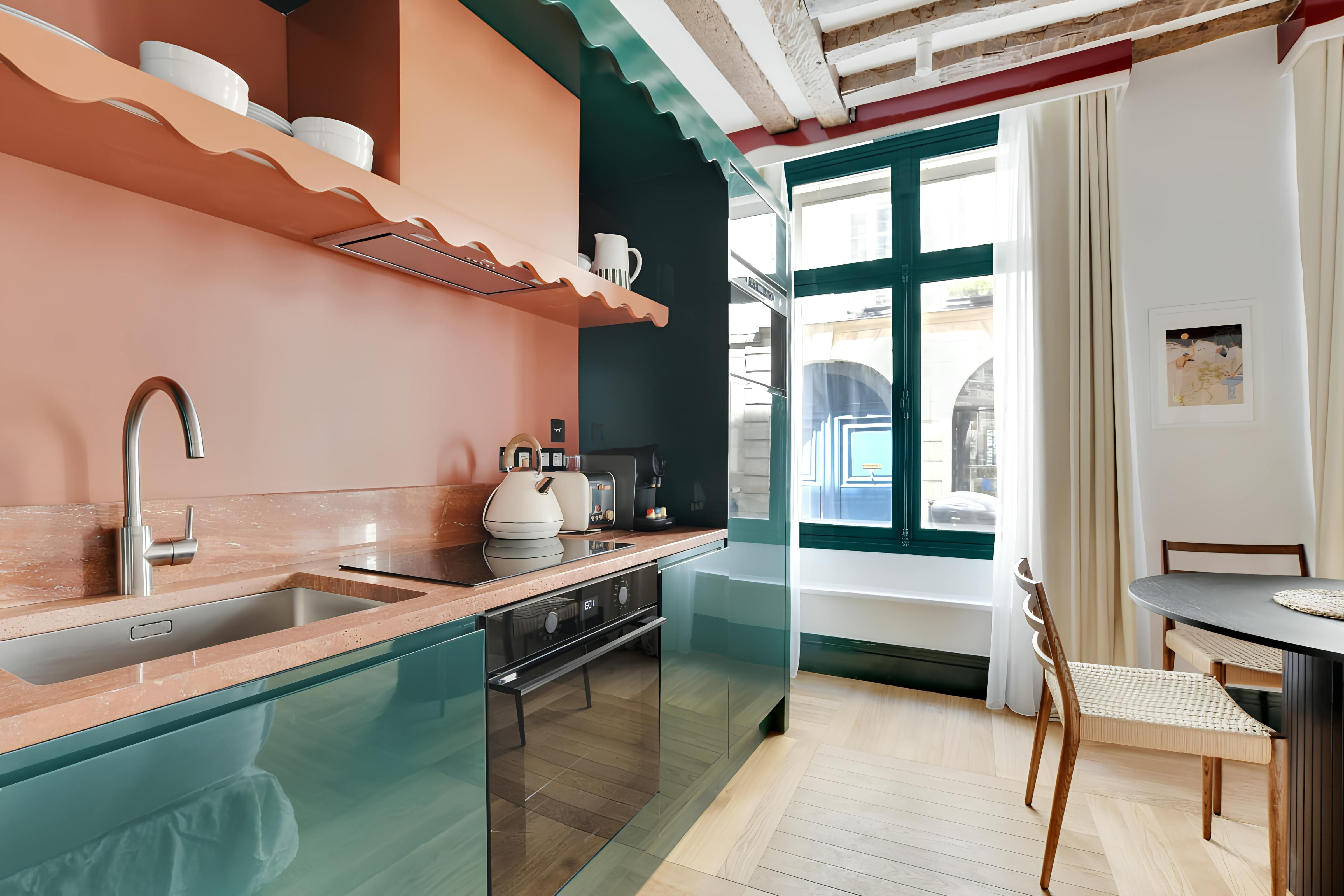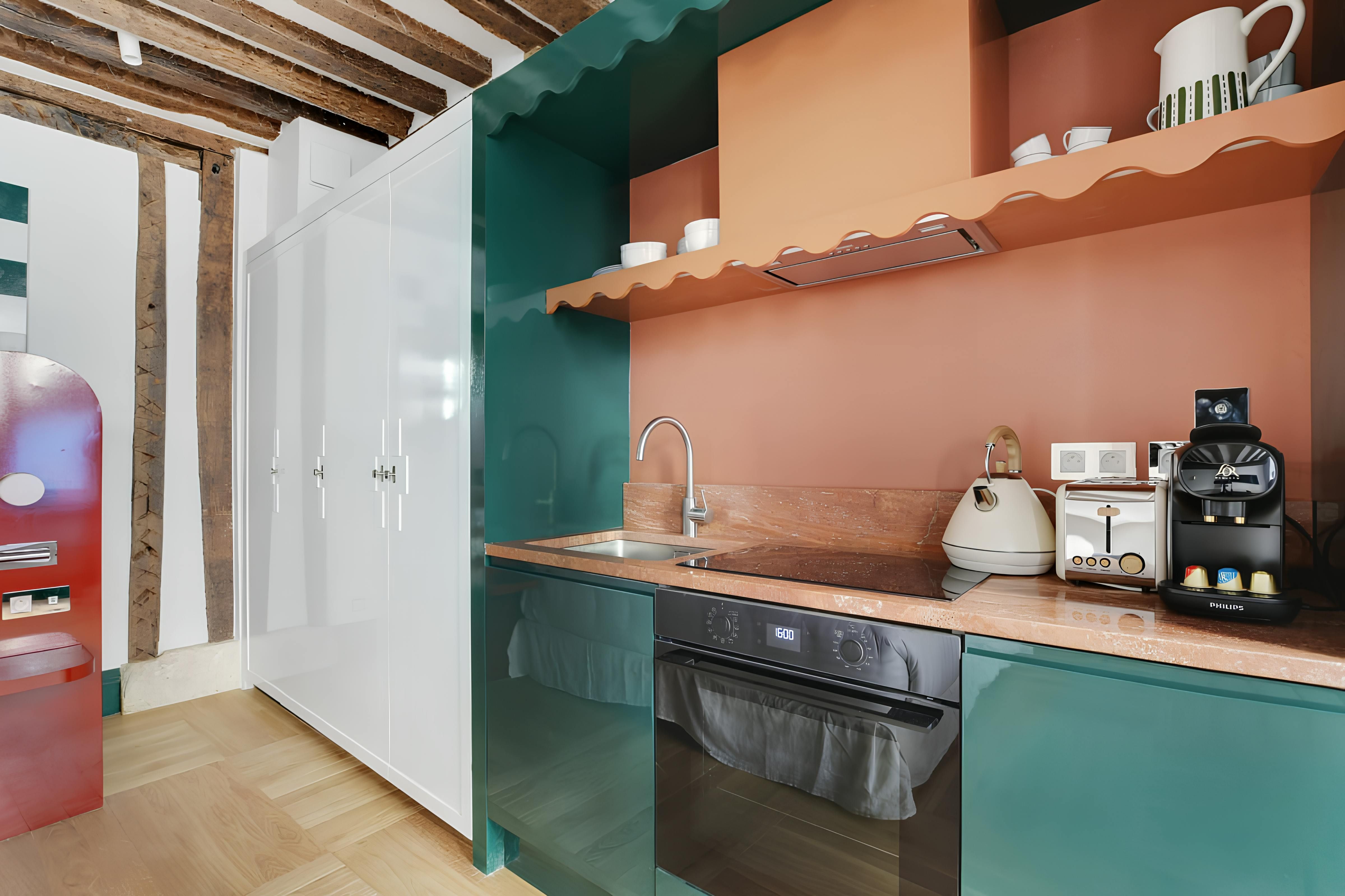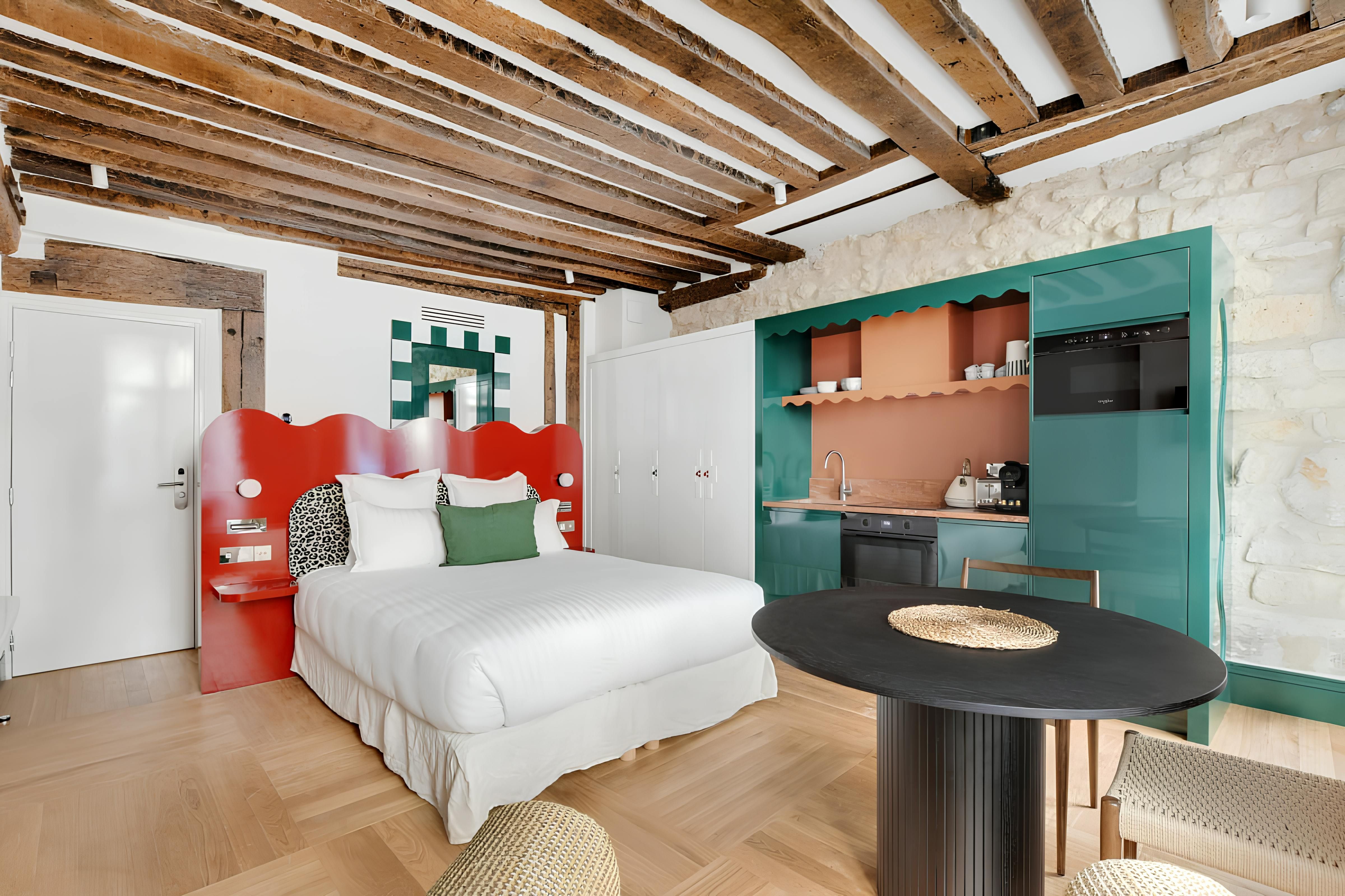 What this studio apartment lacks in space, it makes up for in style. Wooden beams on the ceilings, exposed stone walls, a curvy red headboard – the design doesn't play it safe. The kitchen is small, sure, but it's well-appointed to rustle up something easy. Even better, you'll find an array of top-notch eateries on your doorstep. Also nearby are landmarks like Notre Dame and the Louvre, independent shops like Shakespeare & Company, and a metro station for adventures further afield.