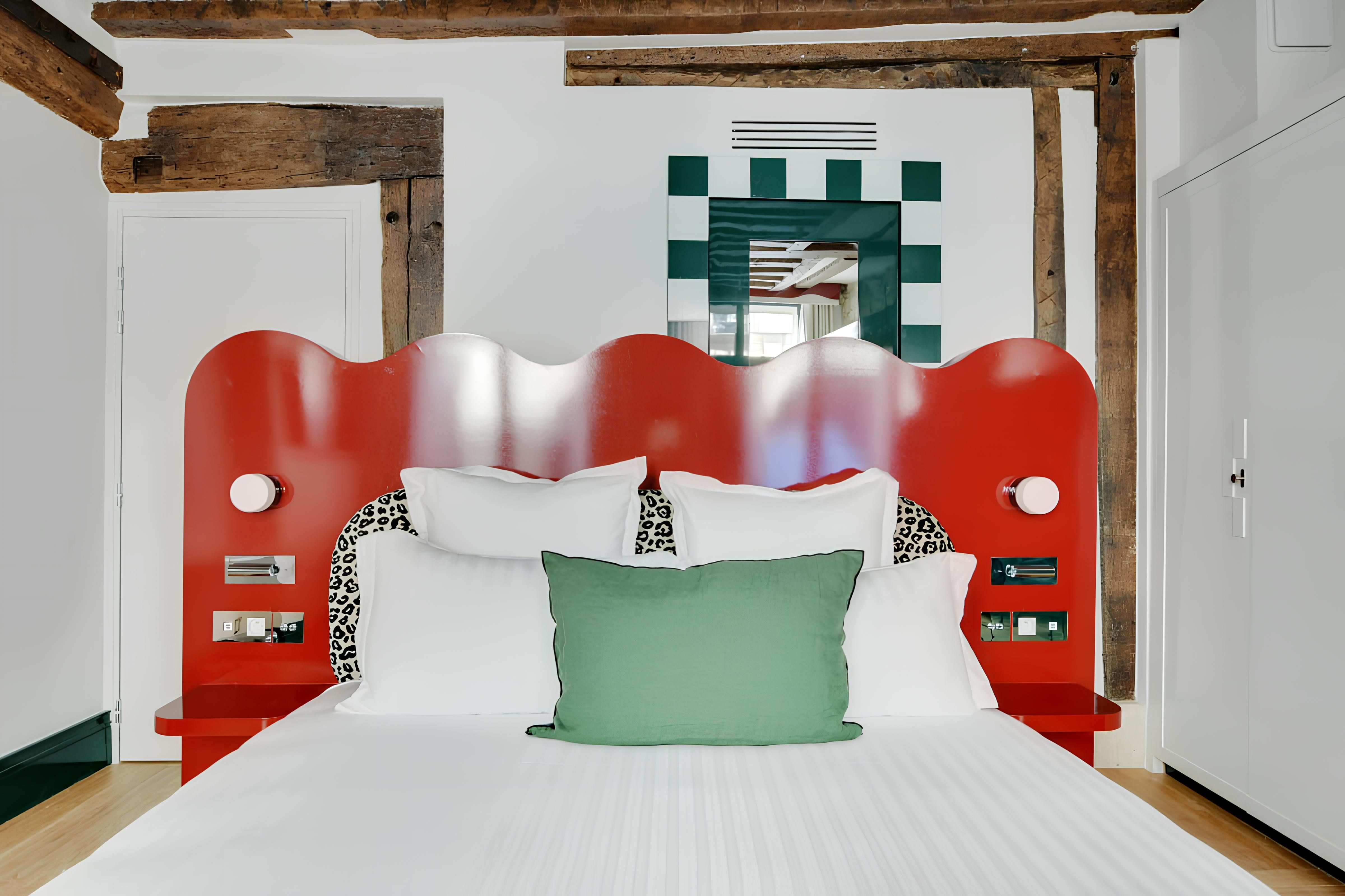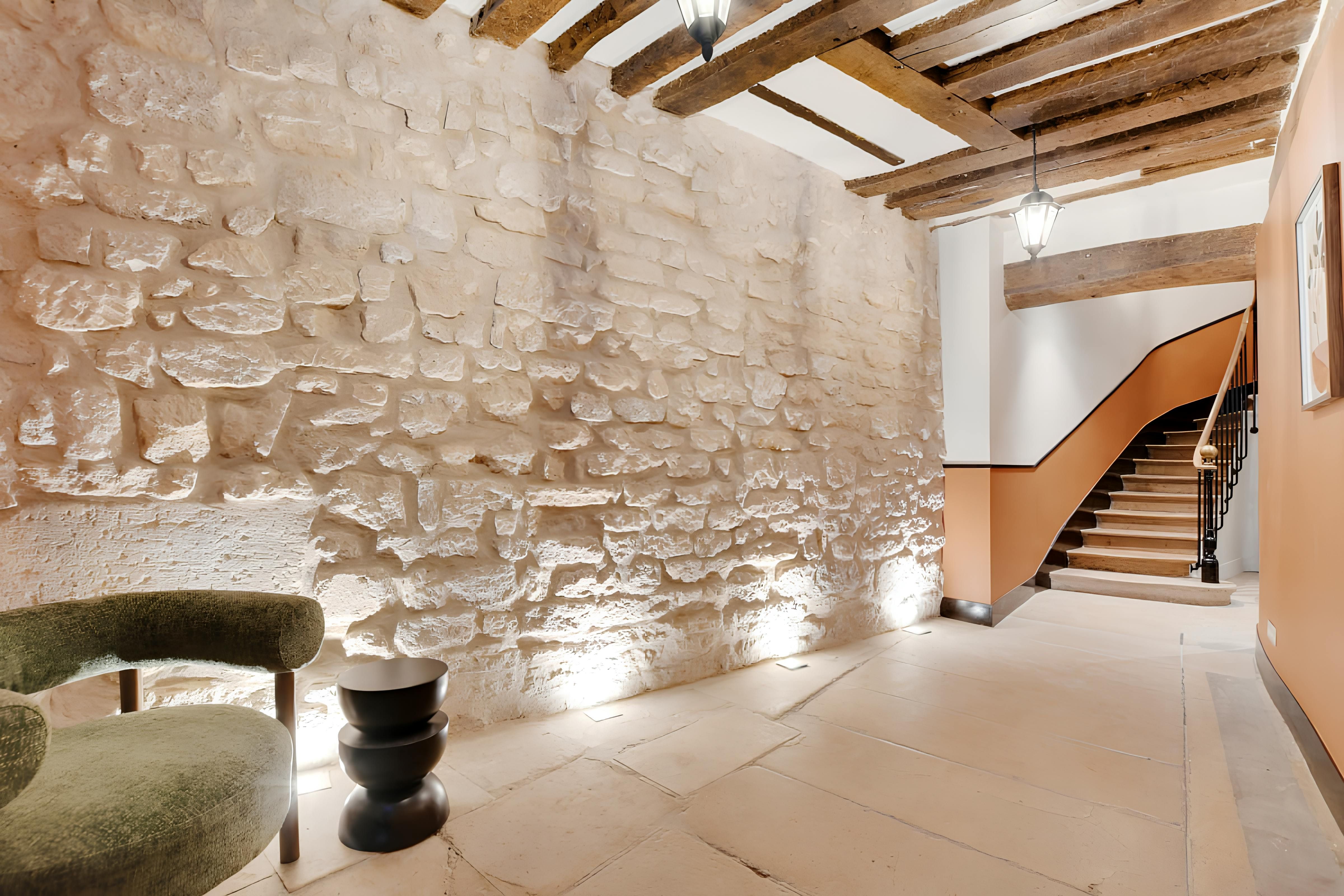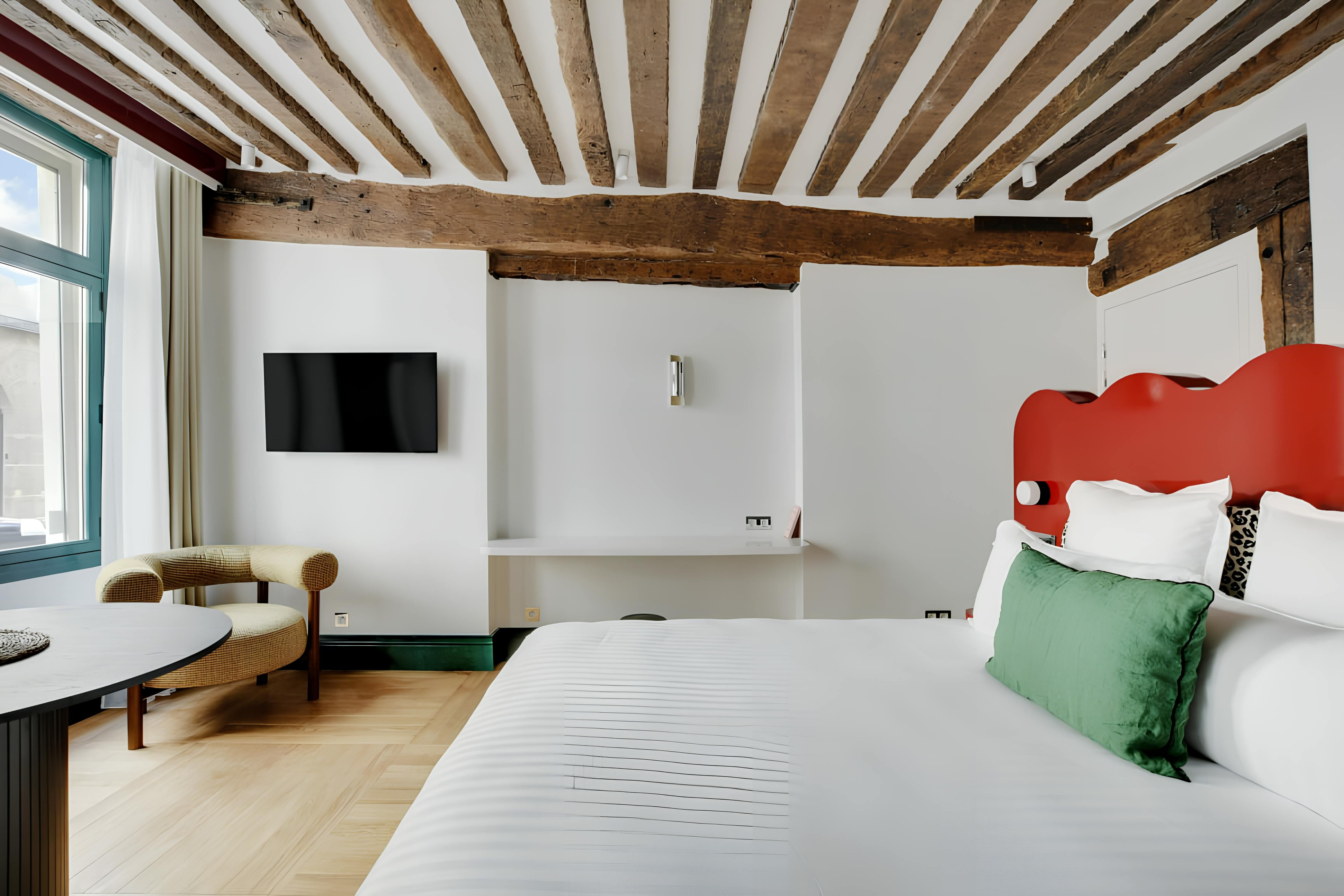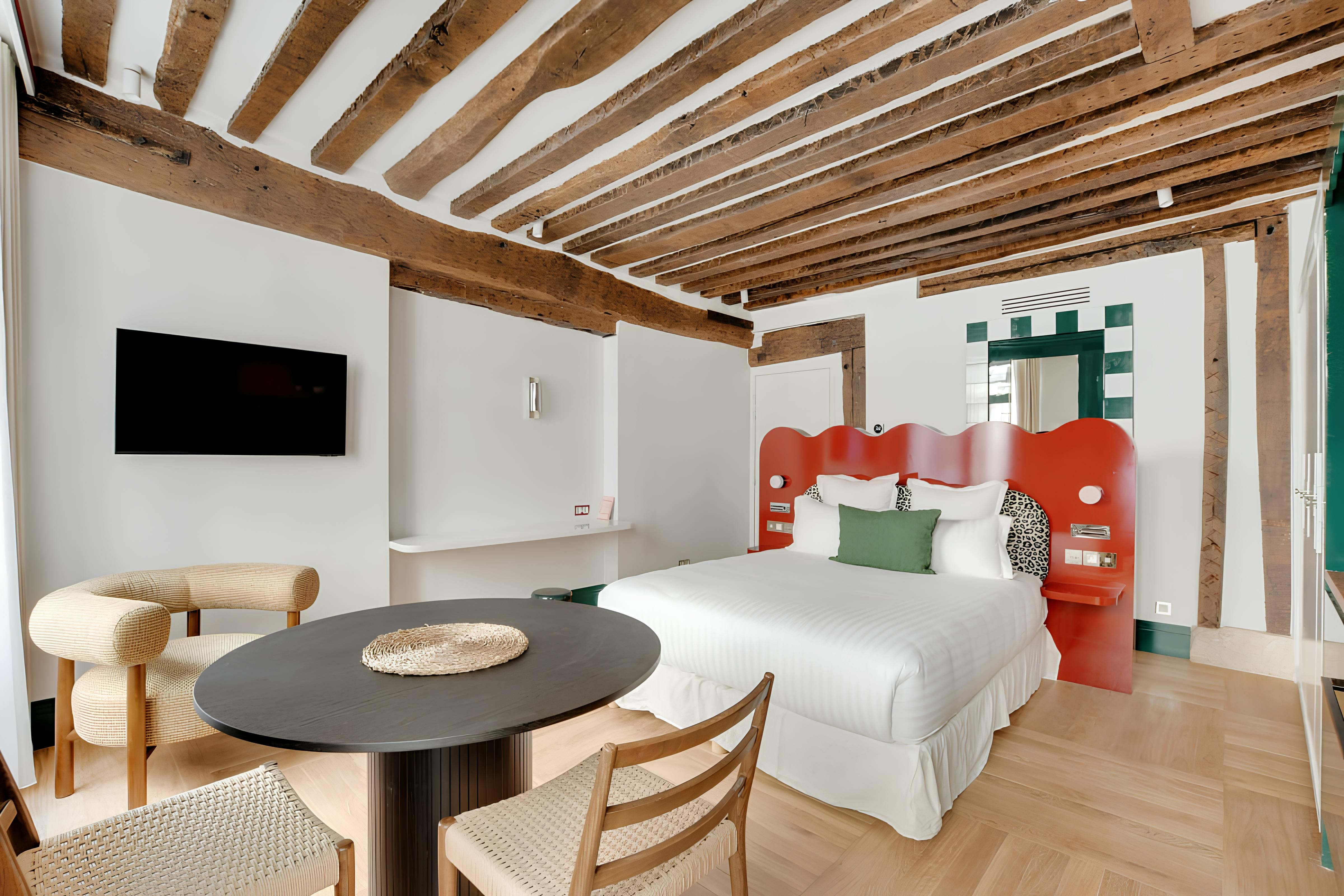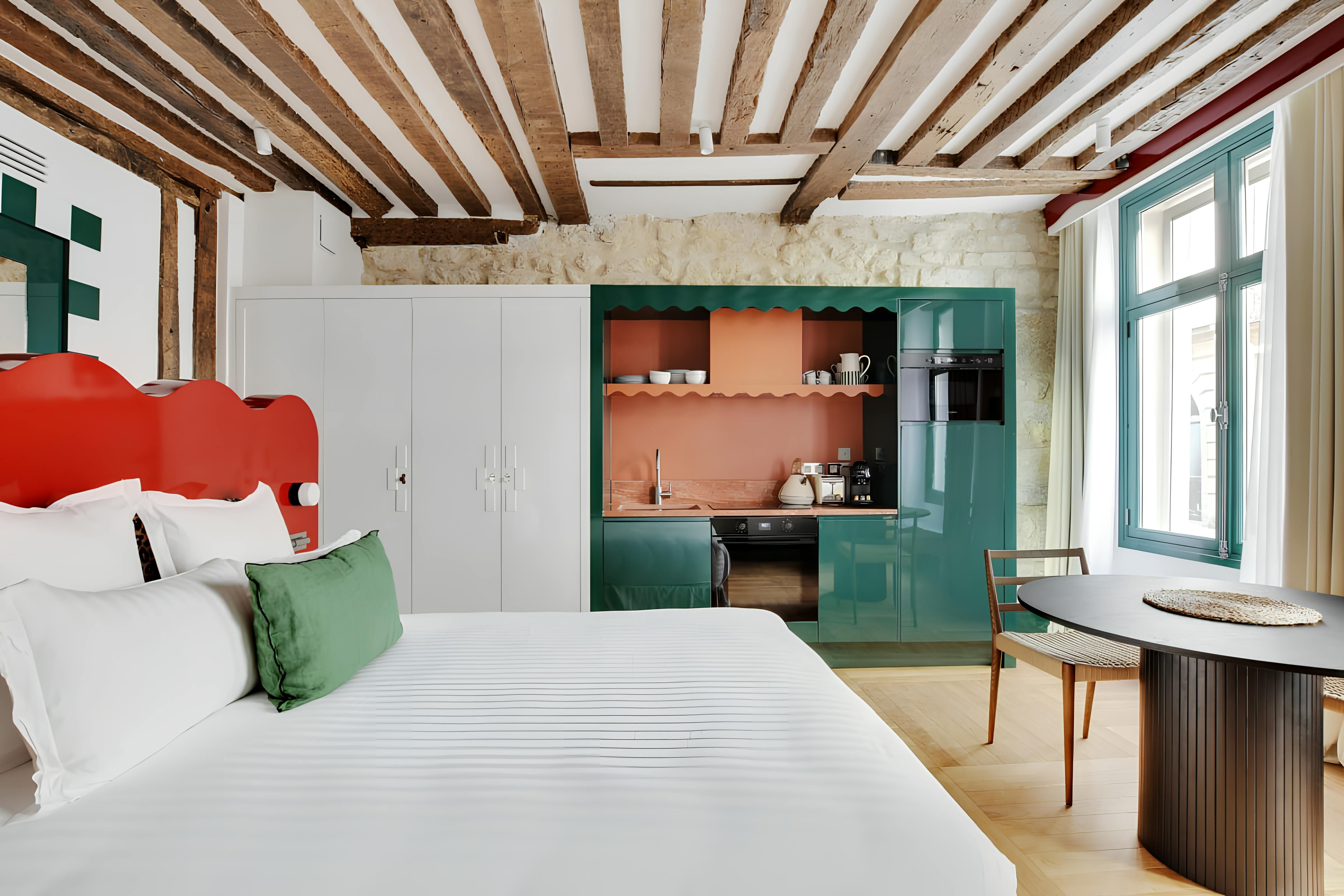 What this studio apartment lacks in space, it makes up for in style. Wooden beams on the ceilings, exposed stone walls, a curvy red headboard – the design doesn't play it safe. The kitchen is small, sure, but it's well-appointed to rustle up something easy. Even better, you'll find an array of top-notch eateries on your doorstep. Also nearby are landmarks like Notre Dame and the Louvre, independent shops like Shakespeare & Company, and a metro station for adventures further afield.