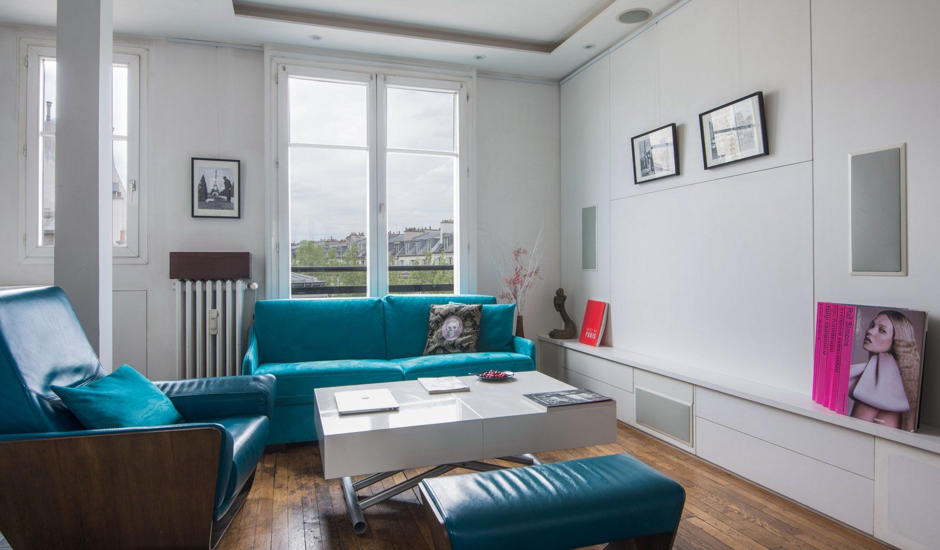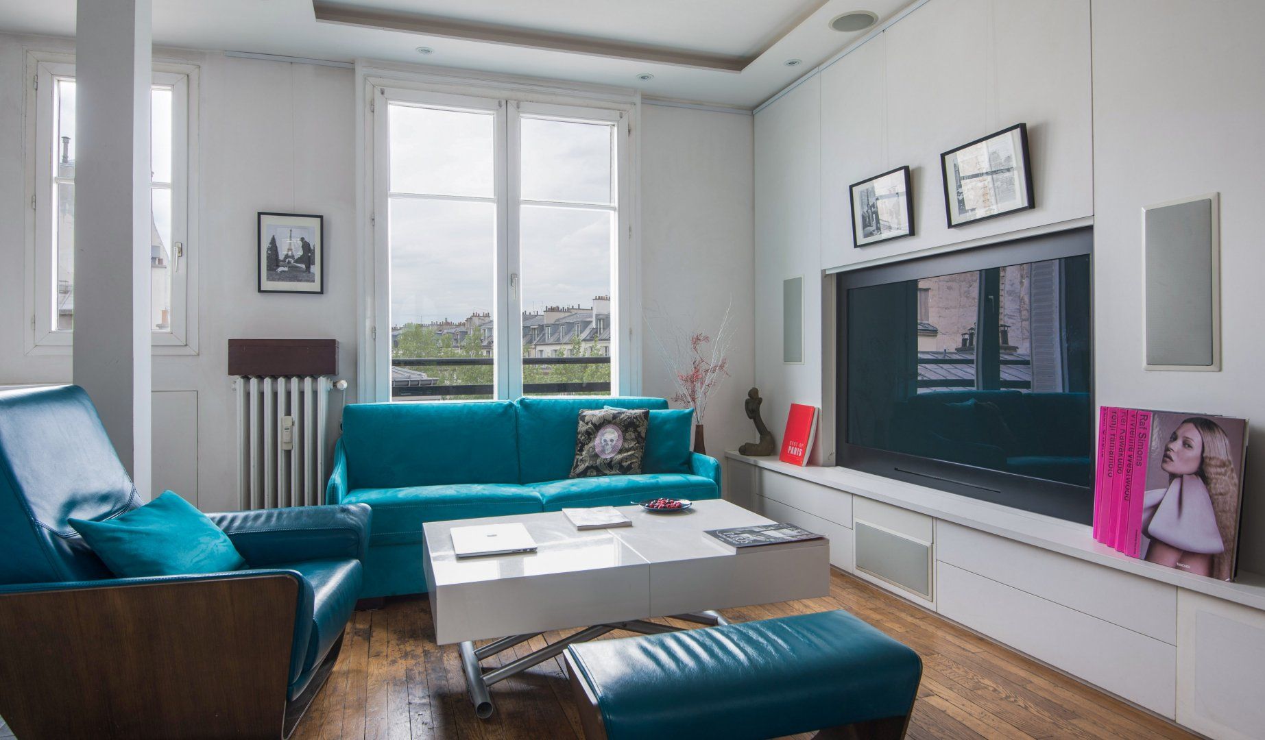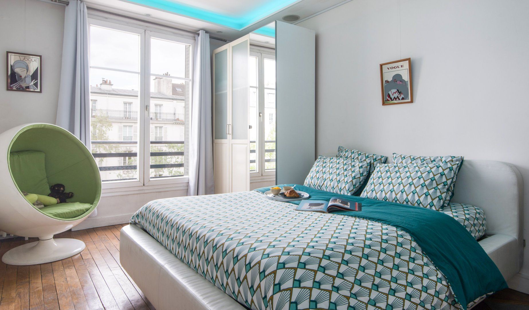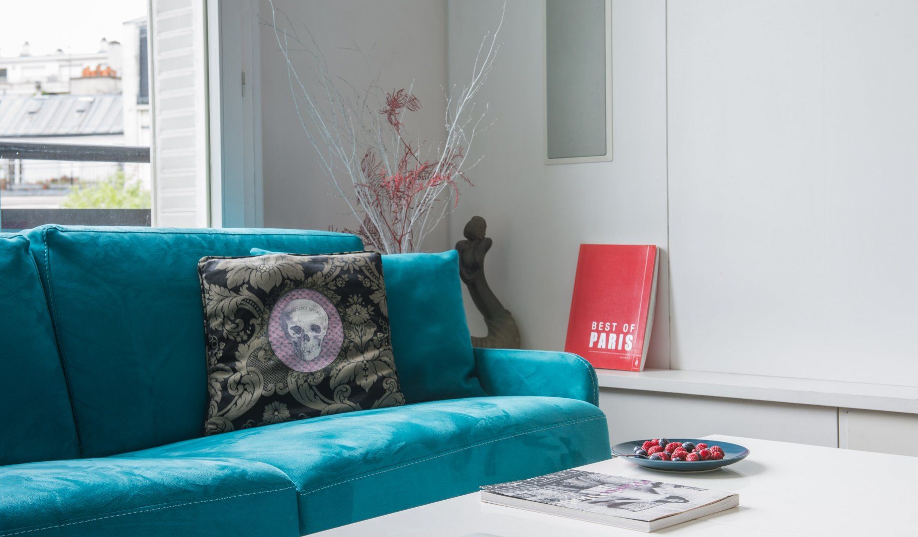 In the heart of the Marais, this two bedroom apartment is full of welcome home comforts such as a state-of-the-art 3D television and a jacuzzi. The interior is modern and highlighted by the standout electric blue sofas. Located between the Place des Vosges and the Place de la Bastille, it is ideal for a family or group of friends looking to stay in a high-tech home close to the action.