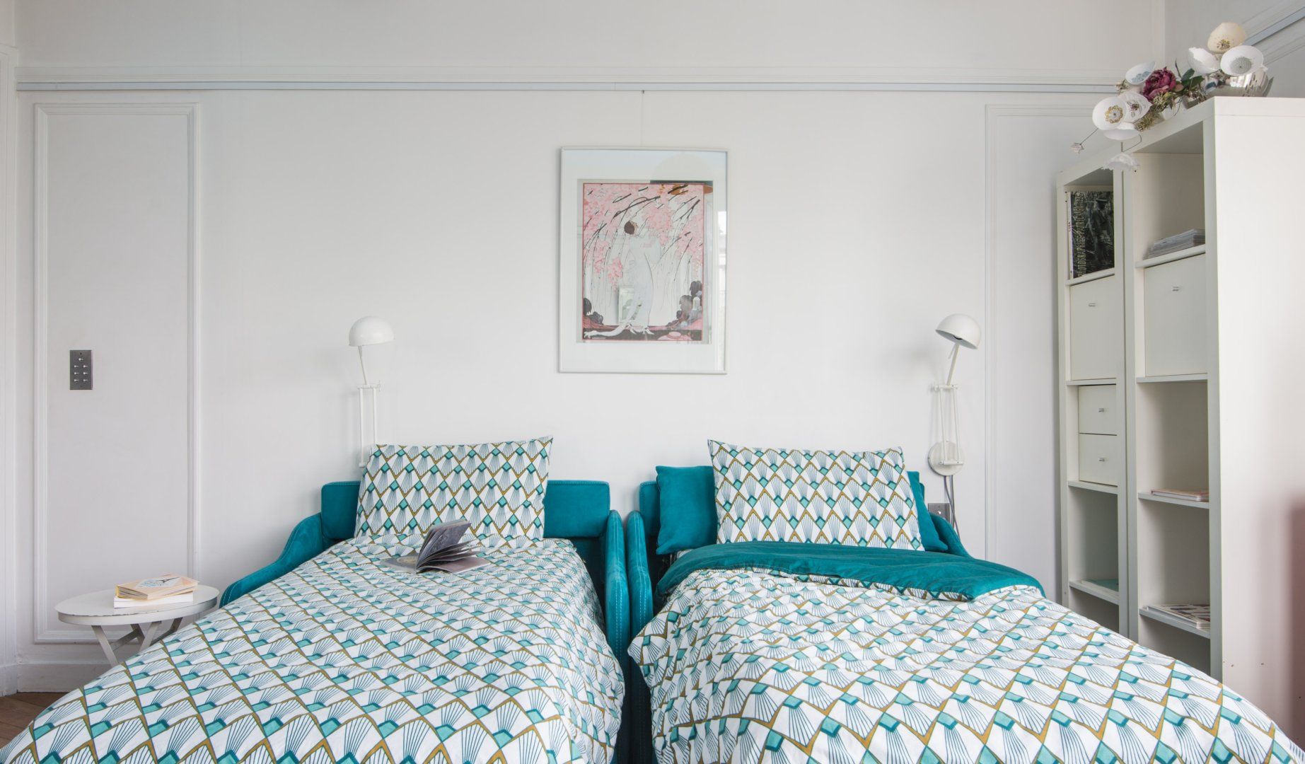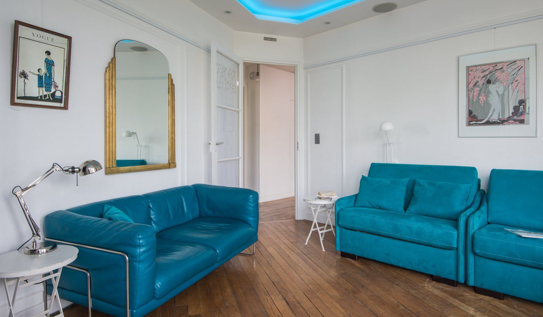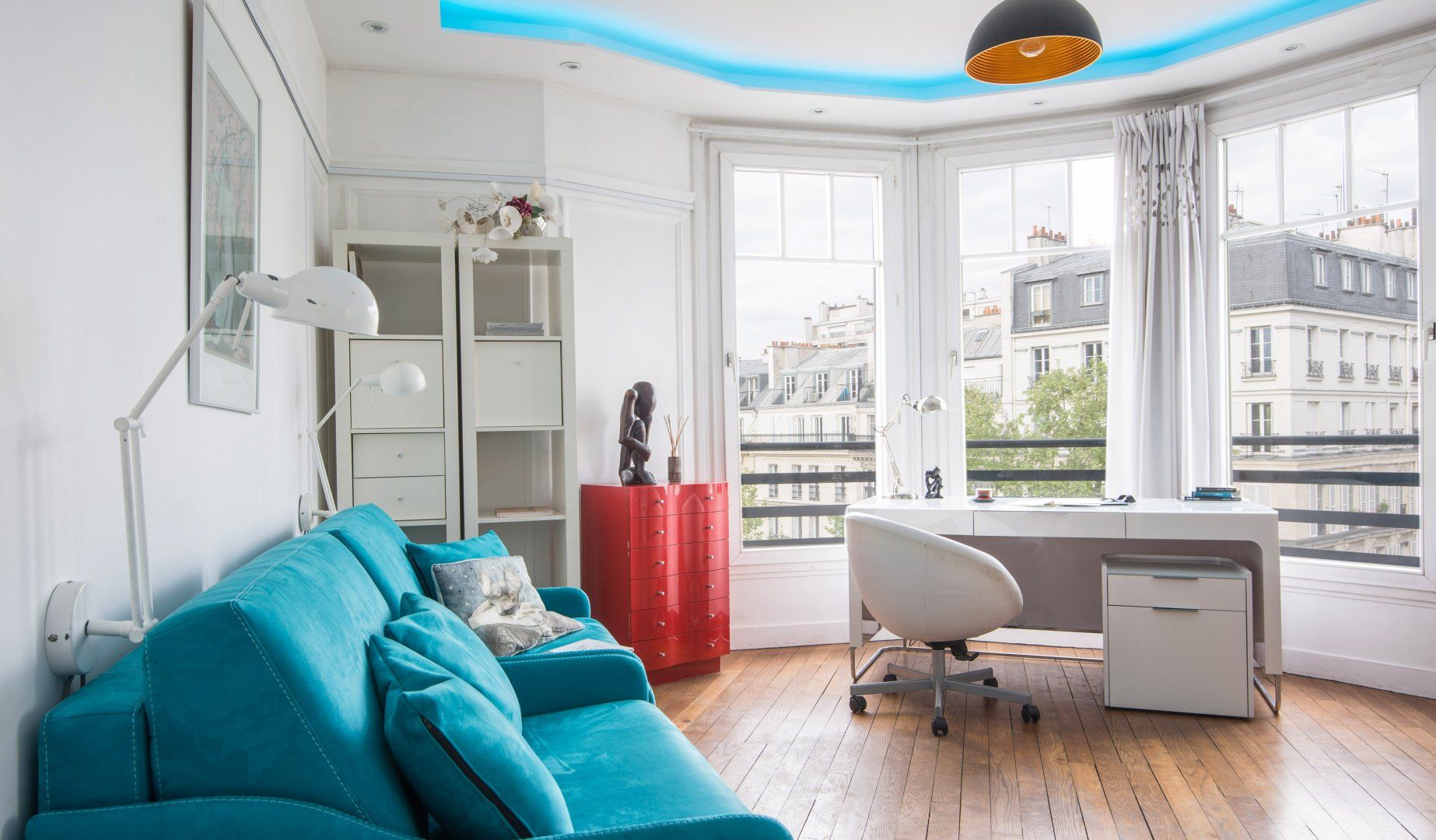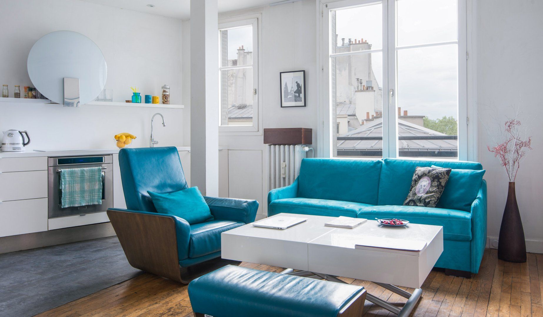 In the heart of the Marais, this two bedroom apartment is full of welcome home comforts such as a state-of-the-art 3D television and a jacuzzi. The interior is modern and highlighted by the standout electric blue sofas. Located between the Place des Vosges and the Place de la Bastille, it is ideal for a family or group of friends looking to stay in a high-tech home close to the action.