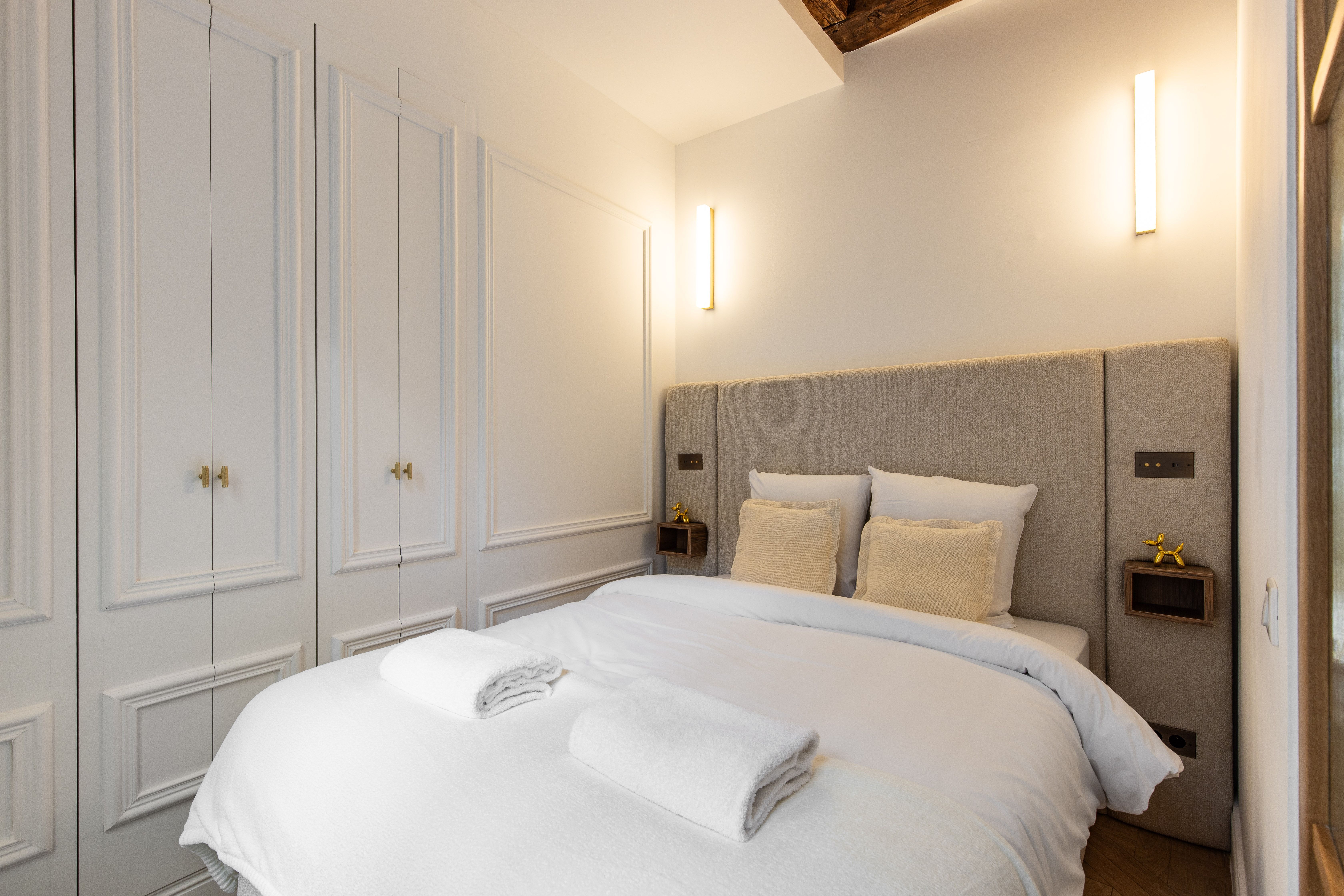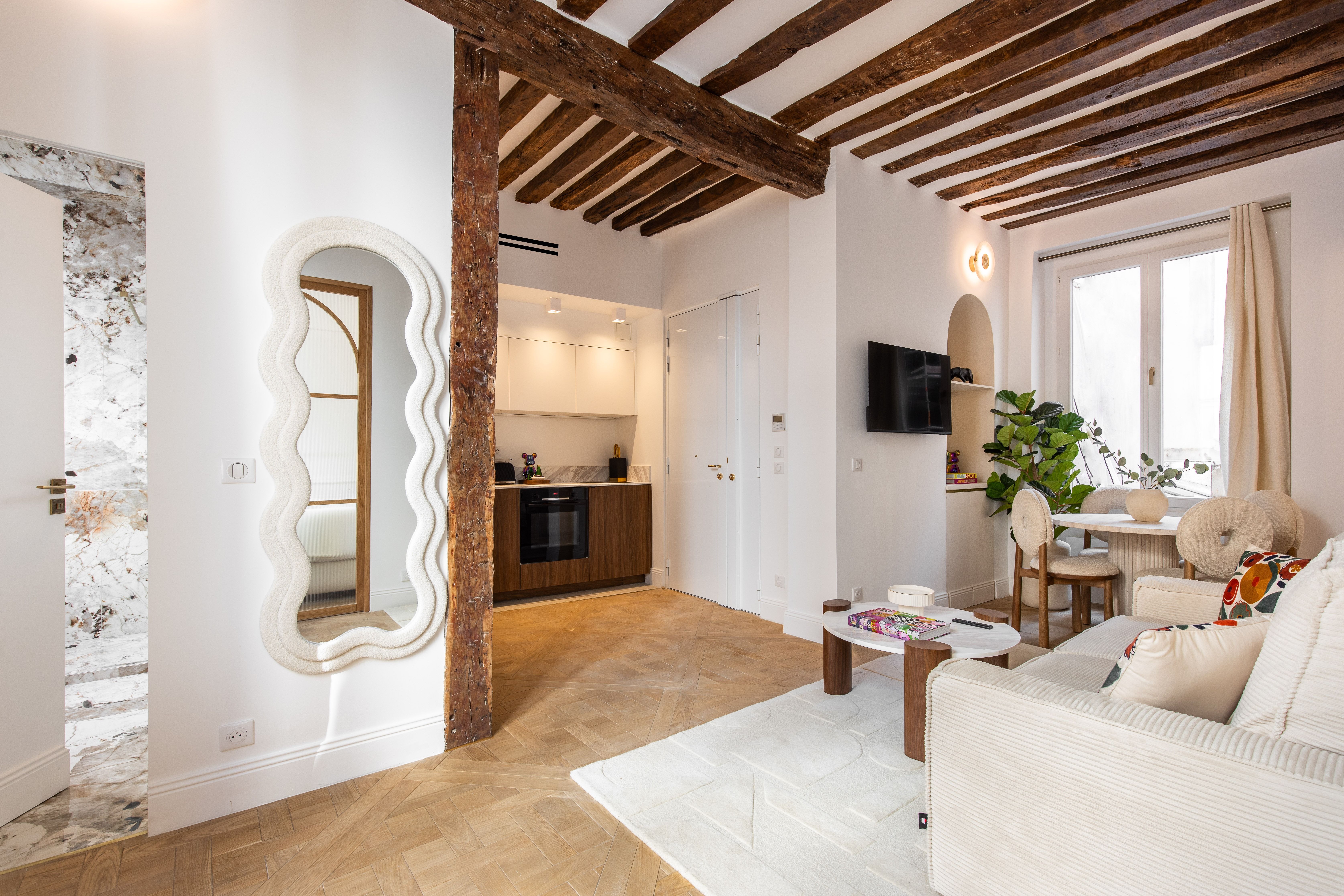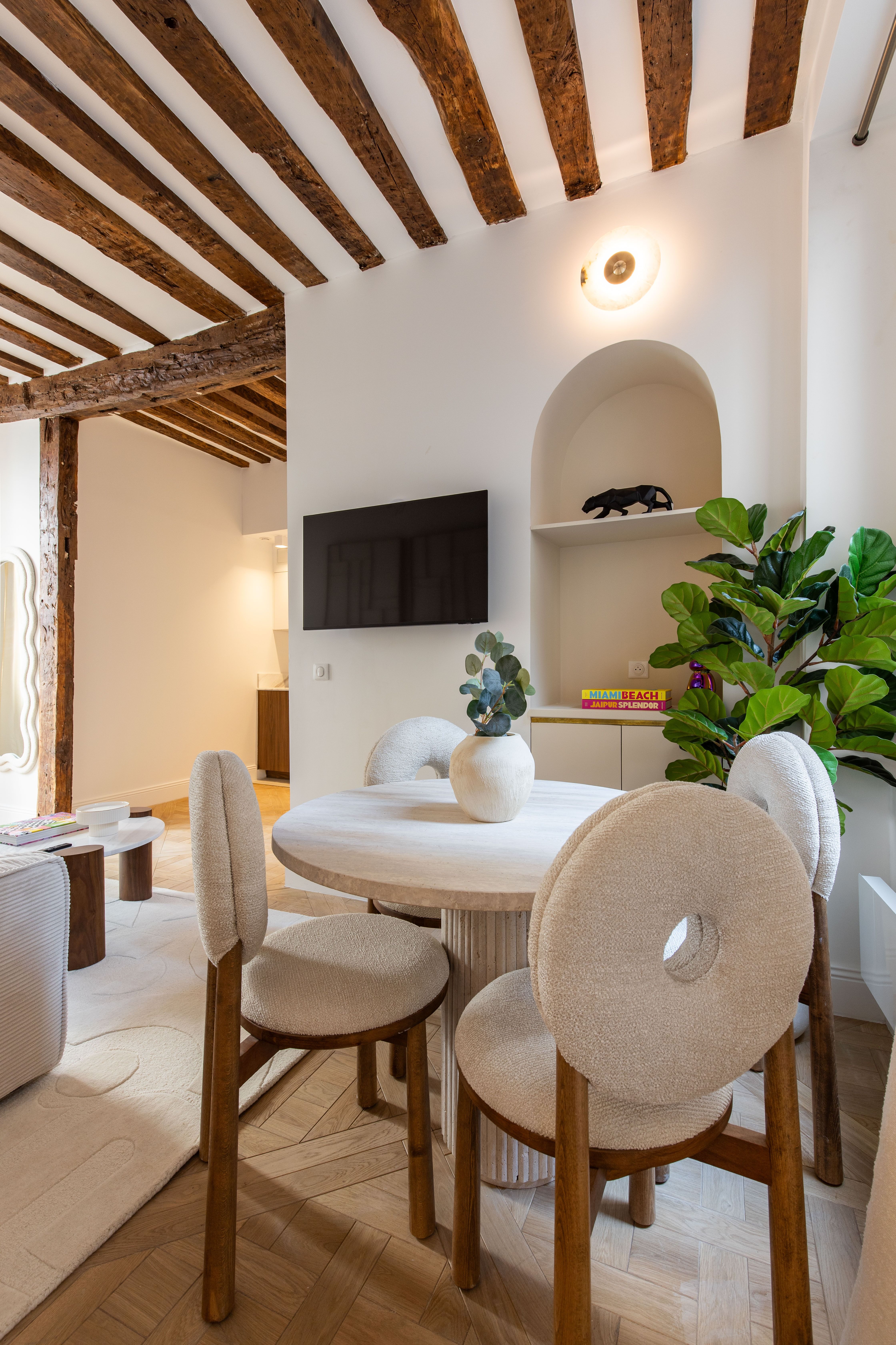 This home is set in the heart of Saint-Germain-des-Prés, where you'll be surrounded by cafes, restaurants, and the buzz of the city. You can walk to Notre-Dame or Sainte-Chapelle in just six minutes, while the Luxembourg Gardens and the Panthéon are only a little further. Inside, the style is contemporary, but there are still hints of old-world character thanks to those exposed wooden beams. It’s worth noting it's on the second floor without a lift, so there are some stairs to climb. The bedrooms are also very compact, but there’s smart storage. And with such a central location, you’ll likely be out exploring most of the time.