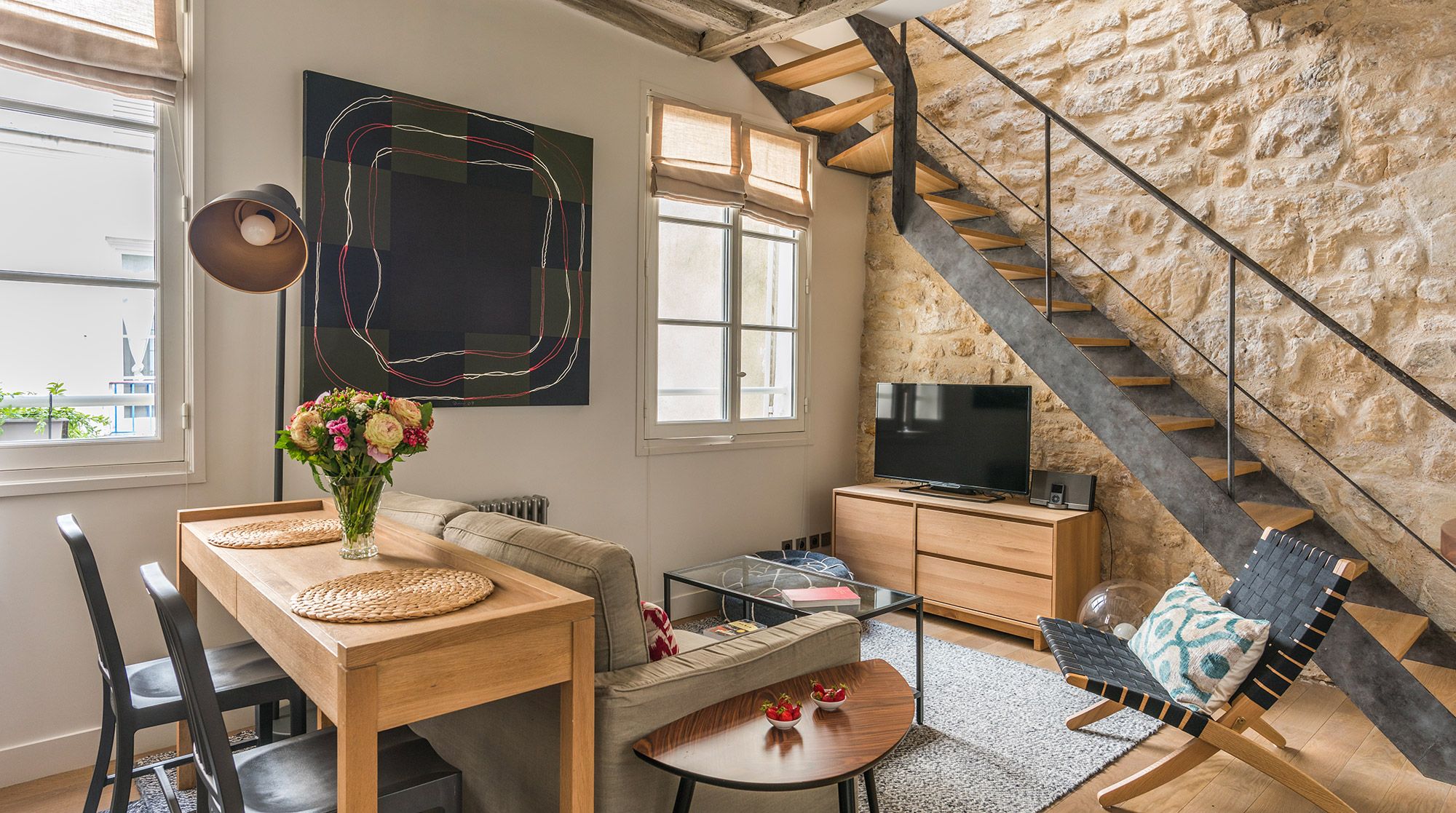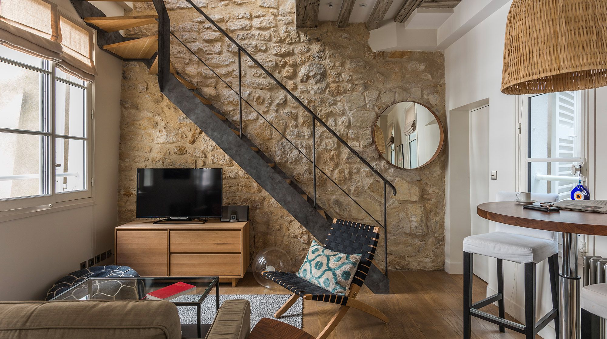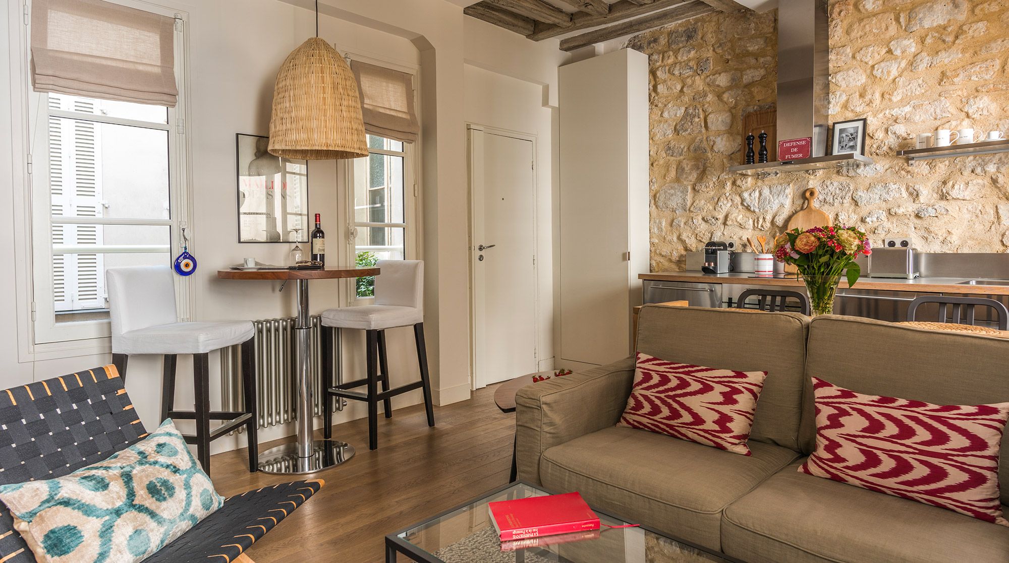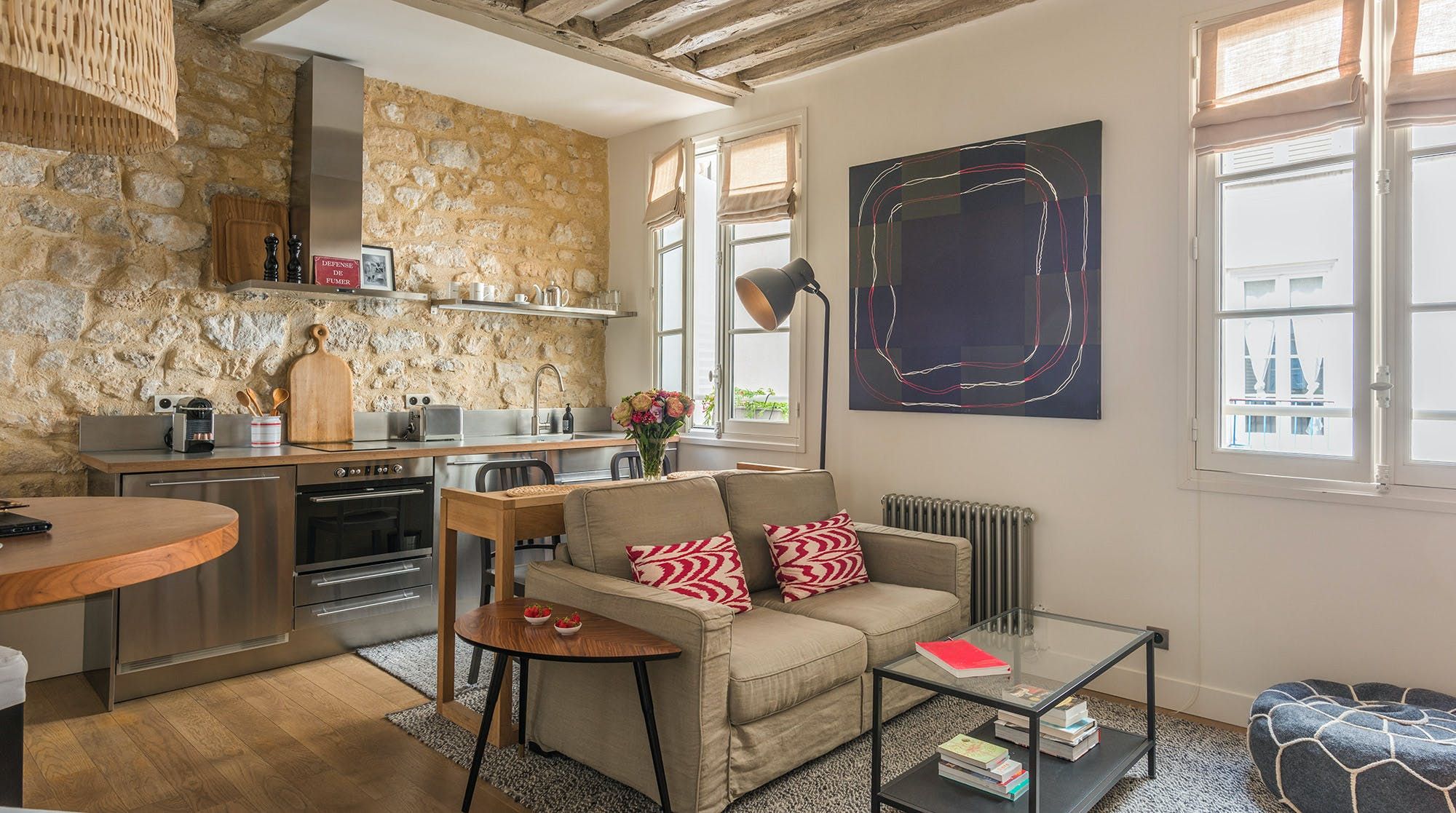 This well-presented apartment is ideal for a couple who wants to enjoy the exciting area of Rue Du Bac - famous for its many galleries, restaurants and cafes. The flat has been fully renovated and the exposed wooden beams and stone walls help bring a character and a bit of heritage to the space. While the area is is buzzing with cafes, the flat remains nonetheless very quiet and would suit a couple that appreciates the high-end galleries and furniture shops that line the streets.