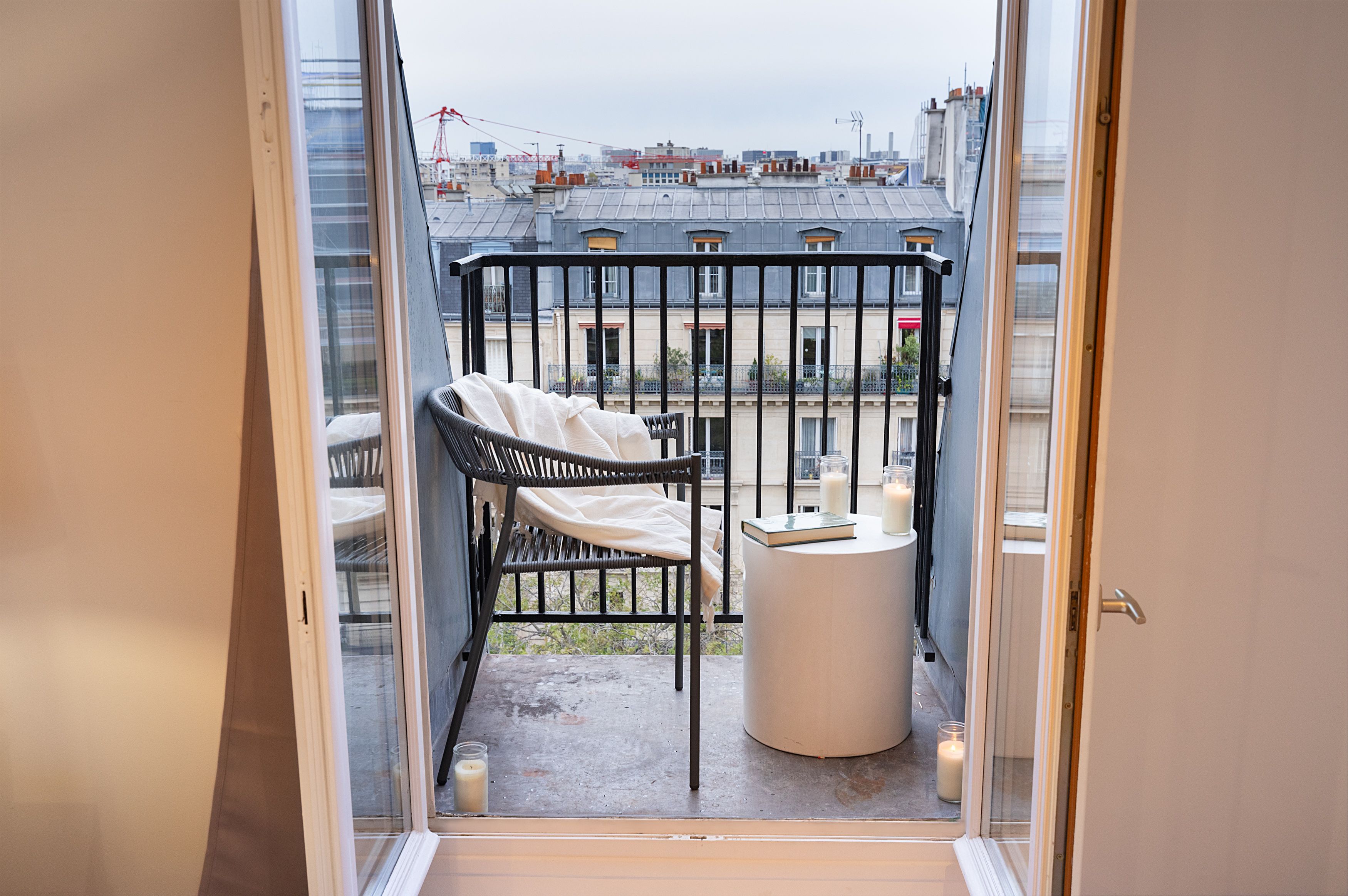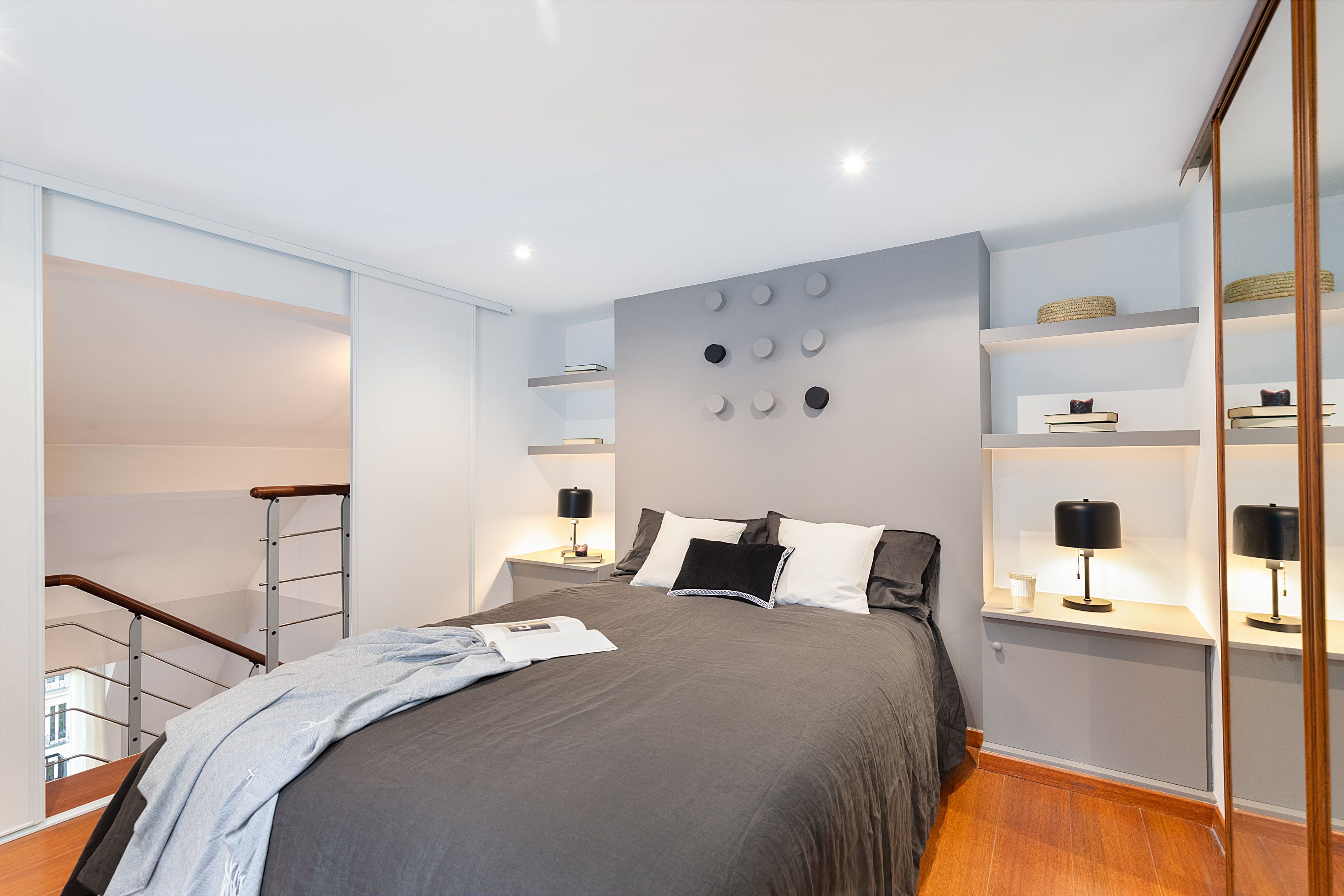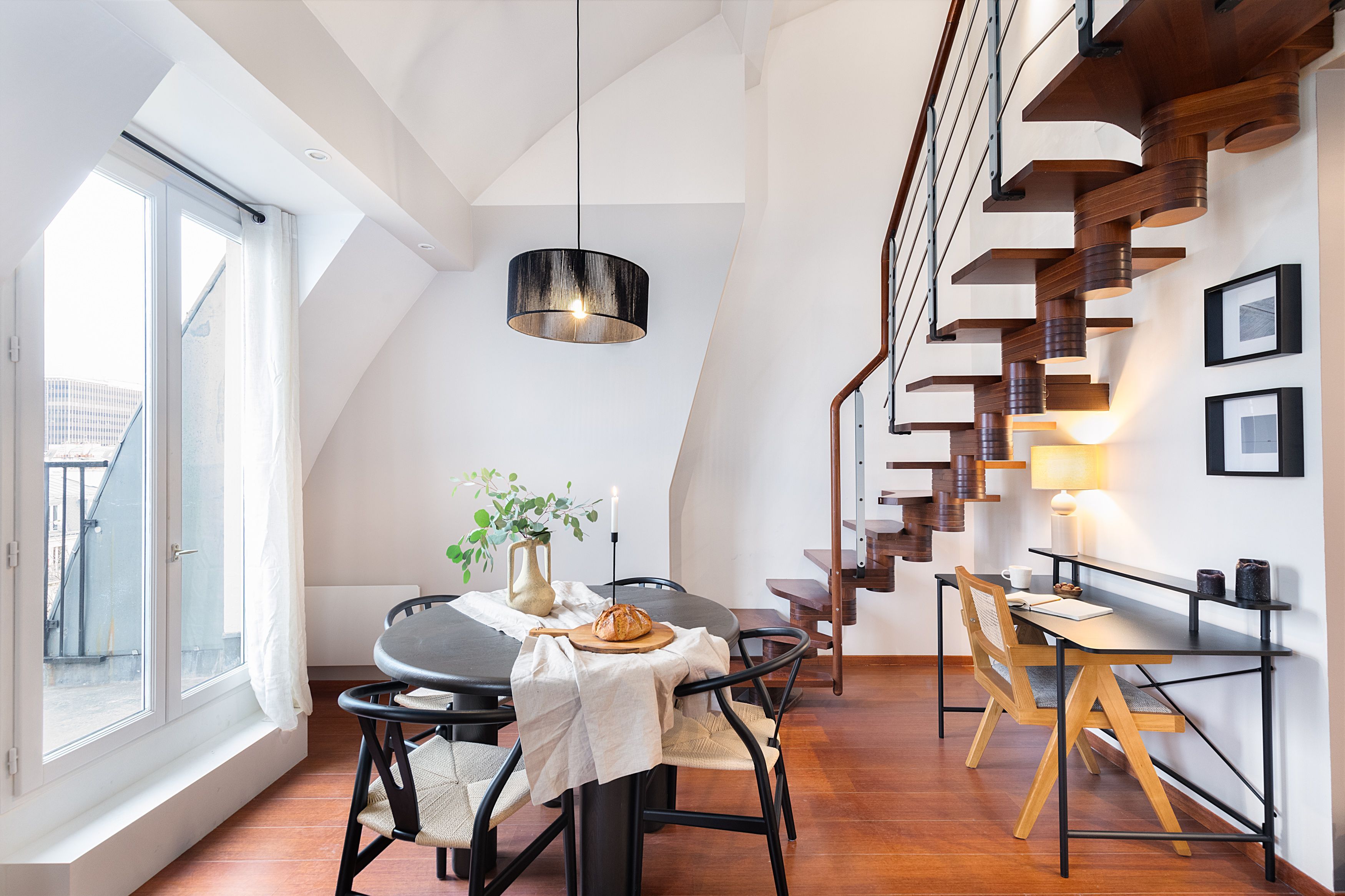 With an address in the 5th arrondissement, you’ll be within walking distance of the Jardin des Plantes, the Jardin du Luxembourg and the Panthéon. The apartment itself has three balconies no less (though they are on the compact side). We love the views over the Jardin des Plantes neighbourhood from here. Inside is light and airy thanks to the tall ceilings and a feature staircase leads to the en-suite bedroom (the second is on the entrance level). The other thing we should mention is there’s a desk in the living room – handy whether you’re here for business or leisure.
