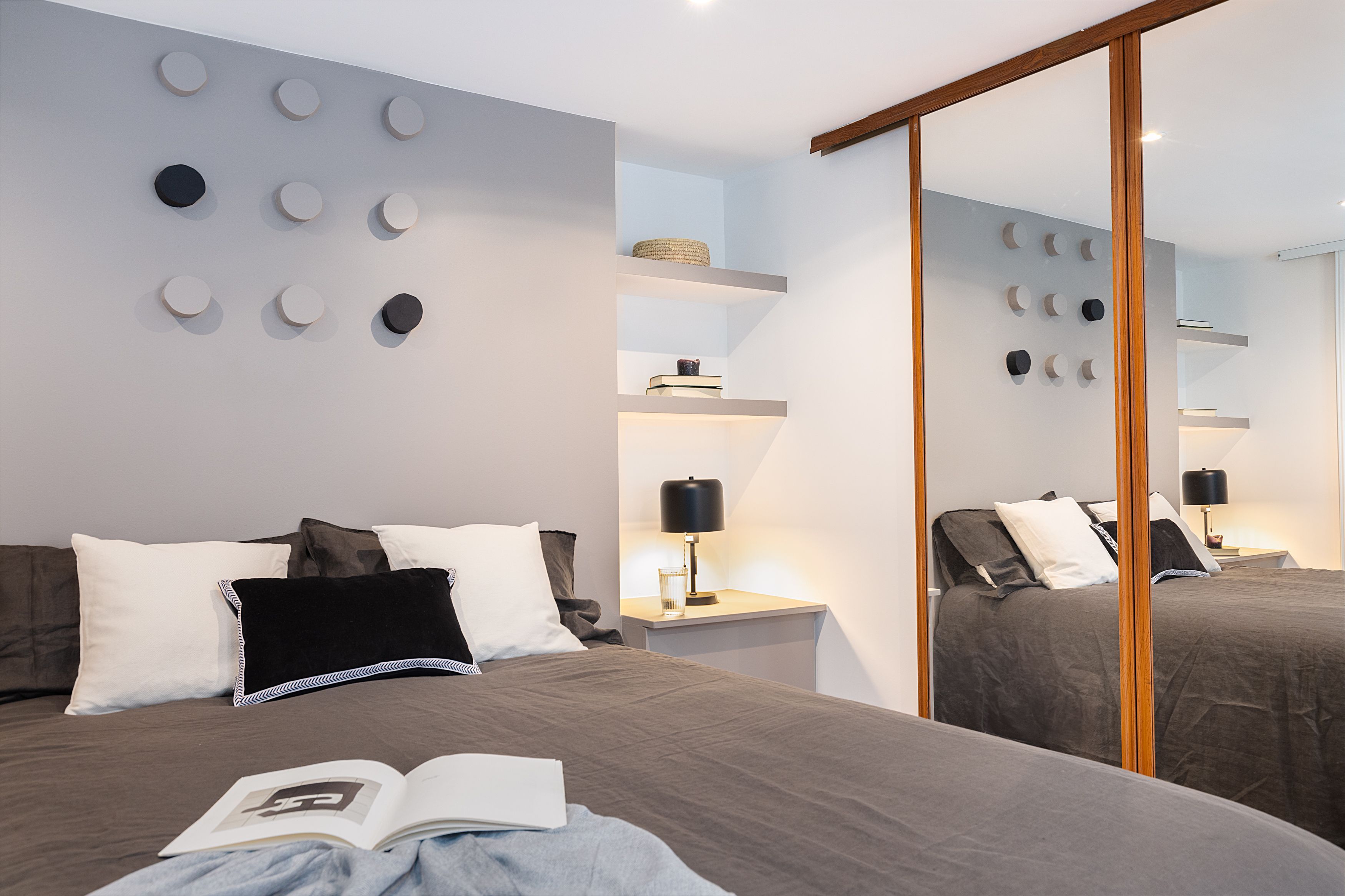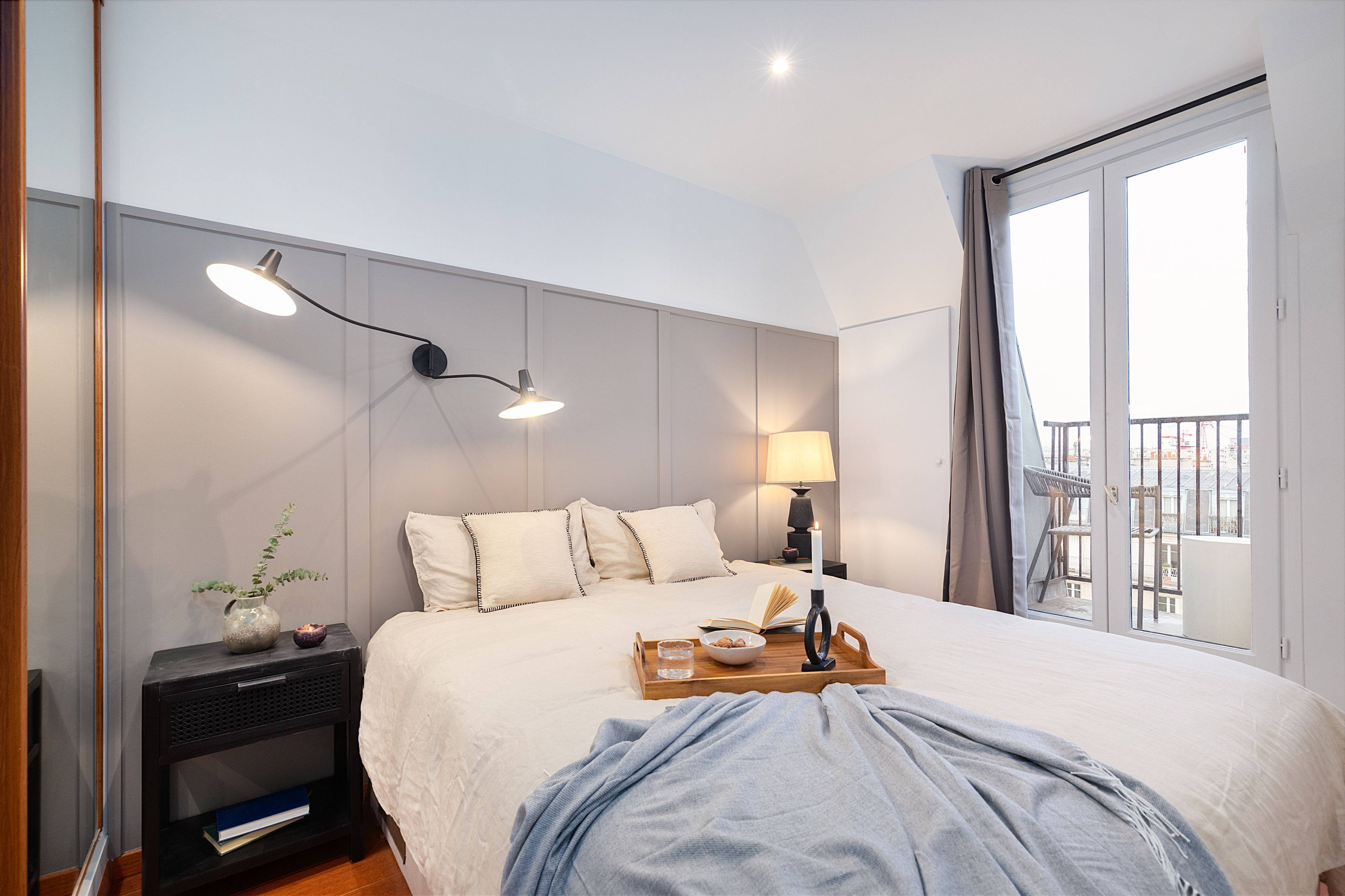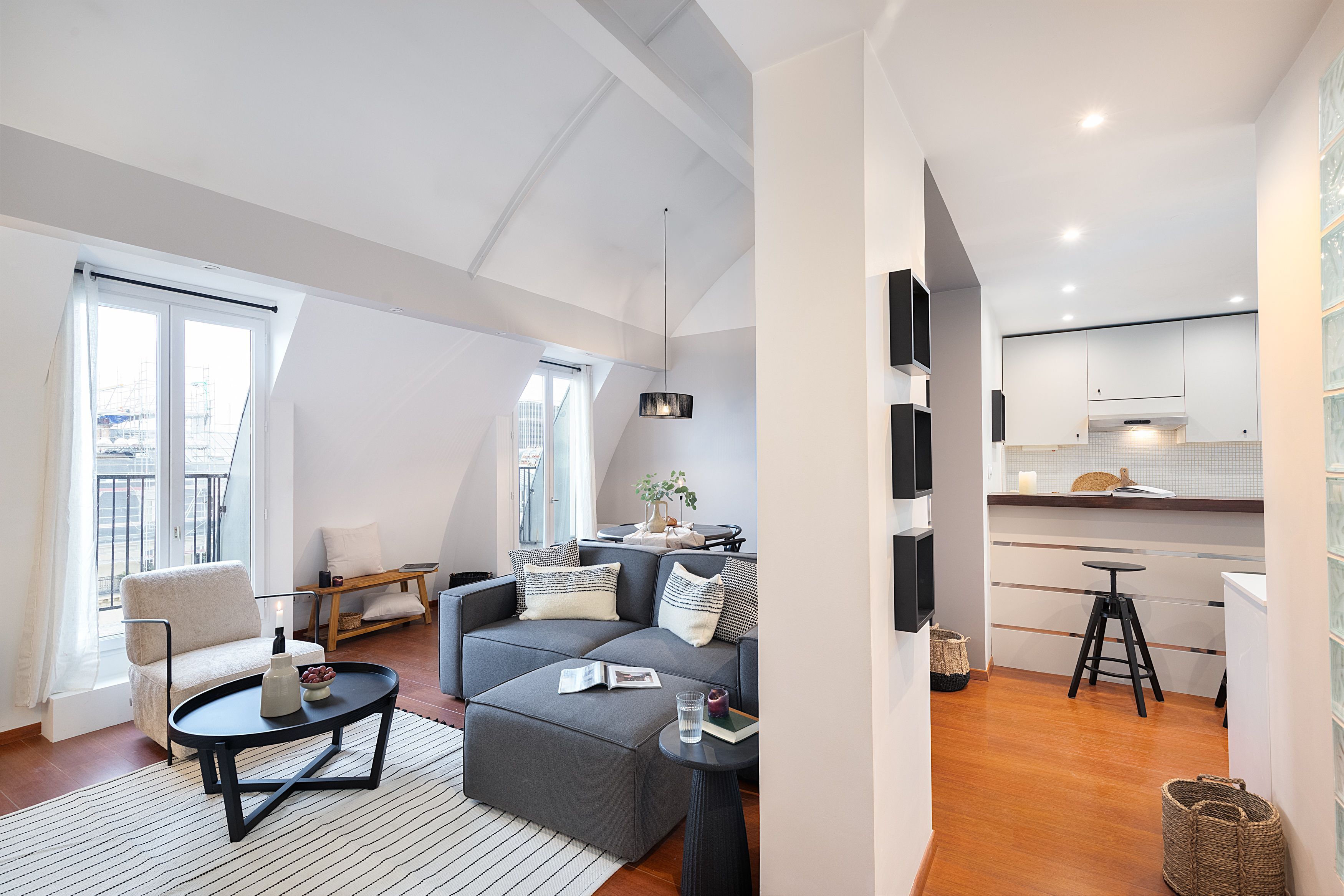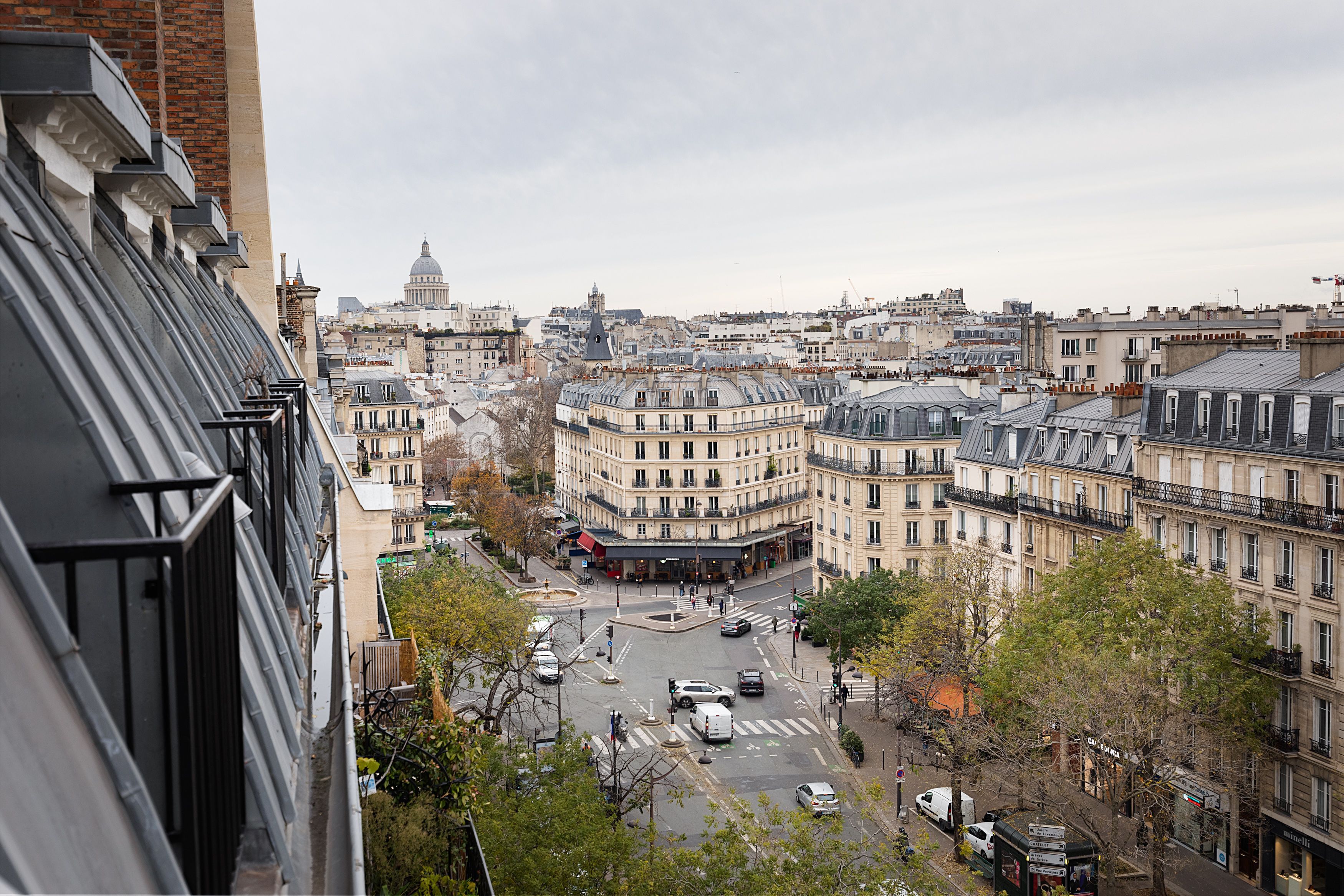 With an address in the 5th arrondissement, you’ll be within walking distance of the Jardin des Plantes, the Jardin du Luxembourg and the Panthéon. The apartment itself has three balconies no less (though they are on the compact side). We love the views over the Jardin des Plantes neighbourhood from here. Inside is light and airy thanks to the tall ceilings and a feature staircase leads to the en-suite bedroom (the second is on the entrance level). The other thing we should mention is there’s a desk in the living room – handy whether you’re here for business or leisure.
