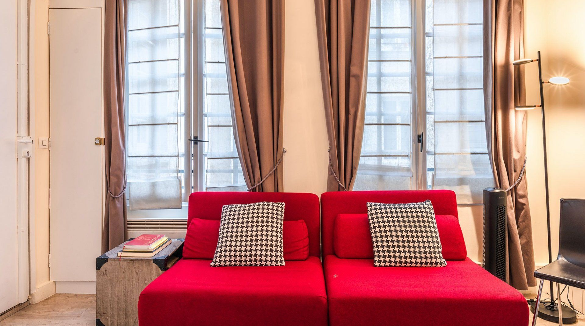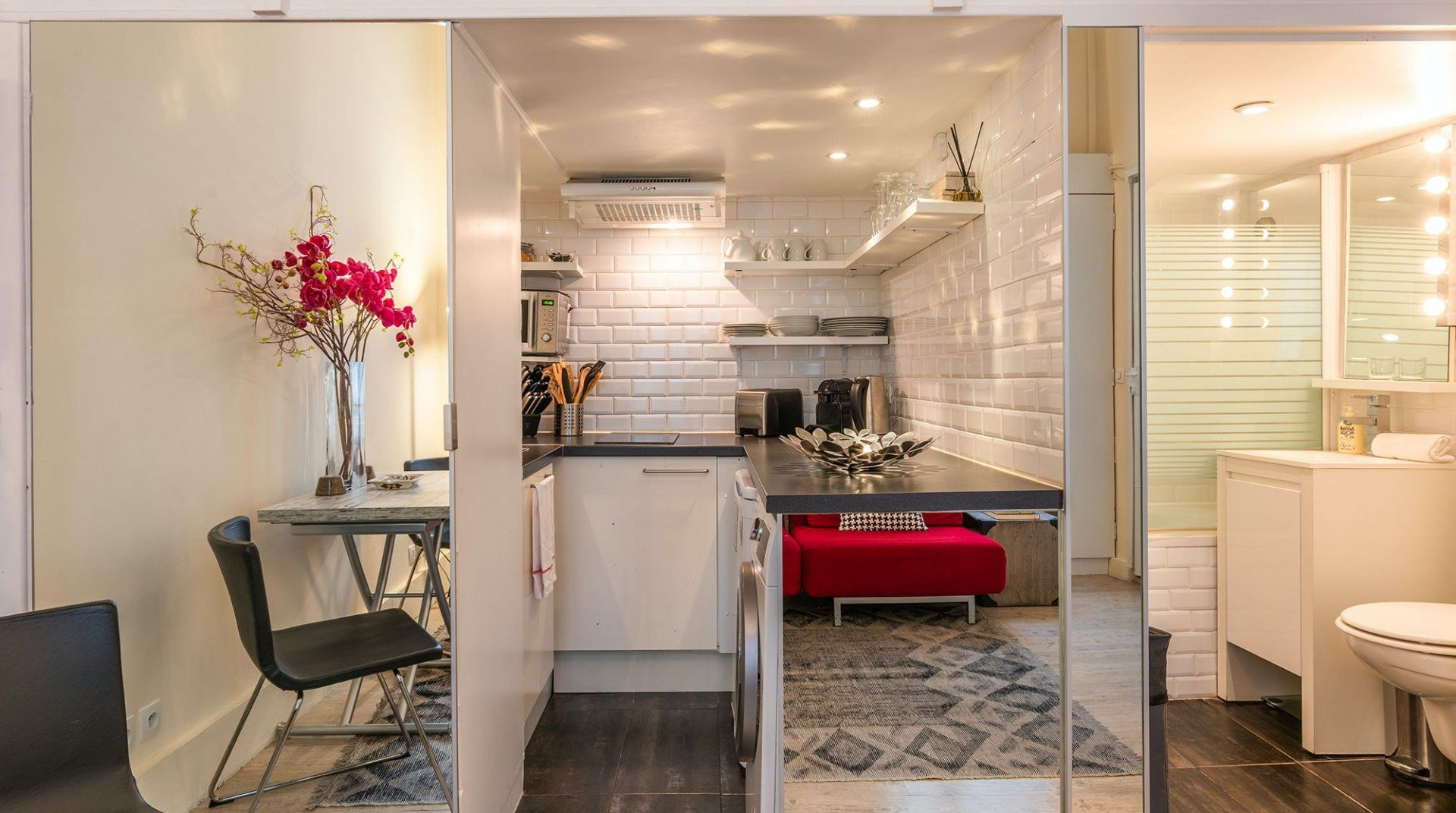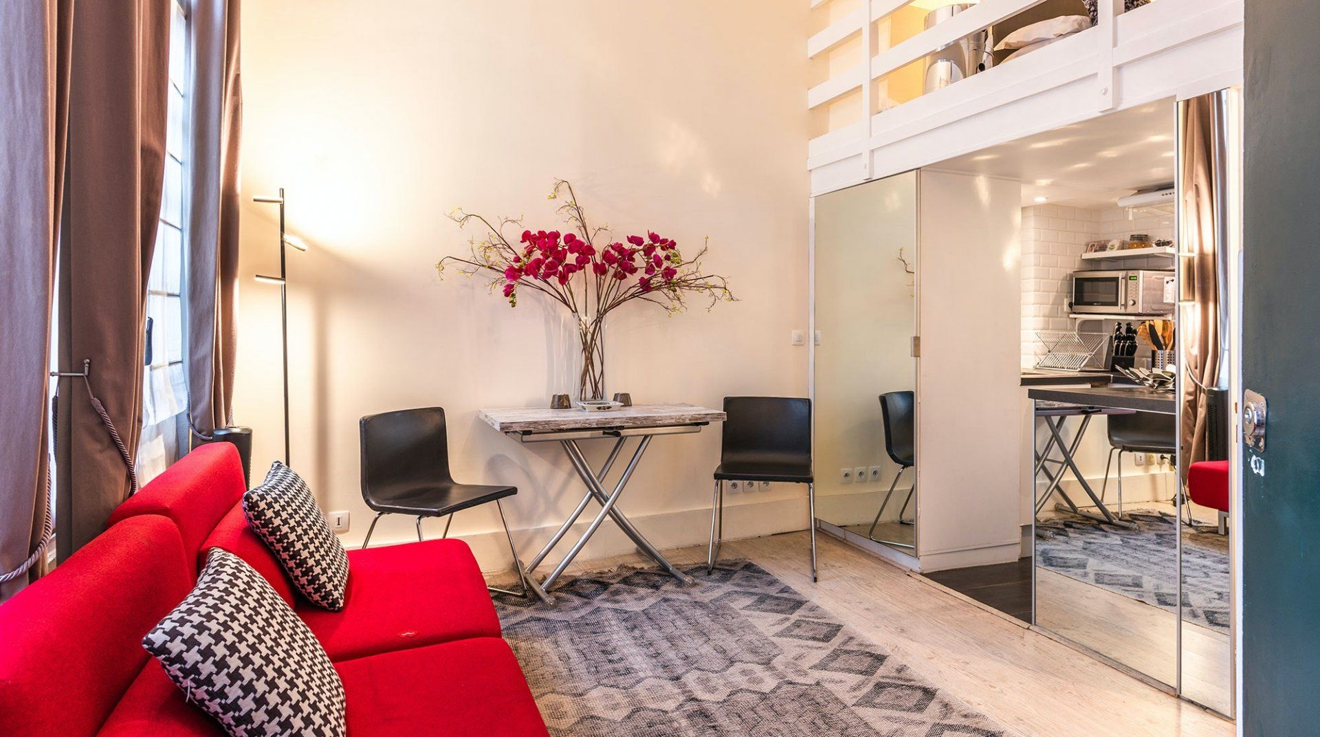 On a quiet street between the modern shopping hub of Les Halles and the colourful lanes of Le Marais, this home offers the best of both worlds. Only three minutes from the Rambuteau metro, this charming studio space feels like the perfect combination of its surrounding neighbourhoods. For the contemporary city feel, you’ve got modern furniture, mirrored sliding doors, and white walls. Then quirkiness comes from bright red pops of colour, houndstooth cushions, a mezzanine bedroom, and a drop-crystal lampshade. As the entire space is illuminated by two huge French windows, it feels airy, bright, and spacious, despite its compact size. Head out to see neighbouring attractions like the Centre Pompidou. You can stroll here in just four minutes to witness the unique, inside-out architecture of this iconic building. For something slightly more antique, take a fifteen-minute wander to the Louvre. Foodies will need to visit the Marché des Enfants Rouges (in addition to all the local restaurants and bars). This is the oldest food market in Paris, just a kilometre from your door, where you can pick up fresh produce or gorge on street food.