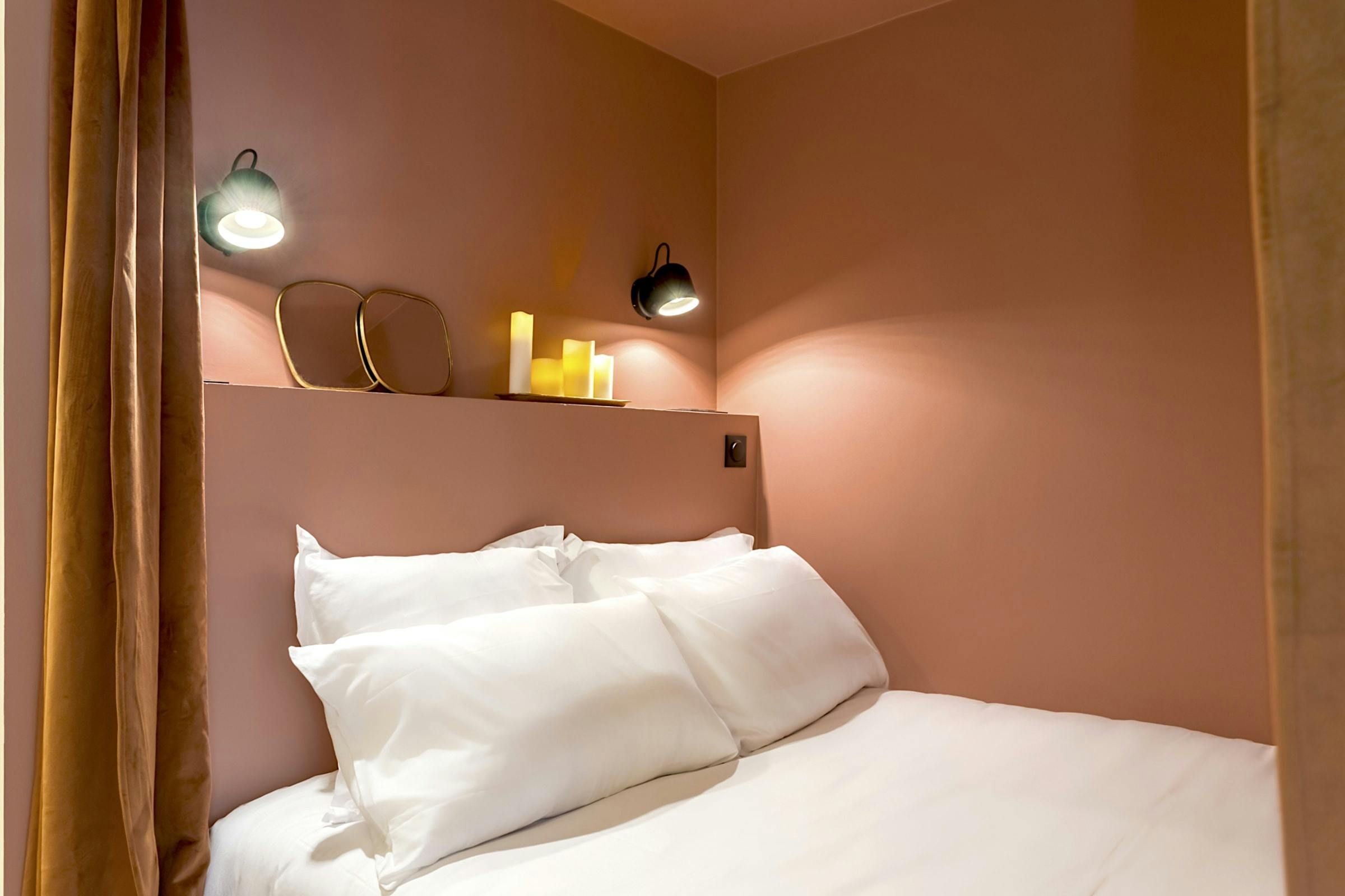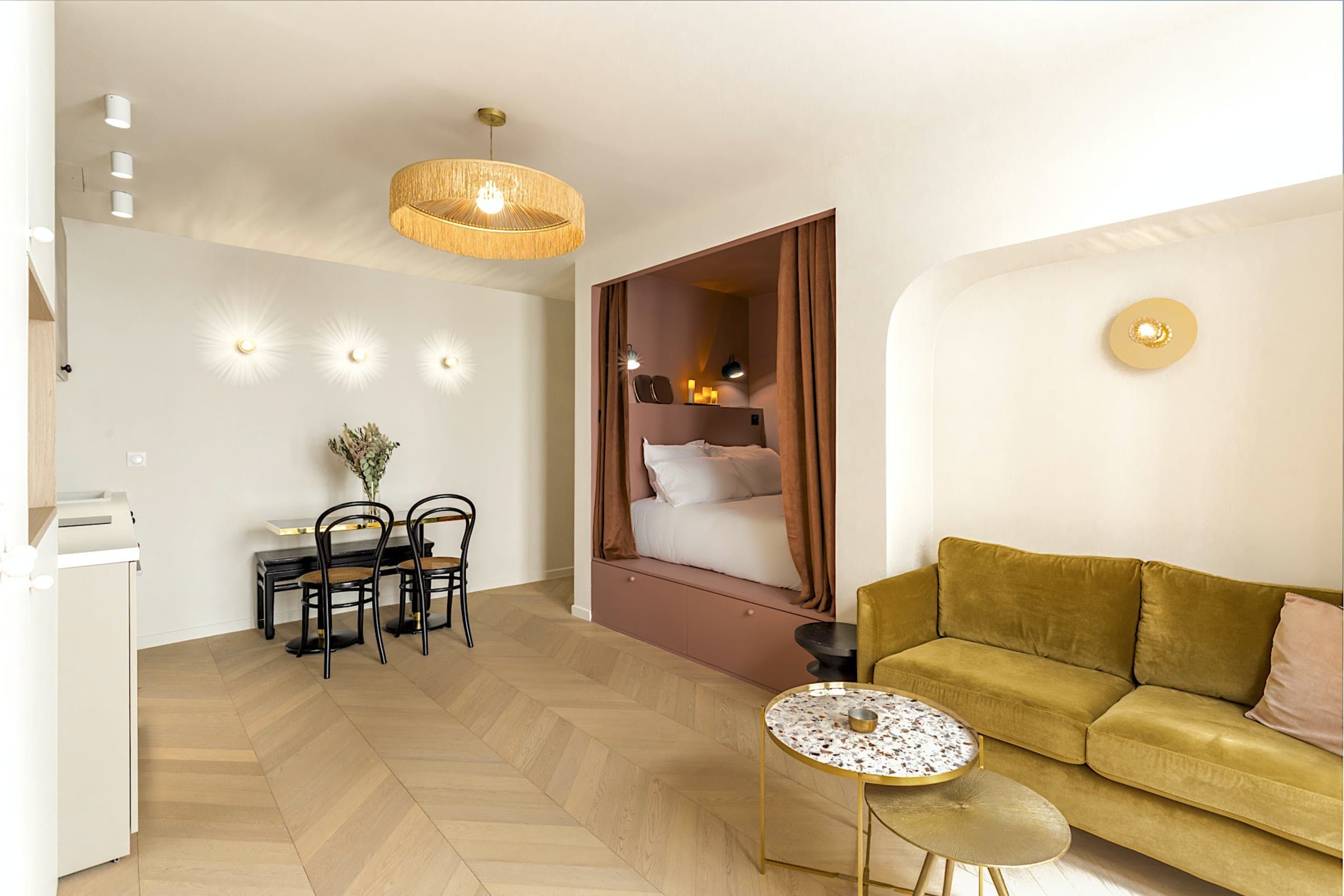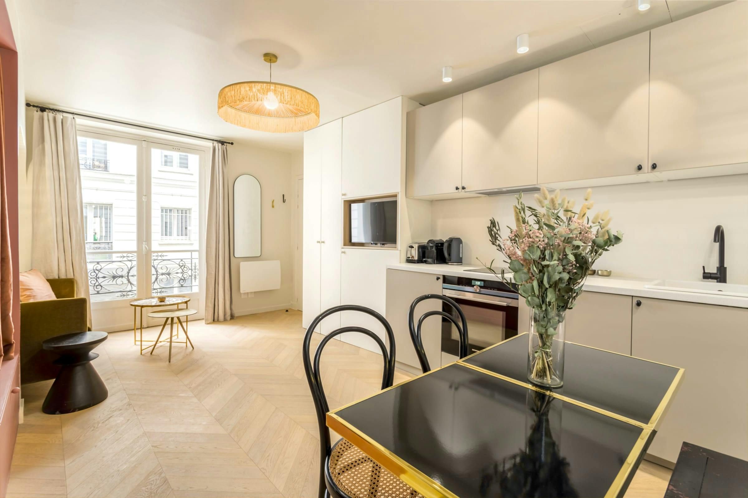 Romantic and refined, this studio apartment is quite the little love nest. It's set in a typical Haussmannian building with a lift – rare in these parts – and has all the contemporary touches you'll need. Although the blush-coloured bedroom alcove is snug (with the bed accessed from one side), we think it's cosy enough for cuddles after a day spent exploring. And speaking of sightseeing, you'll be well-placed for it. Boulevard Montmartre is on your doorstep, with the Louvre, Palais Garnier, and Galeries Lafayette all within walking distance. You can't get more central than that.