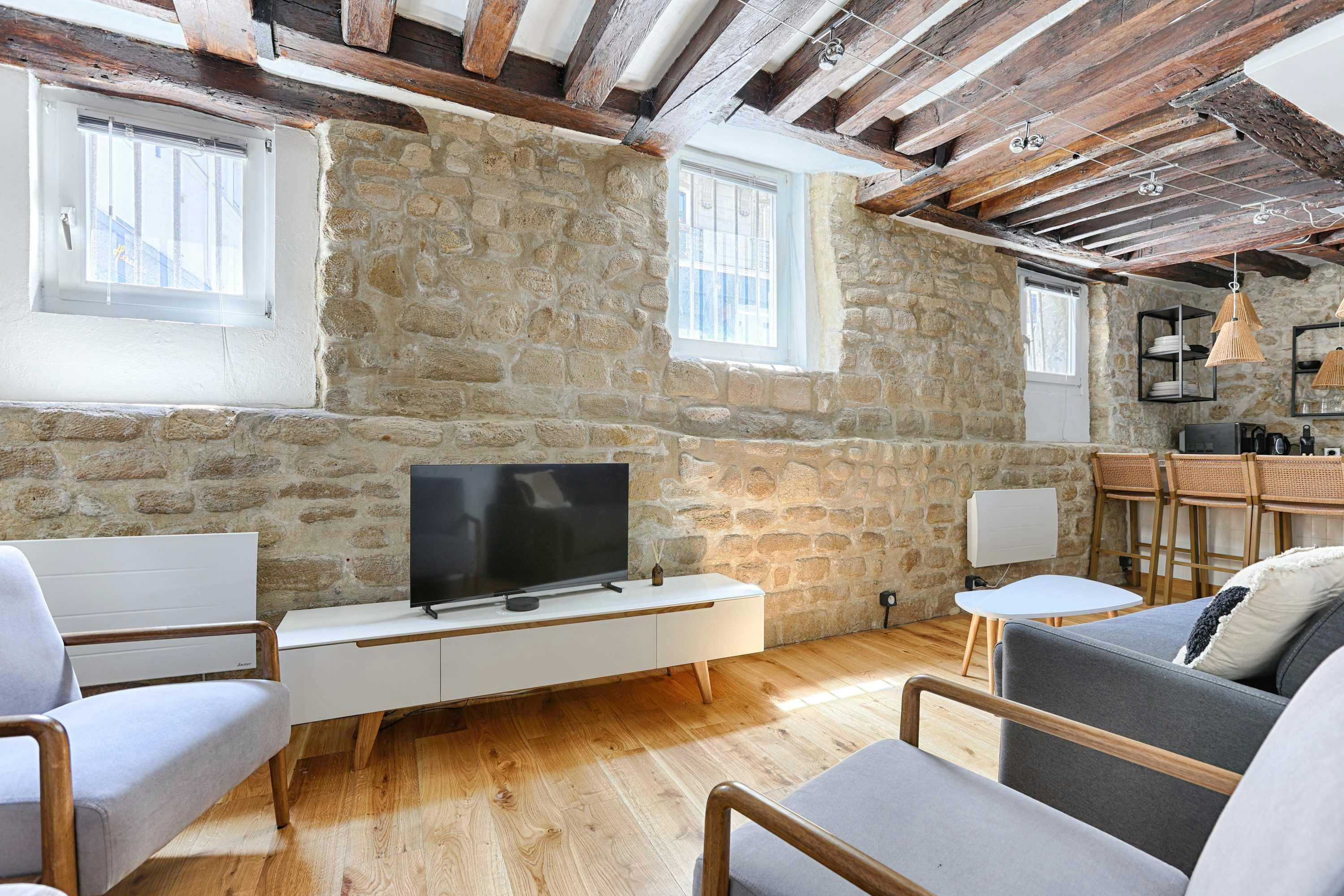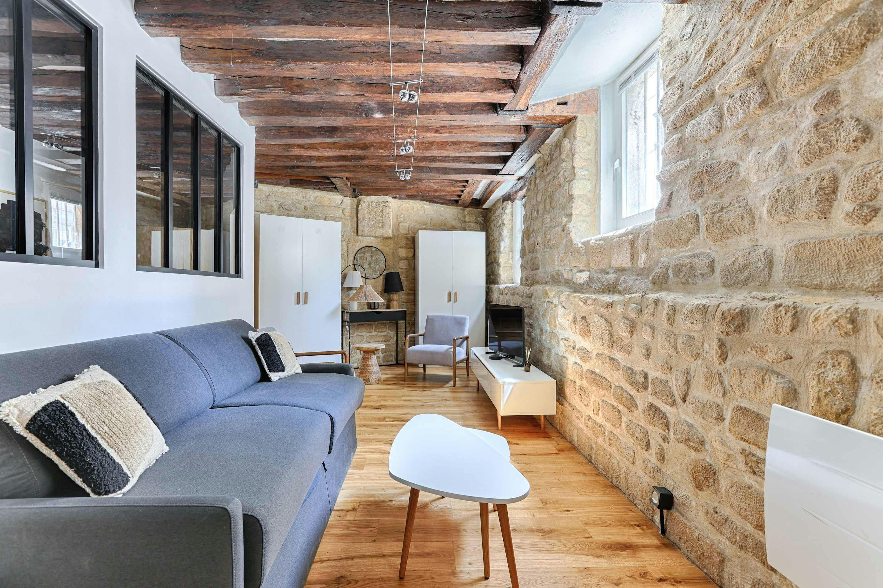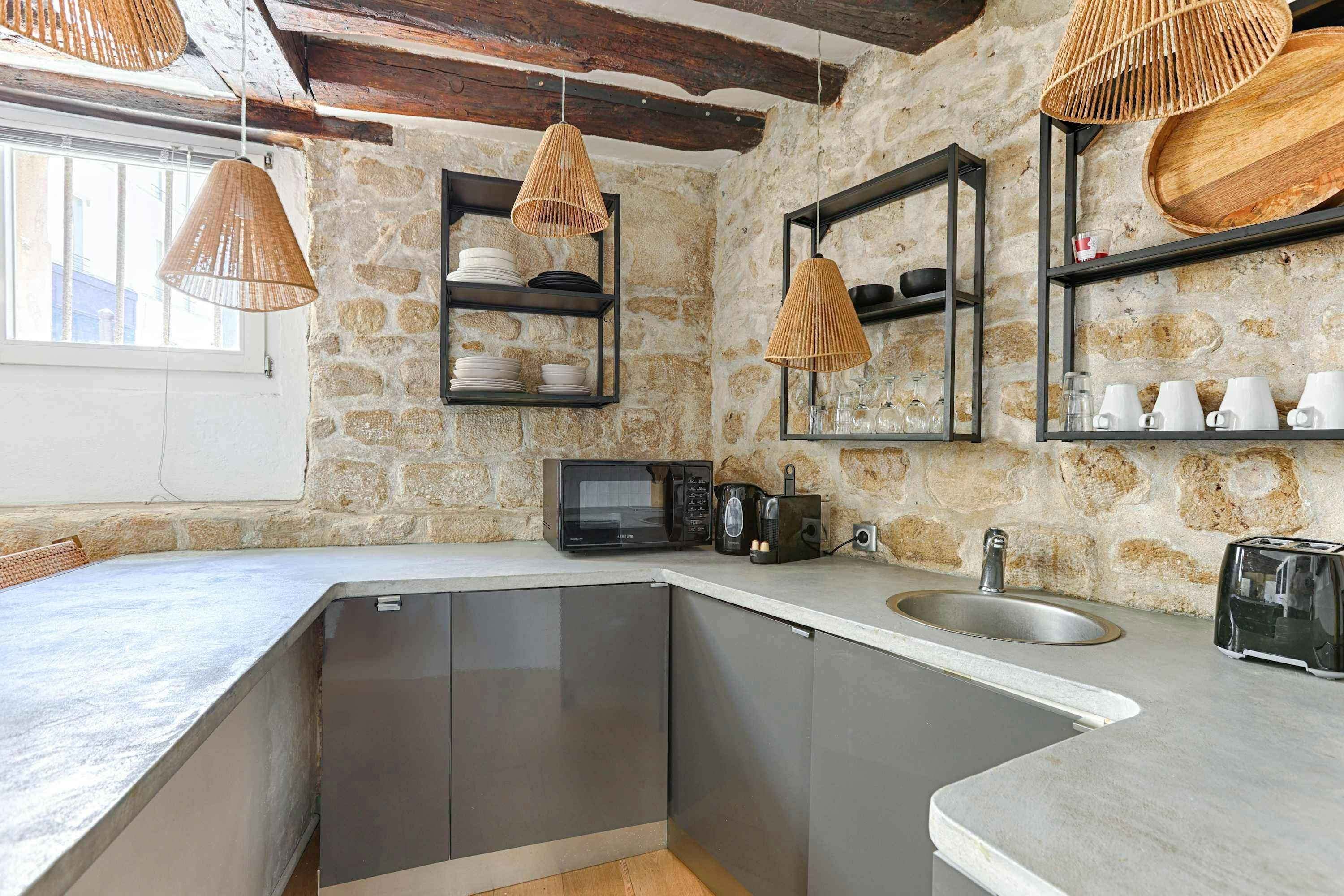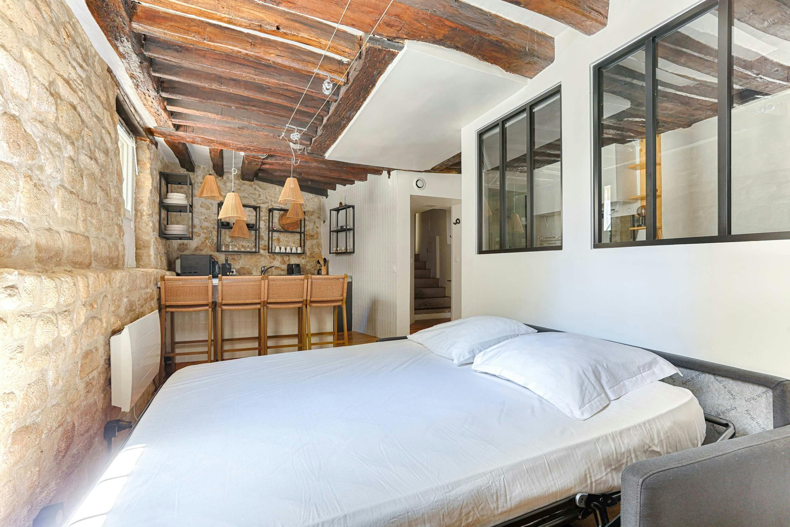 This unorthodox basement apartment makes clever use of space without forsaking a sense of style. While there's room for four using the sofa bed, this realistically renders the stone-walled living area out of action, though there's still room for seating, cabinets and a TV in the corner. At the other side of the room is a kitchen area, with its own breakfast bar and seating. Behind this space is a cosy double bedroom which is still able to let in light, with direct access to the bathroom. Out the front door, you'll be moments from Place de la Bastille, with the charming district of Roquette offering many popular cafes, bars and restaurants.