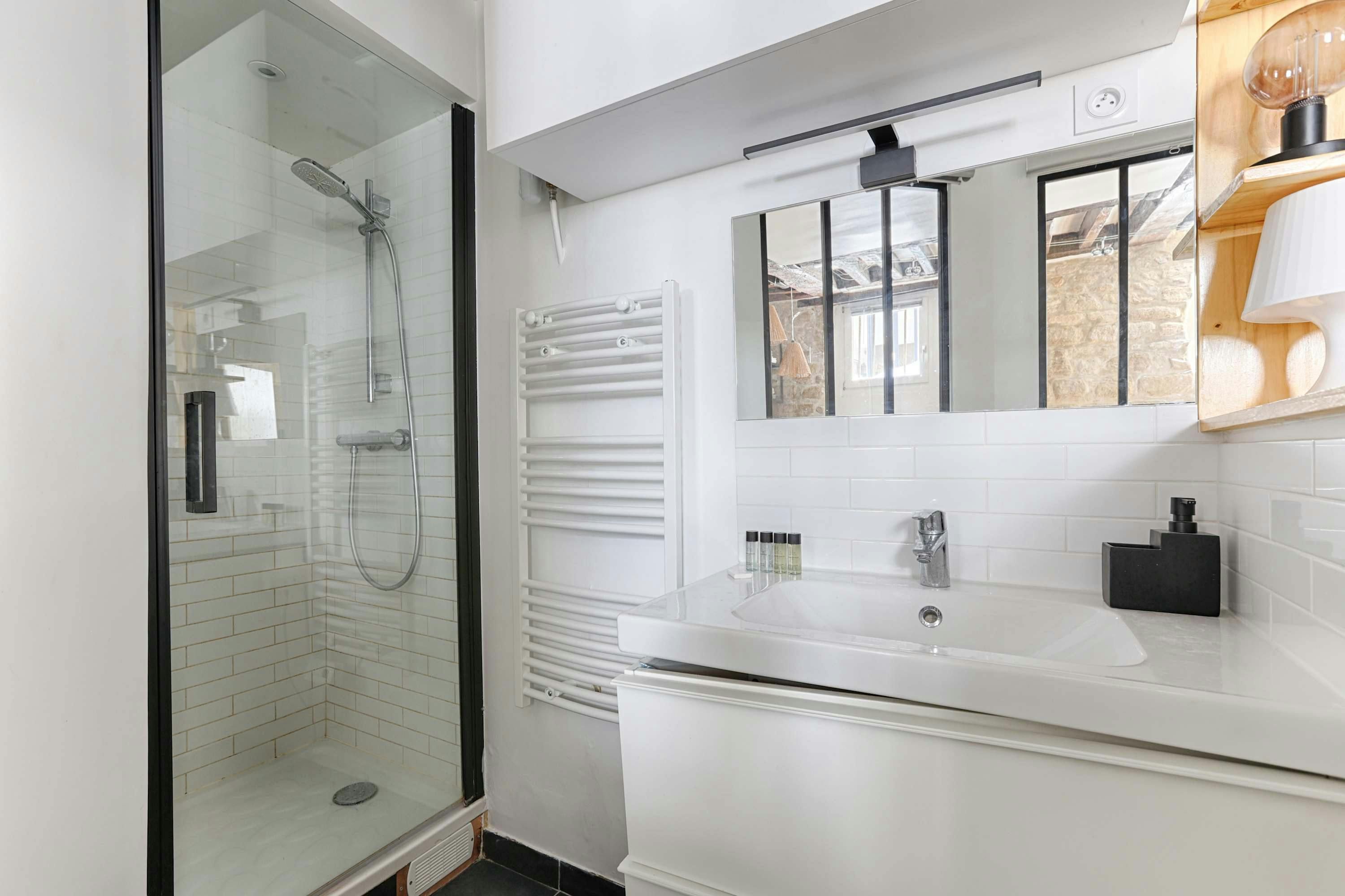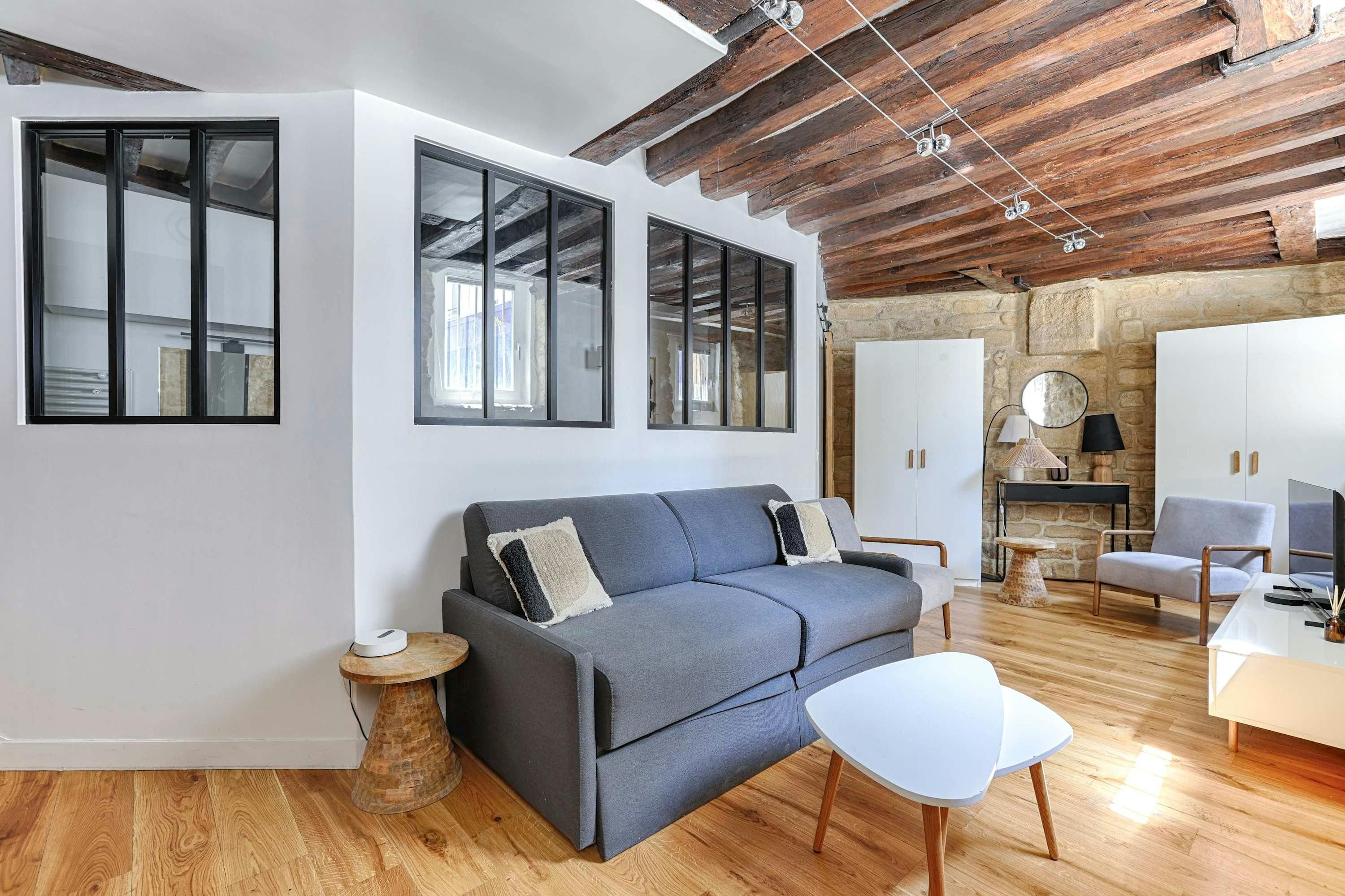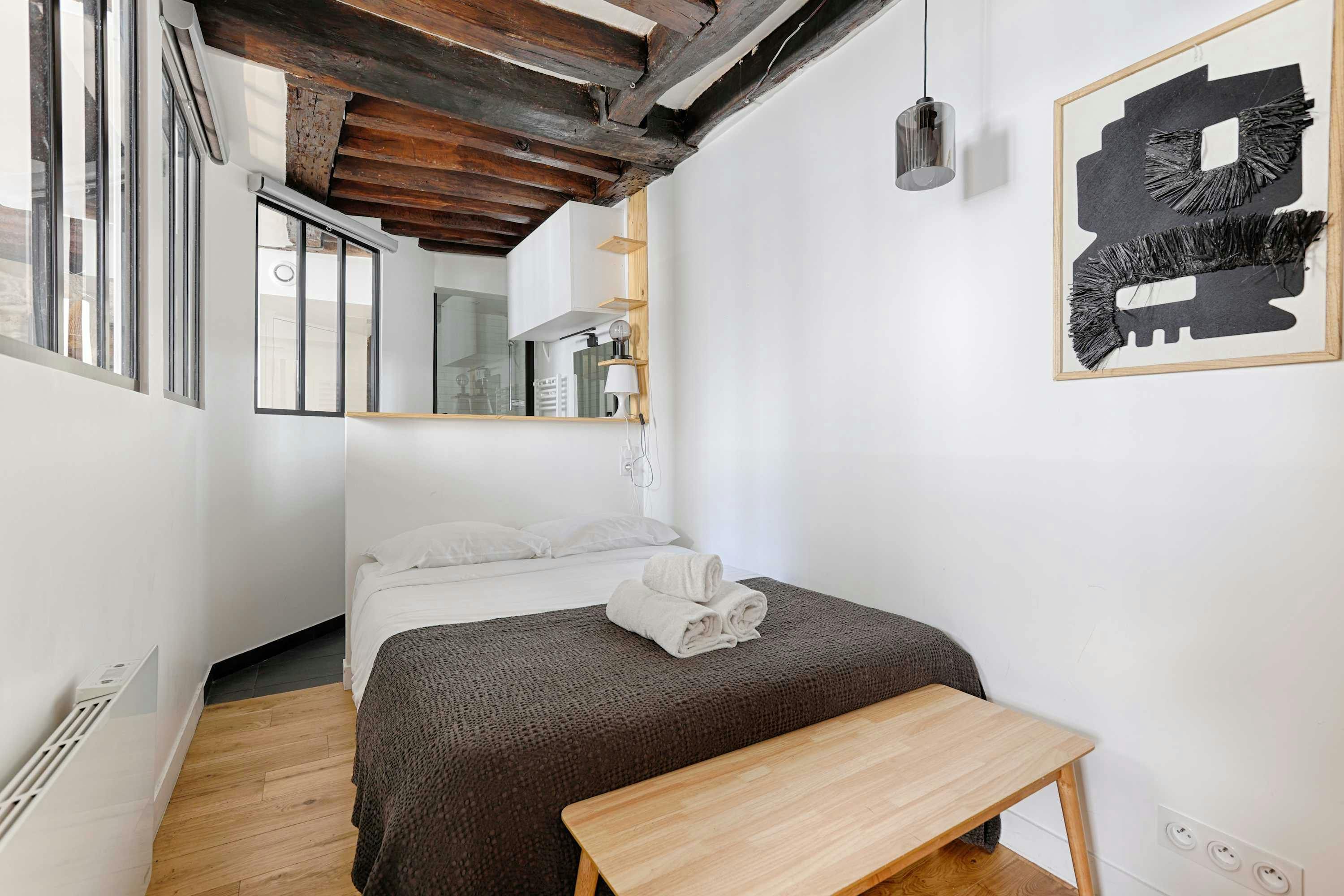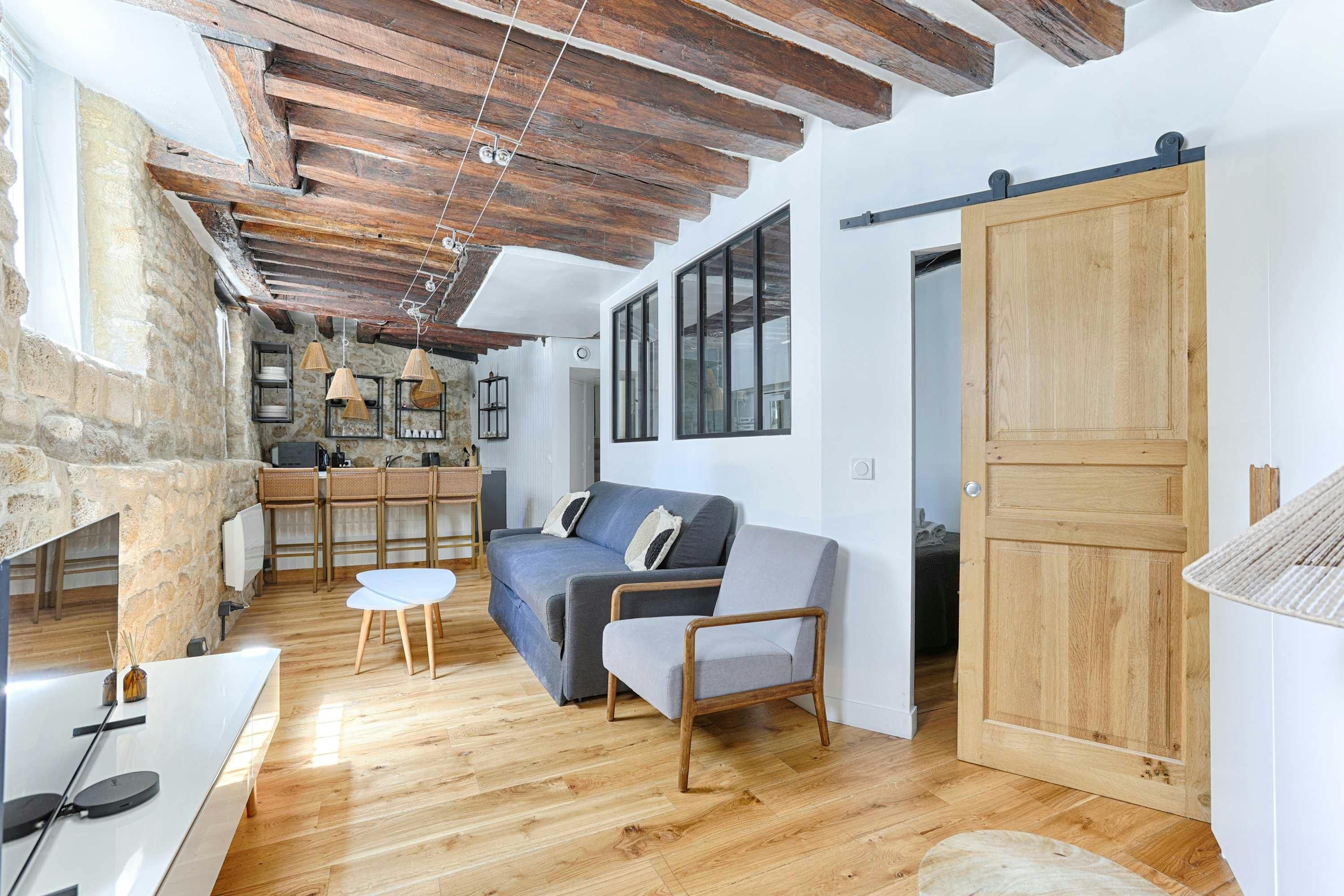 This unorthodox basement apartment makes clever use of space without forsaking a sense of style. While there's room for four using the sofa bed, this realistically renders the stone-walled living area out of action, though there's still room for seating, cabinets and a TV in the corner. At the other side of the room is a kitchen area, with its own breakfast bar and seating. Behind this space is a cosy double bedroom which is still able to let in light, with direct access to the bathroom. Out the front door, you'll be moments from Place de la Bastille, with the charming district of Roquette offering many popular cafes, bars and restaurants.