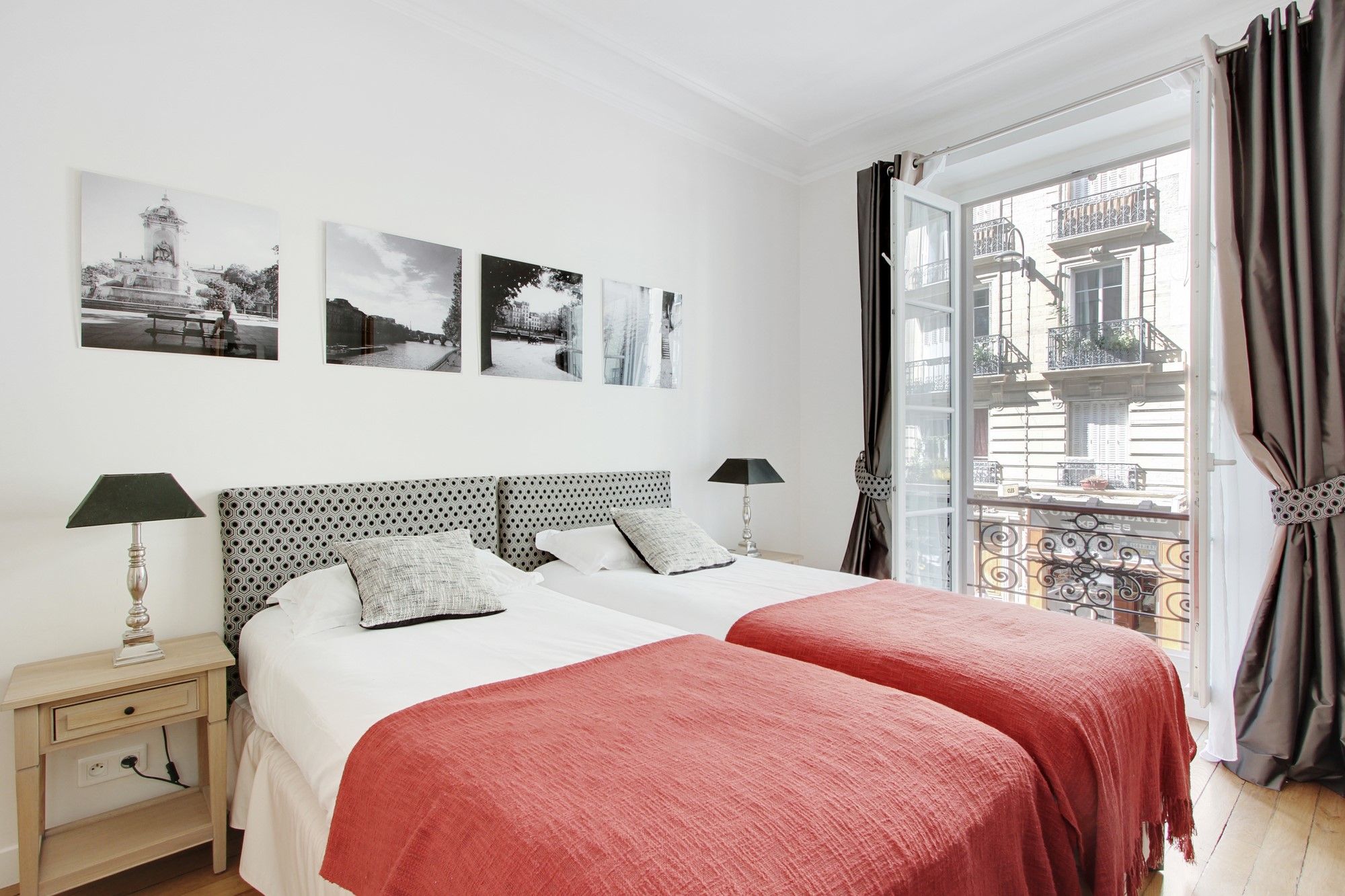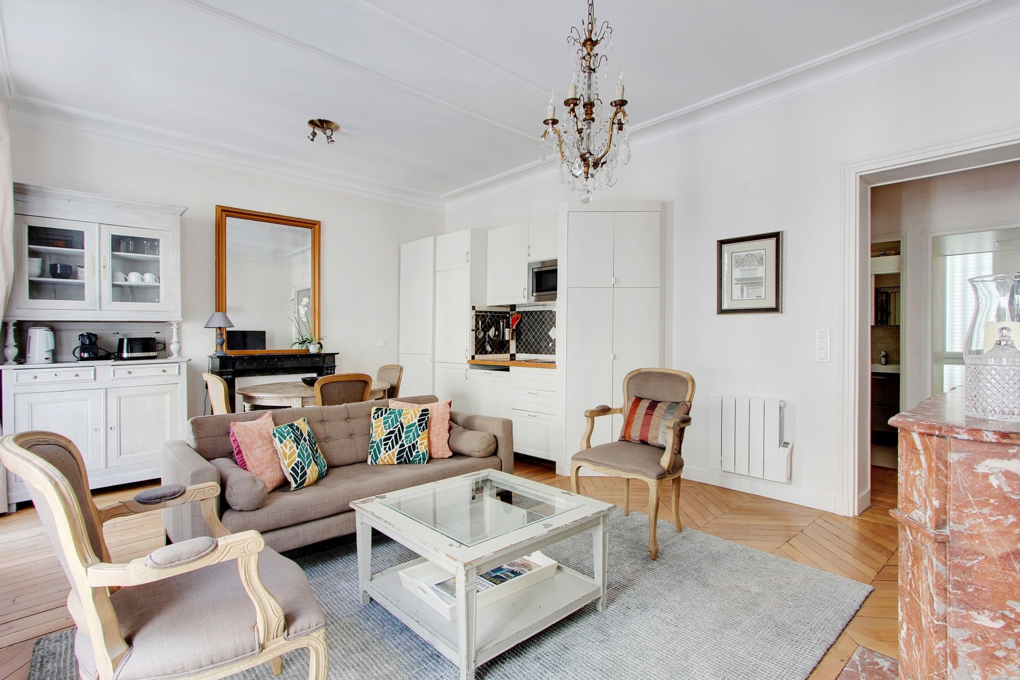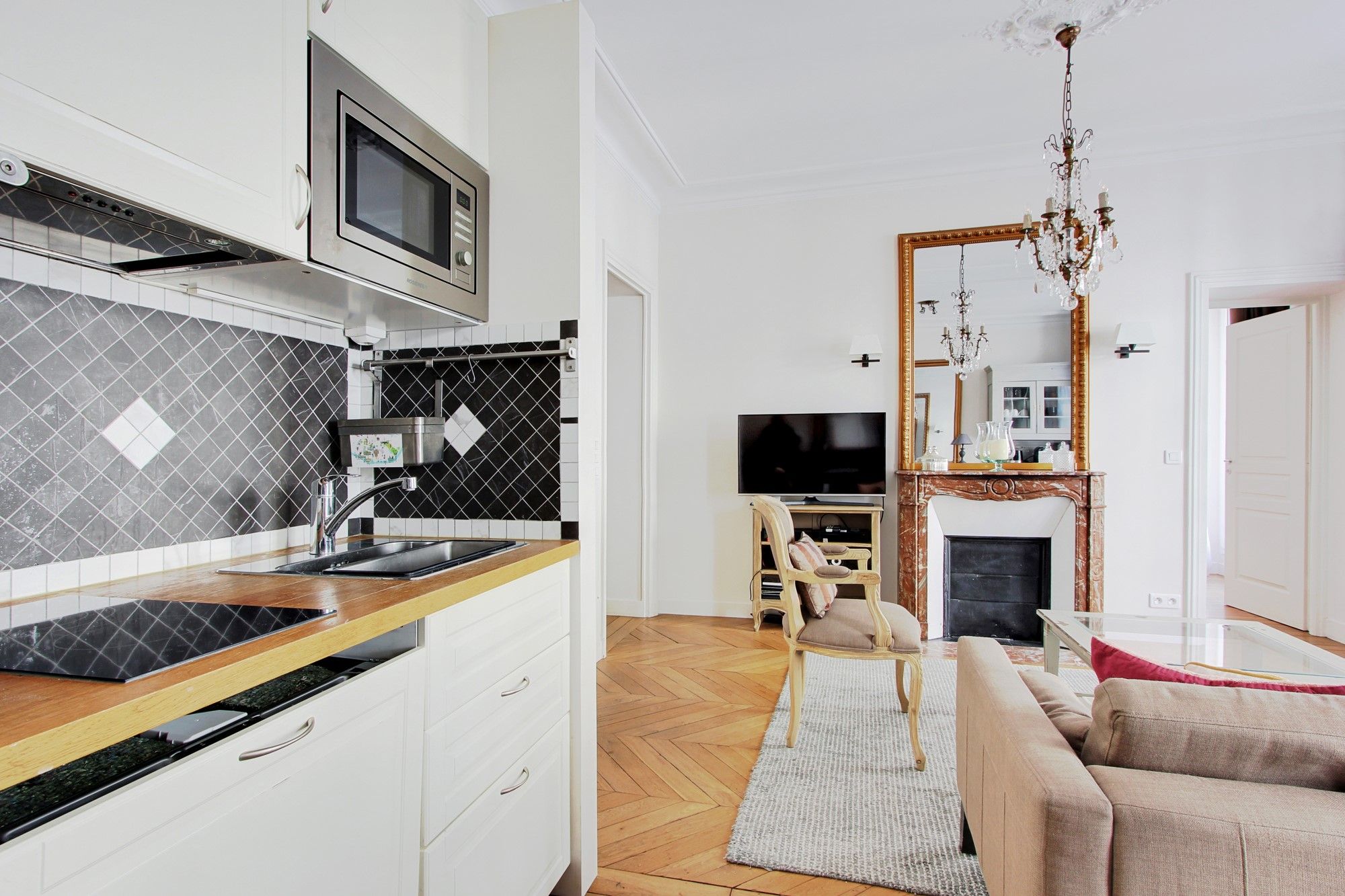 Just a fifteen-minute walk from the Eiffel Tower, this is a plush Paris pad that captures the debonair atmosphere of its 7th arrondissement setting. The main room exudes elegance with its crystal chandelier, herringbone wood floors, swish armchairs and the pair of French doors that lead out to Juliet balconies. Make yourself a coffee in the kitchenette, then people-watch as you survey your neighbourhood or kick back on the sofa while you plan your day of activities. You’re in the city’s cultural heart here with Les Invalides just an eight-minute walk away, the Musée Rodin and Musée d’Orsay walkable in less than twenty and Rue Cler right on your doorstep, famous for its vibrant cafes, restaurants and gourmet shops. After a day of exploring, come back home for a glass of wine on the sofa and a meal around your dining table. Then retreat to your bedrooms – where you'll find two more Juliet balconies – to wish the city a ‘bonne nuit' before settling into a restful night’s sleep.