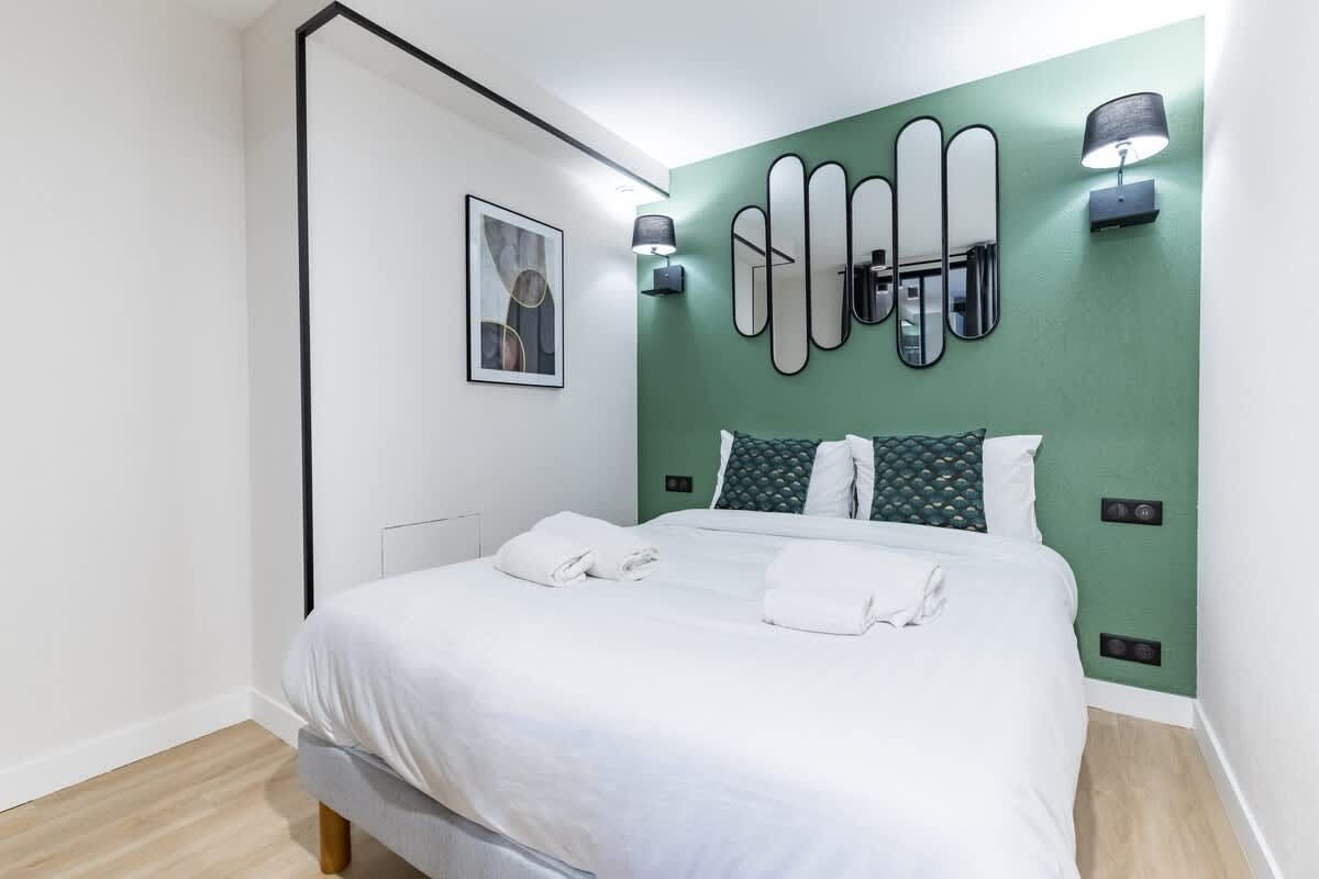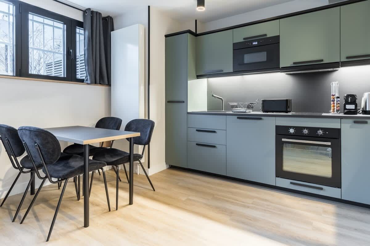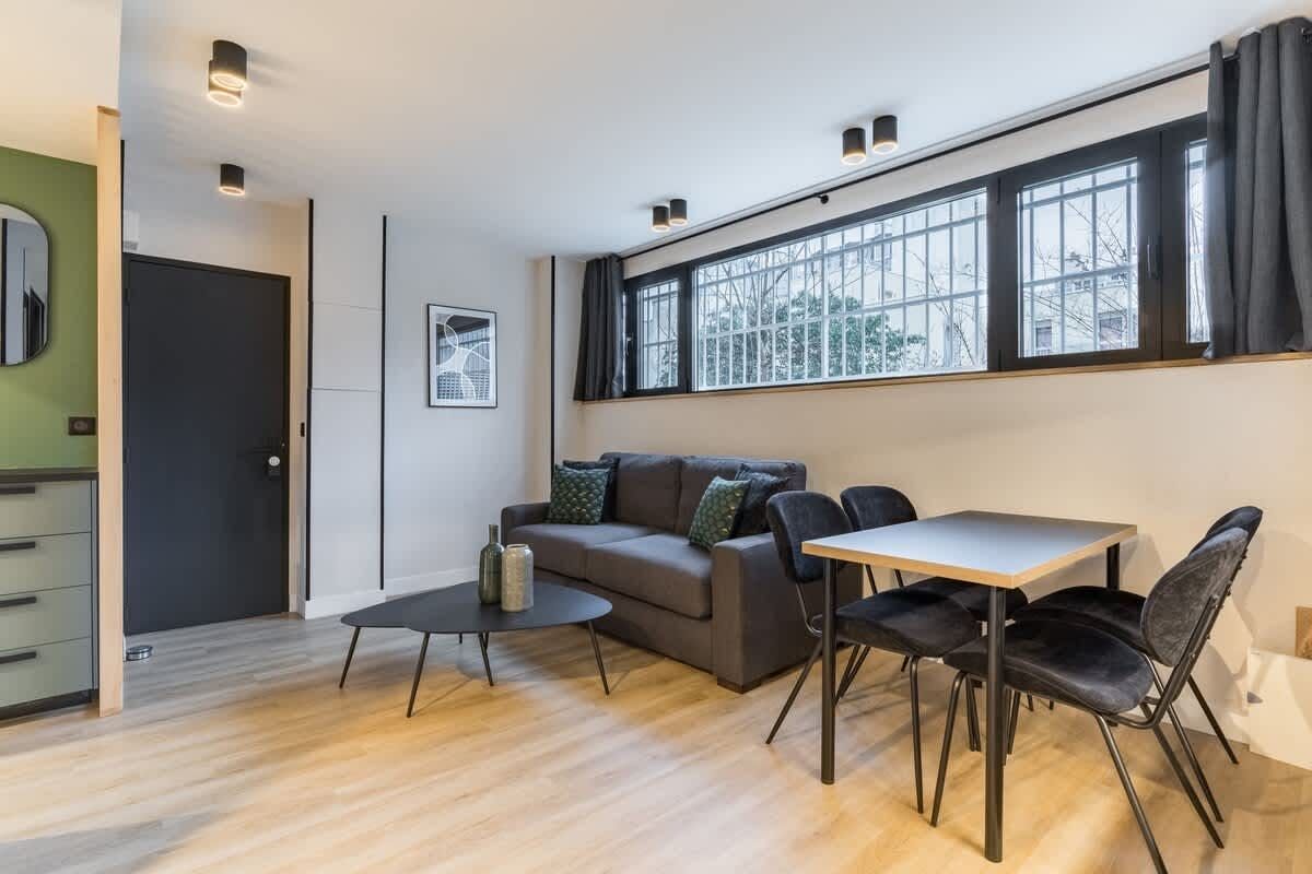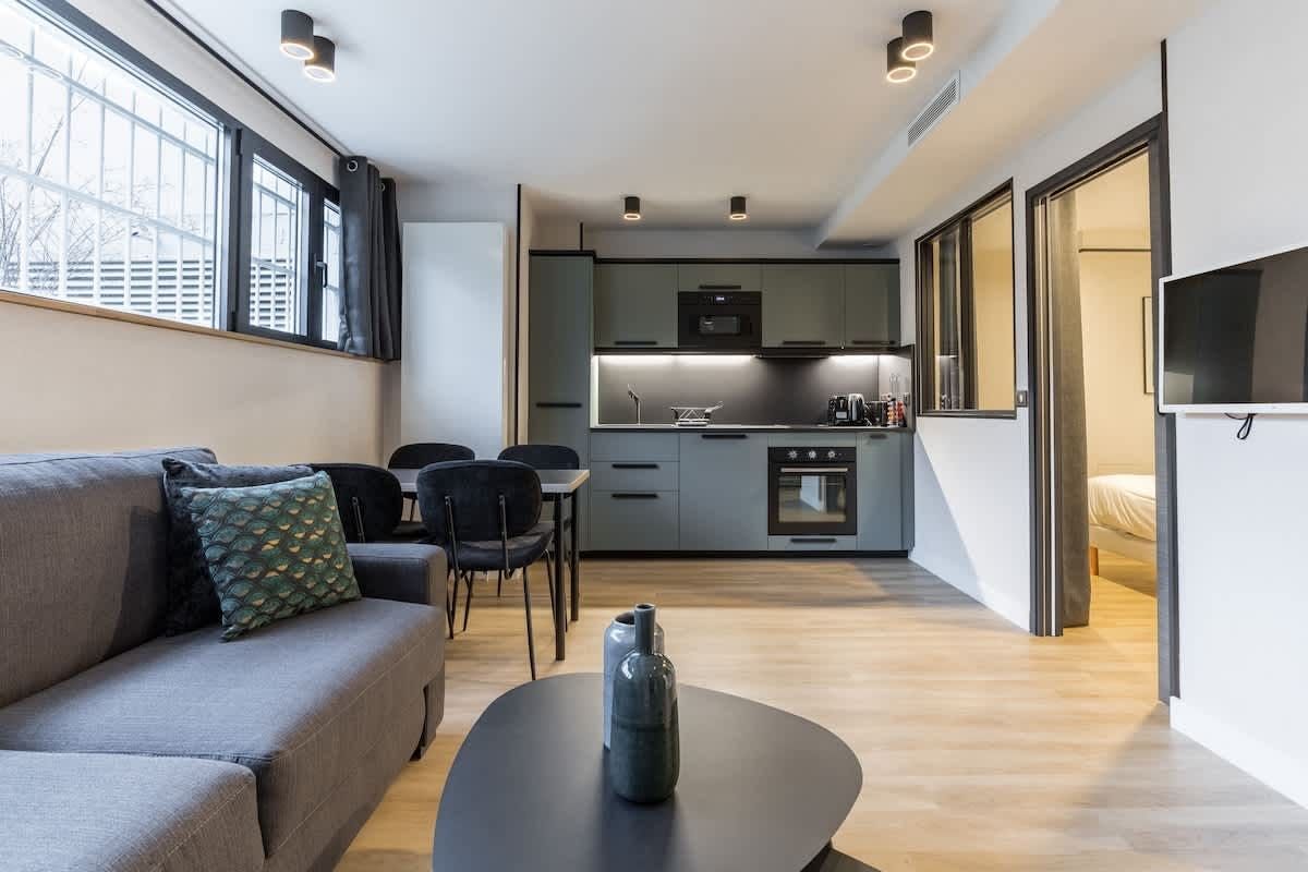 Situated in the heart of the 11th arrondissement, just steps from the vibrant Rue Oberkampf, you’ll be surrounded by shops, cafes and restaurants. There are a variety of green spaces and scenic canals to stroll around too. With a modern open-plan living space, this apartment is a great place to unwind after a busy day. This room, we should mention, also sleeps guests three and four on a sofa bed. Another thing to note is that the bedroom has no window, but it borrows light from the lounge. This home offers a convenient base from which to explore the City of Light.