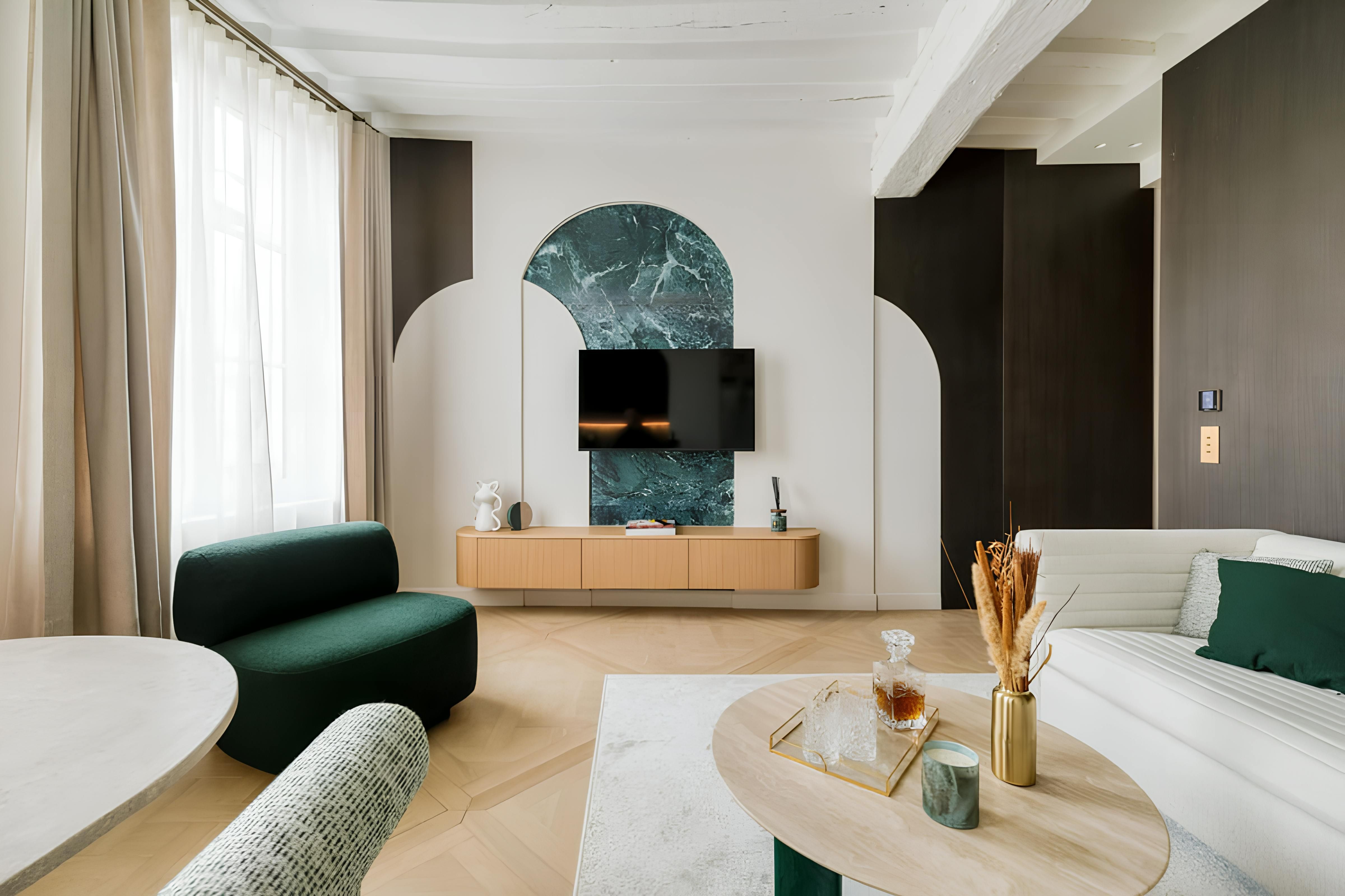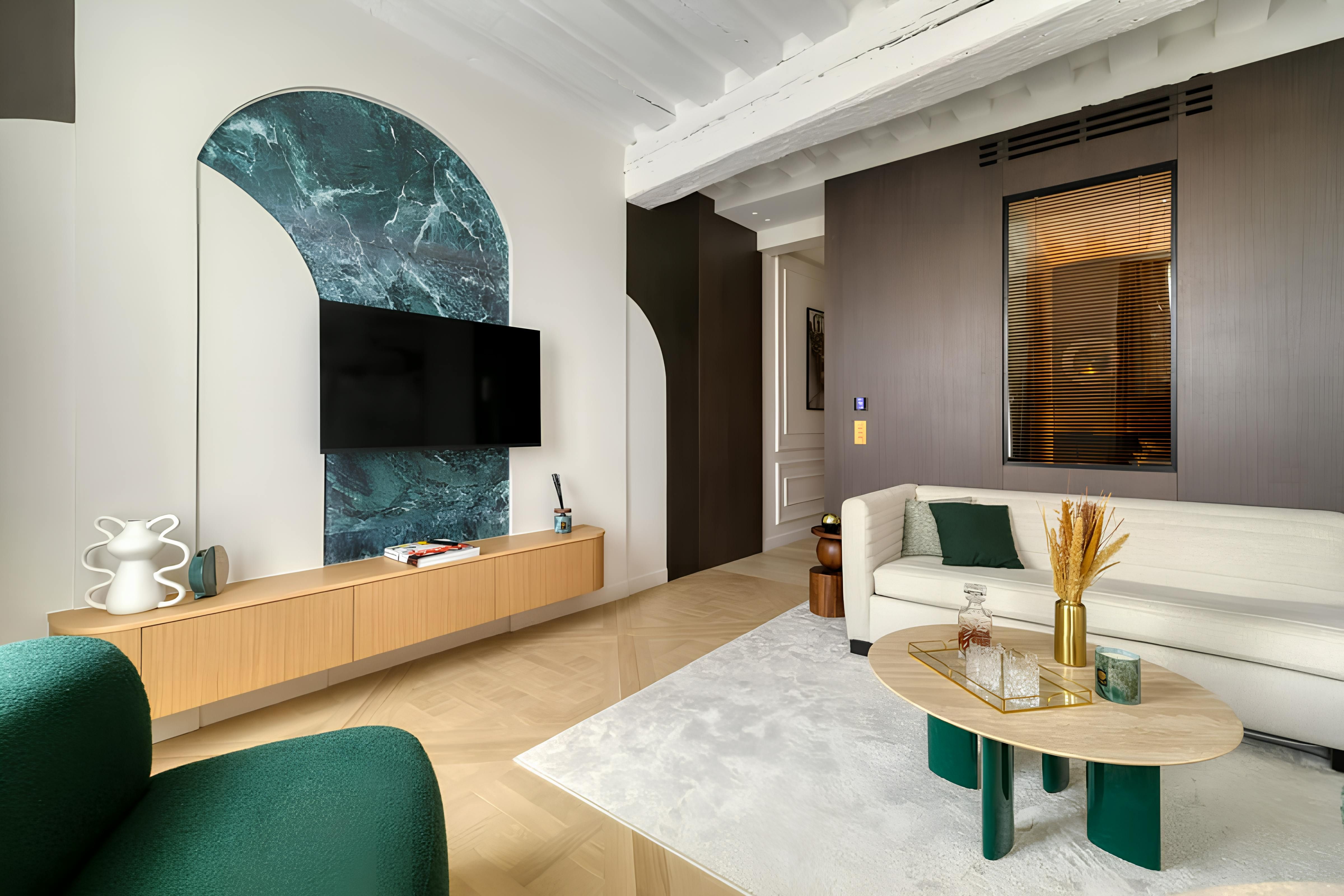Situated on the Quai des Grands Augustins, opposite the Île de la Cité, you’ll be a short stroll from the Notre Dame Cathedral when you stay at this architect-designed apartment. The Sainte Chapelle is also a short distance away, along with plenty of cafes and restaurants. The home itself is elegantly decorated and the open-plan living space sleeps two guests at full capacity and both bedrooms have marble en-suites. This place is a perfect option for a vacation with family or friends.