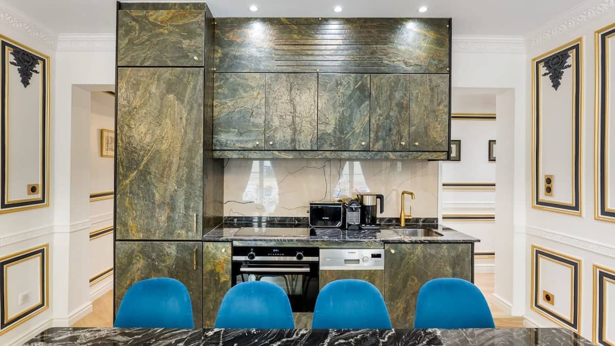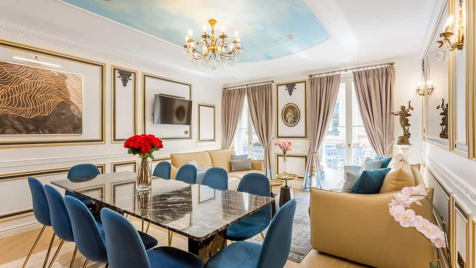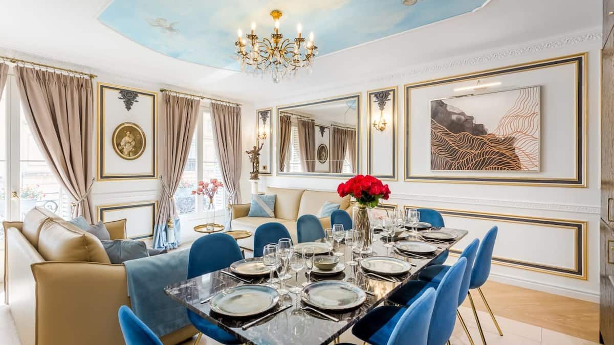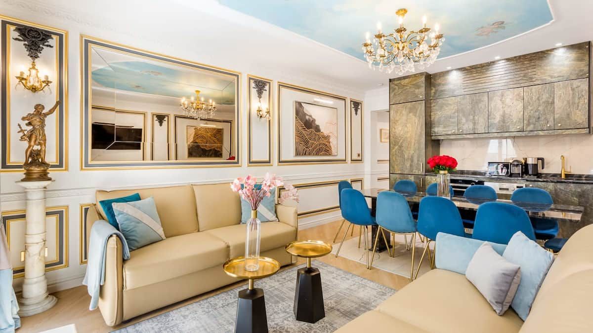 Positioned just 50 metres away from the Champs Élysées, one of the world's most iconic shopping streets, expect a luxurious experience from start to finish while staying in this neck of the woods. Built in 1784, under the reign of King Louis XVI, the apartment was fully renovated by a famous Parisian architect in keeping with contemporary living. High-end furniture and sumptuous finishings adorn every room with endless class and elegance. Magnificent marble finishings adorn the kitchen and bathrooms and will make you keen to refurbish your own home in this way after a stay here. Meanwhile, soft throws, cushions and curtain bring a homely aesthetic to an otherwise rather regal residence. When you can convince yourself to leave this palace of splendour, stroll just three minutes and you'll find a wealth of shops to explore. Head fifteen minutes down the Champs Élysées to soak up some of the best views in Paris from the top of the Arc de Triomphe. And if fine dining is your thing – who doesn't love quality food? Then look no further, as some of the city's most exclusive bars and restaurants reside in this district.