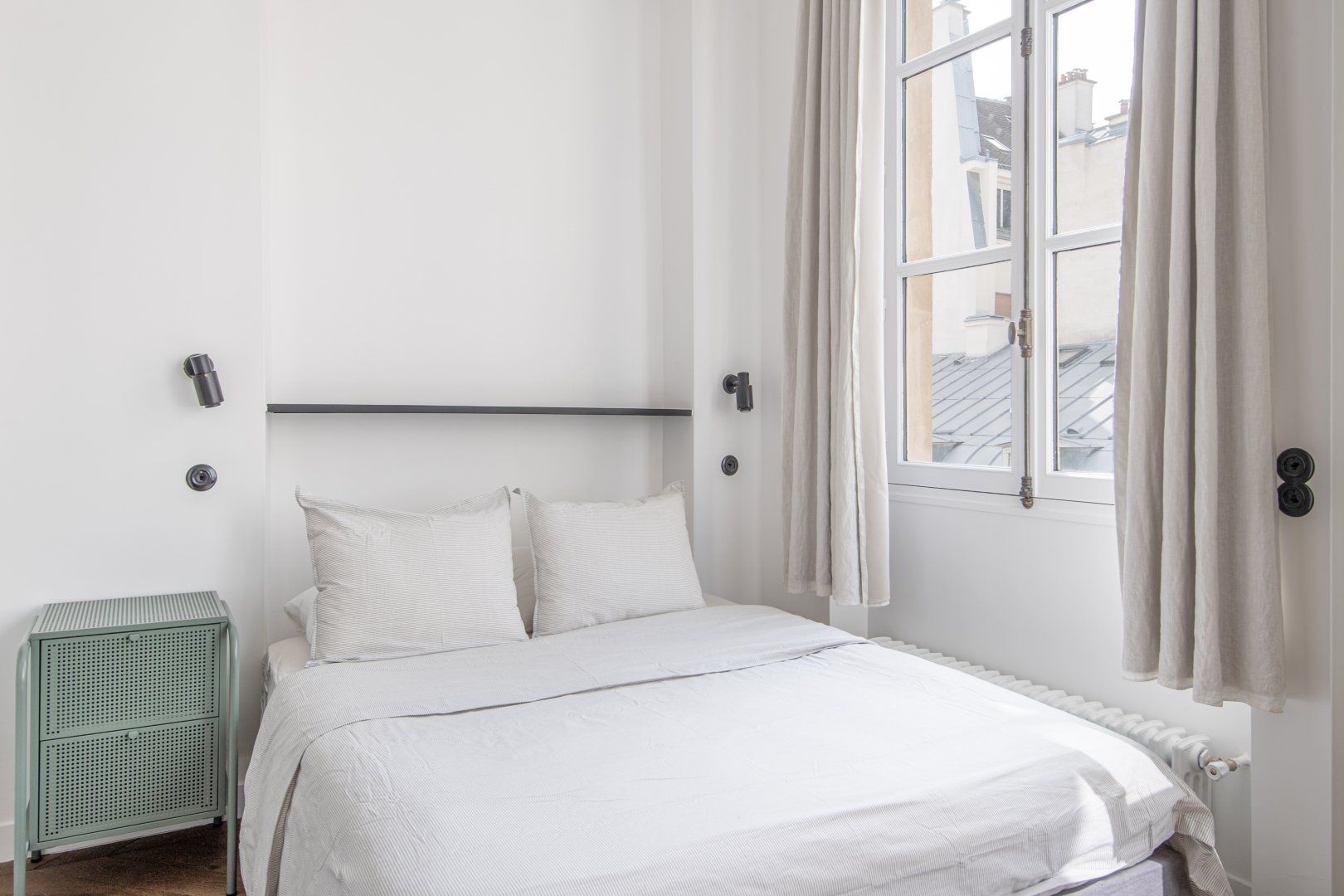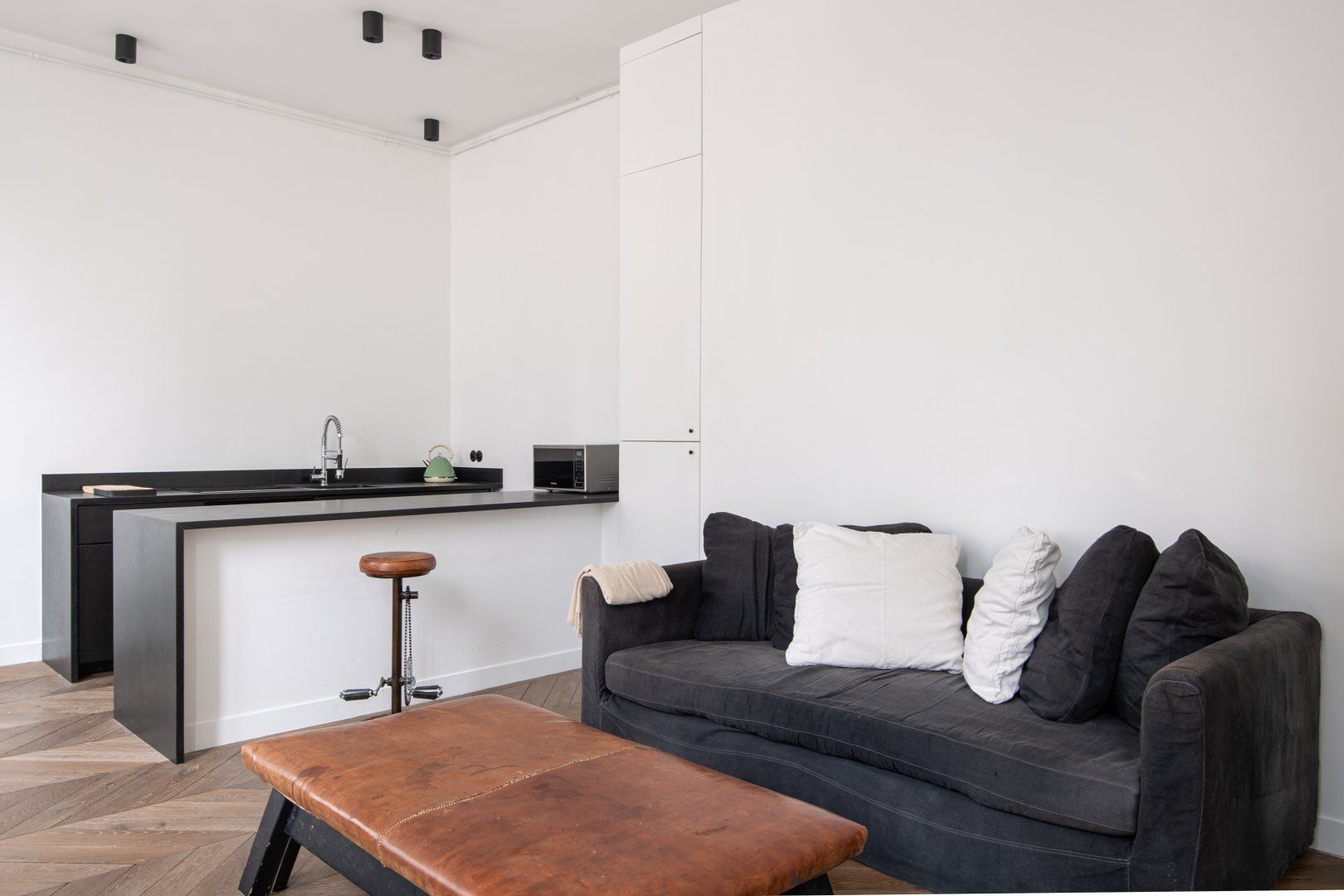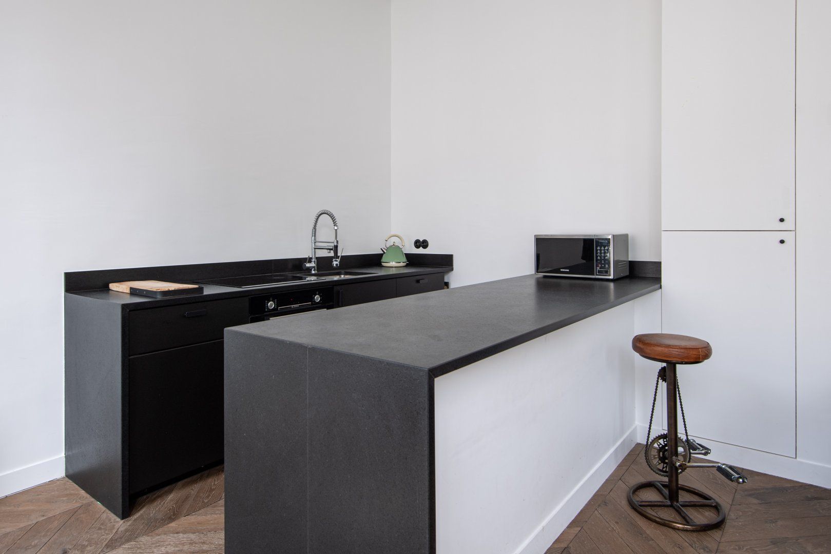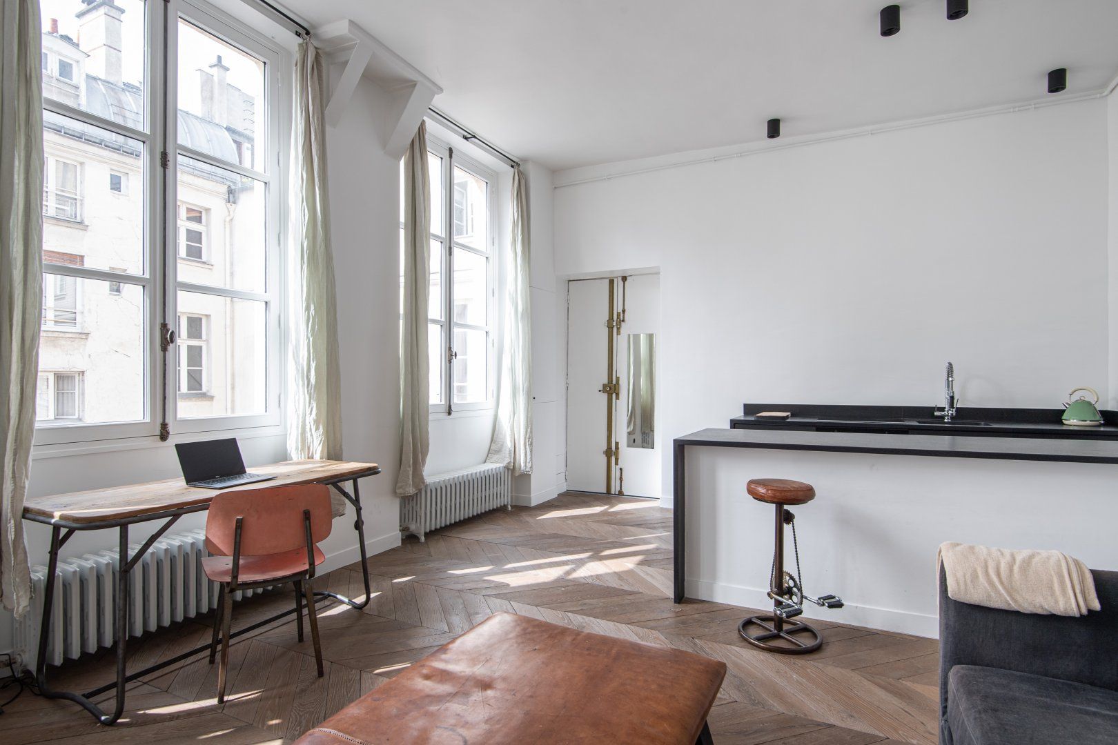 In the artsy Le Marais neighbourhood of Paris, you’re well-placed to explore typically Parisian boulevards and narrow streets packed with bistros, art galleries and boutiques. Further afield you’ll find Notre Dame cathedral a twenty-minute stroll away and the Filles du Calvaire metro stop is a six-minute walk, so you can explore every corner of the City of Lights with ease. Don't let the 17th-century exterior fool you; in artistic terms, this bijou apartment is a work of minimalist, modern art. Bright white walls allow the view of the (very quiet) courtyard from big French windows to be the main focus. Herringbone floor is a nod to traditional and the overall feel is something of an artist’s studio. The kitchen is a picture of sleek modernity in monochrome black against white and not a hint of clutter. Bar stools at the breakfast bar with pedals and a bike chain add a bit of quirkiness a la Tour de France.