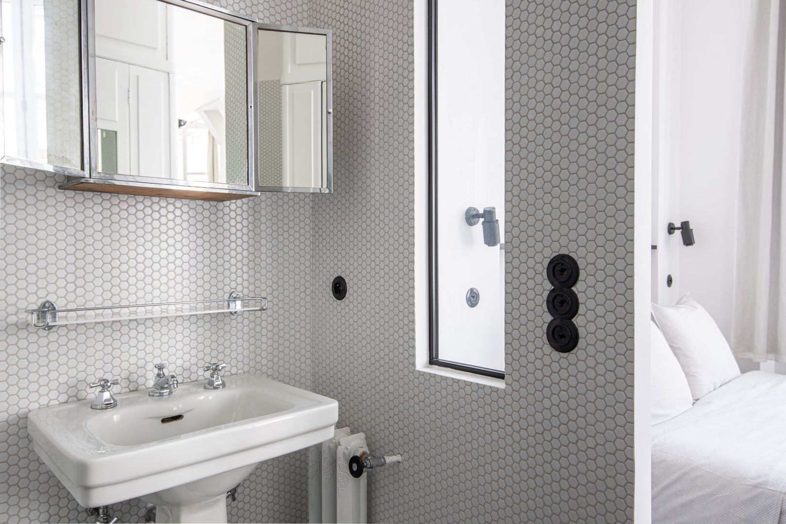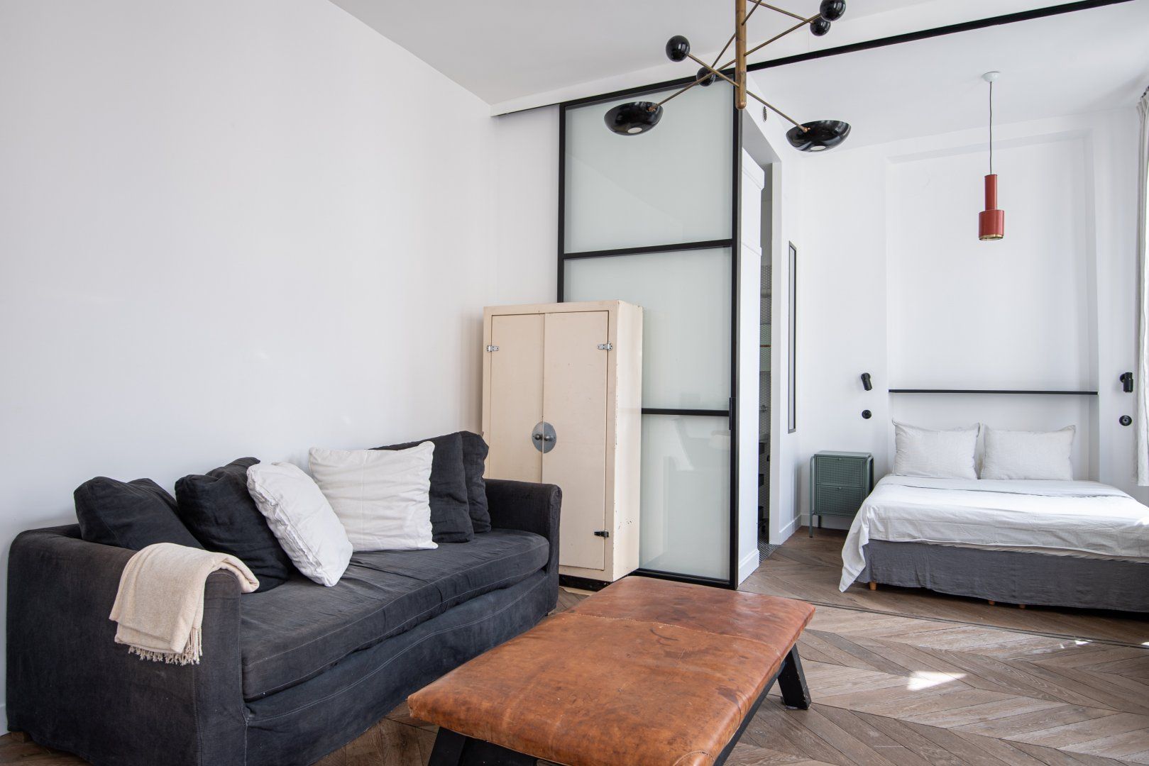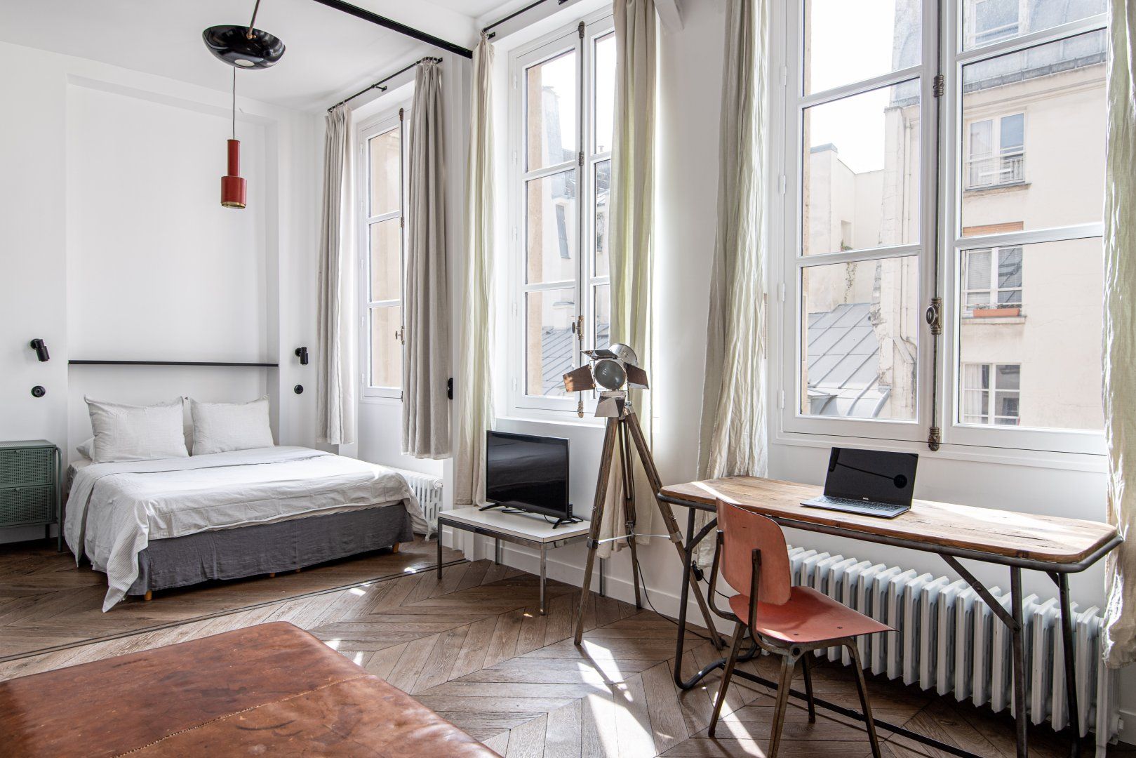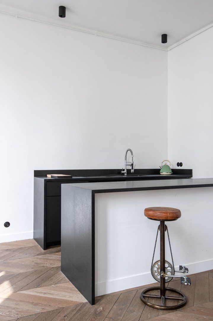 In the artsy Le Marais neighbourhood of Paris, you’re well-placed to explore typically Parisian boulevards and narrow streets packed with bistros, art galleries and boutiques. Further afield you’ll find Notre Dame cathedral a twenty-minute stroll away and the Filles du Calvaire metro stop is a six-minute walk, so you can explore every corner of the City of Lights with ease. Don't let the 17th-century exterior fool you; in artistic terms, this bijou apartment is a work of minimalist, modern art. Bright white walls allow the view of the (very quiet) courtyard from big French windows to be the main focus. Herringbone floor is a nod to traditional and the overall feel is something of an artist’s studio. The kitchen is a picture of sleek modernity in monochrome black against white and not a hint of clutter. Bar stools at the breakfast bar with pedals and a bike chain add a bit of quirkiness a la Tour de France.