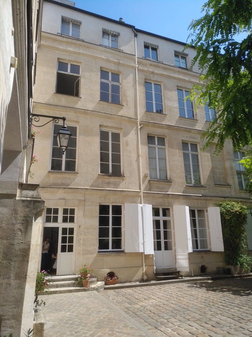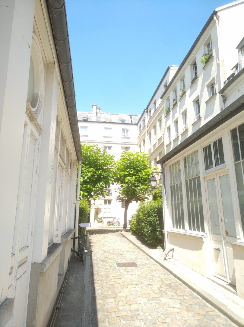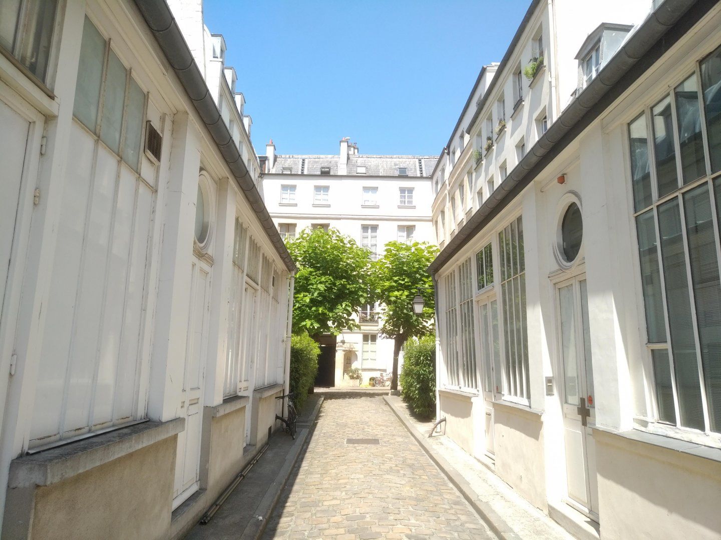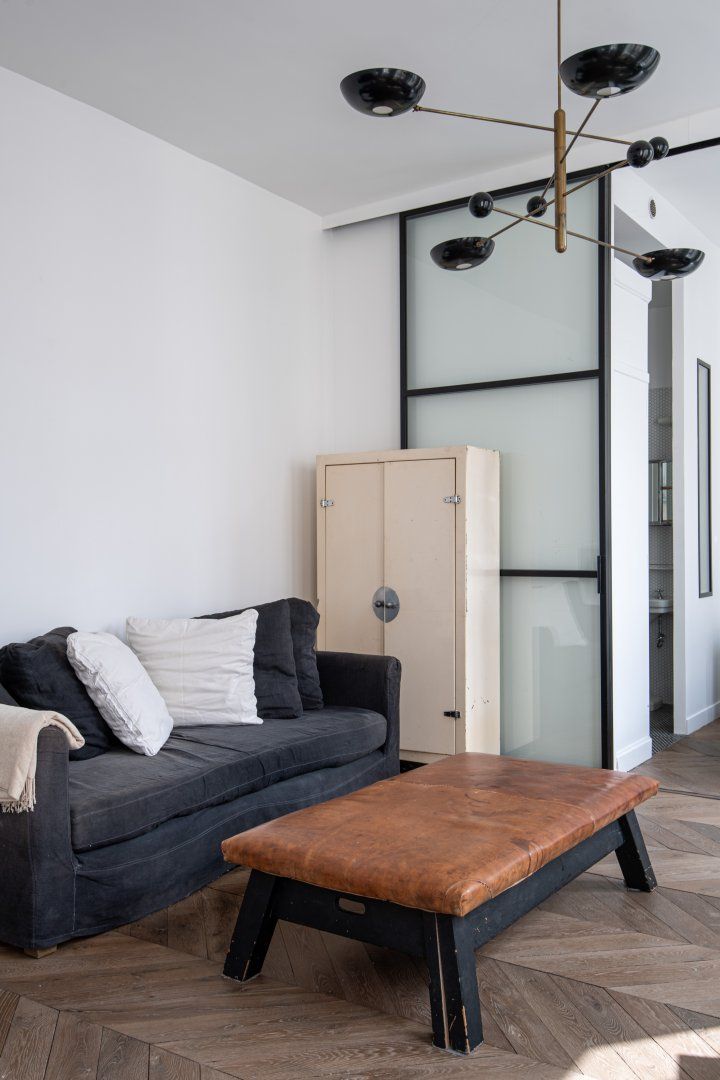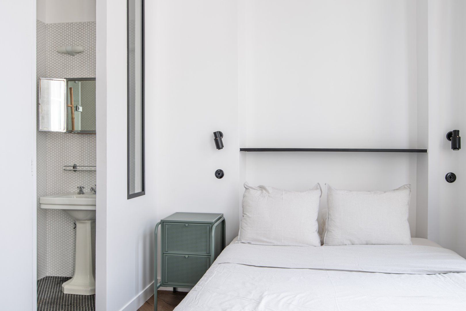 In the artsy Le Marais neighbourhood of Paris, you’re well-placed to explore typically Parisian boulevards and narrow streets packed with bistros, art galleries and boutiques. Further afield you’ll find Notre Dame cathedral a twenty-minute stroll away and the Filles du Calvaire metro stop is a six-minute walk, so you can explore every corner of the City of Lights with ease. Don't let the 17th-century exterior fool you; in artistic terms, this bijou apartment is a work of minimalist, modern art. Bright white walls allow the view of the (very quiet) courtyard from big French windows to be the main focus. Herringbone floor is a nod to traditional and the overall feel is something of an artist’s studio. The kitchen is a picture of sleek modernity in monochrome black against white and not a hint of clutter. Bar stools at the breakfast bar with pedals and a bike chain add a bit of quirkiness a la Tour de France.