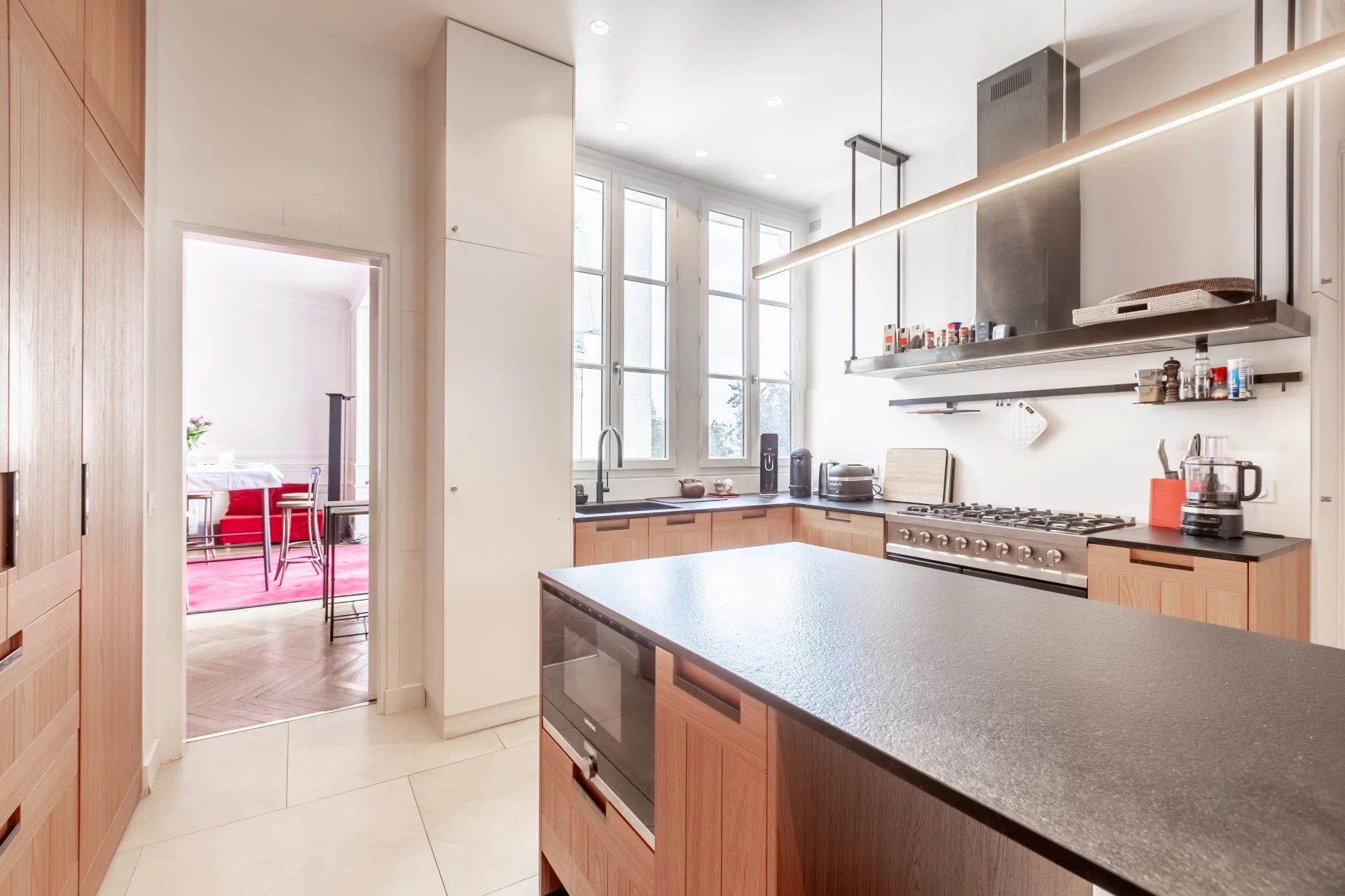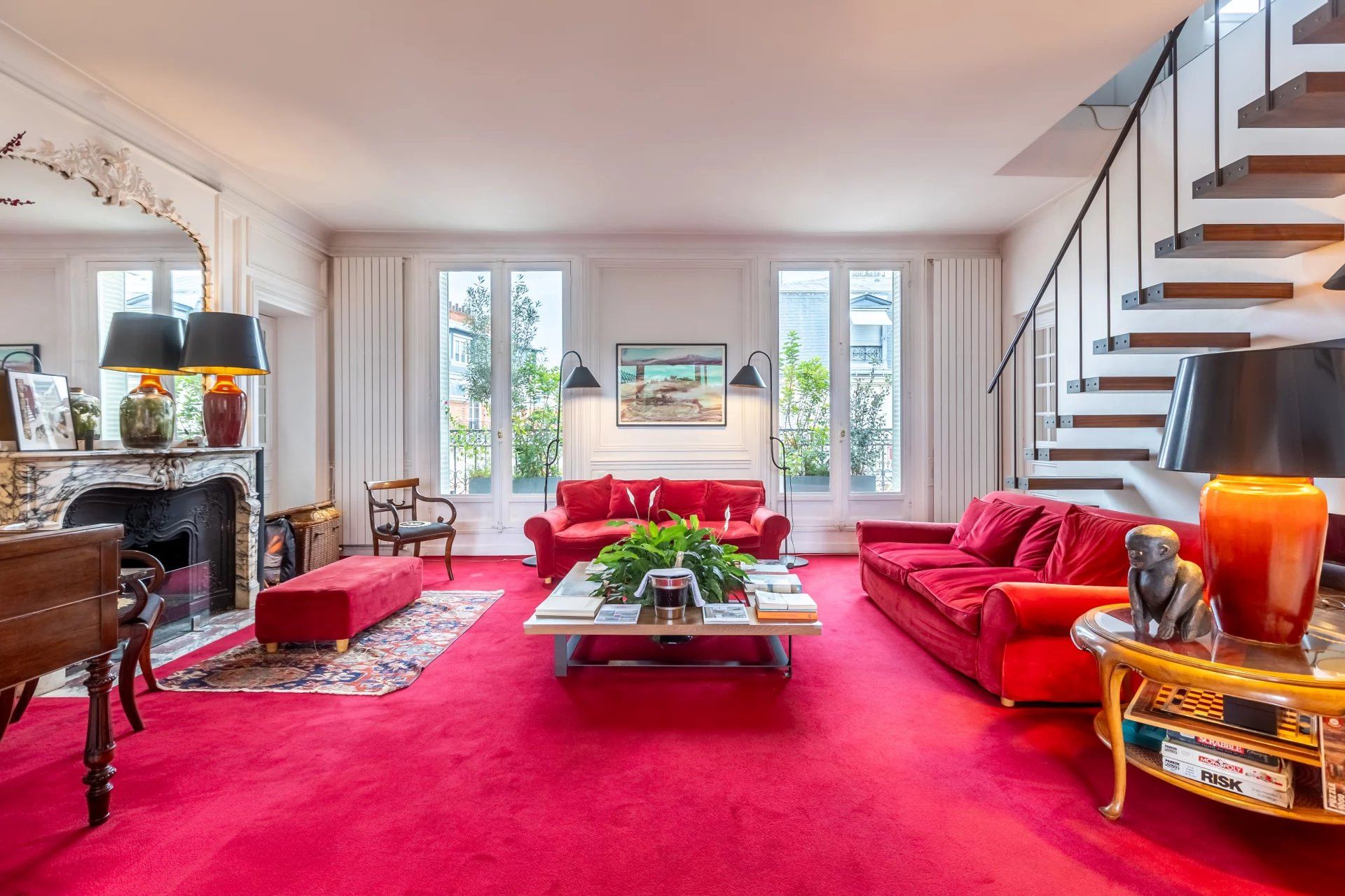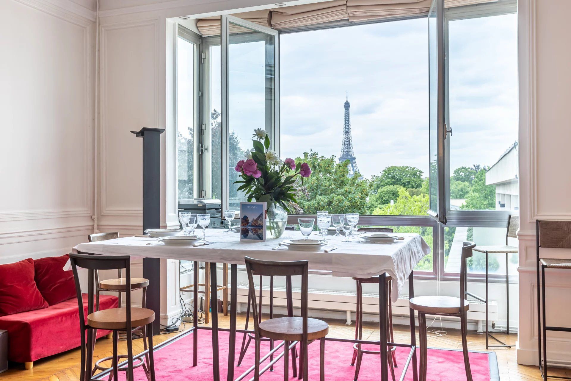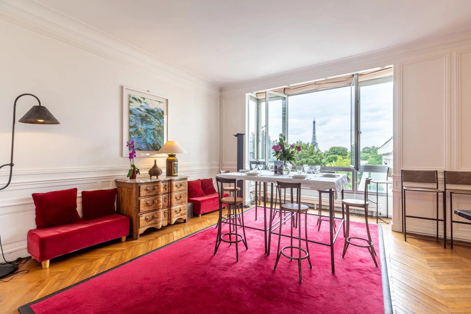 Within the prestigious 7th arrondissement, this charming, family-sized apartment offers views of the Eiffel Tower from its vantage point on a high floor. As the view suggests, some of Paris’ biggest attractions are within walking distance – the Musée d'Orsay, Champ de Mars, and the Eiffel Tower itself. There’s an authentically Parisian feel to the grand living room which some may call “dated”, but we feel is simply old-world French charm. The full kitchen is particularly spacious, and bedrooms are tucked away on the second level up a floating staircase (where small children should be supervised).