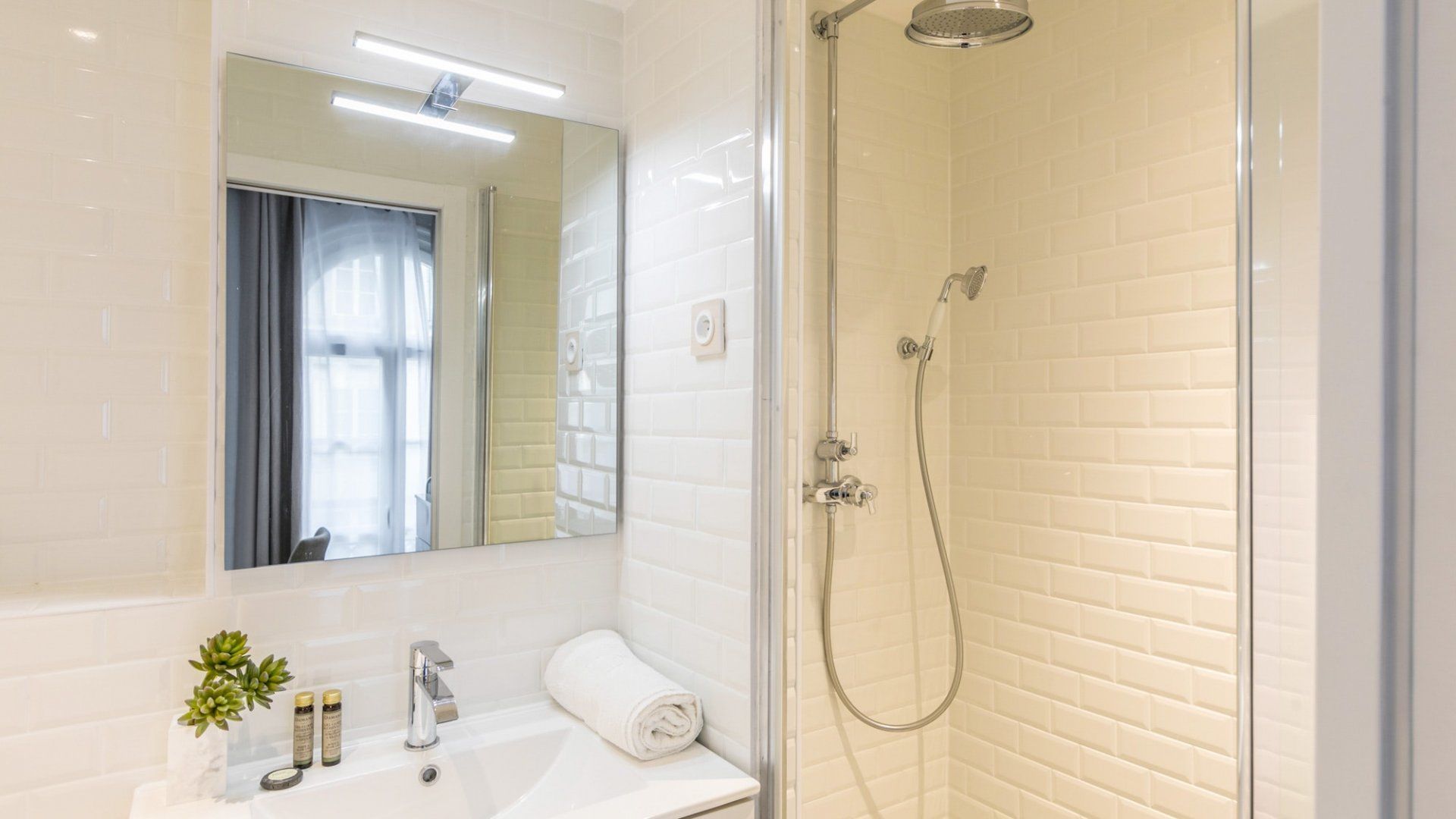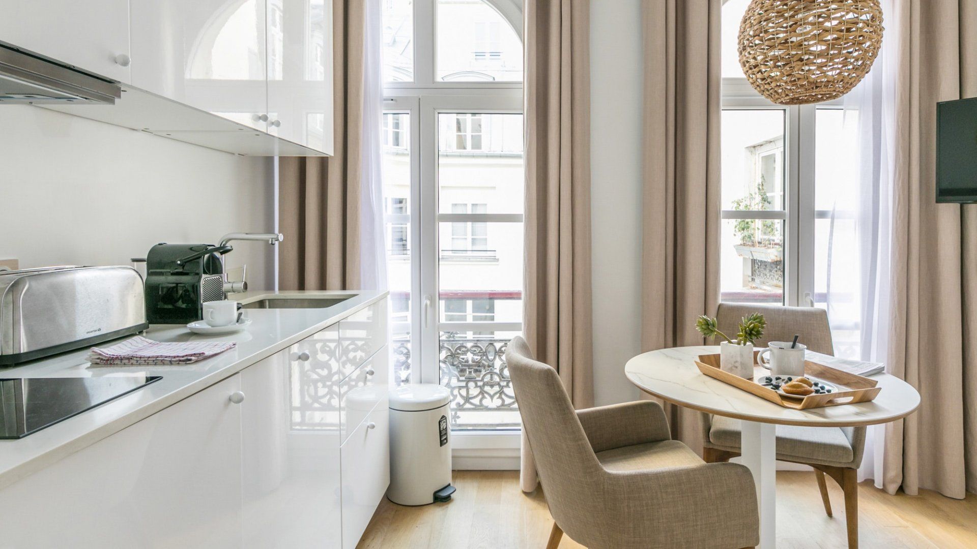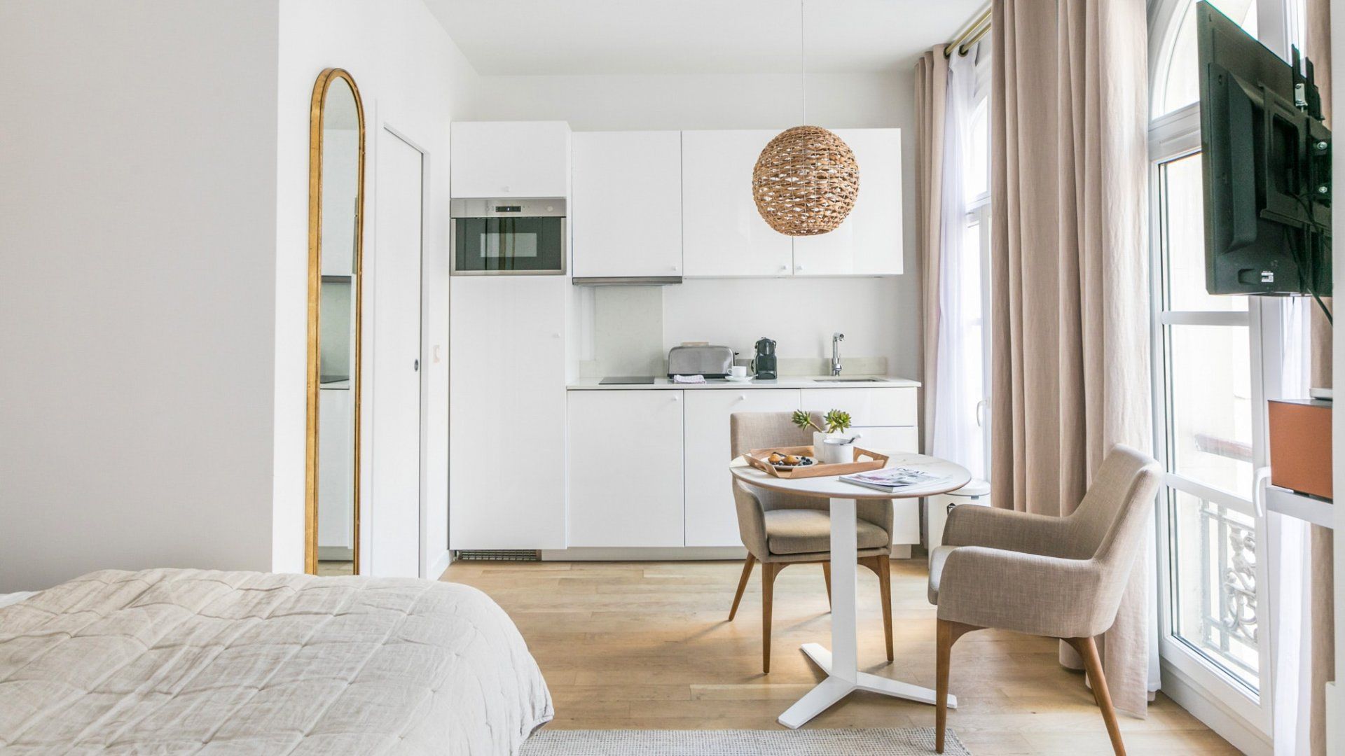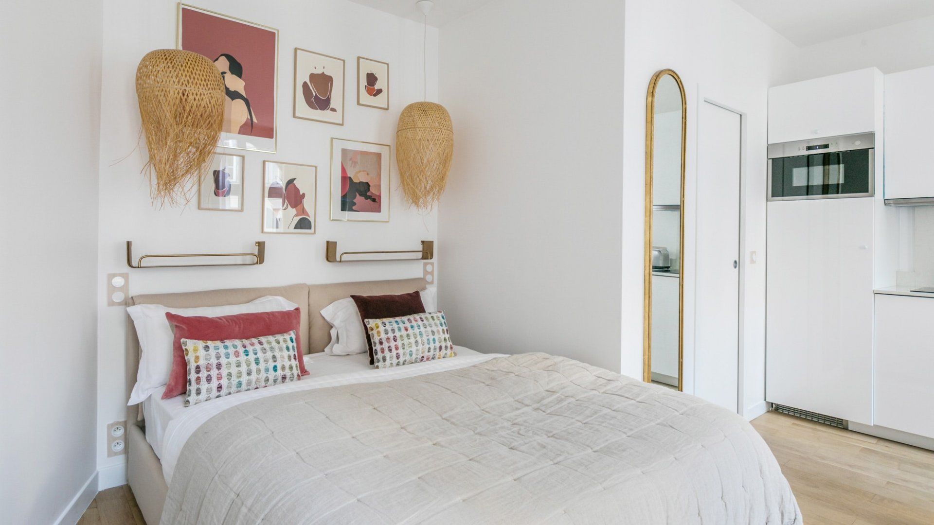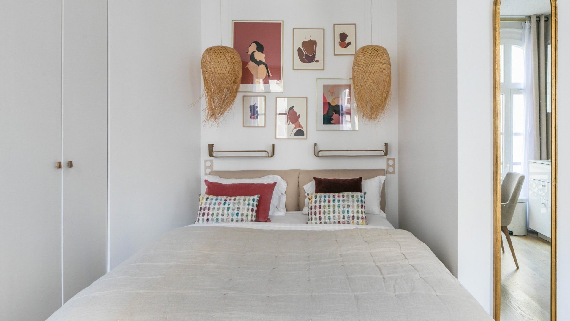 A modern and minimalist apartment that's fifteen minutes (on foot) from the Louvre Museum and its surrounding cultural attractions. The location is also a two-minute walk from Richelieu Drout metro station, in a very dynamic and beautiful area of ​​the city. The Grands Boulevards, Opera and Stock Exchange are less than ten minutes stroll away too. Come evening, catch a cabaret show at glitzy Moulin Rouge – a twenty-minute walk from your door. Inside the home, you'll find a calming pastel-pink palette and casual chic styling that makes for a relaxing space to unwind. Light pours in through the Juliet balcony, adding to the beachy feel in the bedroom, benefitting from hemp lighting, playful prints and brass fittings. Bright and airy, if you're looking for a sweet stay and a convenient place to call home while exploring Paris, this uplifting apartment is just the spot.