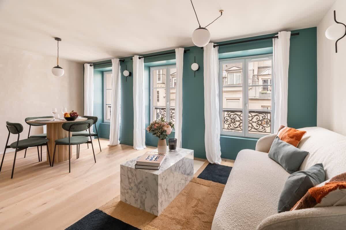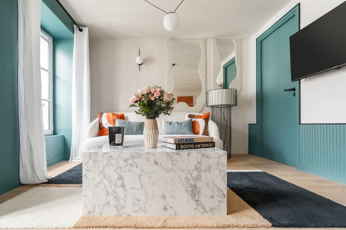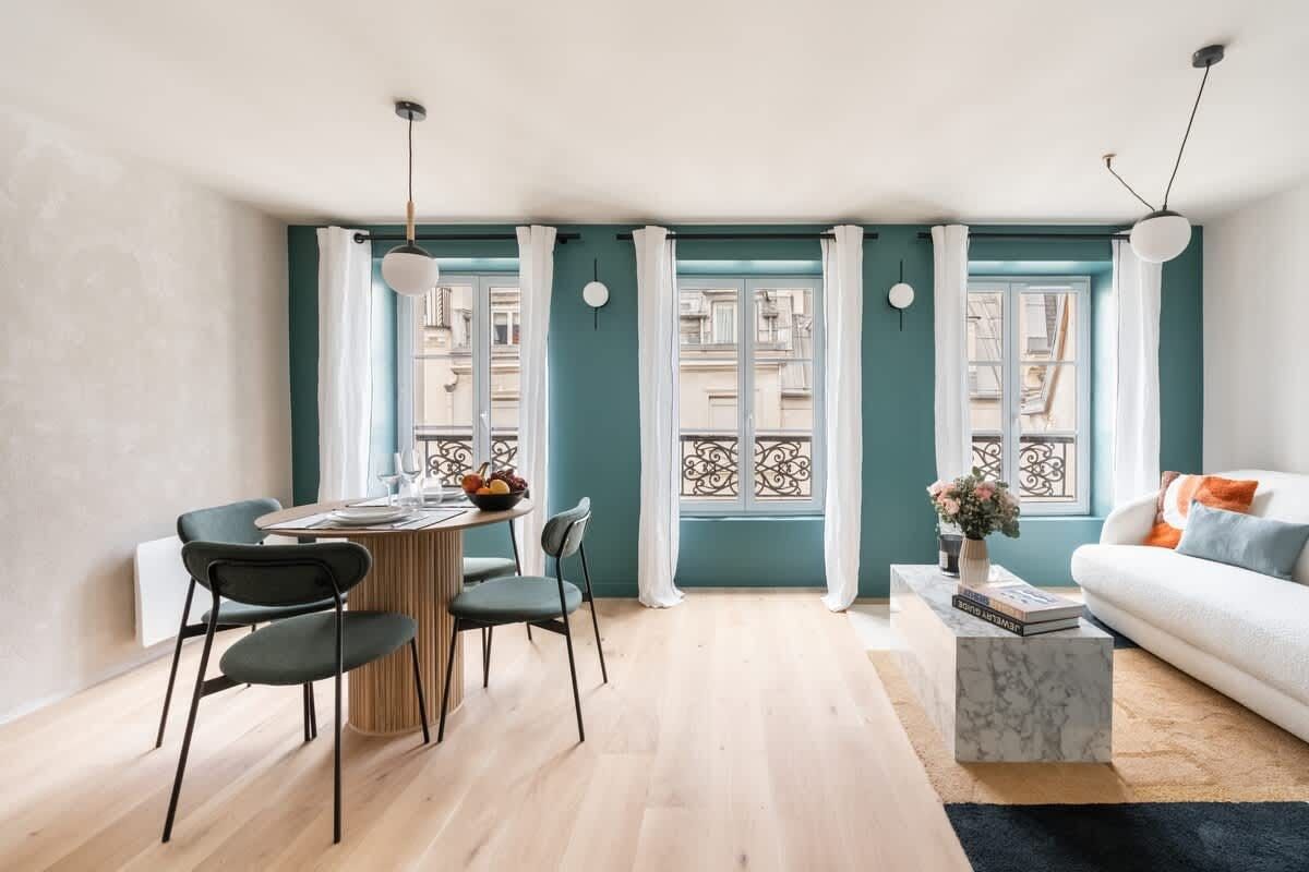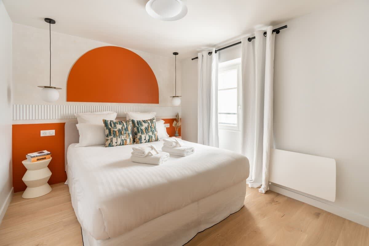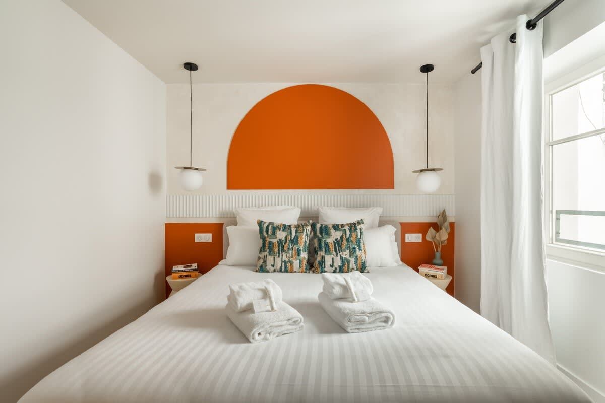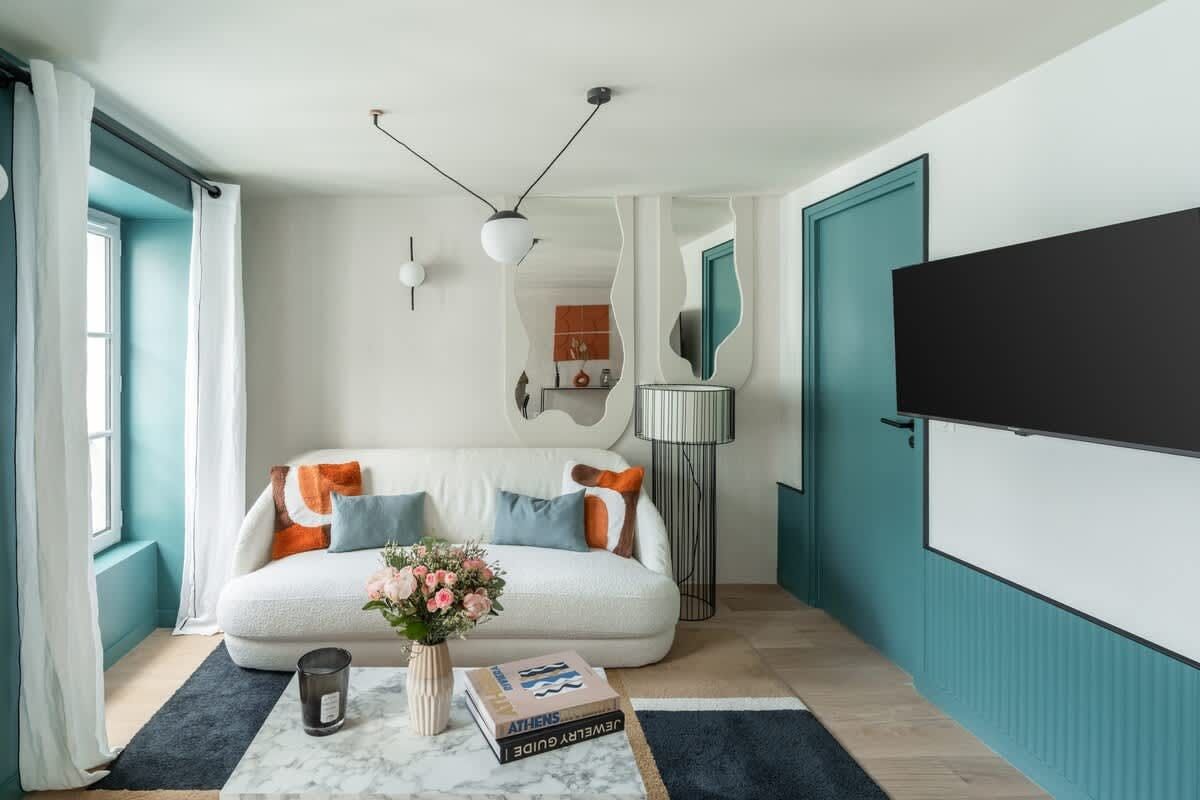 Situated right in the heart of the second arrondissement where it meets the Marais neighbourhood, this one-bedroom apartment is bold, bright and full of home comforts. Two large windows illuminate the living space, where colourful accents of blue and orange offer a playful atmosphere. Set on a quiet street in an otherwise bustling part of Paris, it’s the perfect place from which to explore the Marais, with its many restaurants, art galleries and boutiques. Or, if you fancy some retail therapy, visit the sprawling shopping centre at Les Halles.