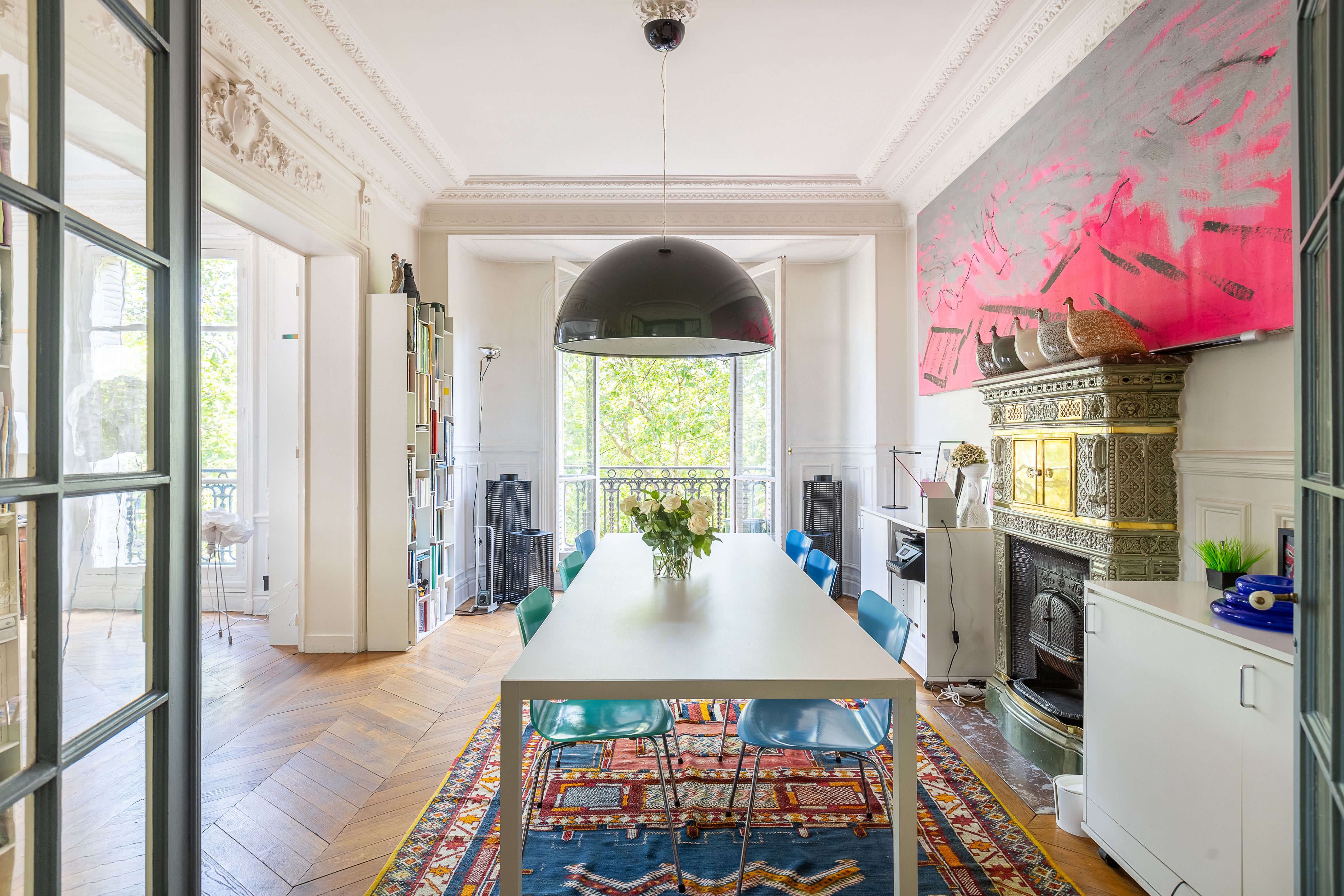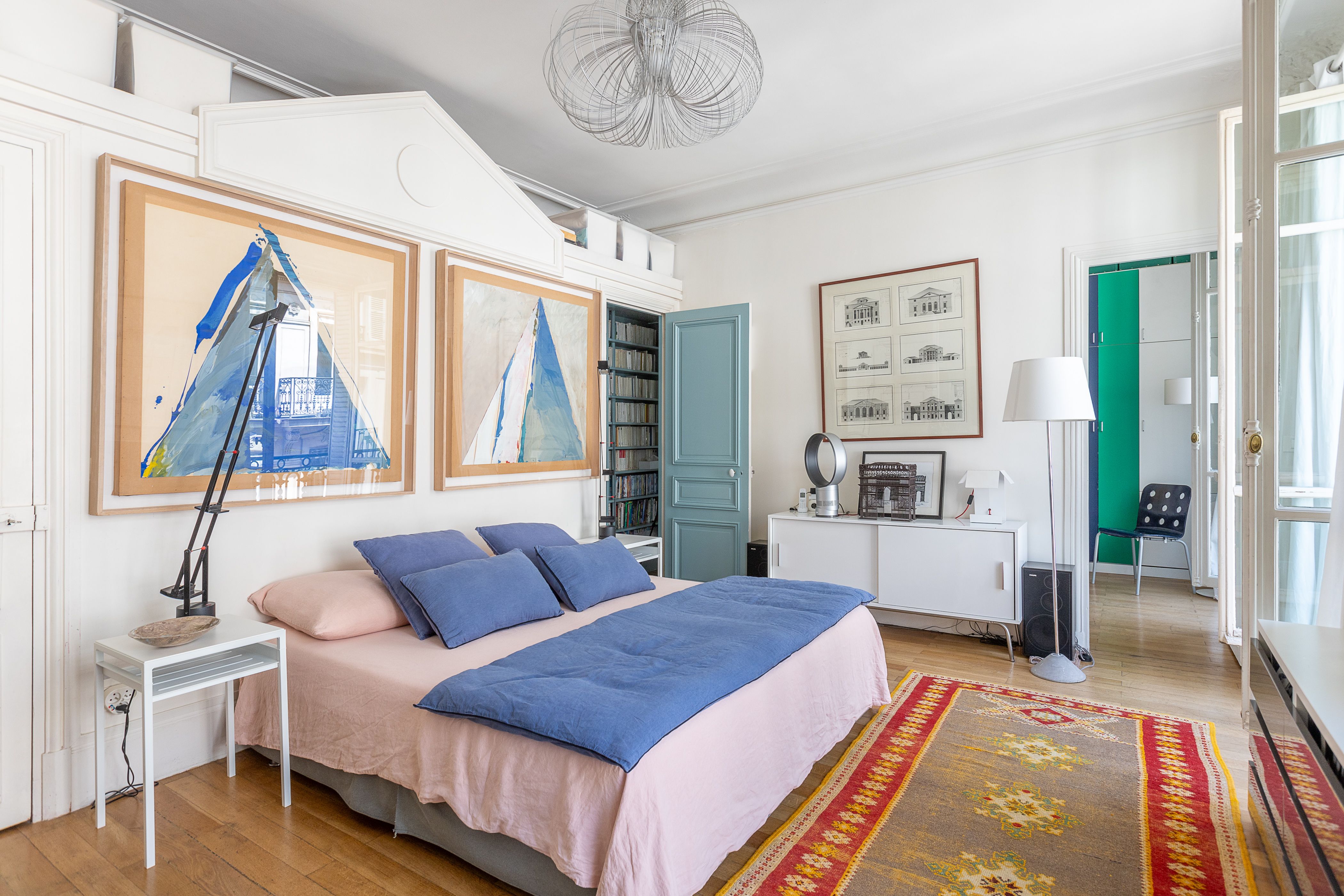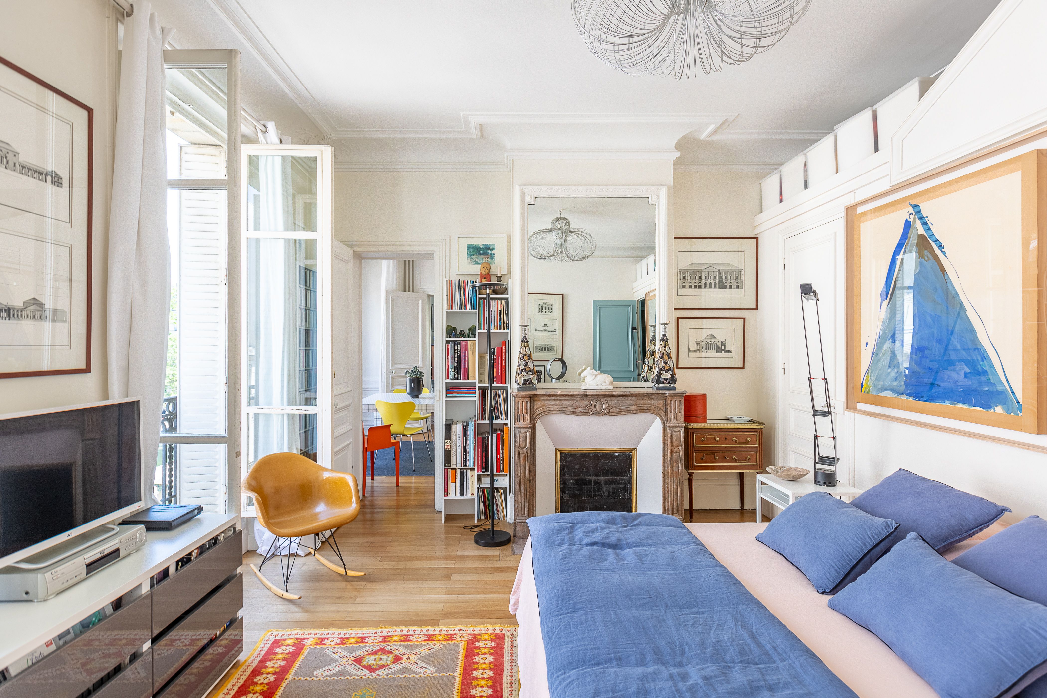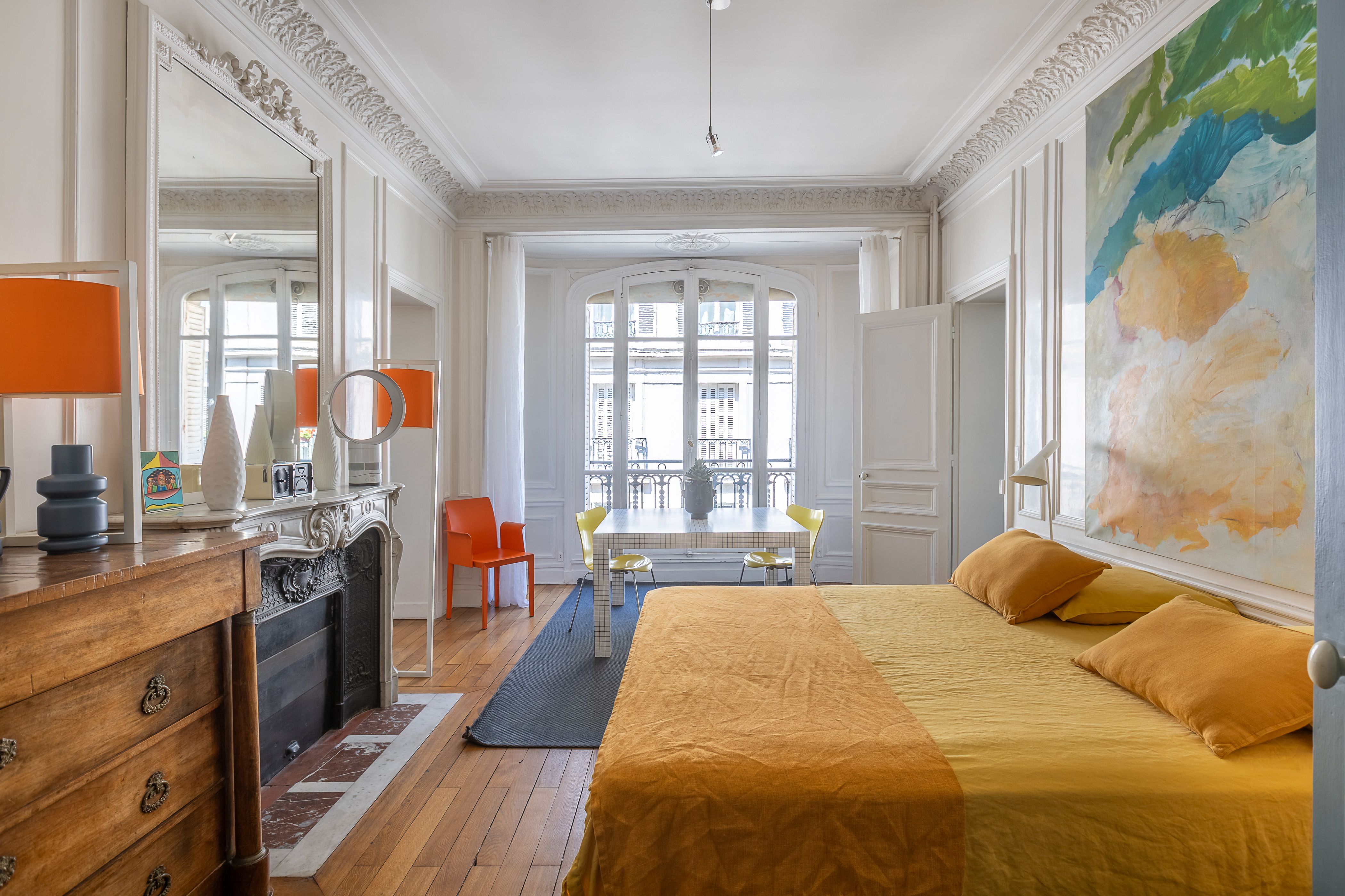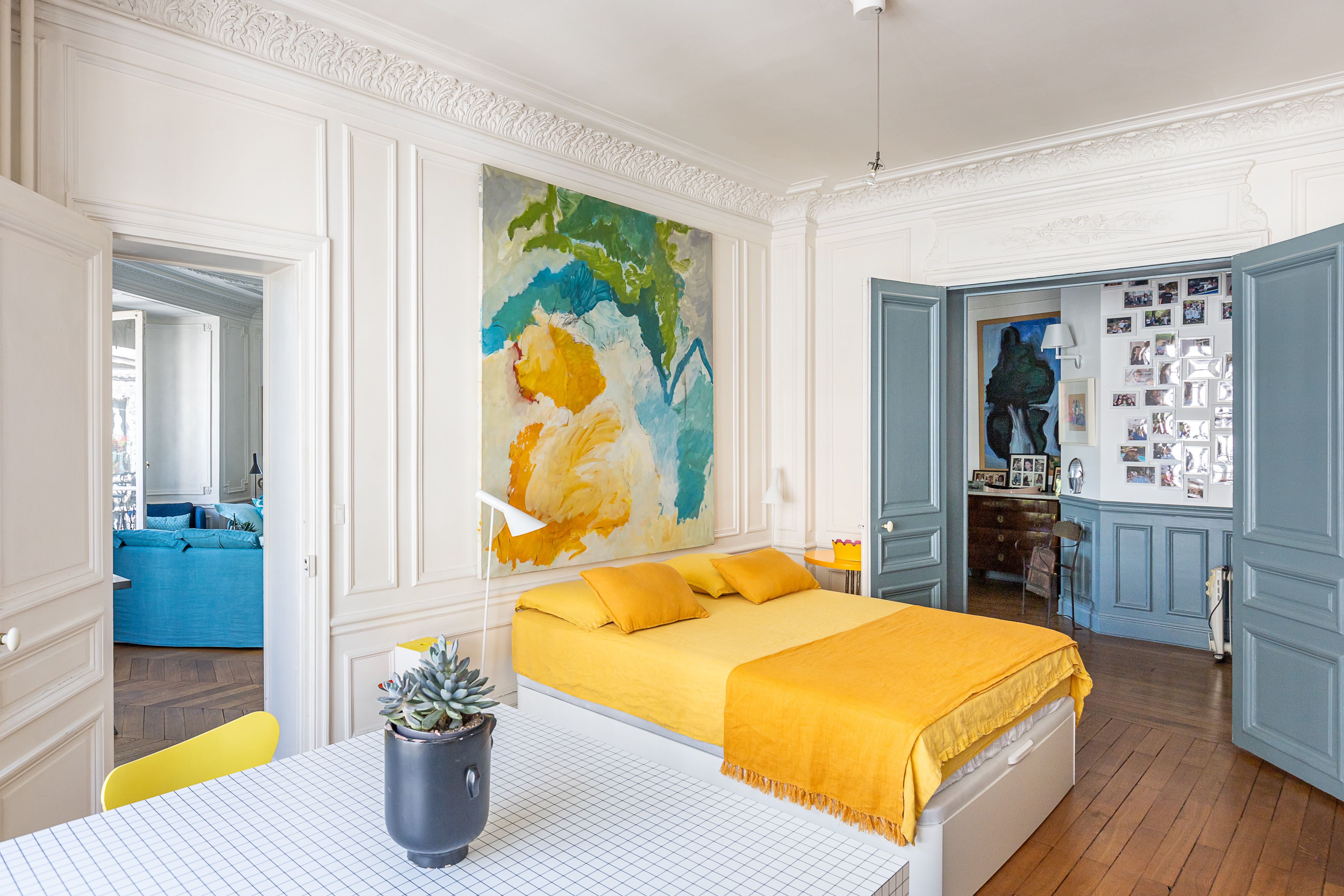 Not many apartments in Paris can say they have waterfront views, but this home in the lively Canal St-Martin overlooks the neighbourhood’s beautiful canal and its boats, local fishermen, swallows and ducks. The home itself is classically Hausmannian and beautifully decorated, with large windows, Hungarian point hardwood floors, marble fireplaces and intricate mouldings that contribute to its old-world regality. Bright blue velvet couches and vibrant contemporary artwork brings a pop of colour and ground us firmly in the 21st century – as do the TV, air conditioning and modern kitchen. We love that the couches face each other to create a lounge conducive to conversation, while the large dining table can seat up to twelve guests for an animated dinner party. If you don’t feel like eating in though, you’re staying in the right place. You’ll find excellent bars and restaurants in this busy neighbourhood teeming with artists and musicians. Plus, you’ll be around the corner from what is widely considered the best bakery in Paris – Du Pain et des Idées – so grab some of their delectable pastries to enjoy on the banks of the canal (or on your private balcony). On the weekends, the city closes the area for pedestrians – making a canal-side stroll or bike ride particularly pleasant. Should you want to reach other corners of the city, the Place de la République metro station is a quick five minutes’ walk away.