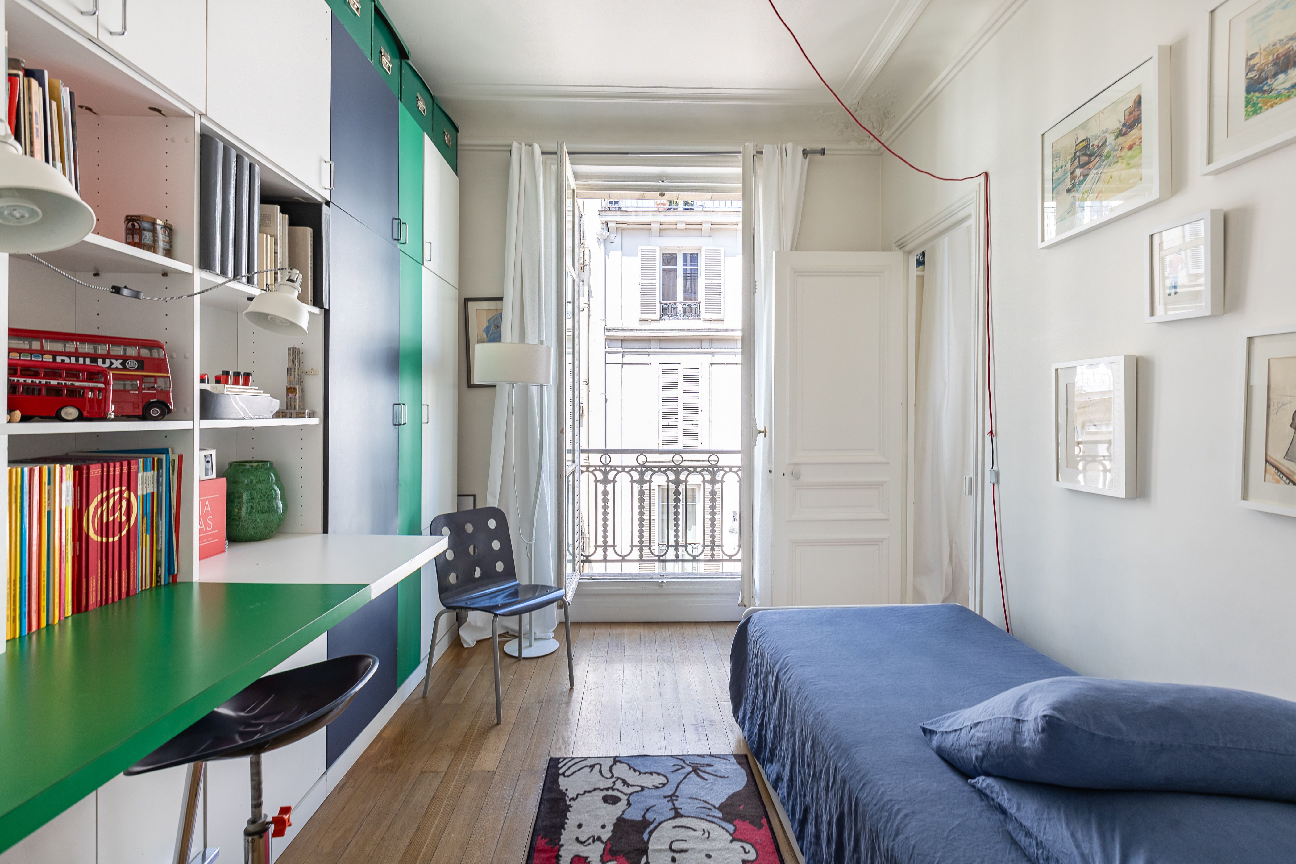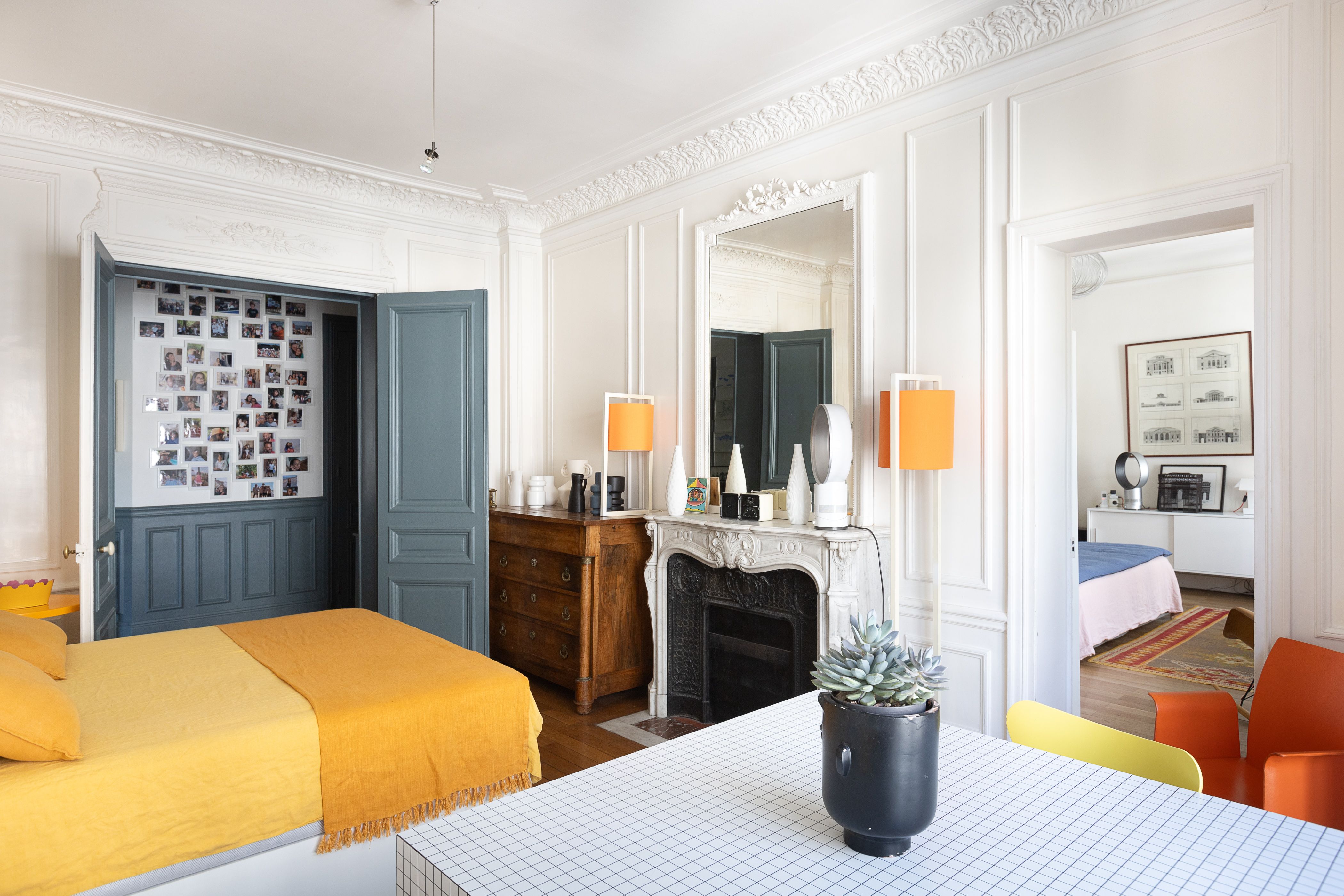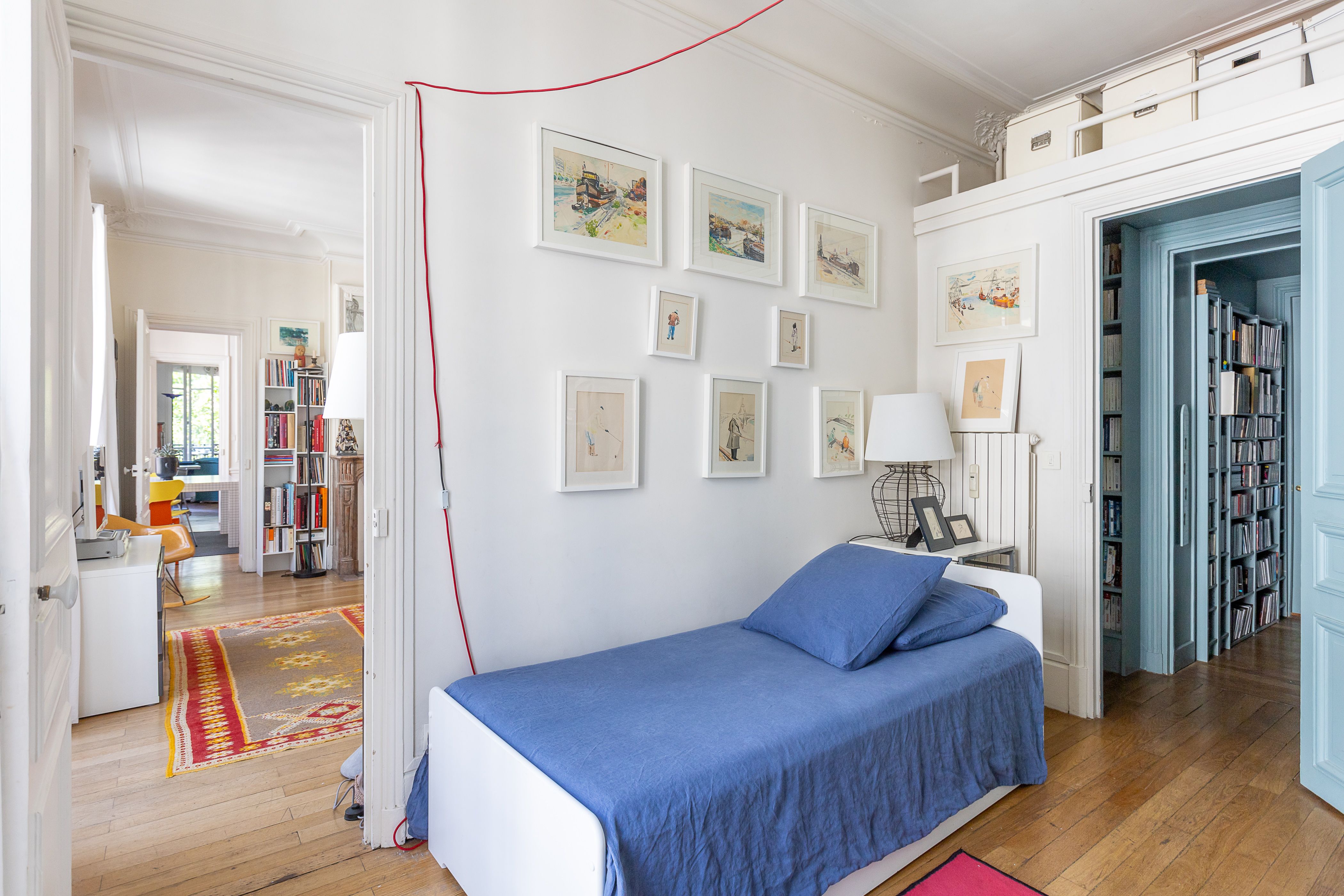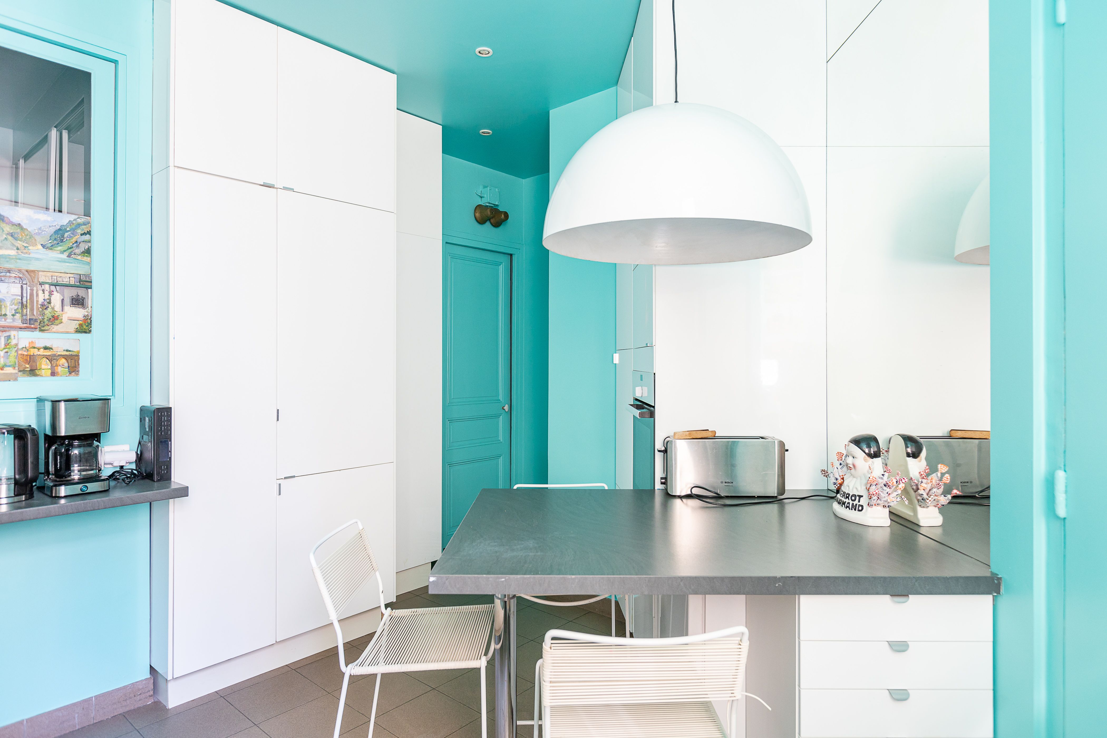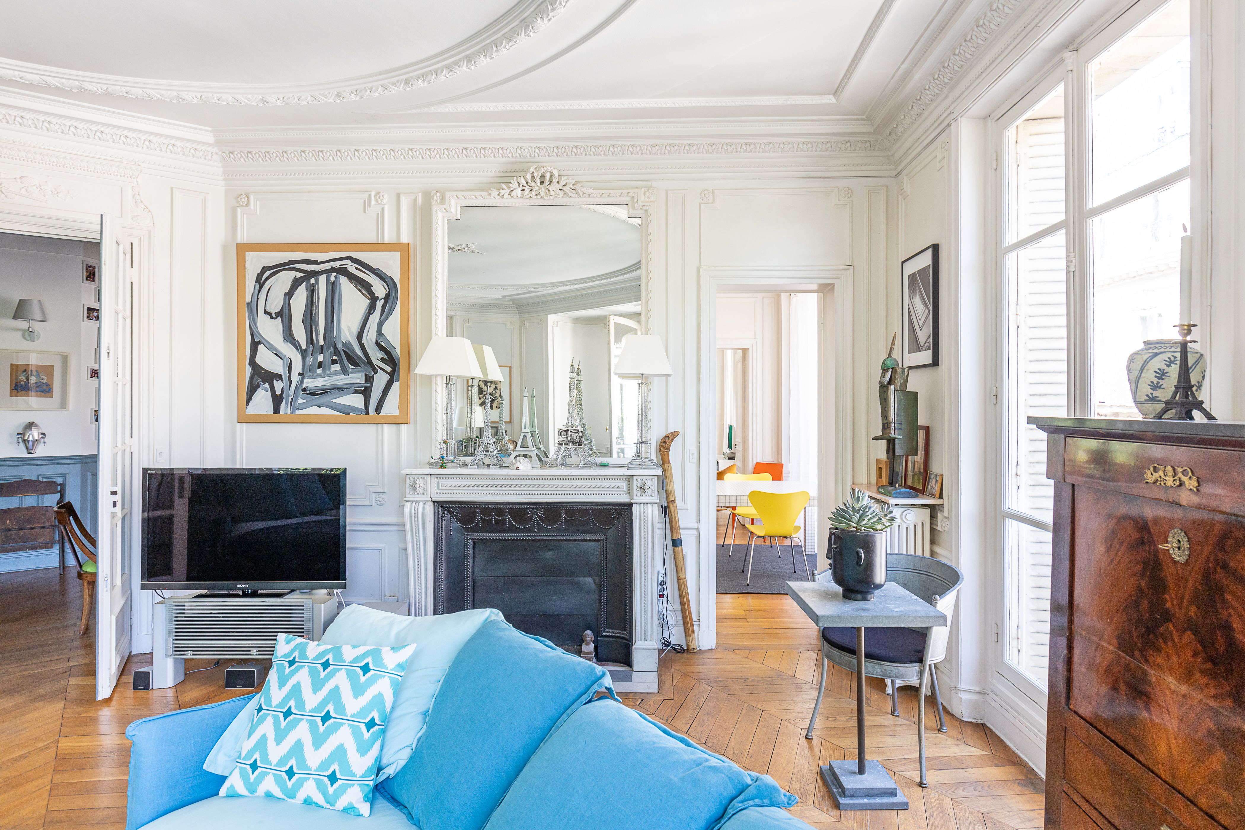 Not many apartments in Paris can say they have waterfront views, but this home in the lively Canal St-Martin overlooks the neighbourhood’s beautiful canal and its boats, local fishermen, swallows and ducks. The home itself is classically Hausmannian and beautifully decorated, with large windows, Hungarian point hardwood floors, marble fireplaces and intricate mouldings that contribute to its old-world regality. Bright blue velvet couches and vibrant contemporary artwork brings a pop of colour and ground us firmly in the 21st century – as do the TV, air conditioning and modern kitchen. We love that the couches face each other to create a lounge conducive to conversation, while the large dining table can seat up to twelve guests for an animated dinner party. If you don’t feel like eating in though, you’re staying in the right place. You’ll find excellent bars and restaurants in this busy neighbourhood teeming with artists and musicians. Plus, you’ll be around the corner from what is widely considered the best bakery in Paris – Du Pain et des Idées – so grab some of their delectable pastries to enjoy on the banks of the canal (or on your private balcony). On the weekends, the city closes the area for pedestrians – making a canal-side stroll or bike ride particularly pleasant. Should you want to reach other corners of the city, the Place de la République metro station is a quick five minutes’ walk away.