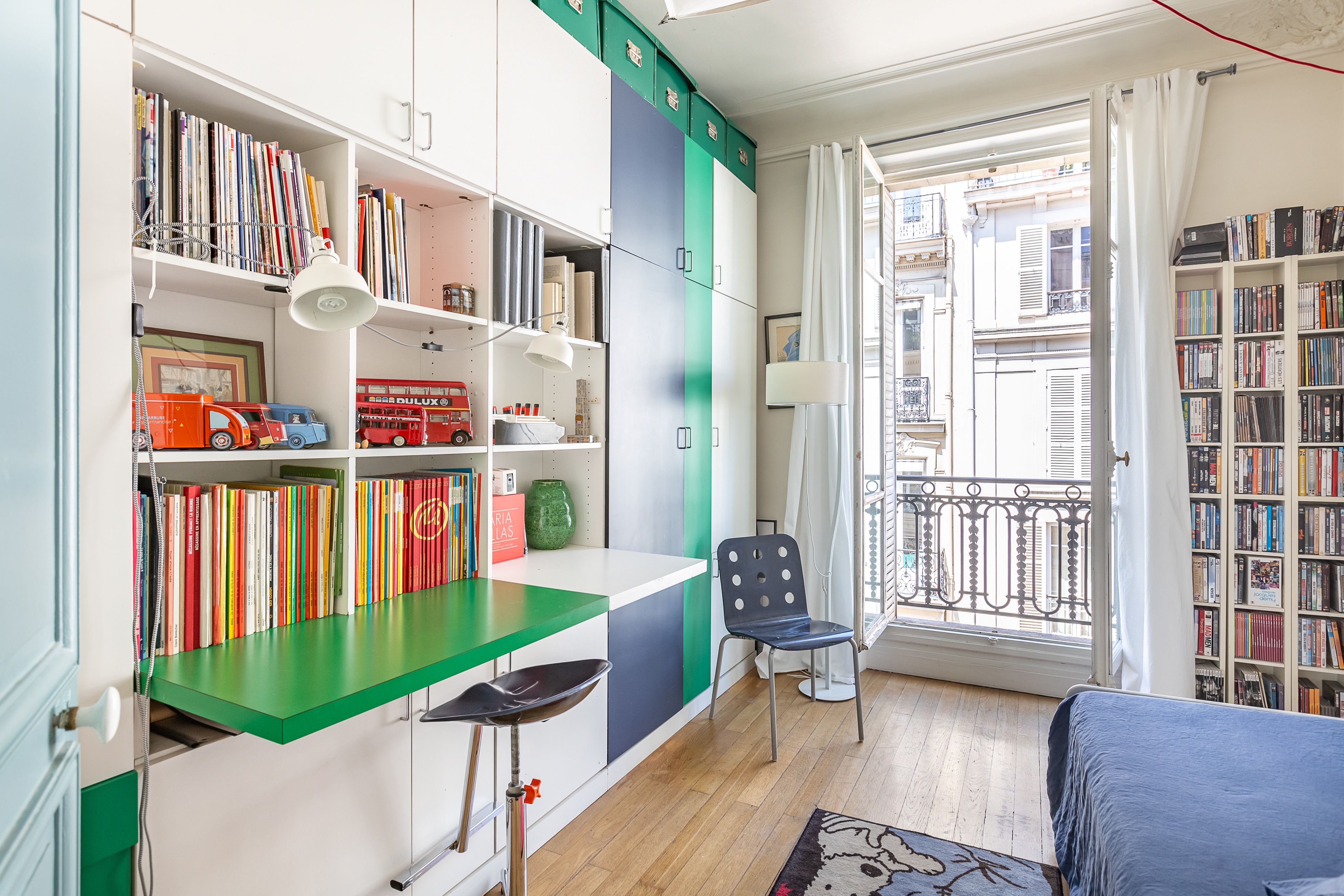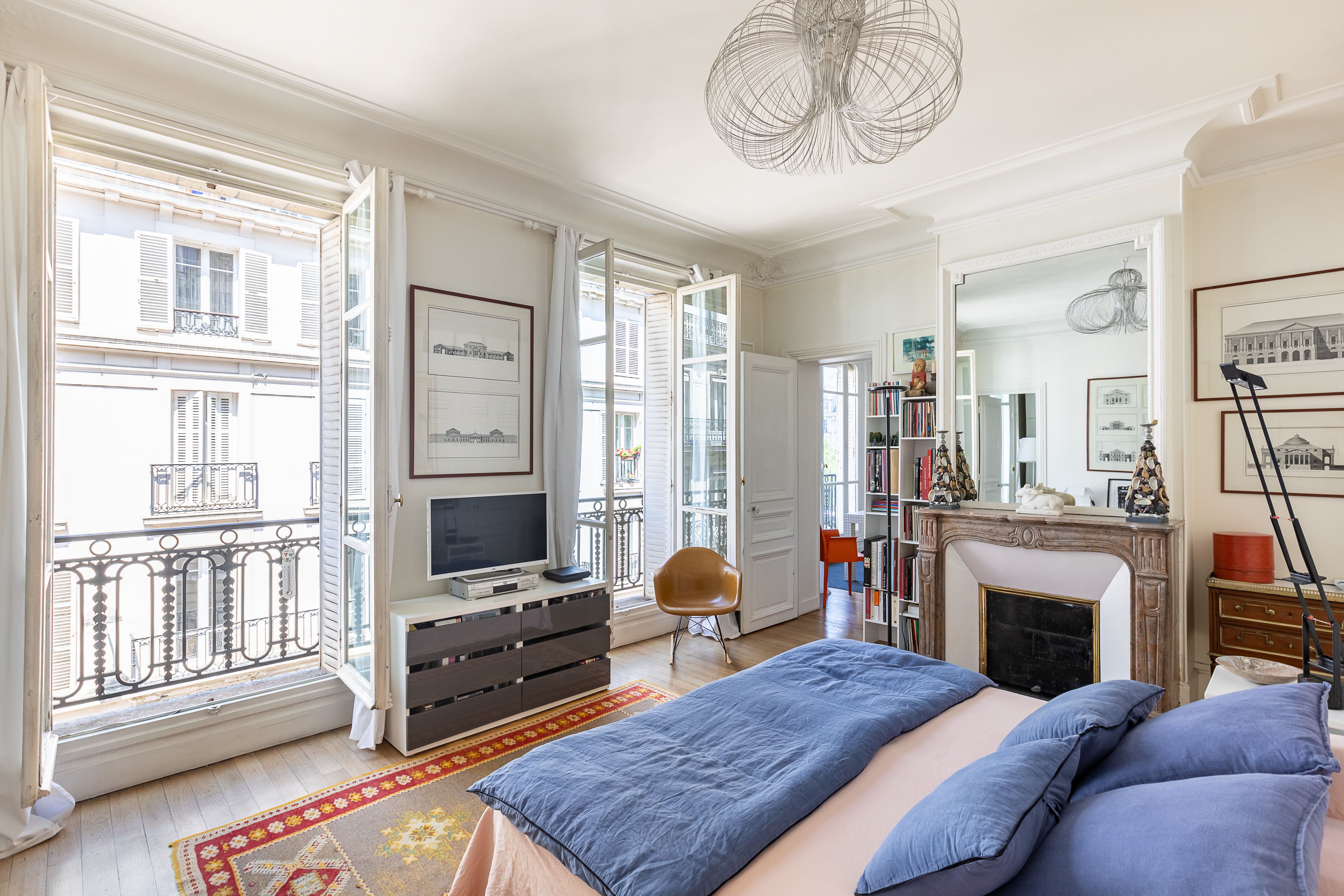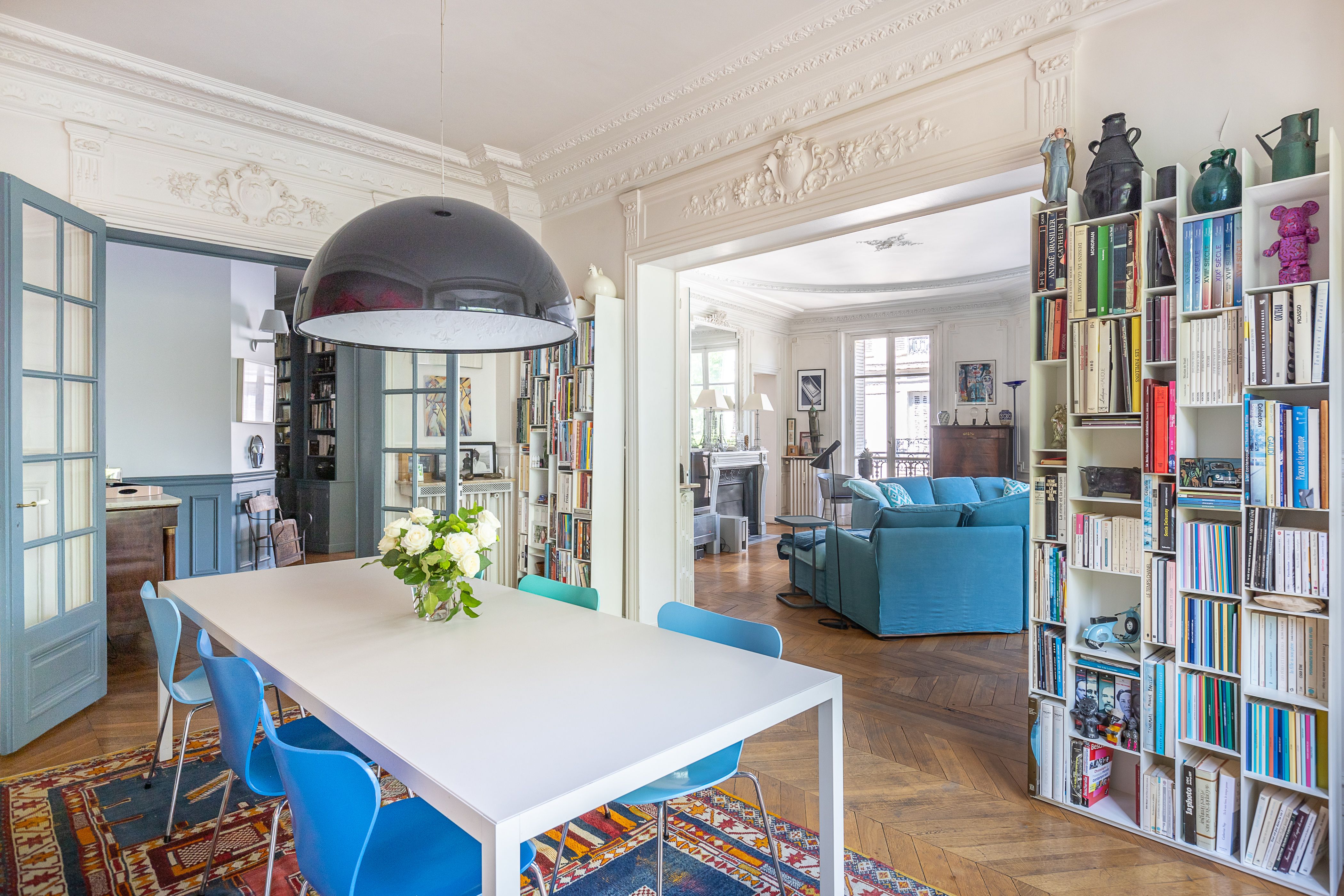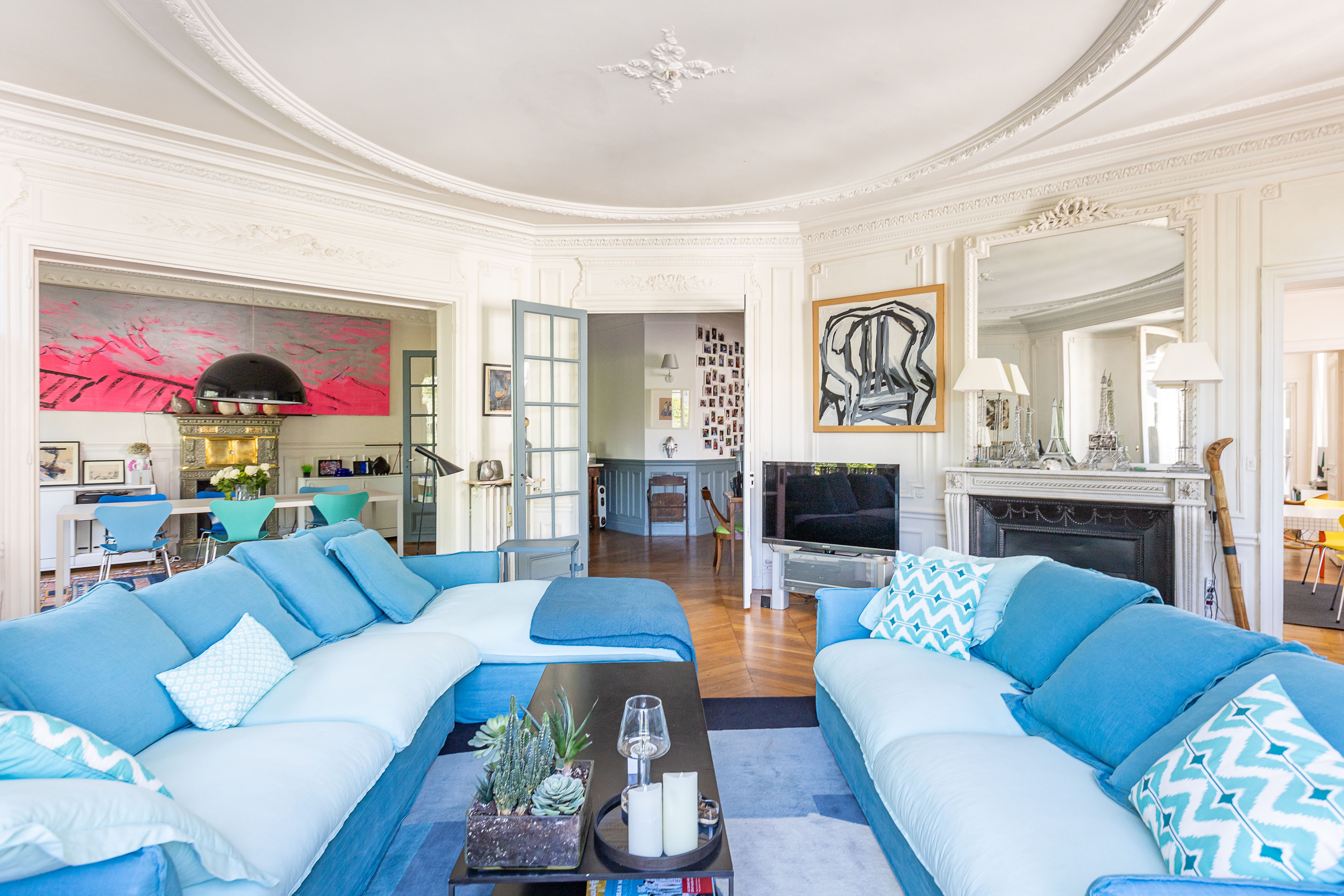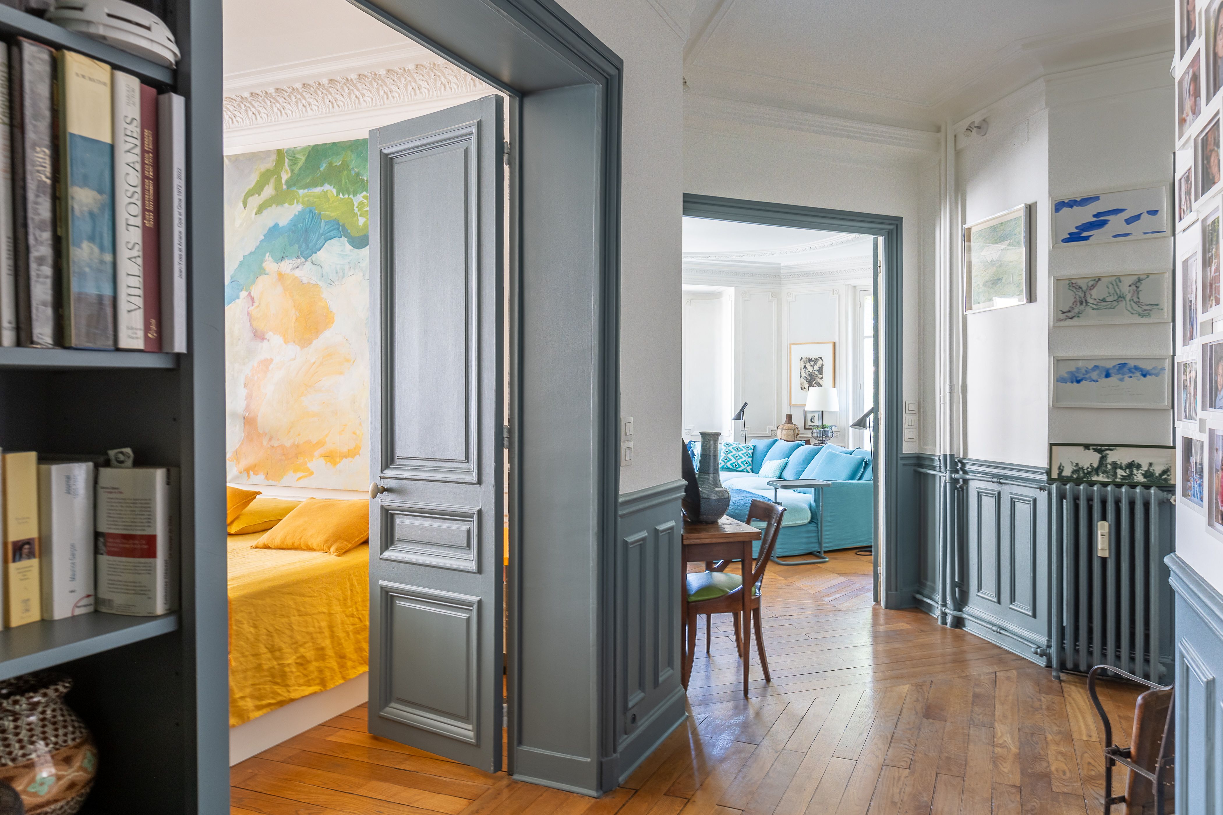 Not many apartments in Paris can say they have waterfront views, but this home in the lively Canal St-Martin overlooks the neighbourhood’s beautiful canal and its boats, local fishermen, swallows and ducks. The home itself is classically Hausmannian and beautifully decorated, with large windows, Hungarian point hardwood floors, marble fireplaces and intricate mouldings that contribute to its old-world regality. Bright blue velvet couches and vibrant contemporary artwork brings a pop of colour and ground us firmly in the 21st century – as do the TV, air conditioning and modern kitchen. We love that the couches face each other to create a lounge conducive to conversation, while the large dining table can seat up to twelve guests for an animated dinner party. If you don’t feel like eating in though, you’re staying in the right place. You’ll find excellent bars and restaurants in this busy neighbourhood teeming with artists and musicians. Plus, you’ll be around the corner from what is widely considered the best bakery in Paris – Du Pain et des Idées – so grab some of their delectable pastries to enjoy on the banks of the canal (or on your private balcony). On the weekends, the city closes the area for pedestrians – making a canal-side stroll or bike ride particularly pleasant. Should you want to reach other corners of the city, the Place de la République metro station is a quick five minutes’ walk away.