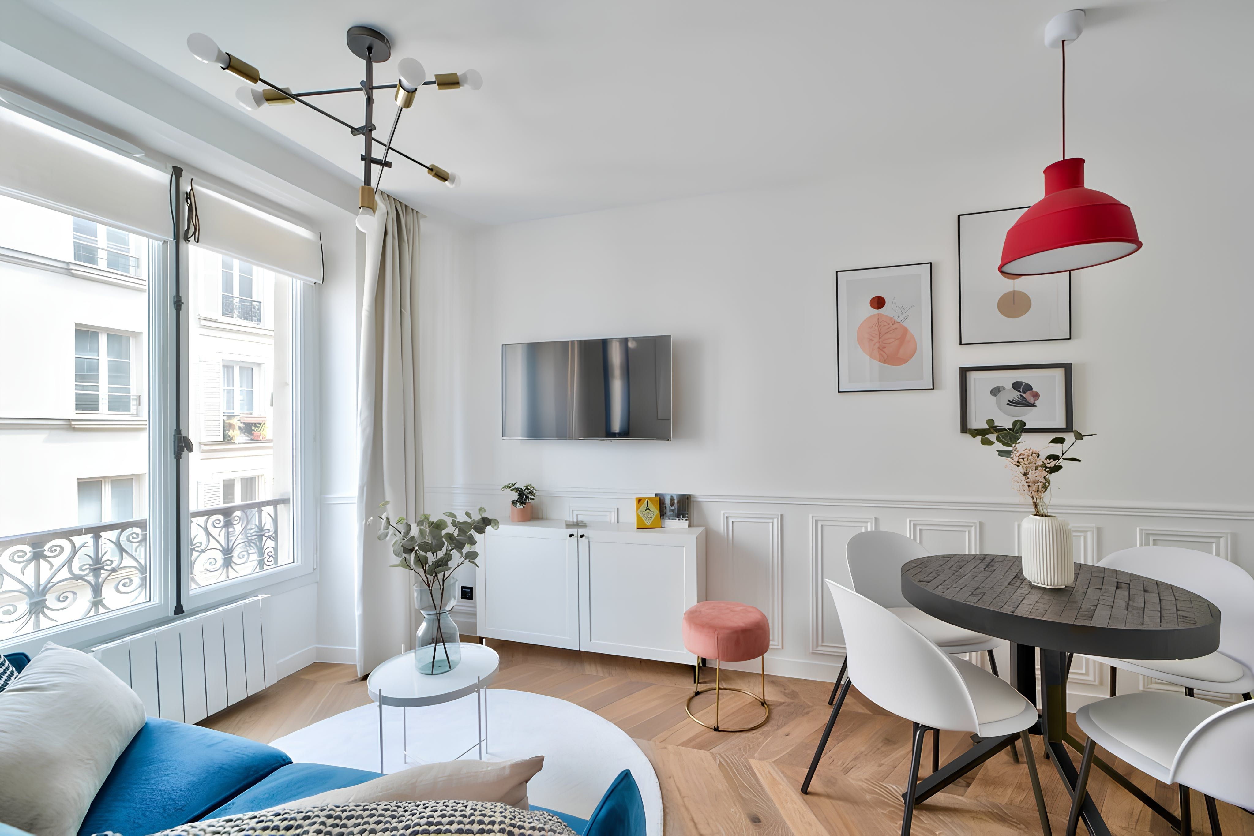Promising a prime position in the 9th arrondissement, this apartment isn't far from the Palais Garnier. With the Cadet metro station a two-minute stroll away, it's easy to get around Paris for sightseeing. Though the lack of a lift means climbing the stairs, this second-floor home offers a lovely base for city breaks. Since the only bathroom here is an en-suite, guests three and four will have to intrude now and then. So, it might be better suited to families than friends.