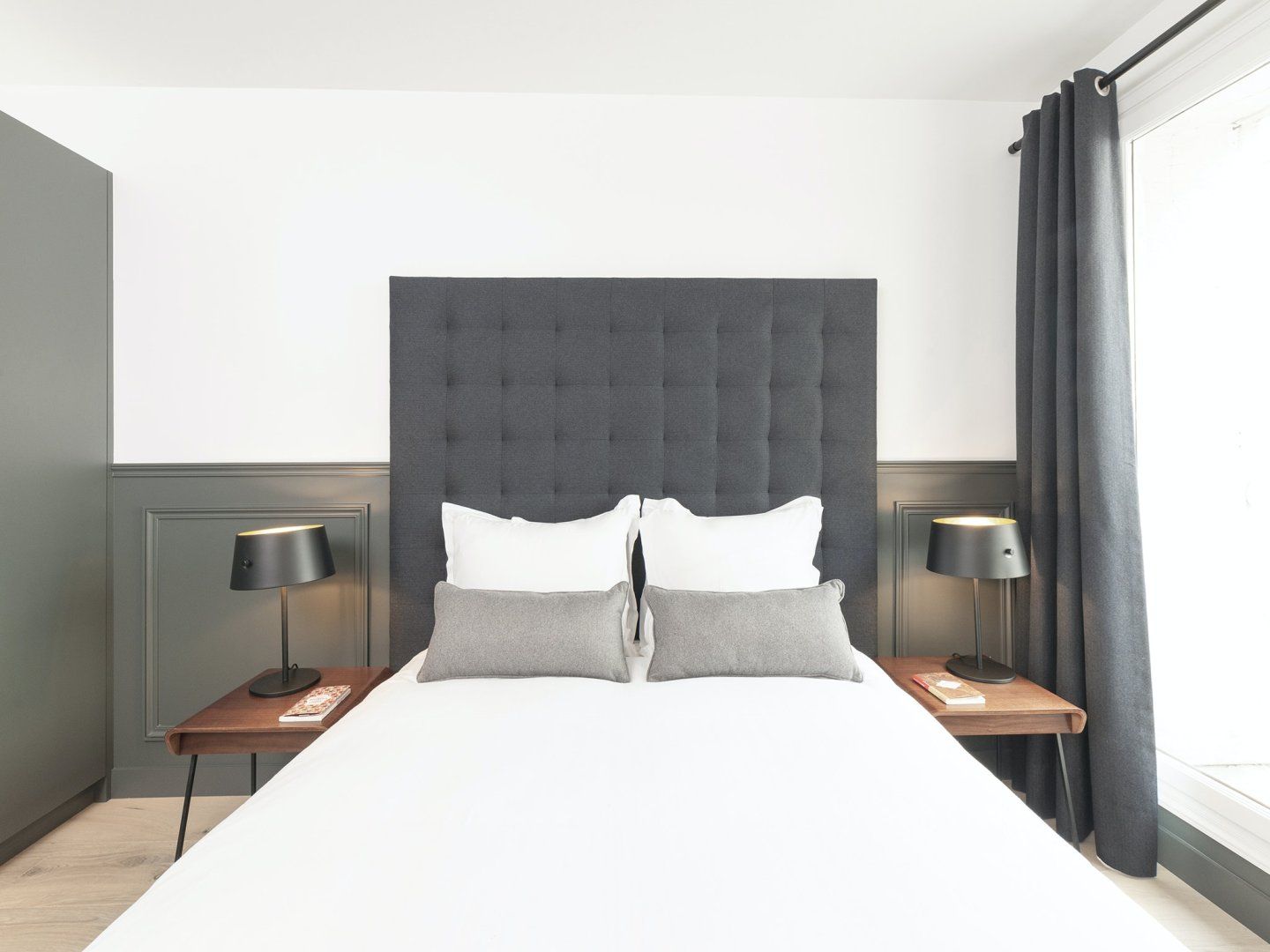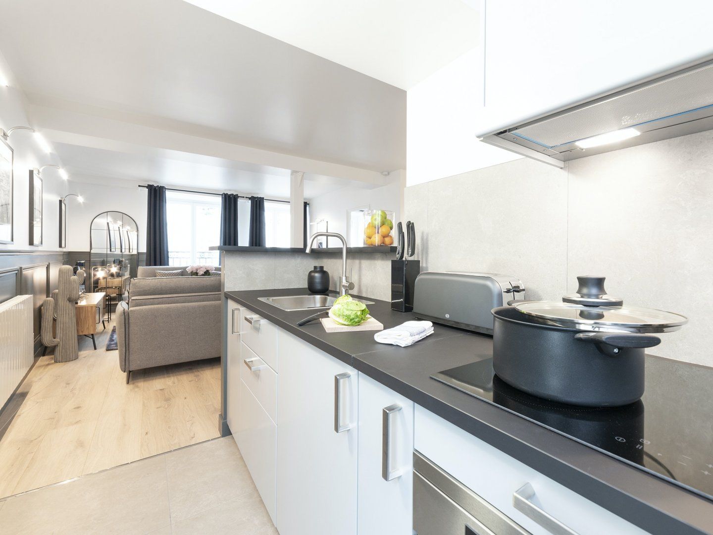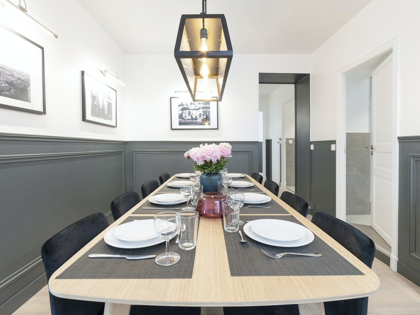 This swish apartment, located in Le Marais, is the definition of contemporary Parisian living. Step through the front door, and you'll find a charming space with wooden floors, chic grey sofas and a collection of black and white photography on the walls. The open-plan layout makes it easy to socialise with your guests as you cook – perhaps you'd like to try some French classics like coq au vin, or simply open a bottle of wine and arrange a charcuterie board of delicious cheeses. The long dining table has space for everyone to gather, while the breakfast bar is ideal for a quick morning coffee before heading out to explore. The surrounding area is well-known for its charming cobbled streets and bohemian atmosphere – you'll find a range of independent boutiques, local restaurants and historic buildings right on your doorstep. And, with the Musée des Arts et Métiers just two minutes away, and the Pompidou Centre fifteen minutes away, art lovers will love this location.