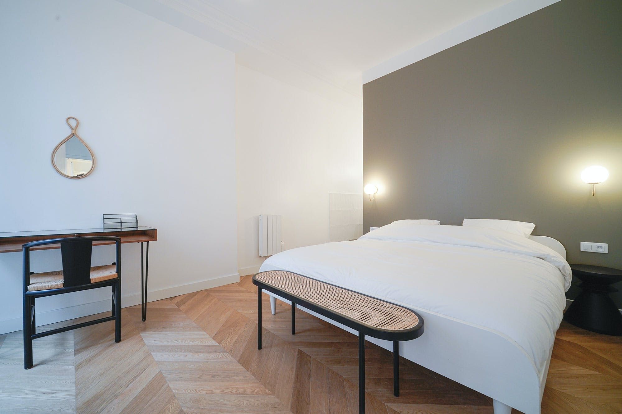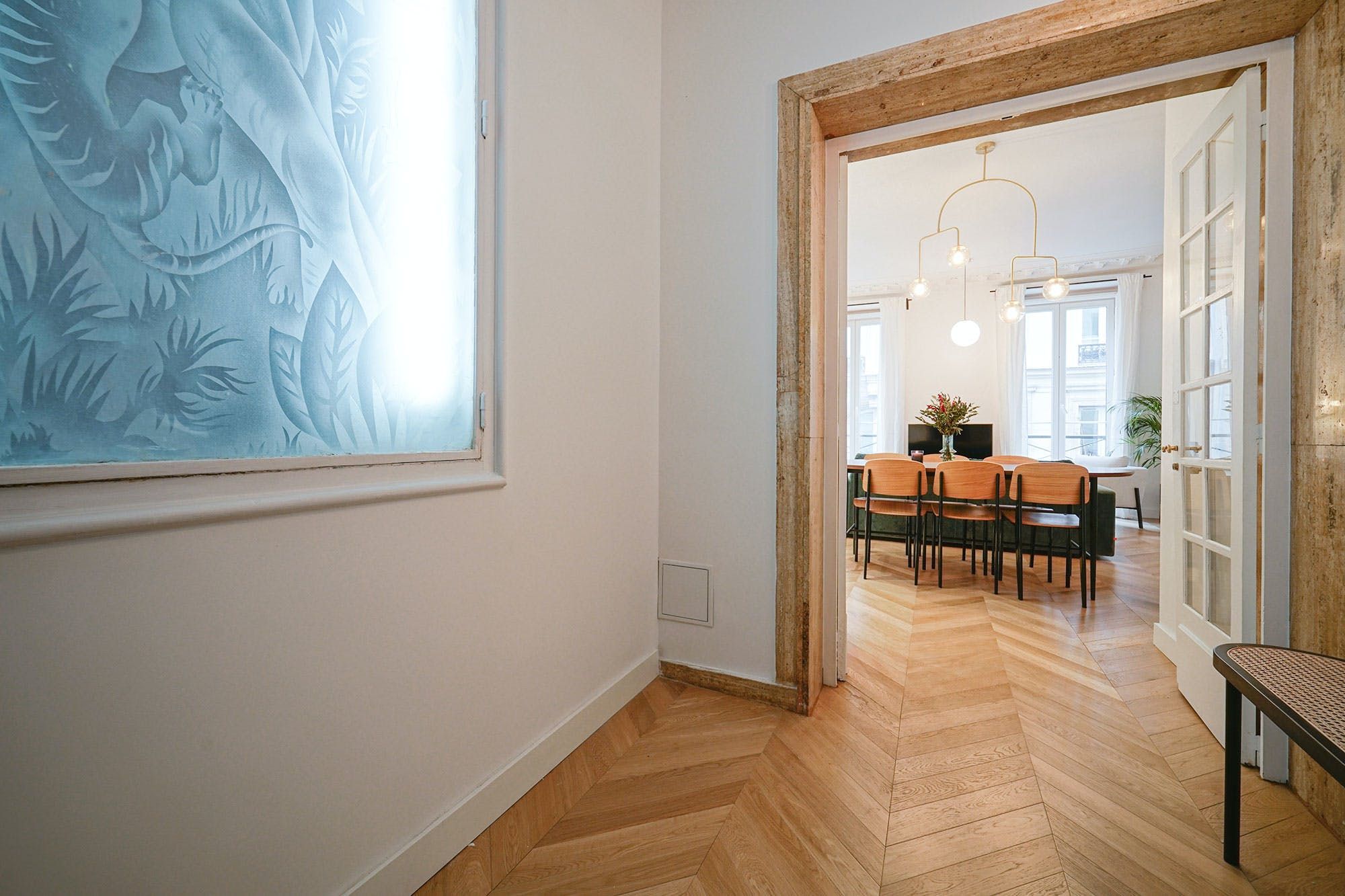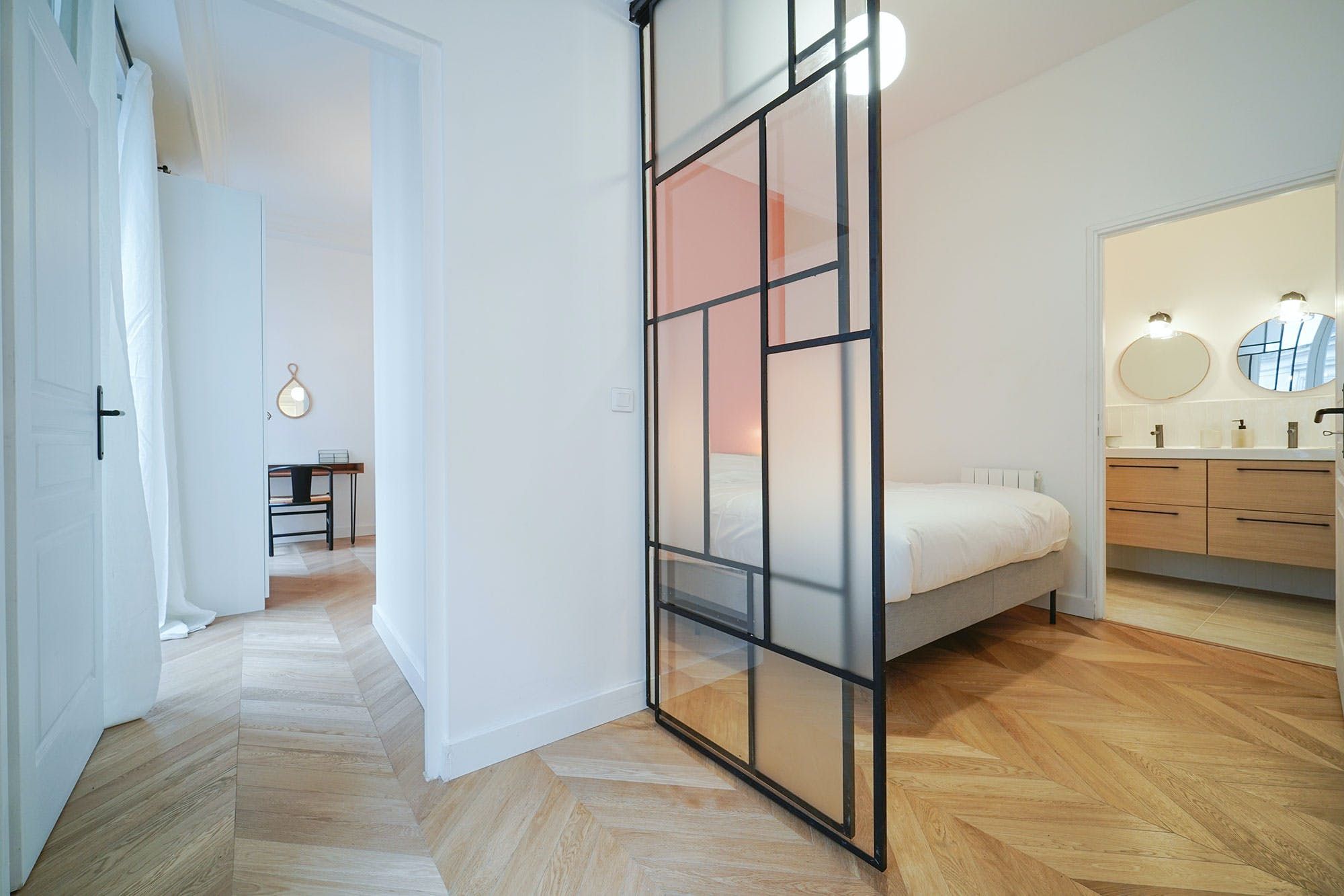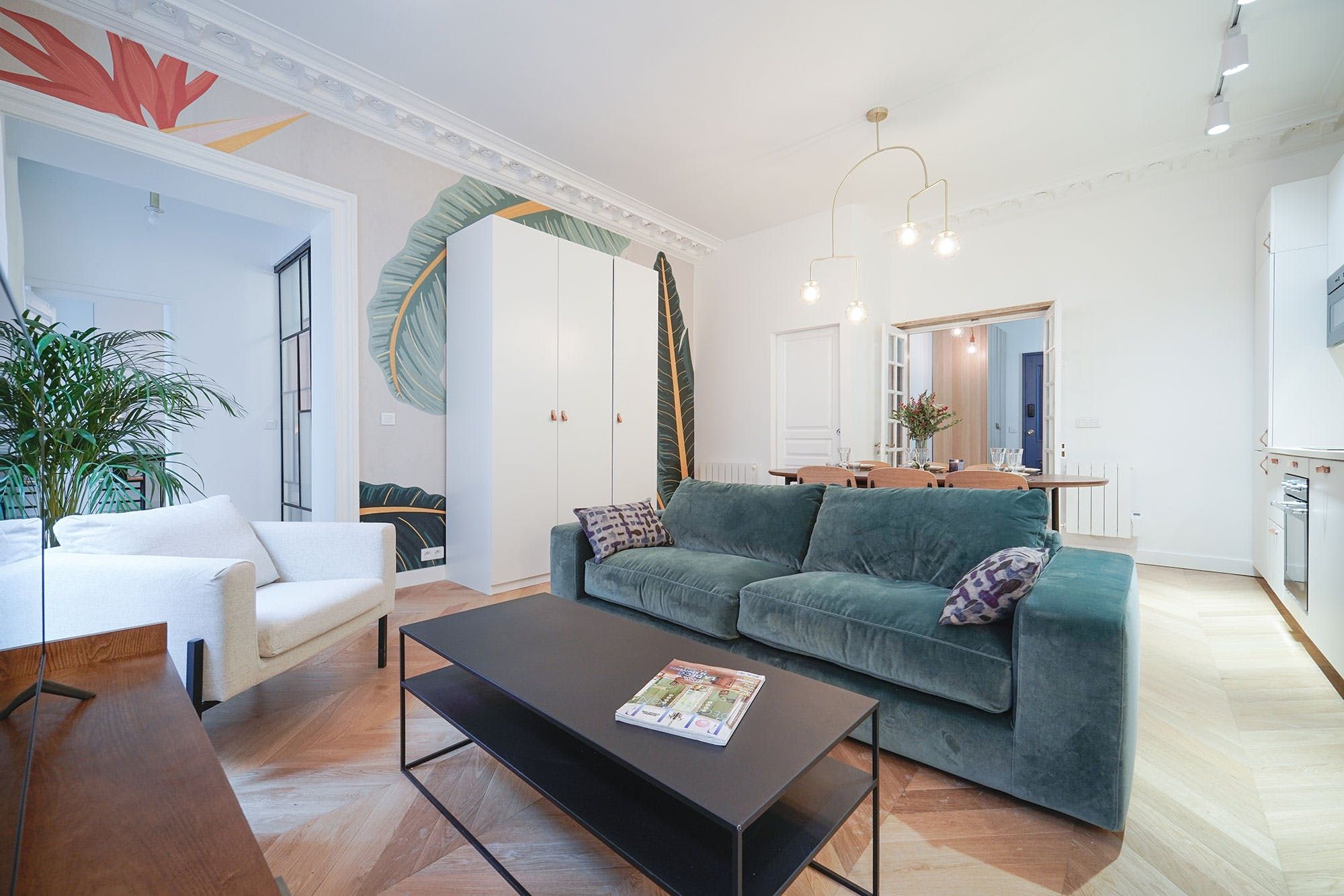 Housed in a building once owned by a diamond dealer, this gorgeous apartment close to Paris’ Grands Boulevards is an undeniable gem. From its high corniced ceilings to its parquet flooring and tall French windows giving way to wrought-iron Juliet balconies, there’s an air of unmistakable sophistication that feels as chic as it does laid-back. We love the tropical mural on the living room’s wall that marries so perfectly with the parlour palm, and the grand dining table that’s all set to host intimate soirées over French wine. The two bedrooms are pared-back yet stylish with bold block-colour statement walls and beautifully-tiled en-suites that will make waking up a treat. There’s even a desk space in the master for when business calls, but we recommend less work and more play when you’re in the City of Light. Outside of your home, the famous Folies Bergères is just a minute walk away, while both the Louvre and Montmartre’s iconic Sacré-Cœur Basilica are a twenty-minute stroll from your door.