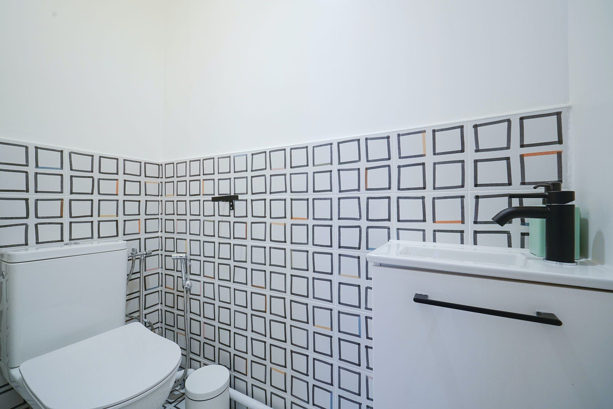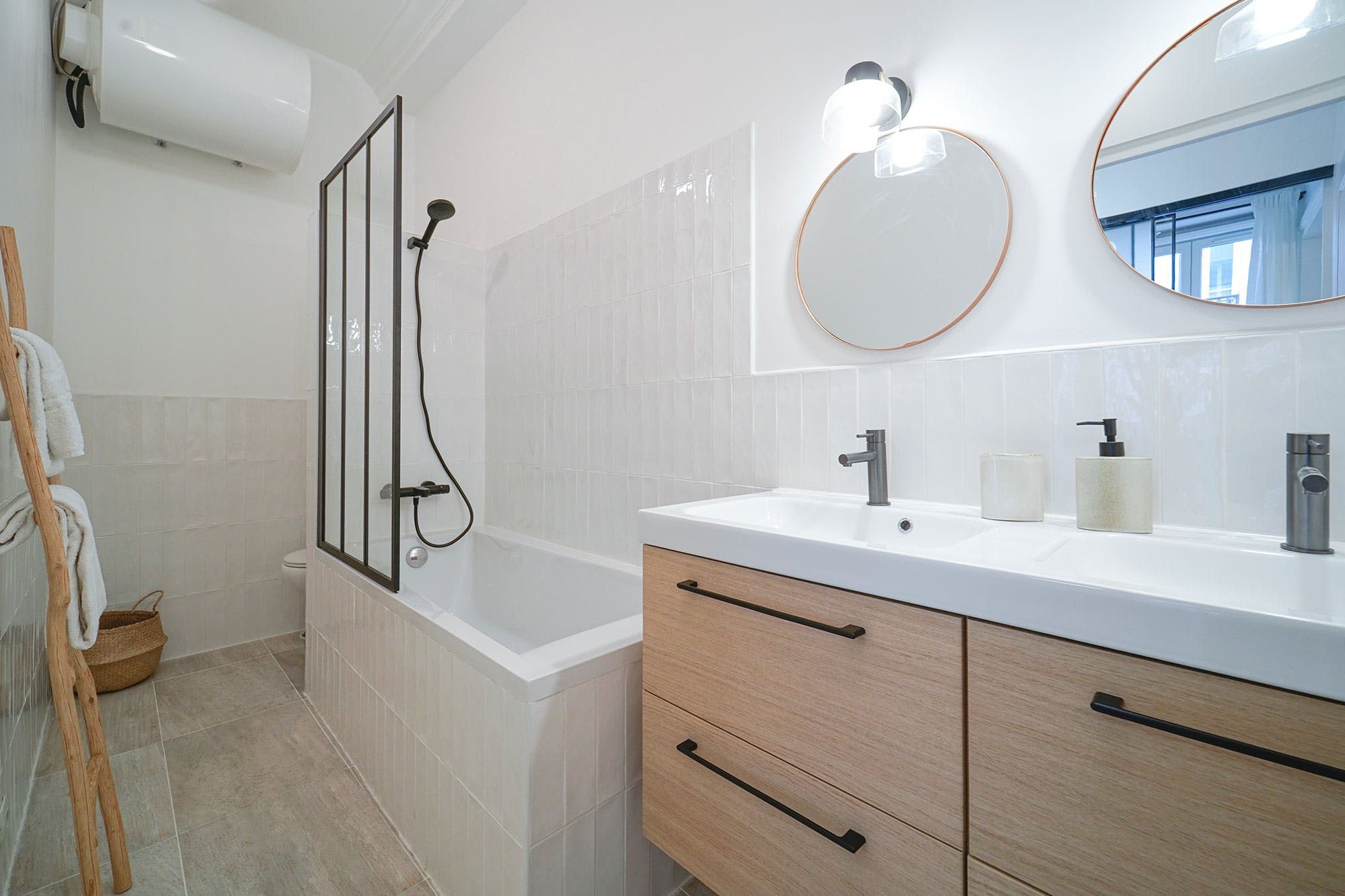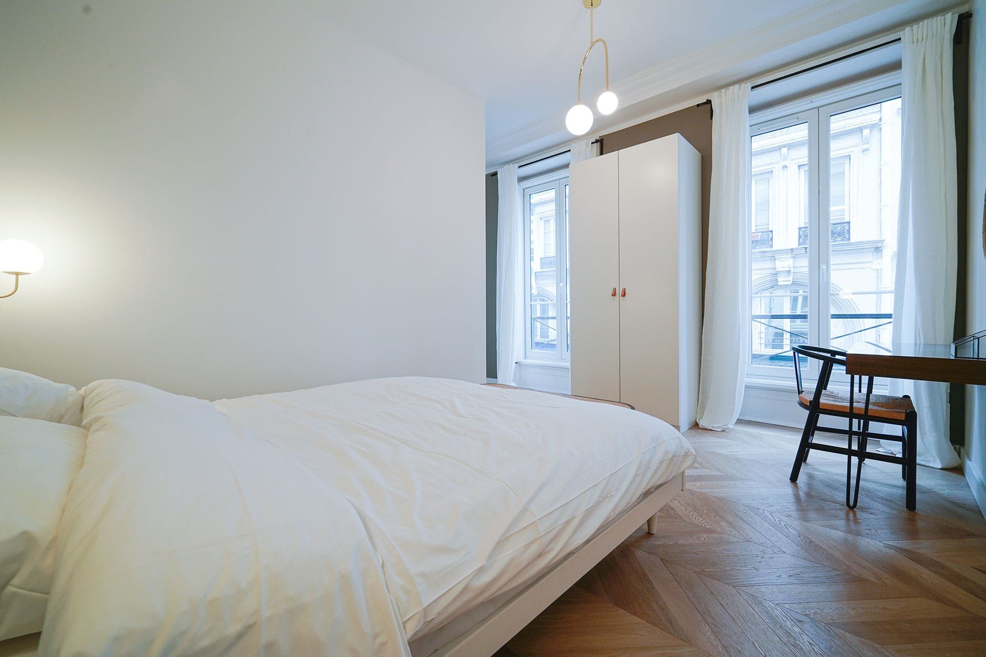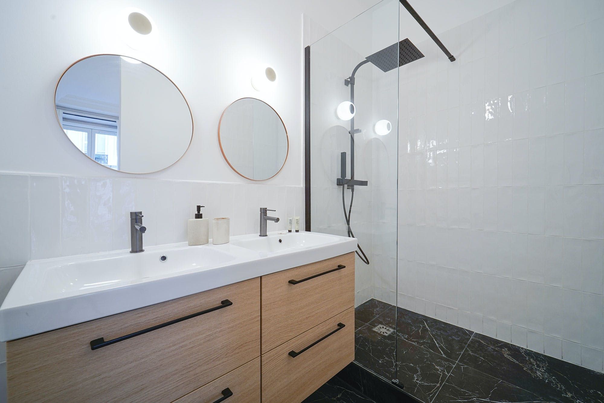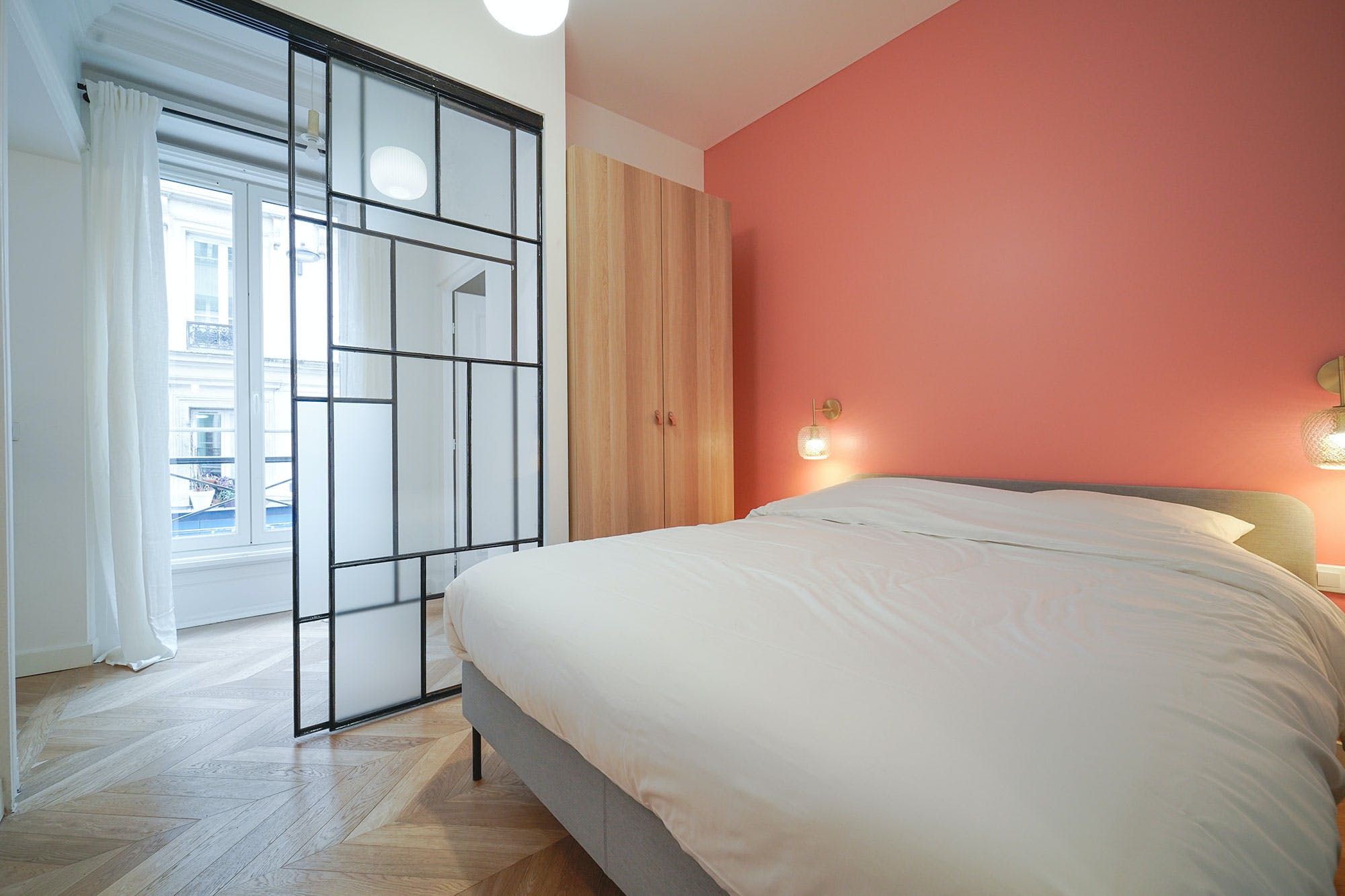 Housed in a building once owned by a diamond dealer, this gorgeous apartment close to Paris’ Grands Boulevards is an undeniable gem. From its high corniced ceilings to its parquet flooring and tall French windows giving way to wrought-iron Juliet balconies, there’s an air of unmistakable sophistication that feels as chic as it does laid-back. We love the tropical mural on the living room’s wall that marries so perfectly with the parlour palm, and the grand dining table that’s all set to host intimate soirées over French wine. The two bedrooms are pared-back yet stylish with bold block-colour statement walls and beautifully-tiled en-suites that will make waking up a treat. There’s even a desk space in the master for when business calls, but we recommend less work and more play when you’re in the City of Light. Outside of your home, the famous Folies Bergères is just a minute walk away, while both the Louvre and Montmartre’s iconic Sacré-Cœur Basilica are a twenty-minute stroll from your door.