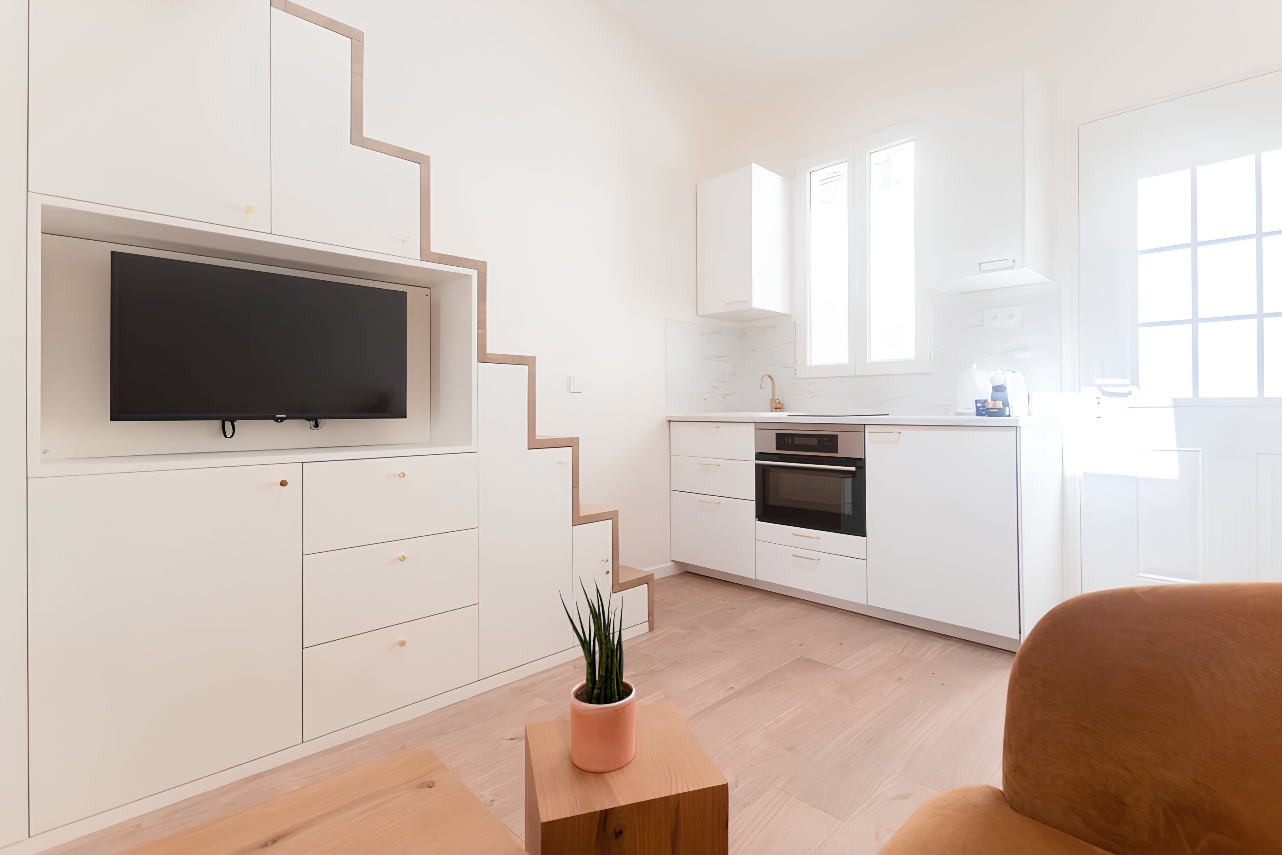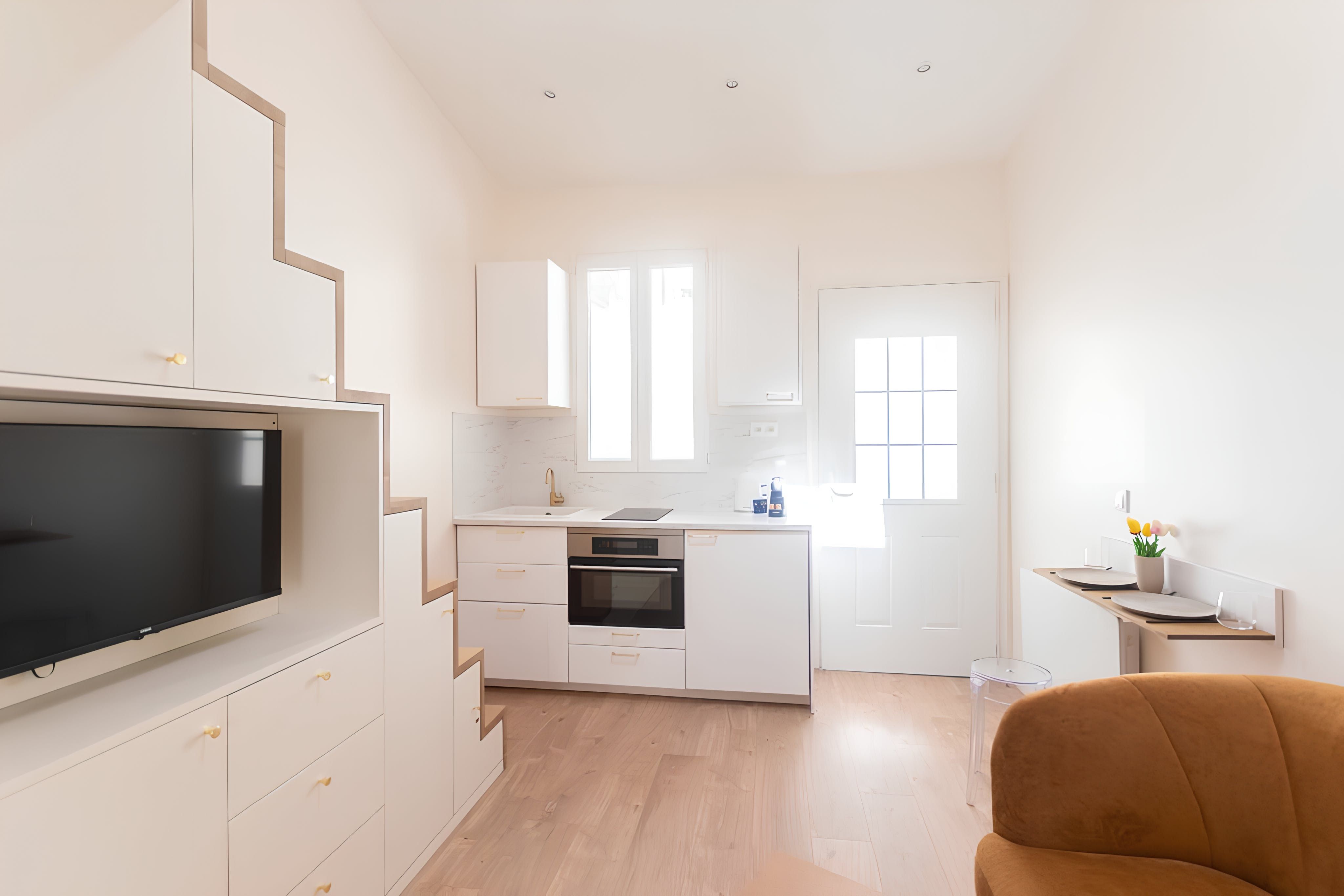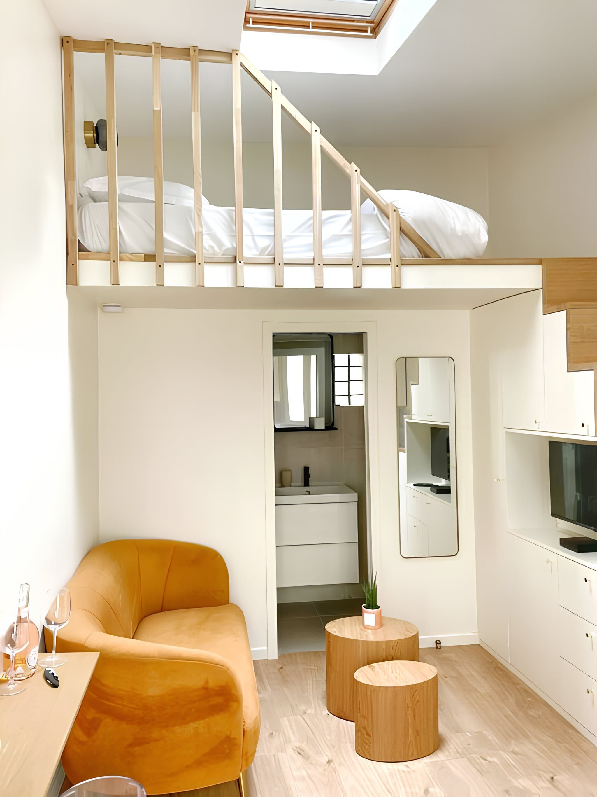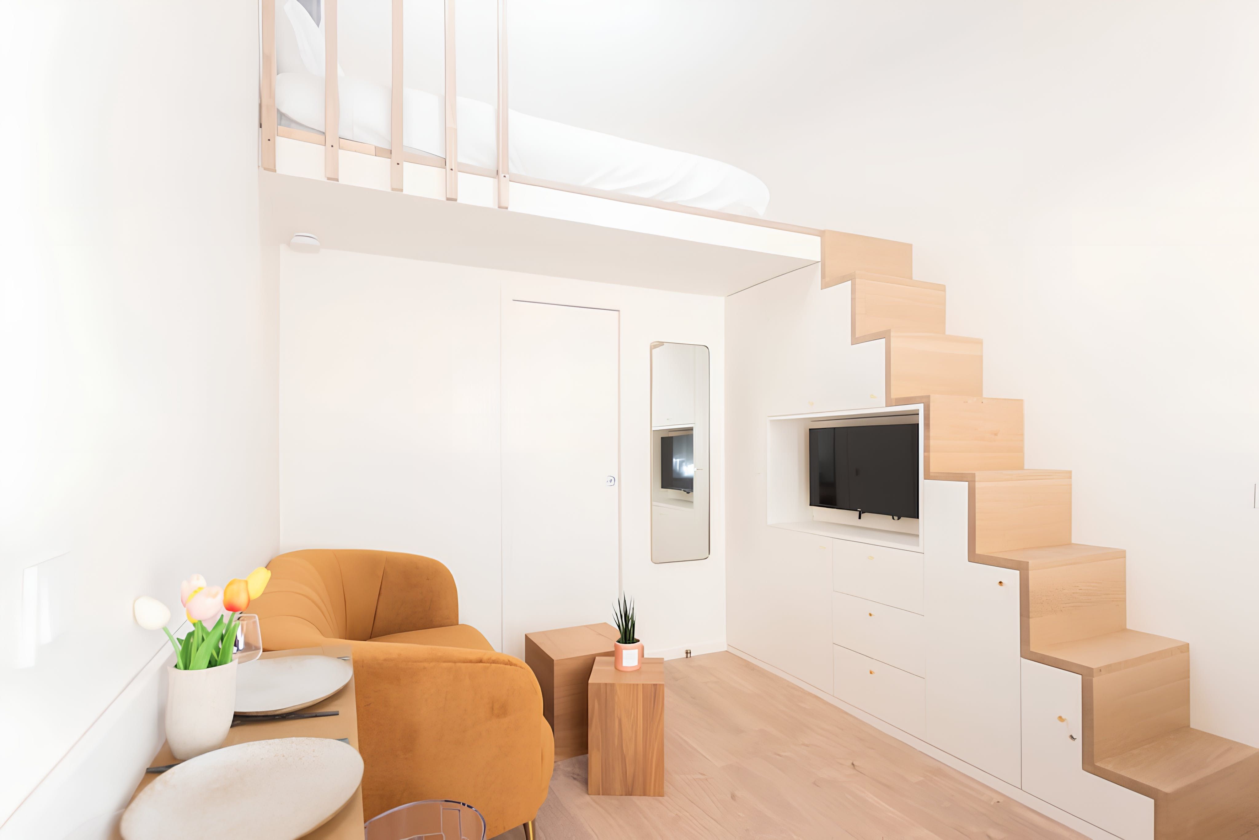 Ideal for a couple of travellers with busy schedules, this tiny home manages to tick a lot of boxes. Though there isn't much headroom up on the mezzanine level, the king-sized bed is a bonus for a good night's sleep. We particularly love the clever layout and understairs storage here. Plus, there's a smoking-free courtyard outside to share with your neighbours. The 15th arrondissement surrounds you with international restaurants, and the Vaugirard metro station is just a three-minute walk away.