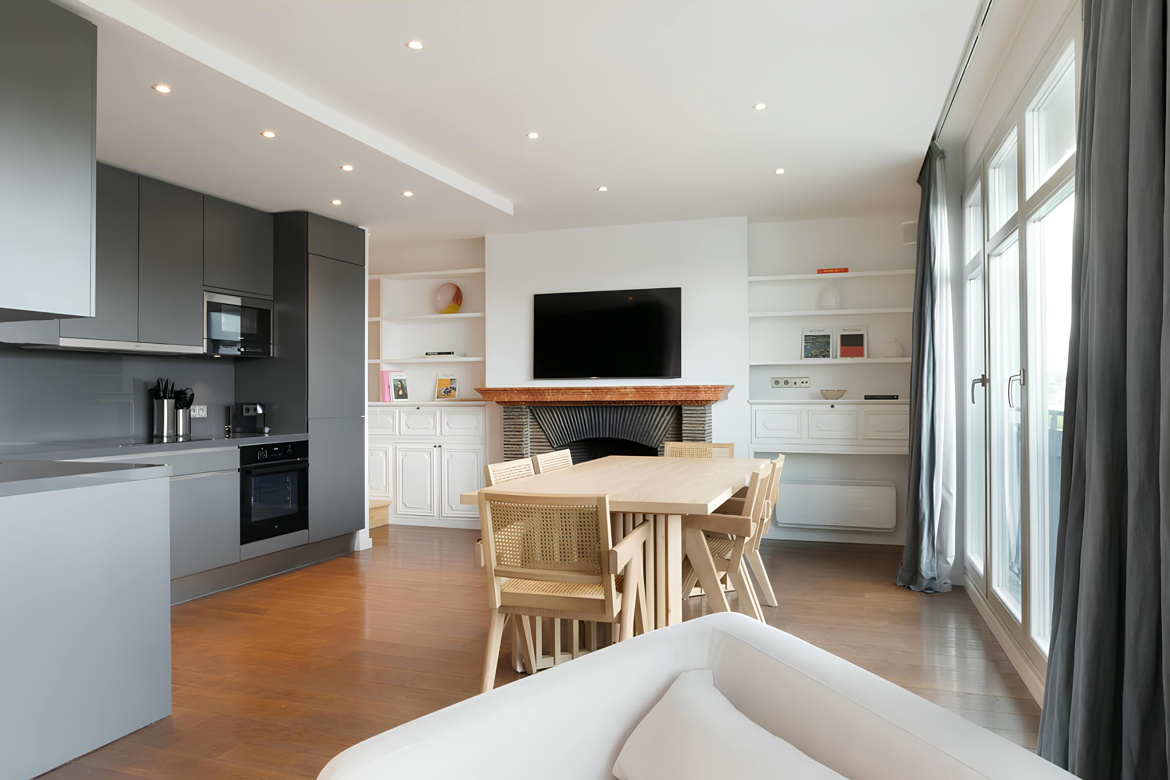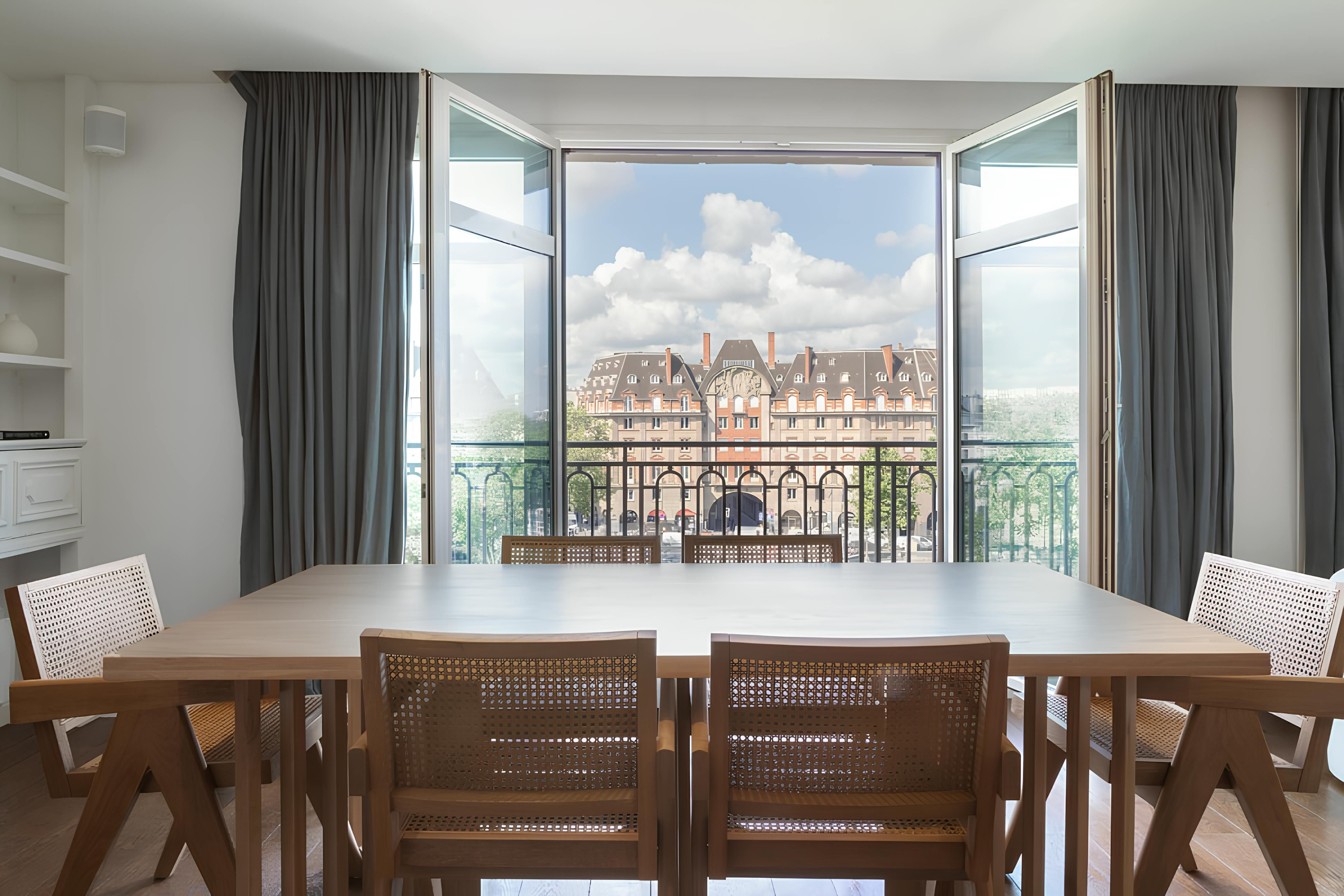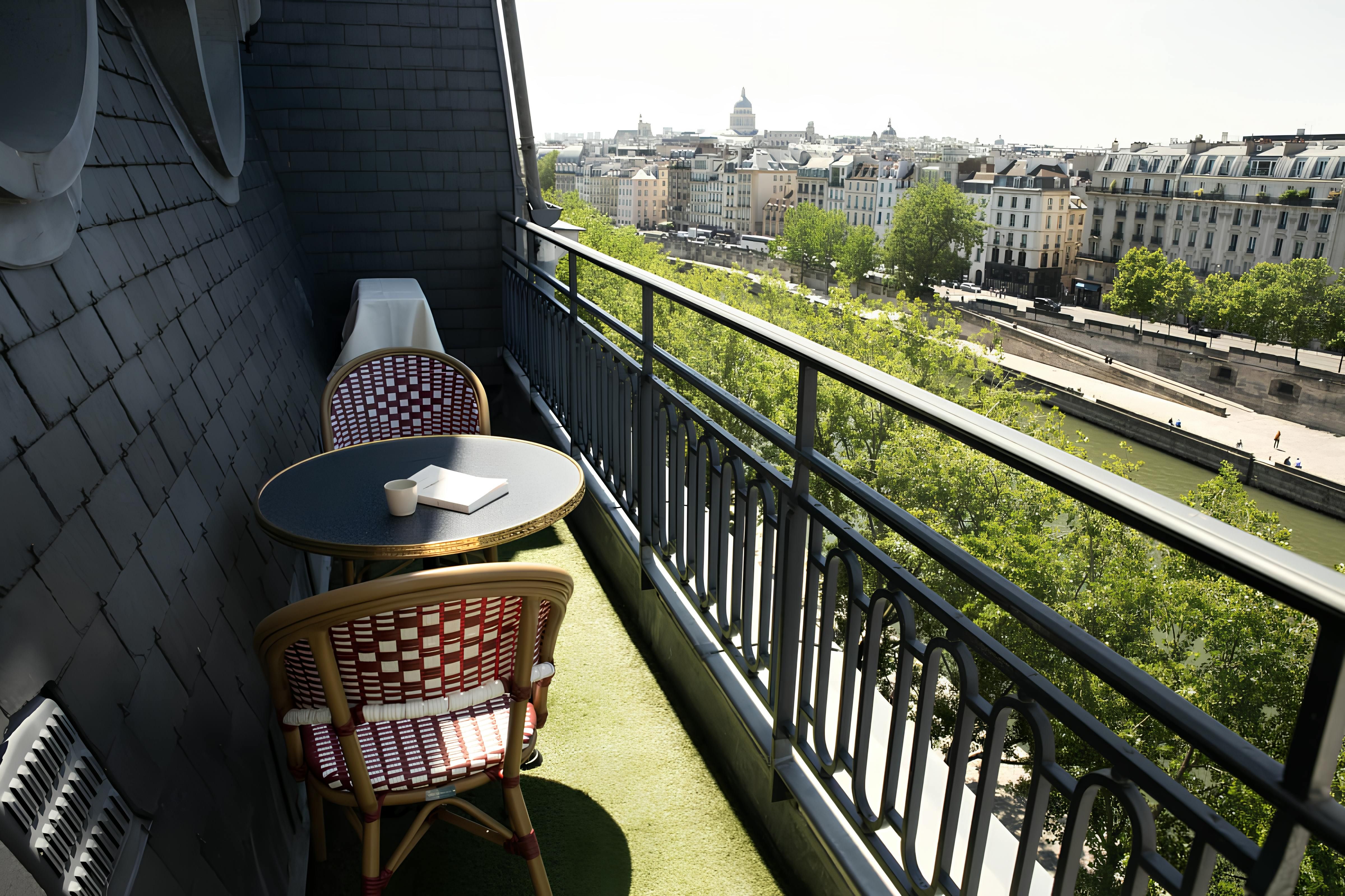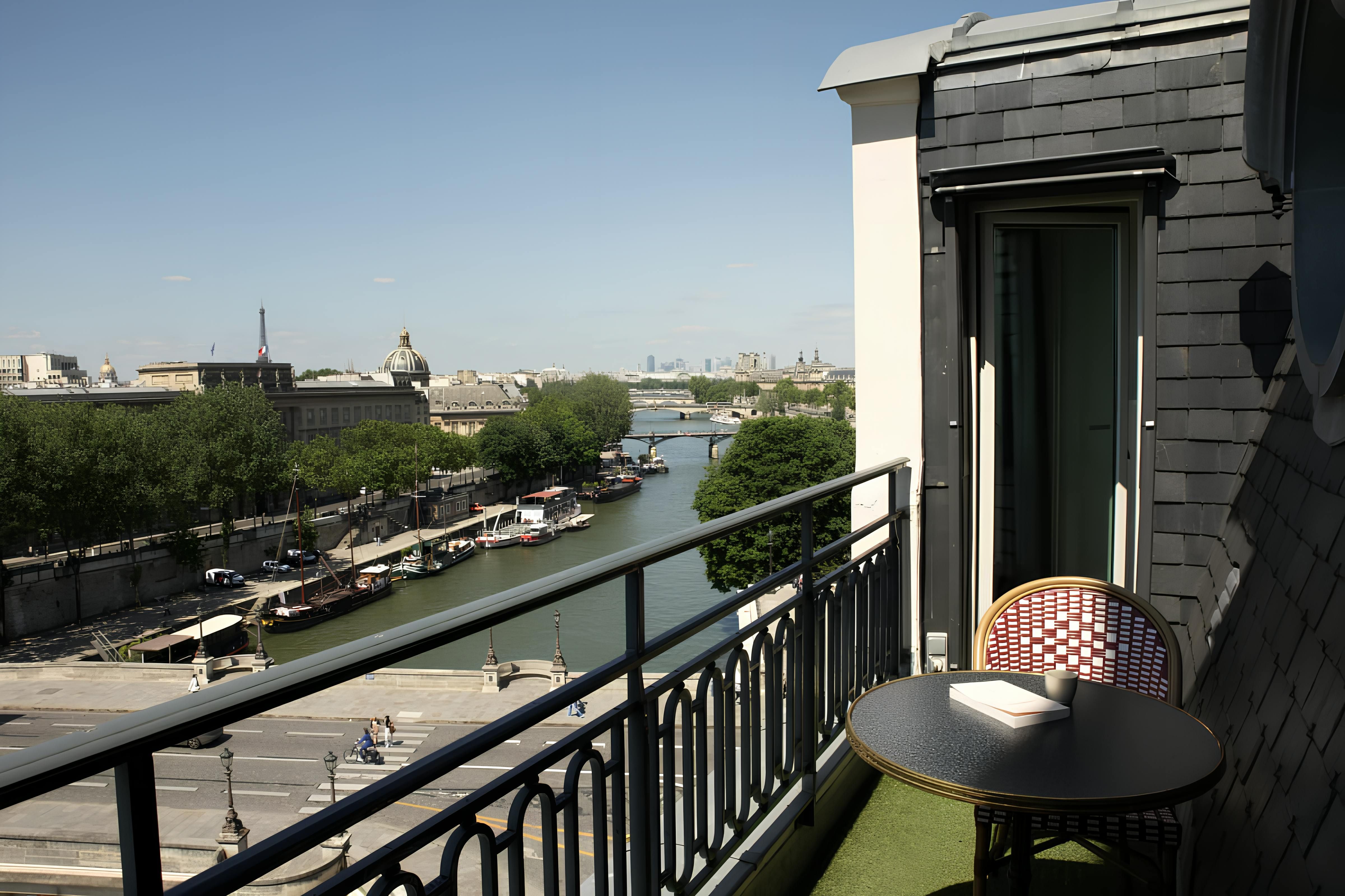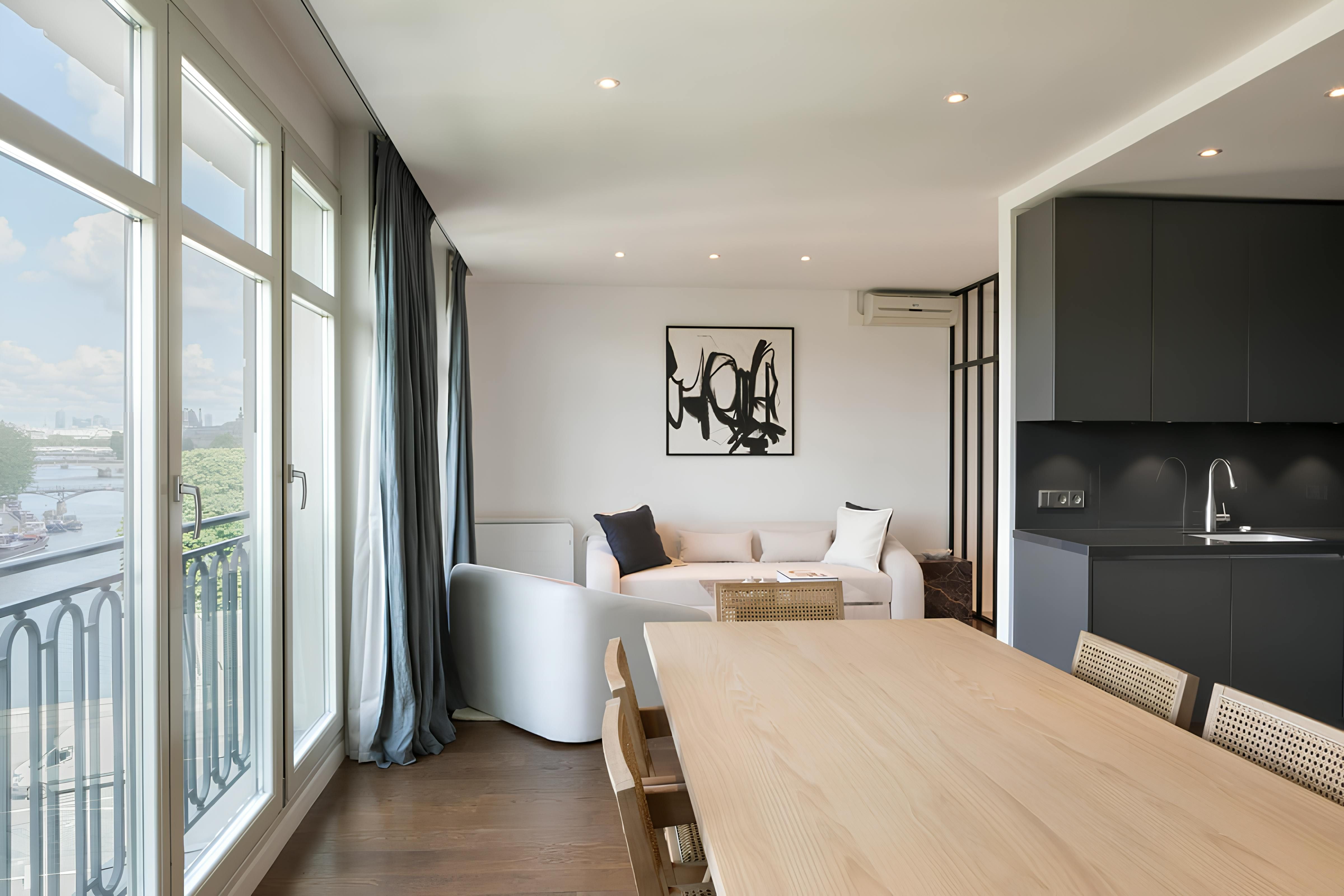 Although the location is great, we’ll start with the apartment itself – you can see why with views like this. The vistas from the balcony over the Eiffel Tower, River Seine and the Quai des Orfèvres are fantastic. The open-plan living room and main bedroom have a wonderful outlook too. Now about the location – the home is situated on the exclusive Île de la Cité, so there are plenty of riverside strolls to be had. The nearby iconic Notre-Dame de Paris is also a short walk away, while across the Pont Neuf, you’ll find the Louvre Museum.
