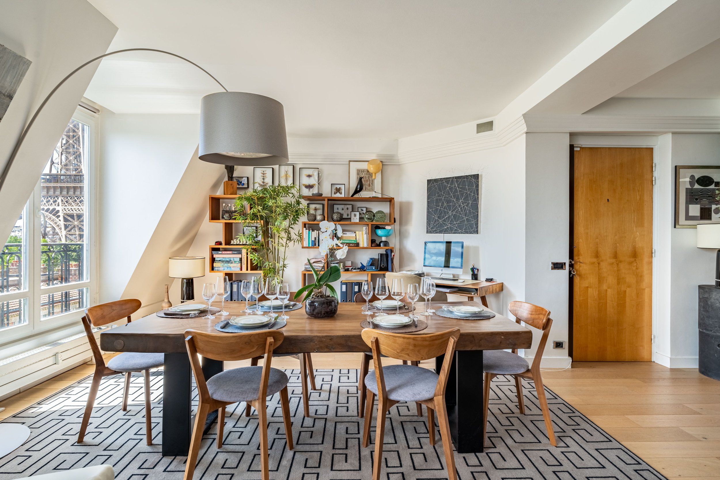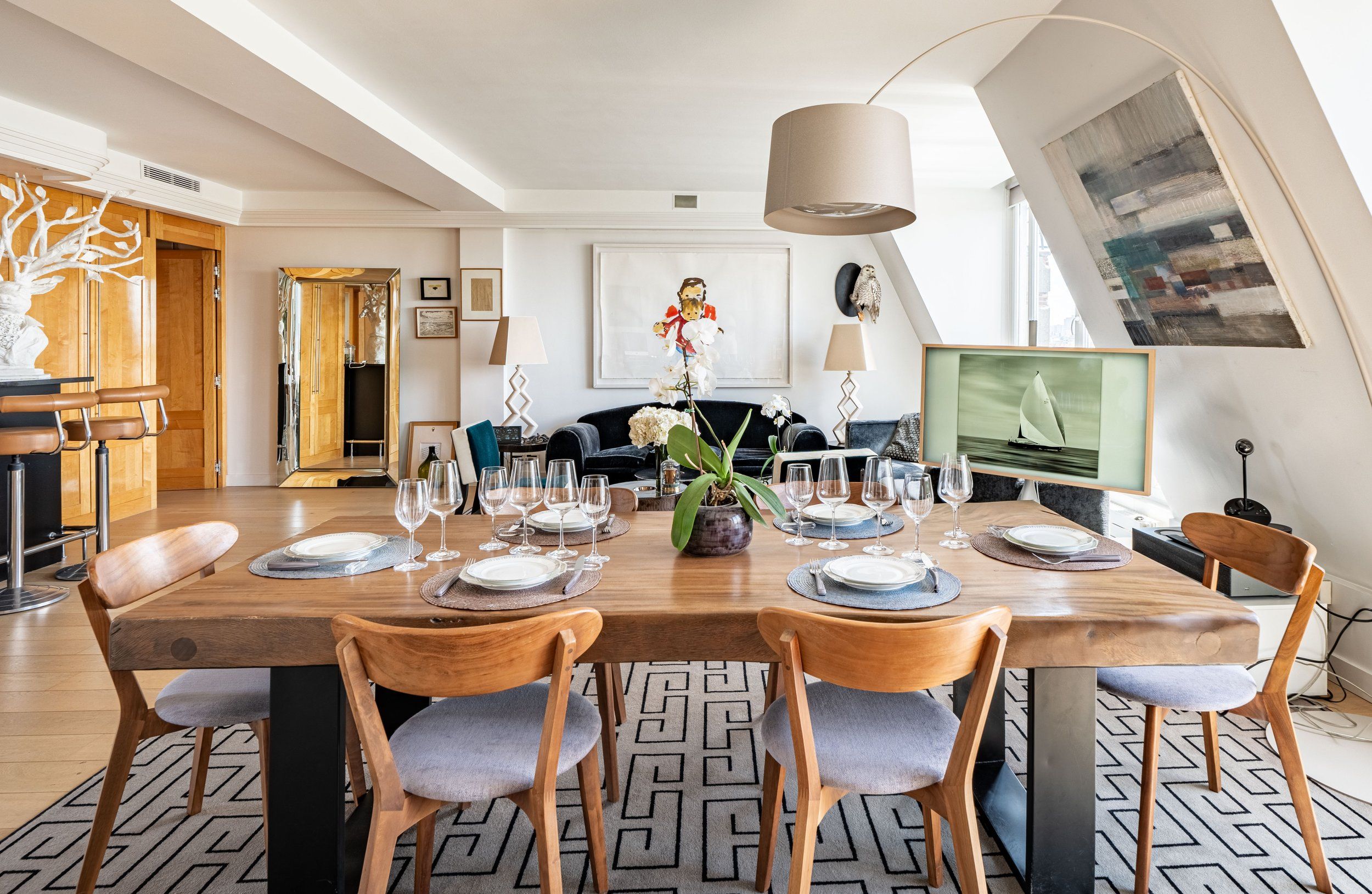 When you think of Paris, your mind’s eye inevitably pictures the Eiffel Tower. So when staying in the City of Light, why would you settle for a view of anything else? This apartment boasts a rooftop terrace with one of the best views in the city, with the Iron Lady front and centre. There’s a covered lounge space and an alfresco dining table, with greenery dotted around to make it as tranquil as can be. You can also admire the Eiffel Tower from this elegant apartment's bedroom and living room. We love the dining space beside floor-to-ceiling windows. Even better? Your host can provide a private chef if you don’t feel like cooking.