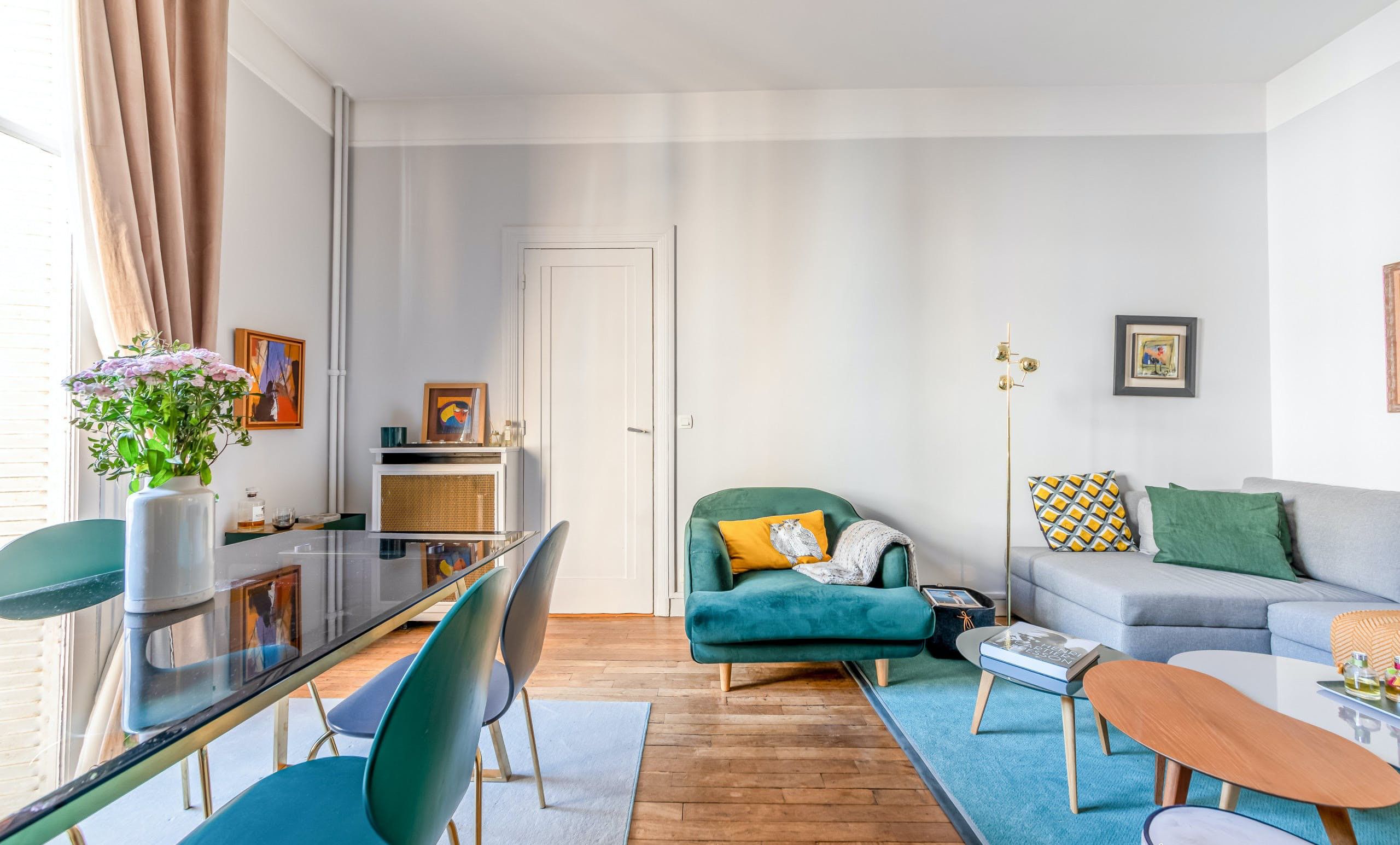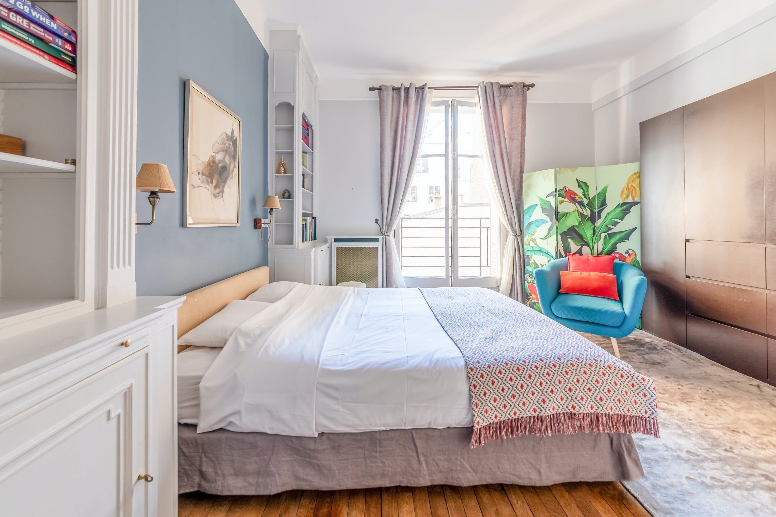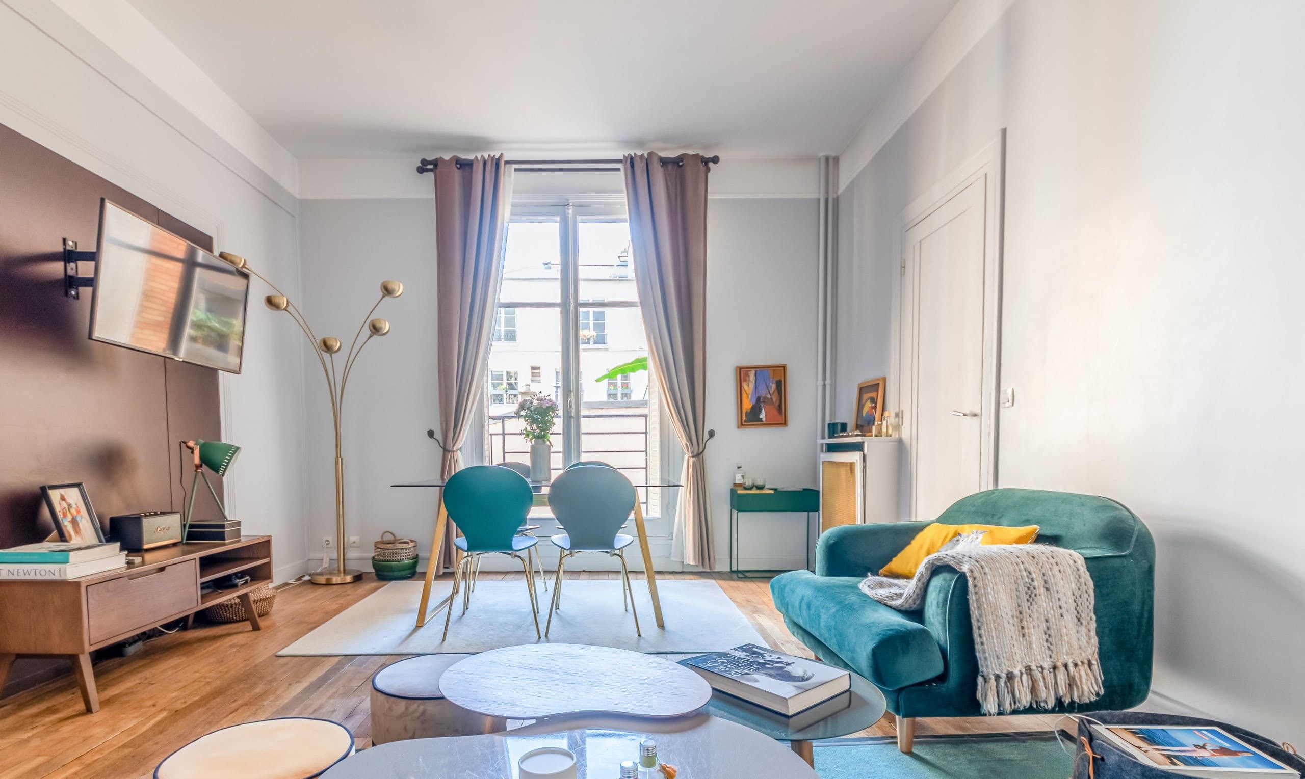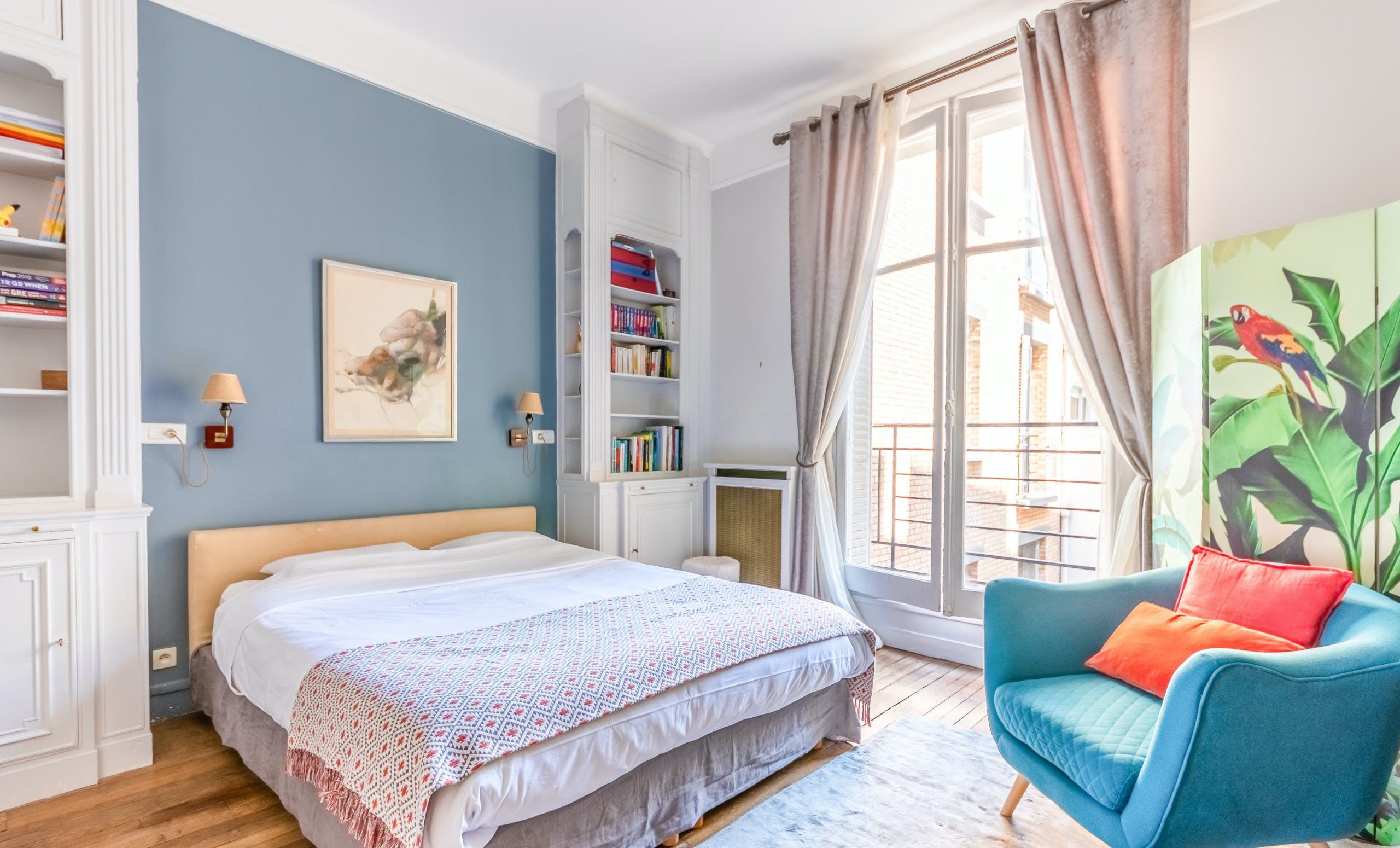 This typically Parisian apartment can be found on a quiet street in Saint Germain des Prés. It’s near the Bon Marché and just a short walk from iconic spots including the Louvre and Notre Dame, yet feels a million miles away from the crowds. It’s on the third floor of an elegant building and features high ceilings, parquet flooring, and original moldings. There’s more than enough space for two in this bright, attractive home. We love the floor-to-ceiling windows and the splashes of colour, and we think you will too.