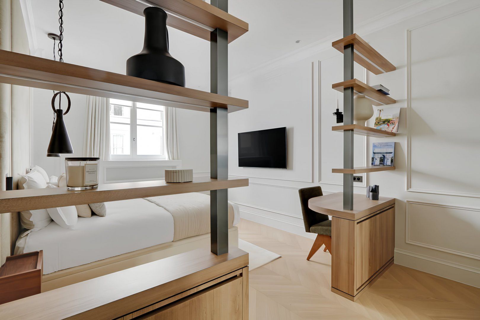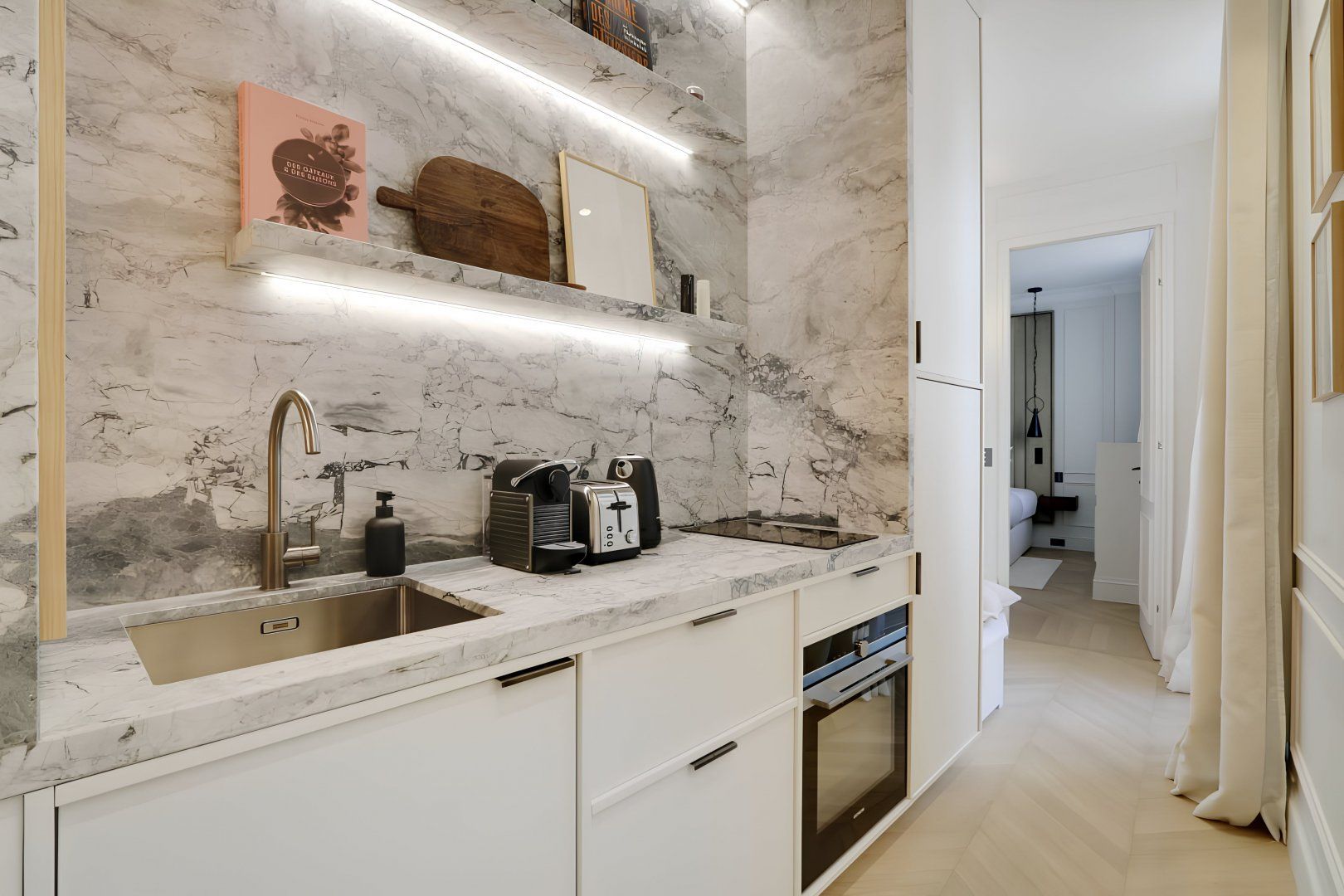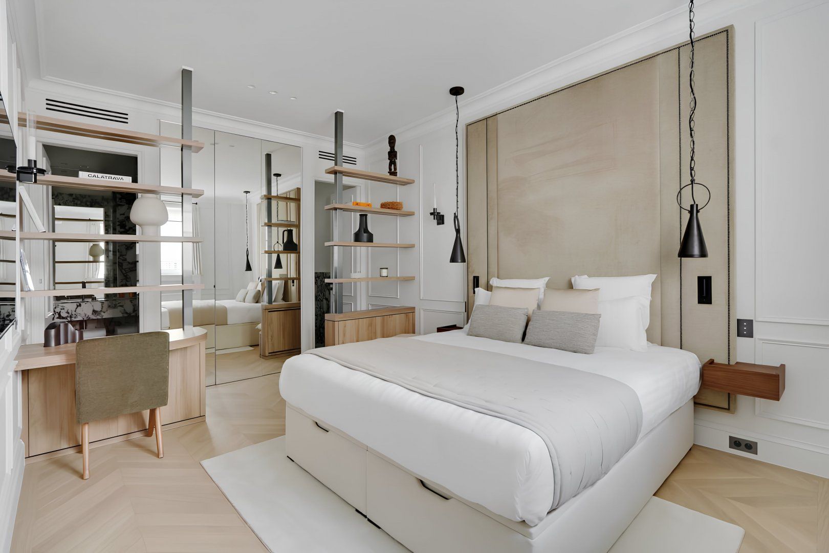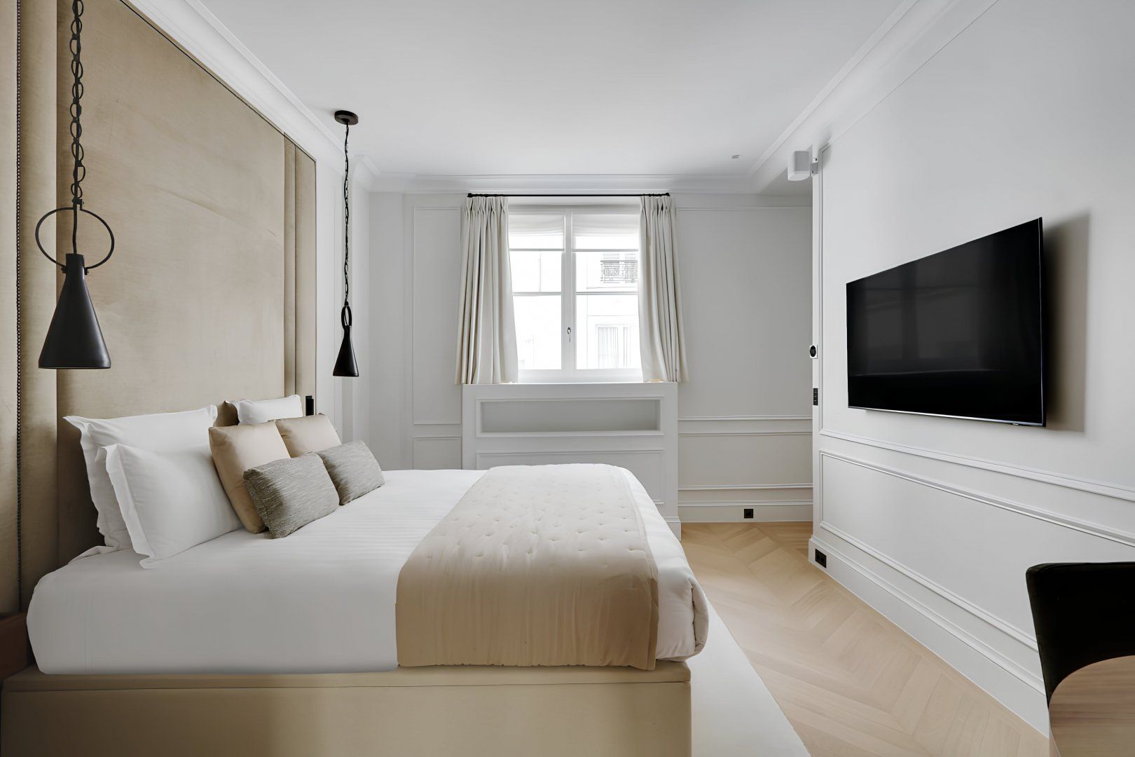 This chic apartment sits on the first floor of an emblematic Haussmann building. For modern travellers, there's no key to carry around but a secure access code to enter this plush home. Reflective of Parisian style, we love the casual dining nook and flowy layout. By the king-sized bed, you'll even find a handy desk. While daily cleans are included, lots of extra services offer holiday treats. Why not hire a private chef after touring the nearby Louvre and Orangerie museums?