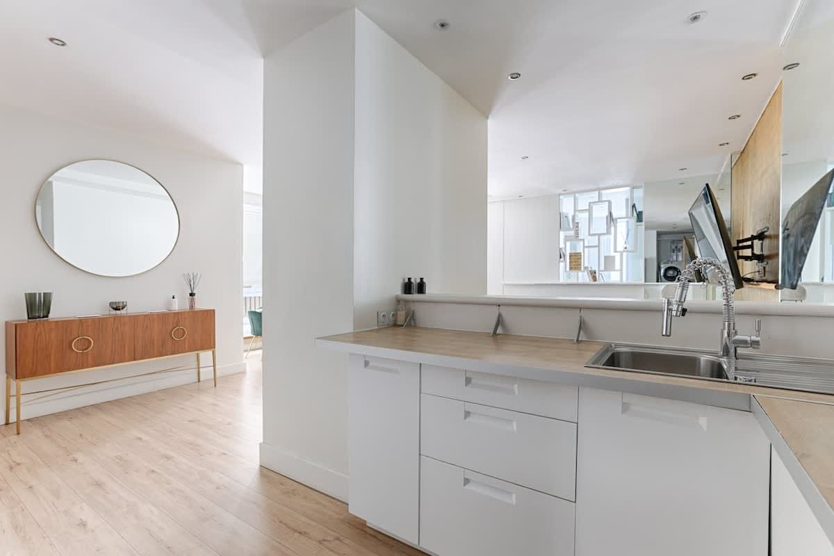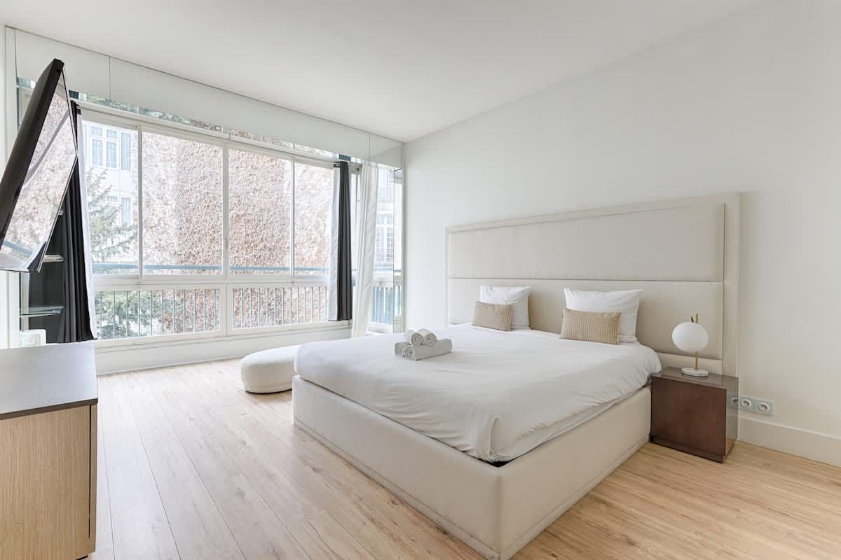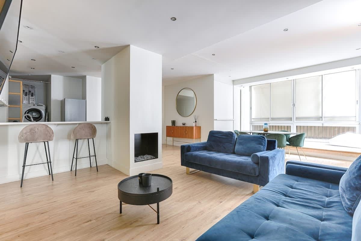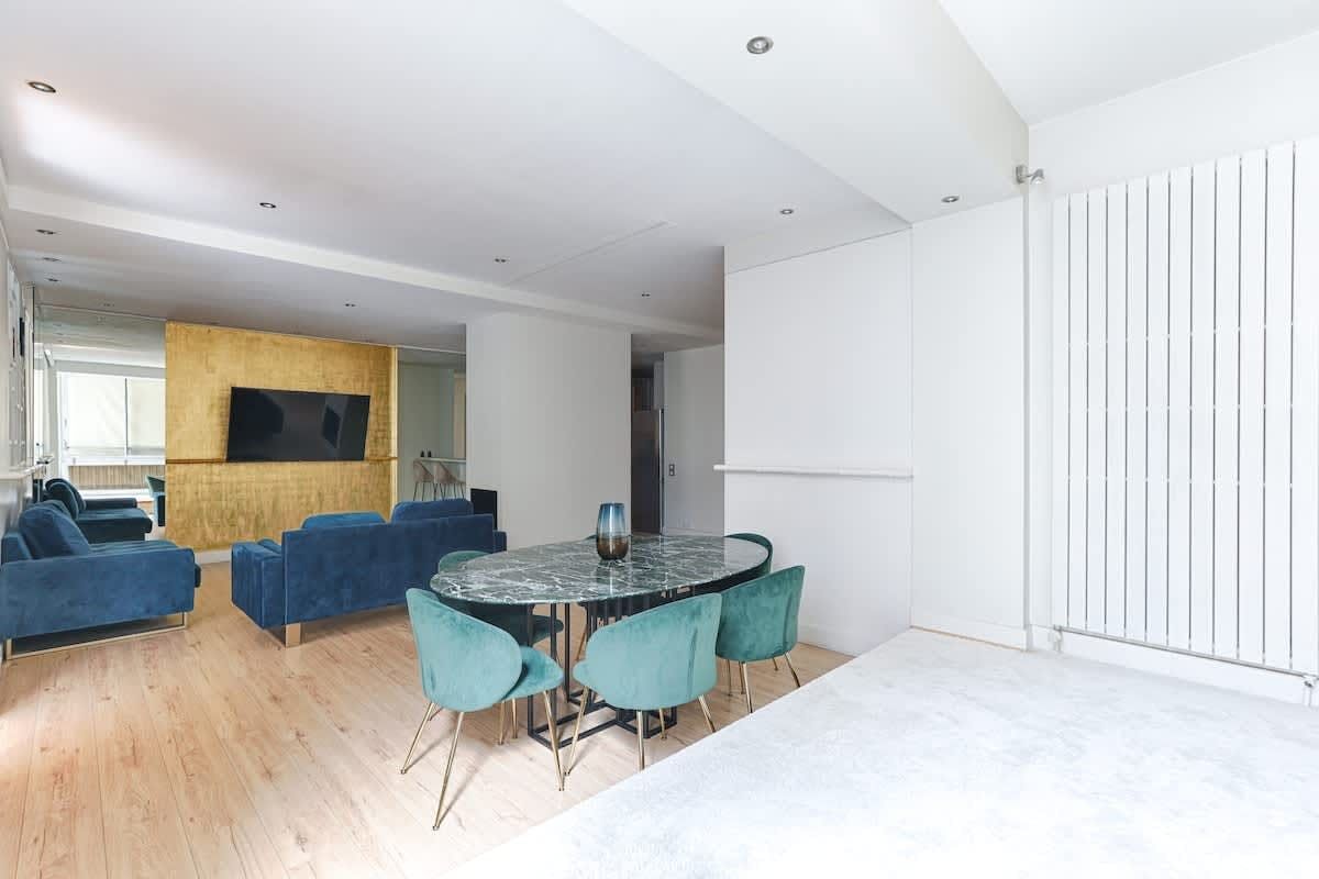 You’ll find this apartment just a quick walk from the River Seine. Lots of the City of Light’s much-loved attractions, like the Champs-Élysées, the Eiffel Tower, and the Arc de Triomphe, are within walking distance too. So, the location is definitely a plus. The apartment itself is situated in a beautiful, historic building. The large open-plan living space here is a highlight for sure. With its wealth of natural light, it’s a great place for chilling out with friends or family.