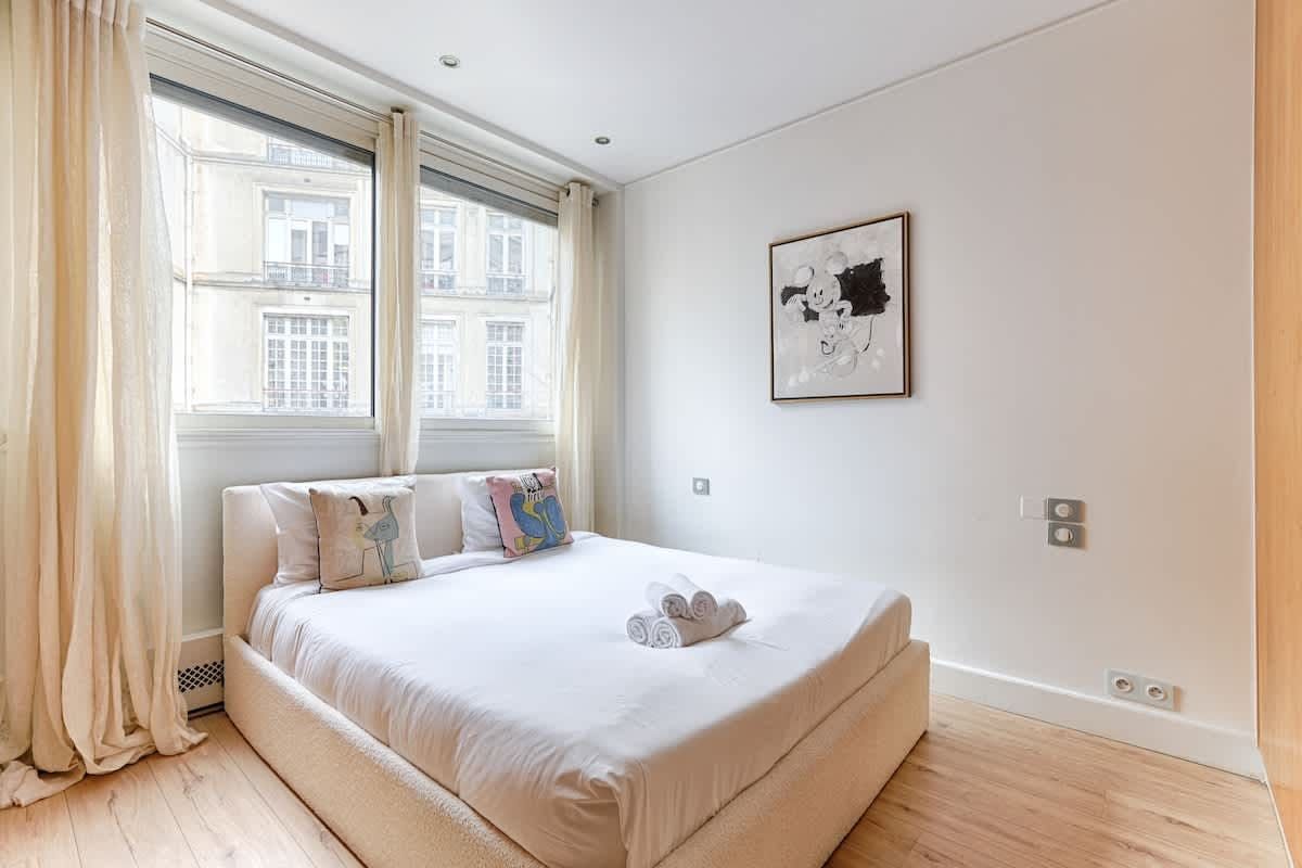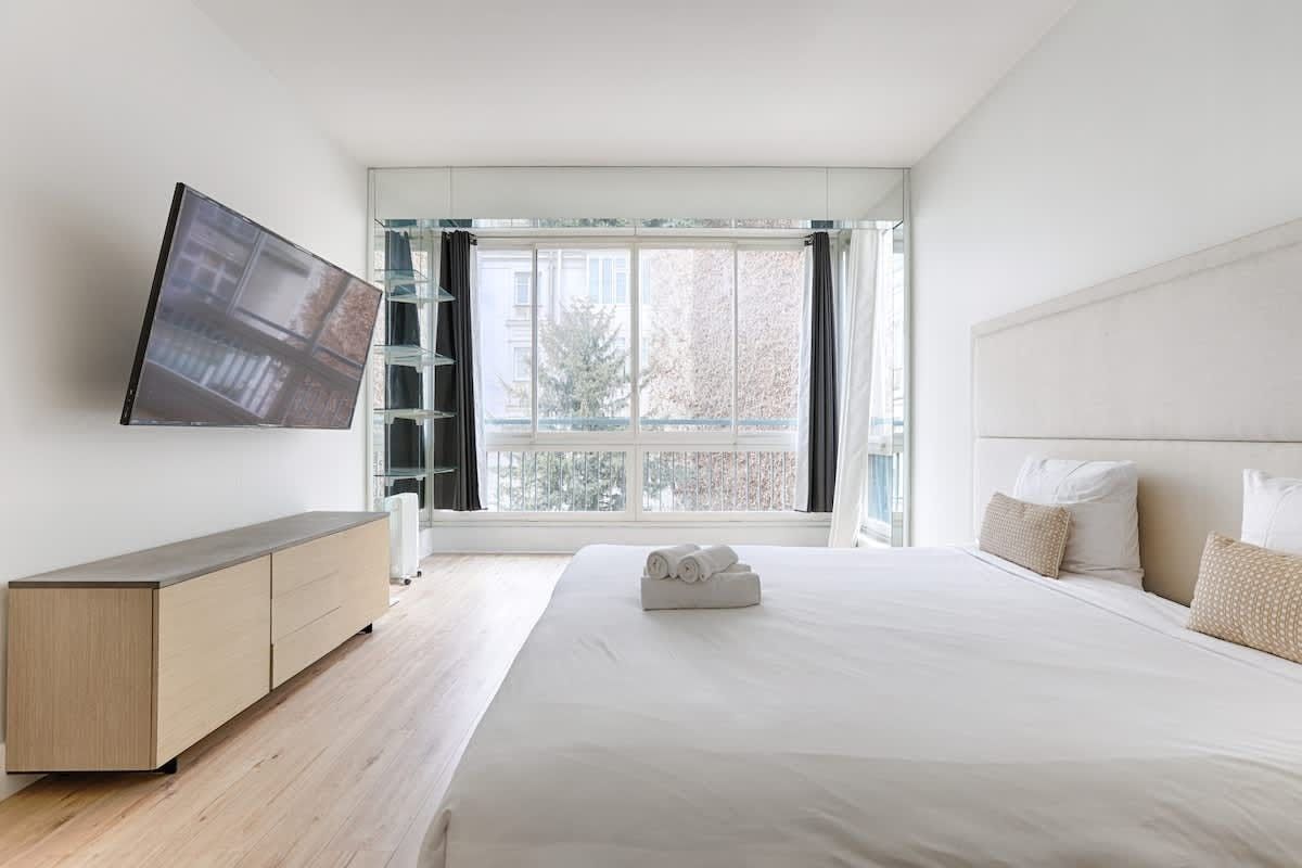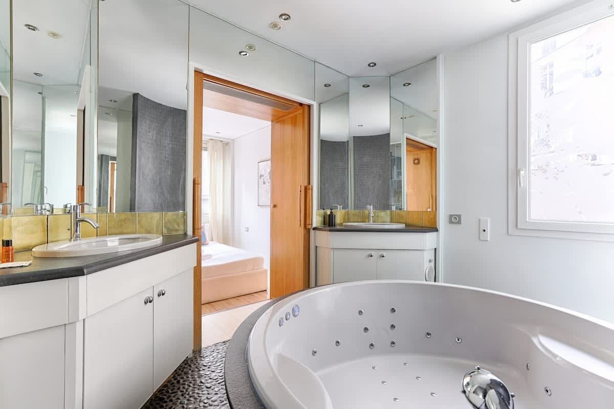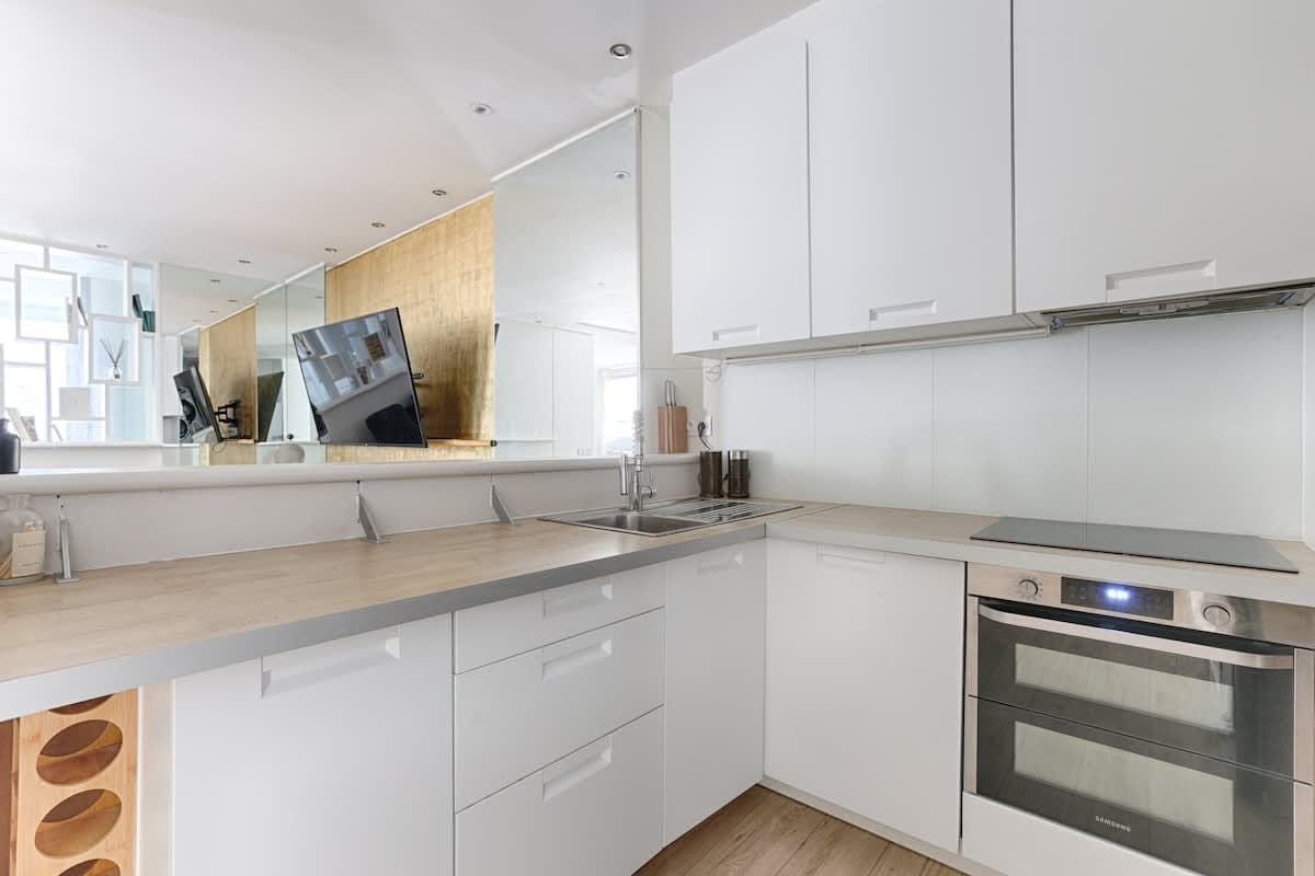 You’ll find this apartment just a quick walk from the River Seine. Lots of the City of Light’s much-loved attractions, like the Champs-Élysées, the Eiffel Tower, and the Arc de Triomphe, are within walking distance too. So, the location is definitely a plus. The apartment itself is situated in a beautiful, historic building. The large open-plan living space here is a highlight for sure. With its wealth of natural light, it’s a great place for chilling out with friends or family.