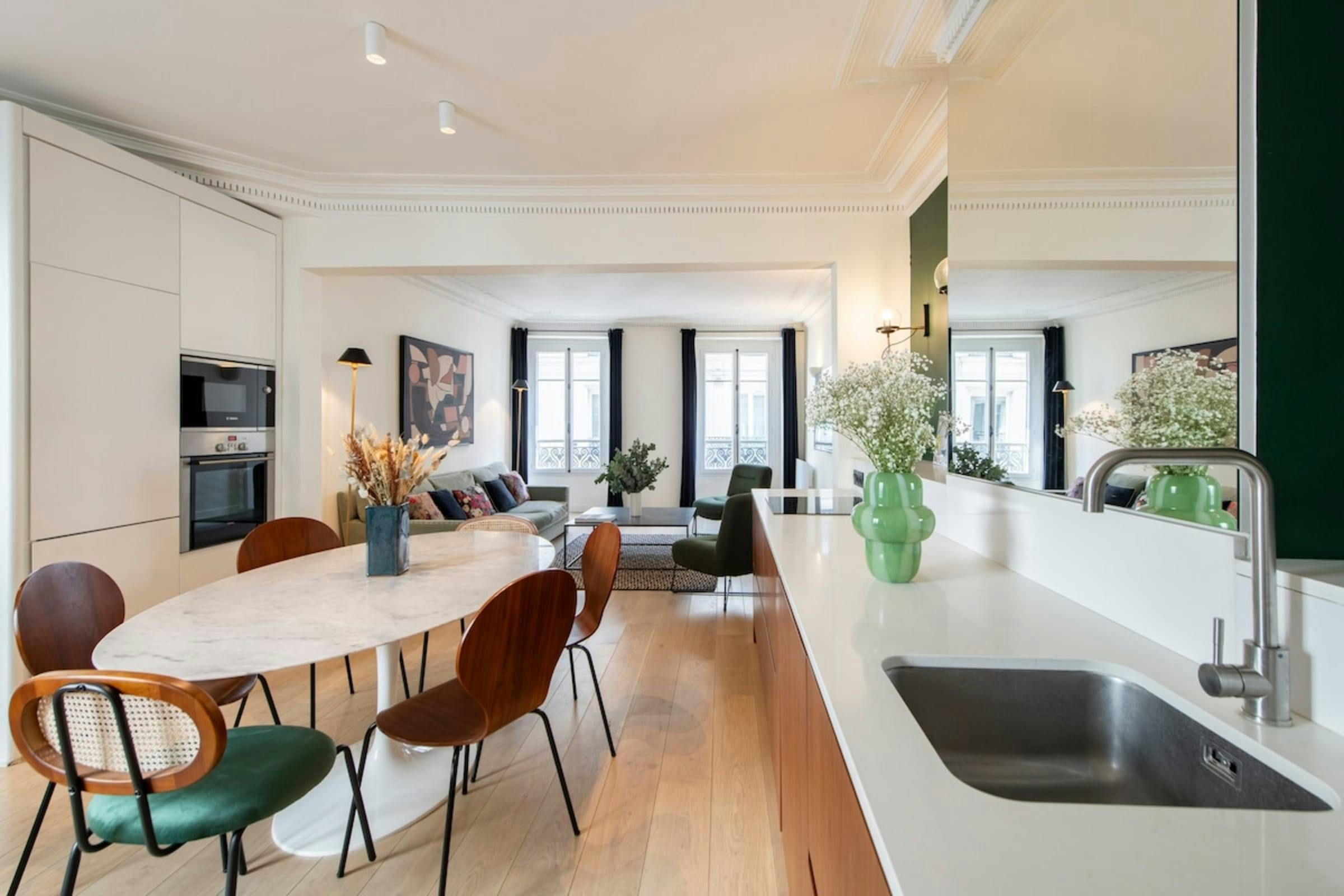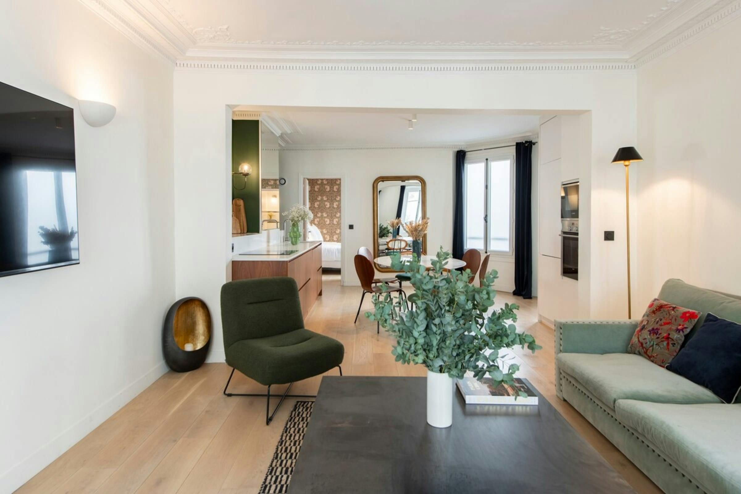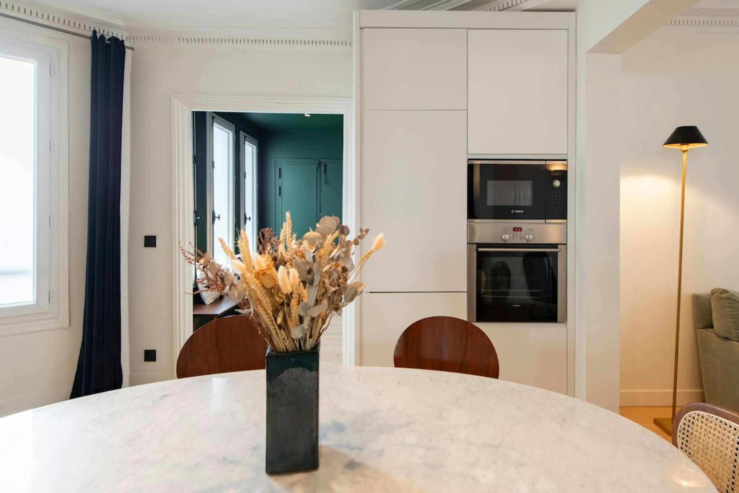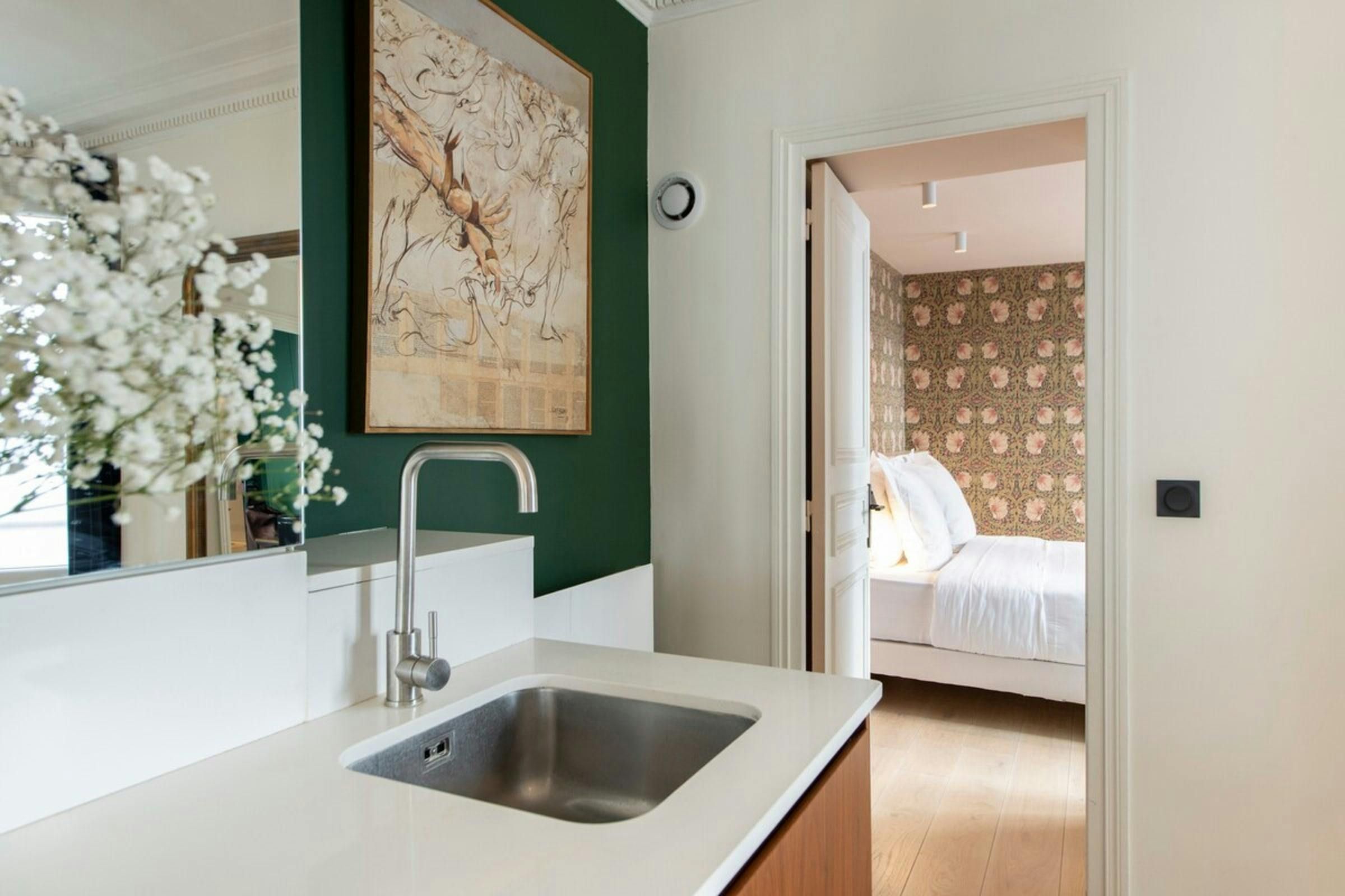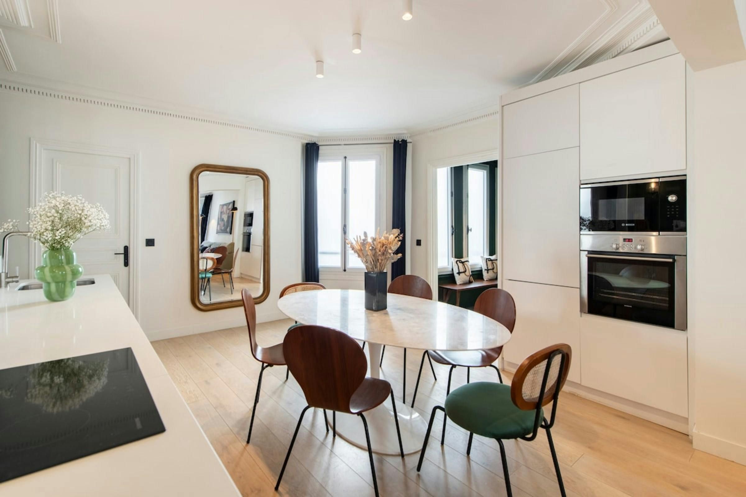 This deluxe apartment on the edge of New Athens marries beautiful furnishings with a coveted Paris location. The home was decorated by a professional in the traditional Haussmann style, creating a comfortable and sophisticated option for friend groups and families. The open plan living area flows into the kitchen and dining area, which are effectively one and the same – the dining table stands between the worktop and the oven, meaning chefs will need to be cautious ferrying hot dishes. The three bedrooms are distinct and characterful, though only one has an en-suite bathroom. Beyond the building, you'll be a twenty minute walk from both Montmartre and the Opera, and one minute from Notre-Dame-de-Lorette and the north-south 12 metro line.