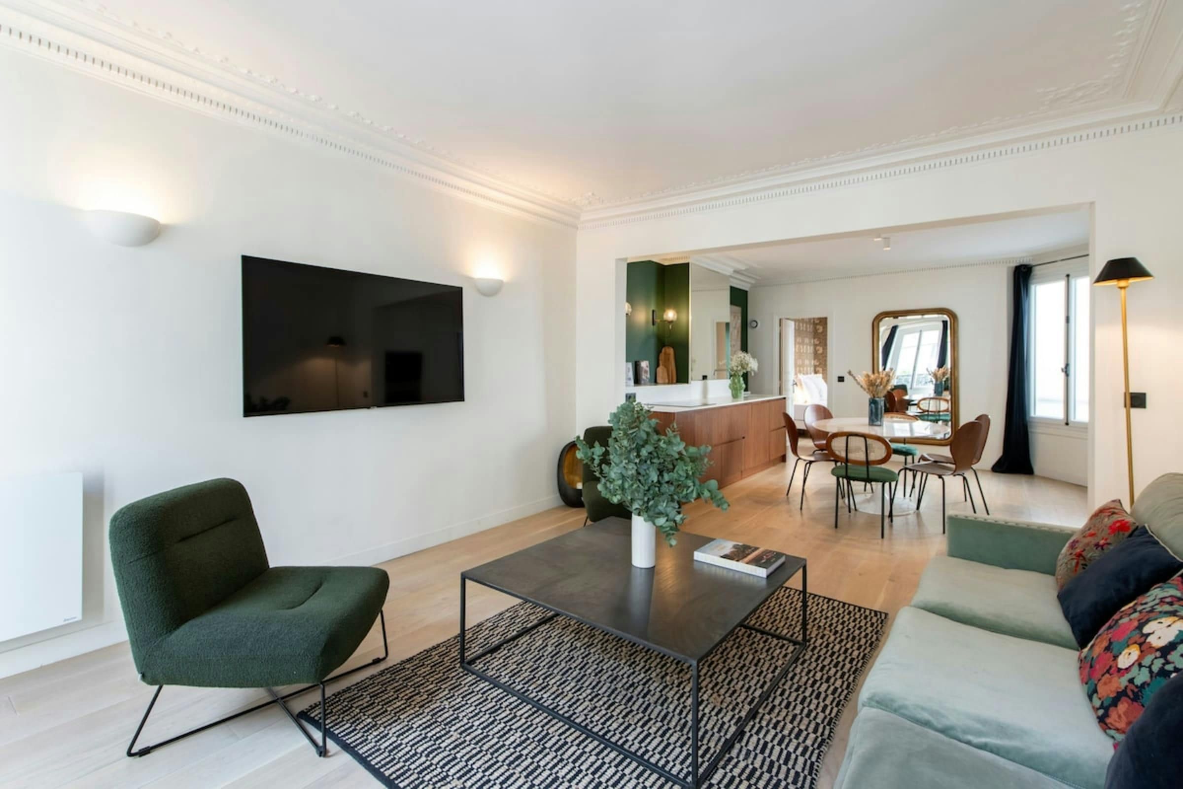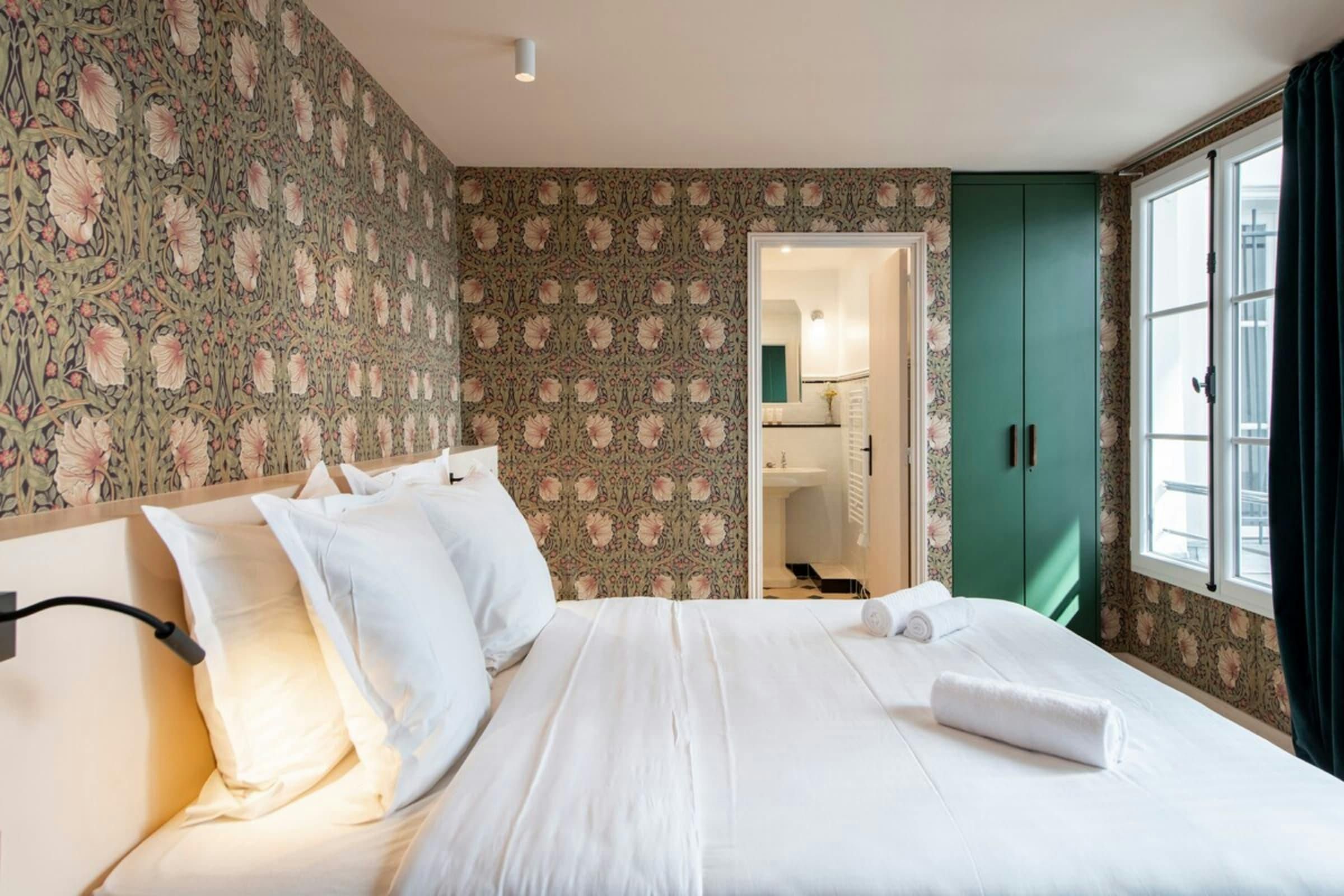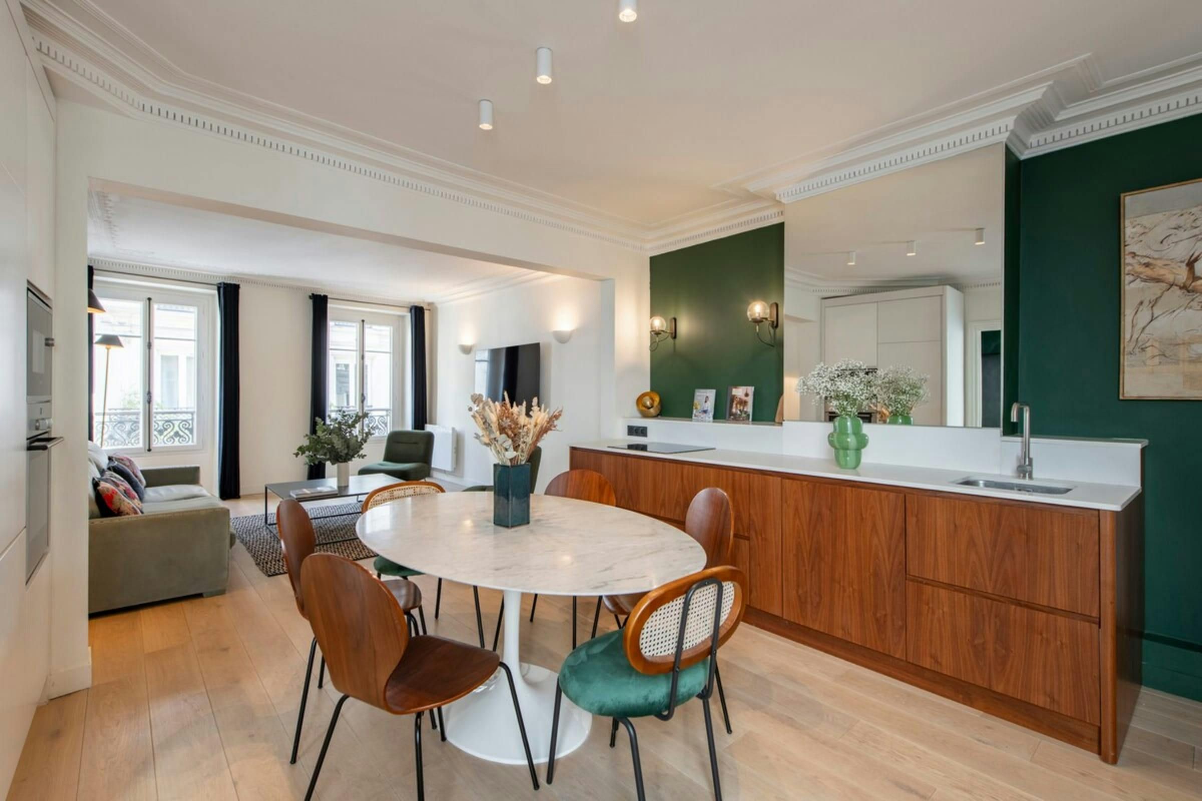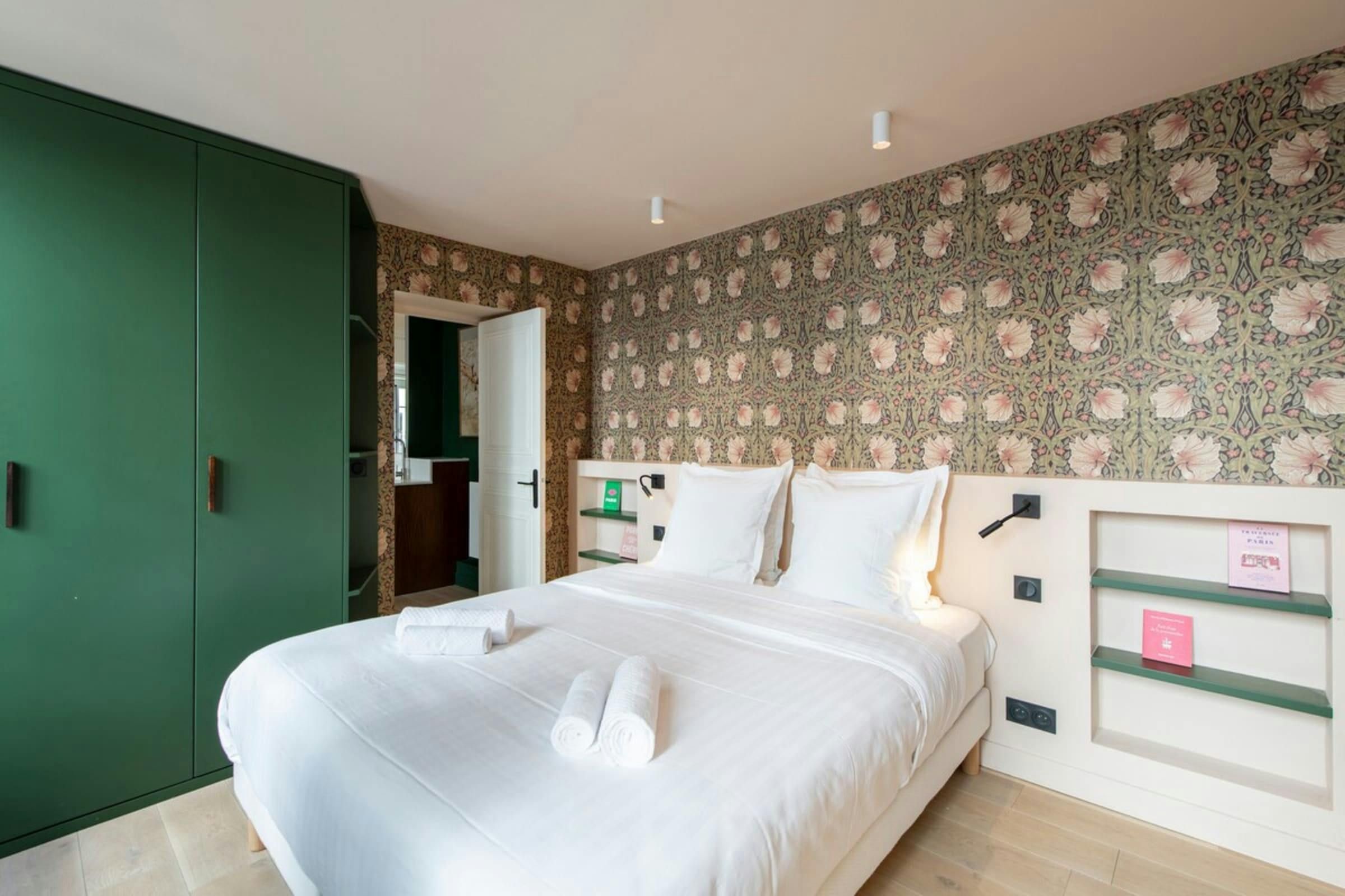 This deluxe apartment on the edge of New Athens marries beautiful furnishings with a coveted Paris location. The home was decorated by a professional in the traditional Haussmann style, creating a comfortable and sophisticated option for friend groups and families. The open plan living area flows into the kitchen and dining area, which are effectively one and the same – the dining table stands between the worktop and the oven, meaning chefs will need to be cautious ferrying hot dishes. The three bedrooms are distinct and characterful, though only one has an en-suite bathroom. Beyond the building, you'll be a twenty minute walk from both Montmartre and the Opera, and one minute from Notre-Dame-de-Lorette and the north-south 12 metro line.