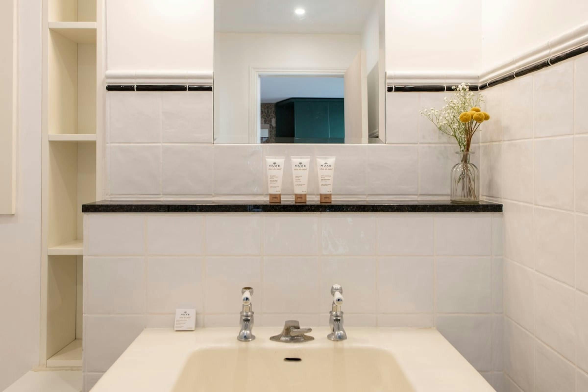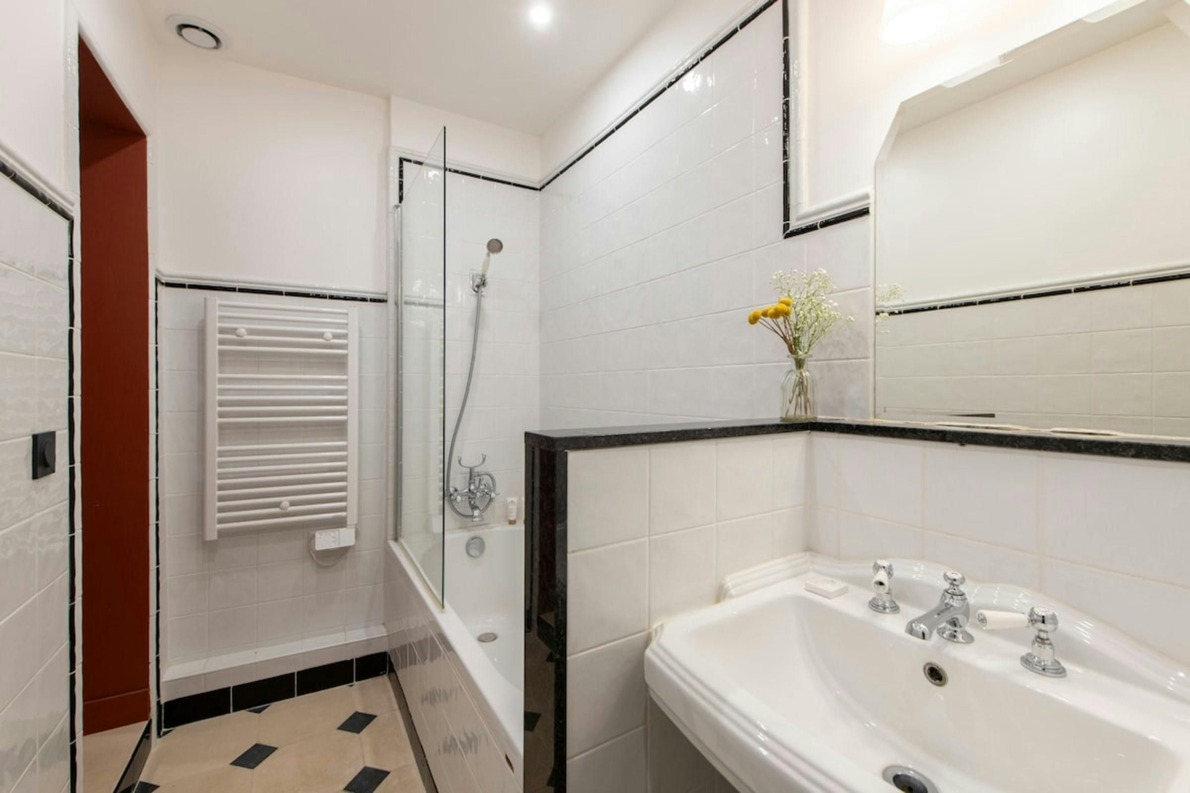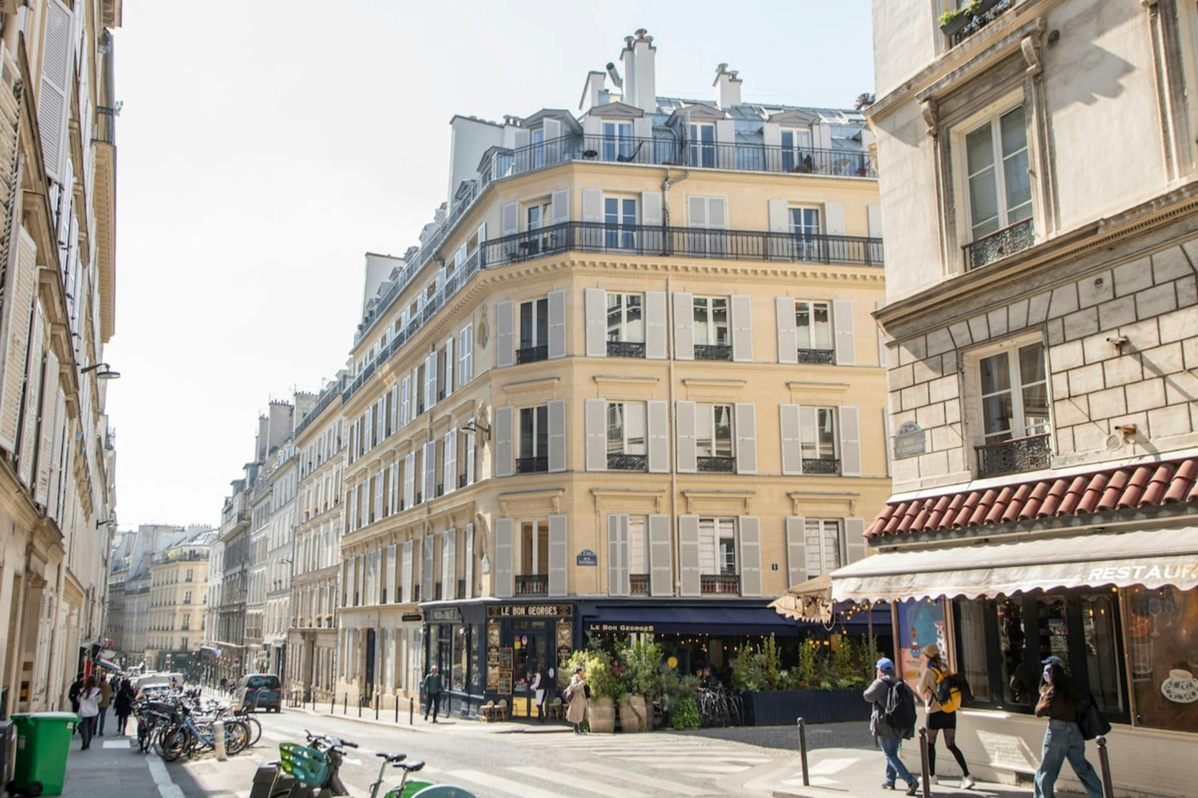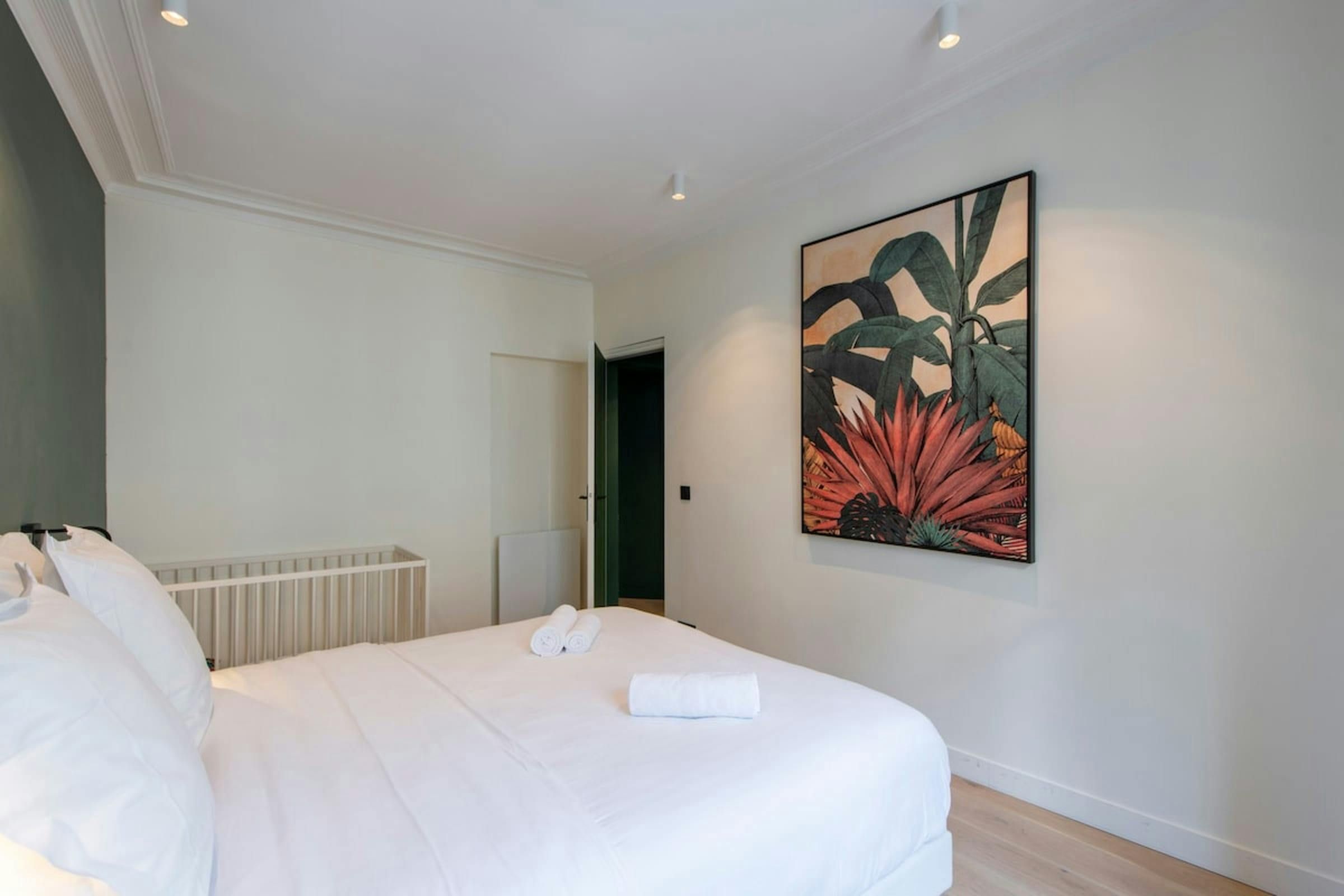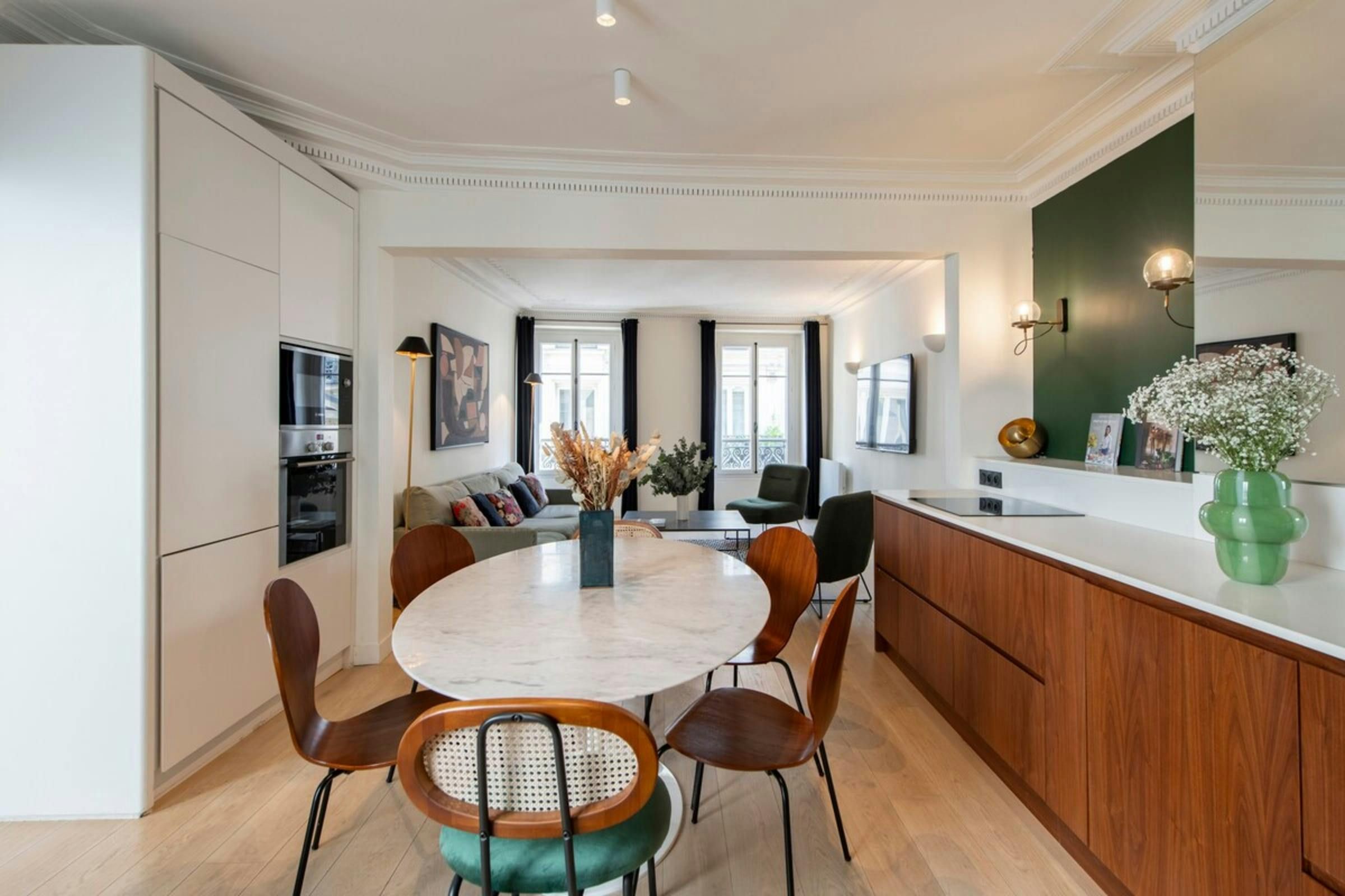 This deluxe apartment on the edge of New Athens marries beautiful furnishings with a coveted Paris location. The home was decorated by a professional in the traditional Haussmann style, creating a comfortable and sophisticated option for friend groups and families. The open plan living area flows into the kitchen and dining area, which are effectively one and the same – the dining table stands between the worktop and the oven, meaning chefs will need to be cautious ferrying hot dishes. The three bedrooms are distinct and characterful, though only one has an en-suite bathroom. Beyond the building, you'll be a twenty minute walk from both Montmartre and the Opera, and one minute from Notre-Dame-de-Lorette and the north-south 12 metro line.