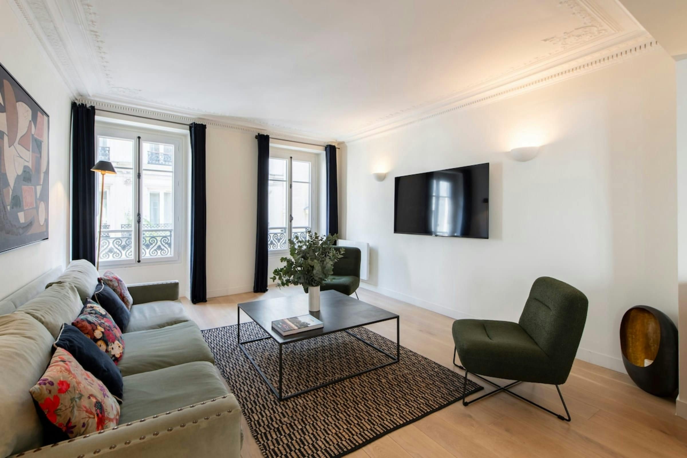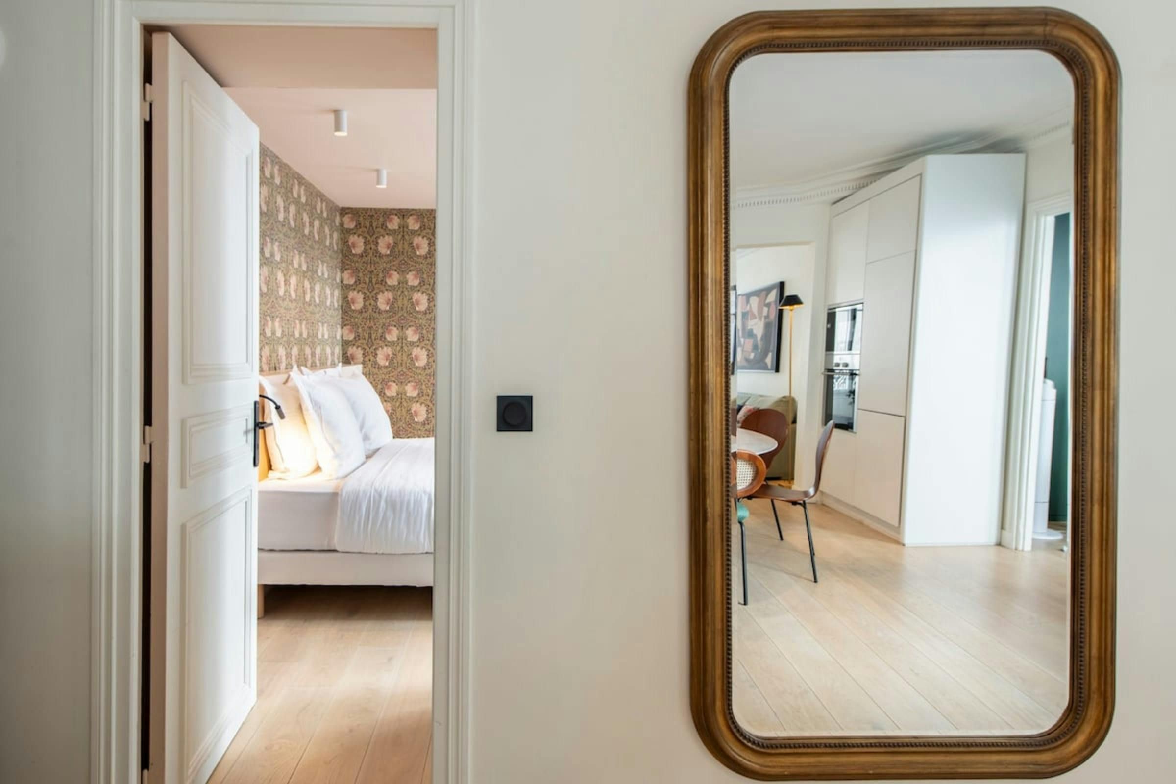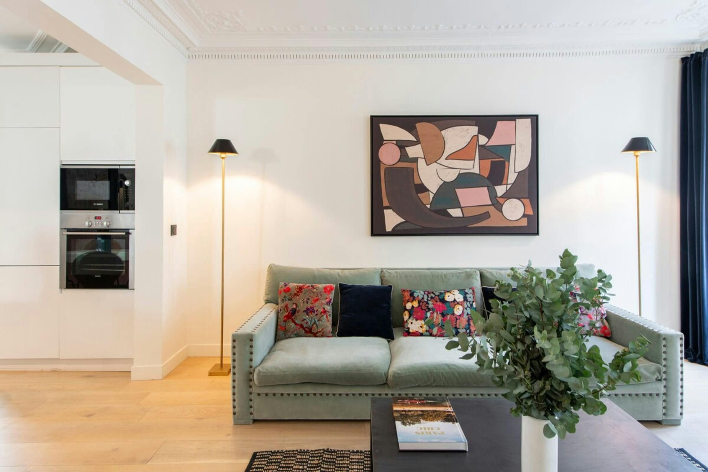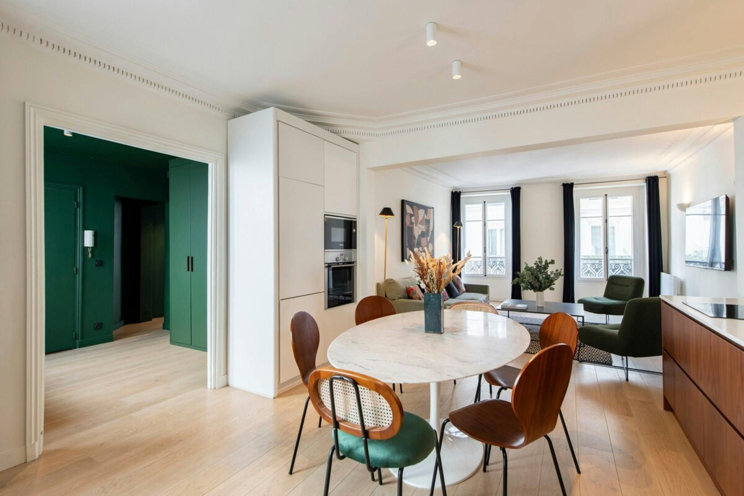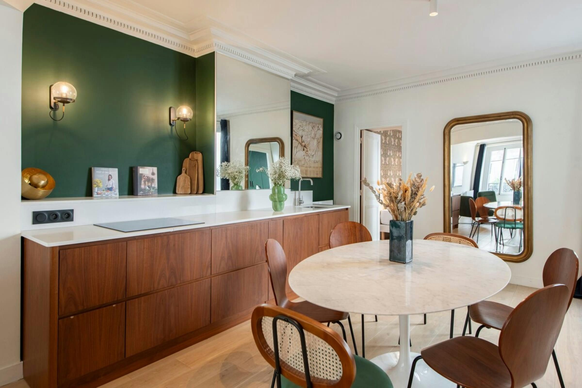 This deluxe apartment on the edge of New Athens marries beautiful furnishings with a coveted Paris location. The home was decorated by a professional in the traditional Haussmann style, creating a comfortable and sophisticated option for friend groups and families. The open plan living area flows into the kitchen and dining area, which are effectively one and the same – the dining table stands between the worktop and the oven, meaning chefs will need to be cautious ferrying hot dishes. The three bedrooms are distinct and characterful, though only one has an en-suite bathroom. Beyond the building, you'll be a twenty minute walk from both Montmartre and the Opera, and one minute from Notre-Dame-de-Lorette and the north-south 12 metro line.