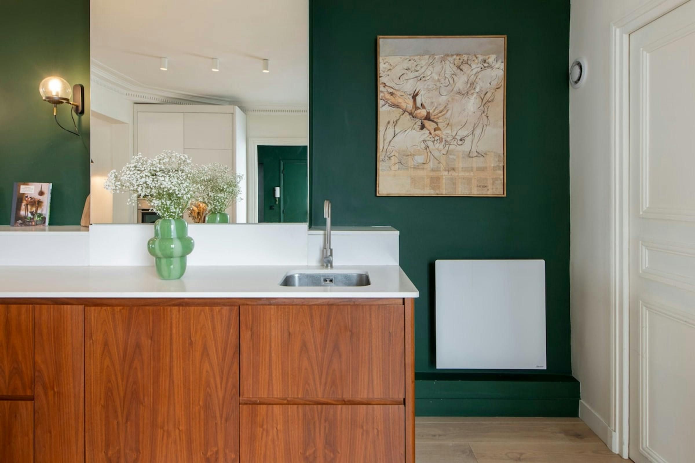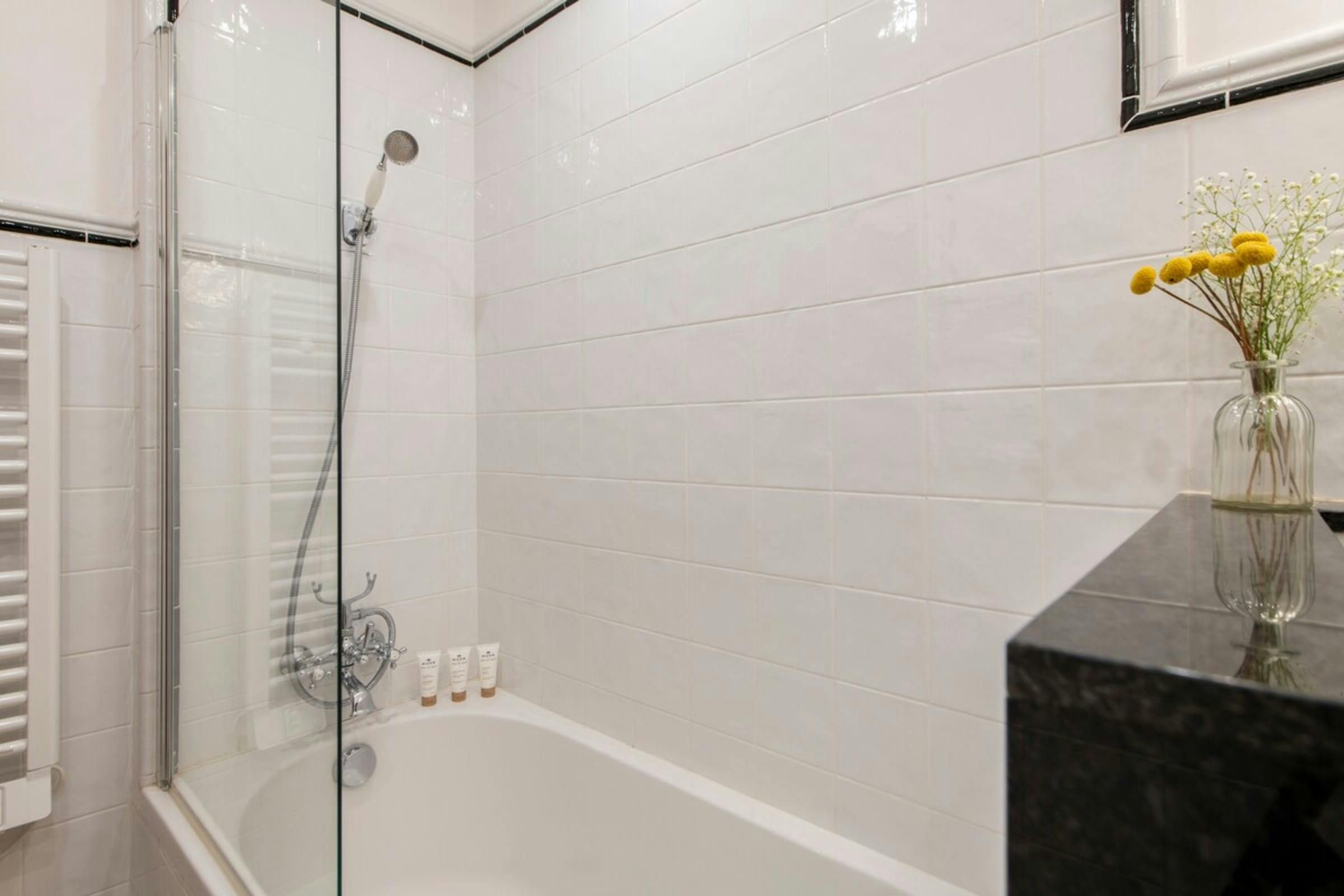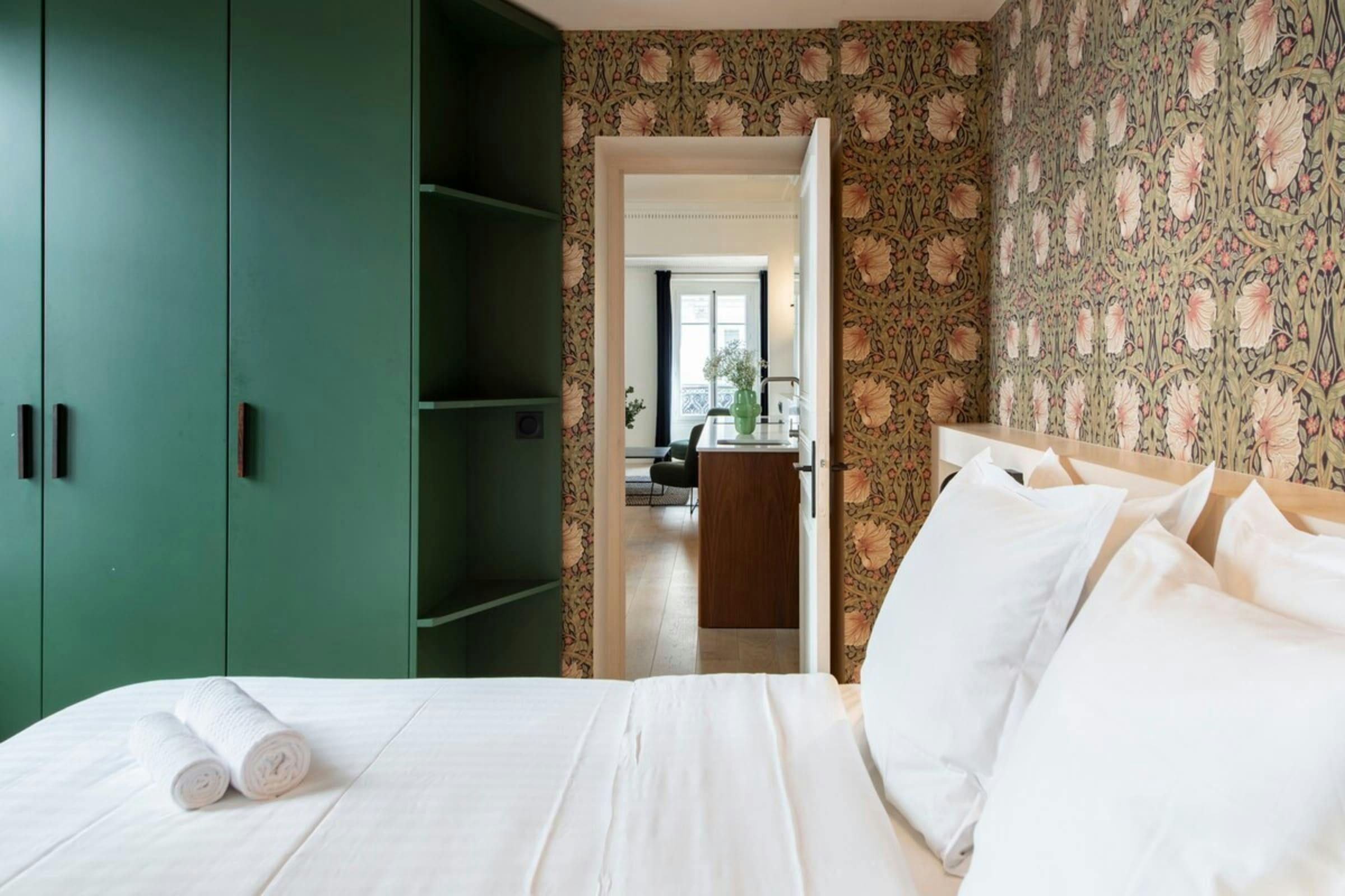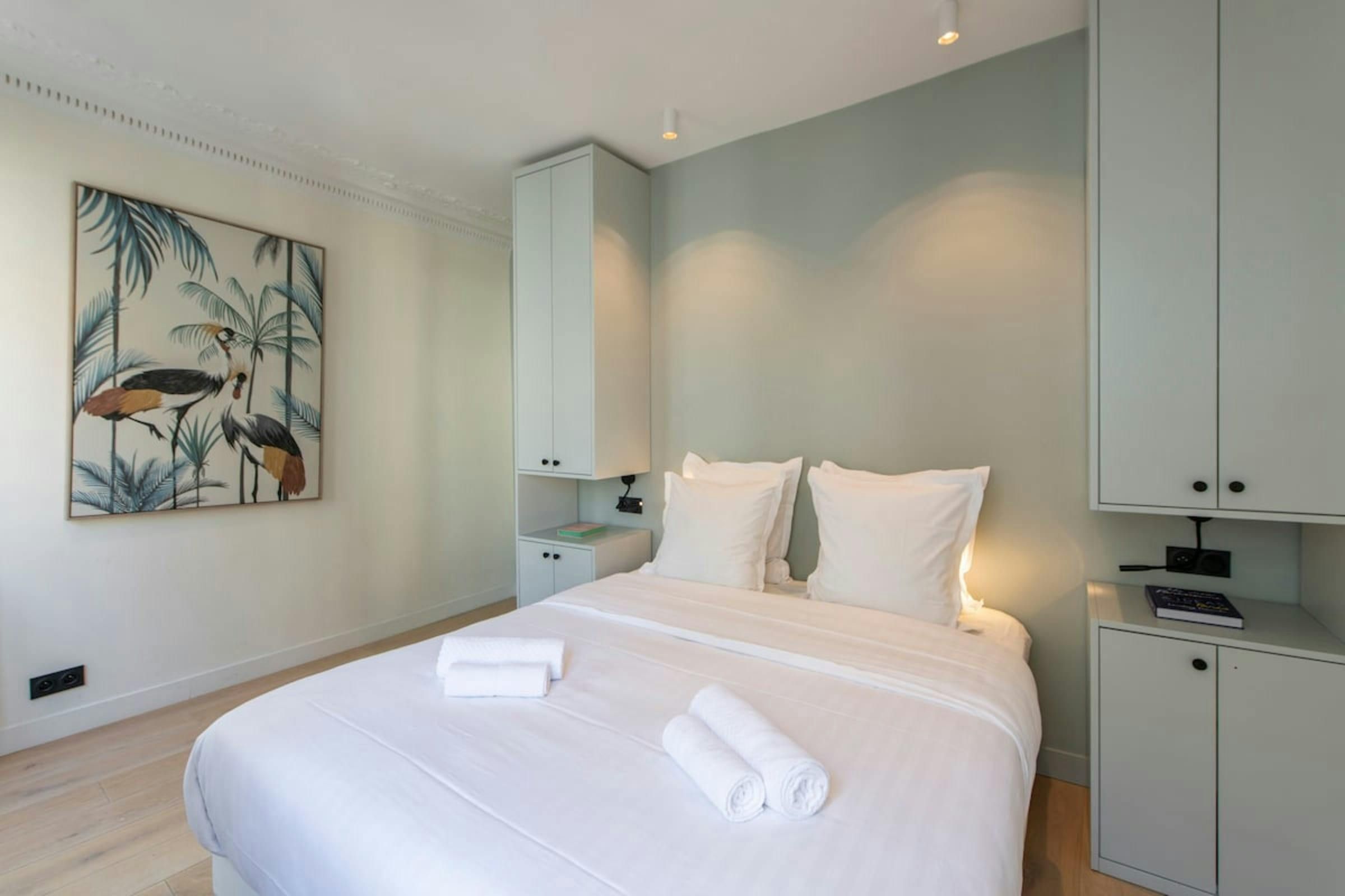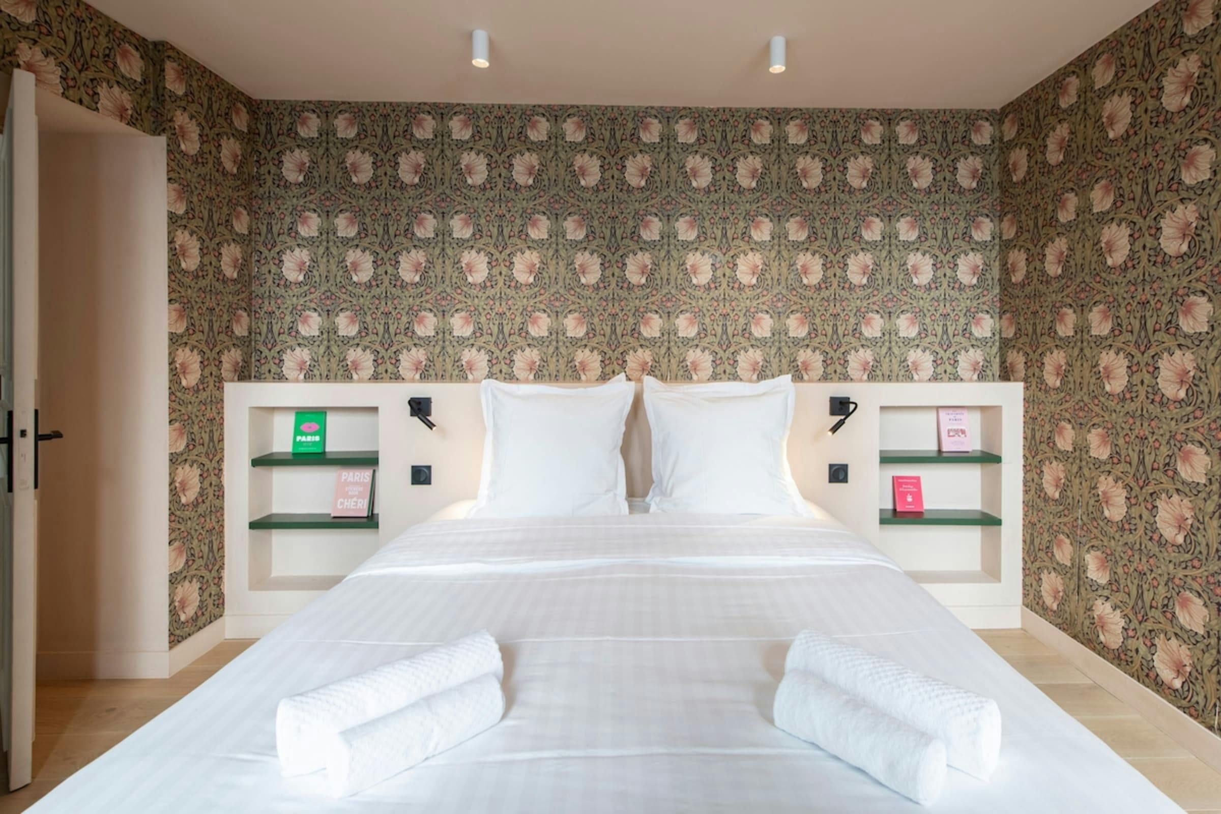 This deluxe apartment on the edge of New Athens marries beautiful furnishings with a coveted Paris location. The home was decorated by a professional in the traditional Haussmann style, creating a comfortable and sophisticated option for friend groups and families. The open plan living area flows into the kitchen and dining area, which are effectively one and the same – the dining table stands between the worktop and the oven, meaning chefs will need to be cautious ferrying hot dishes. The three bedrooms are distinct and characterful, though only one has an en-suite bathroom. Beyond the building, you'll be a twenty minute walk from both Montmartre and the Opera, and one minute from Notre-Dame-de-Lorette and the north-south 12 metro line.
