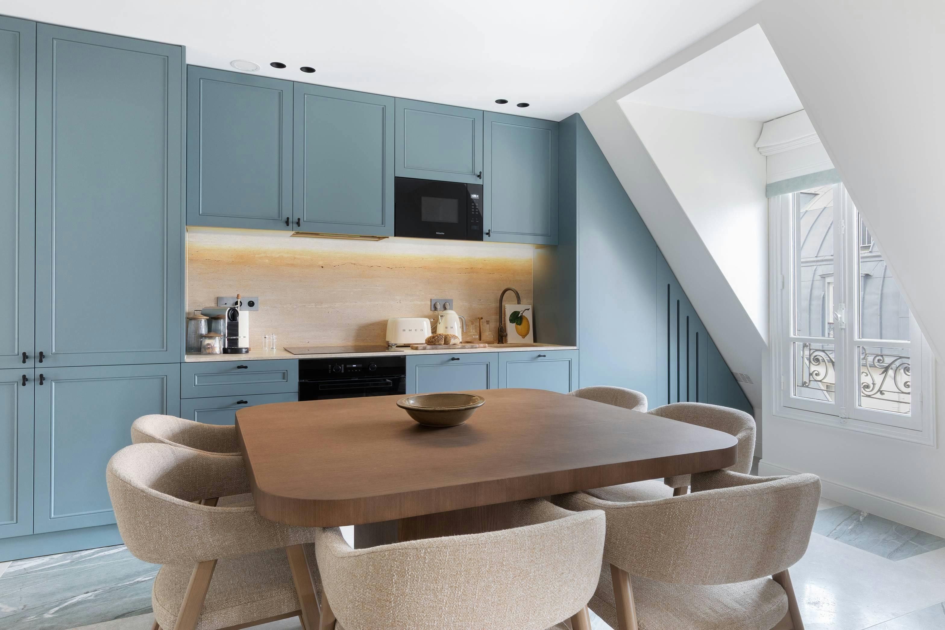 A key highlight of this apartment’s address, we’d say, is its proximity to the Champs-Élysées – it’s within easy walking distance. So that’s designer boutiques and world-class restaurants ticked off the list. Other places reachable on foot include the Palais Garnier, Place de la Concorde and Parc Monceau – the perfect place for a picnic. Back at this apartment, set over two levels, there’s a large and bright open-plan living room to relax in. This room also sleeps two guests on a sofa bed, so the space is flexible. After a day of sightseeing, you’ll look forward to returning to this stylish and comfortable home.