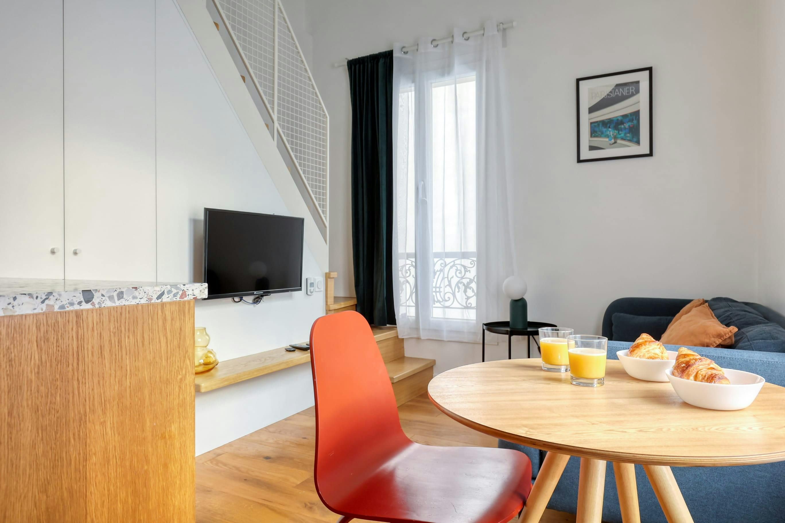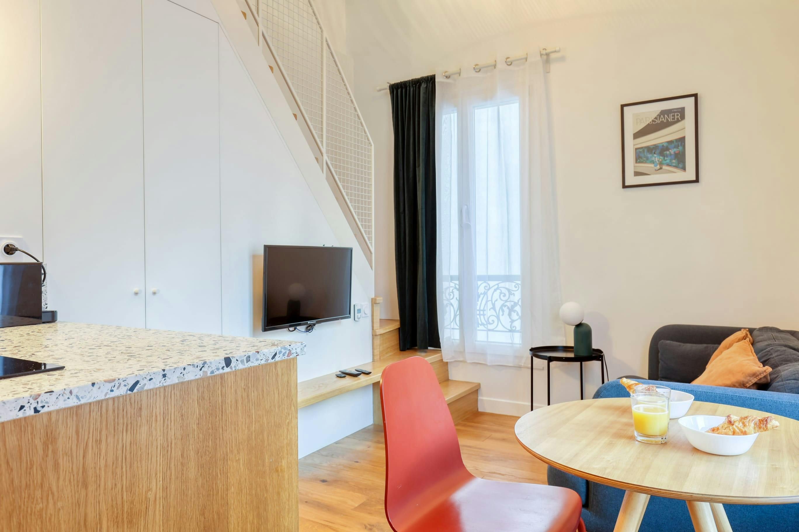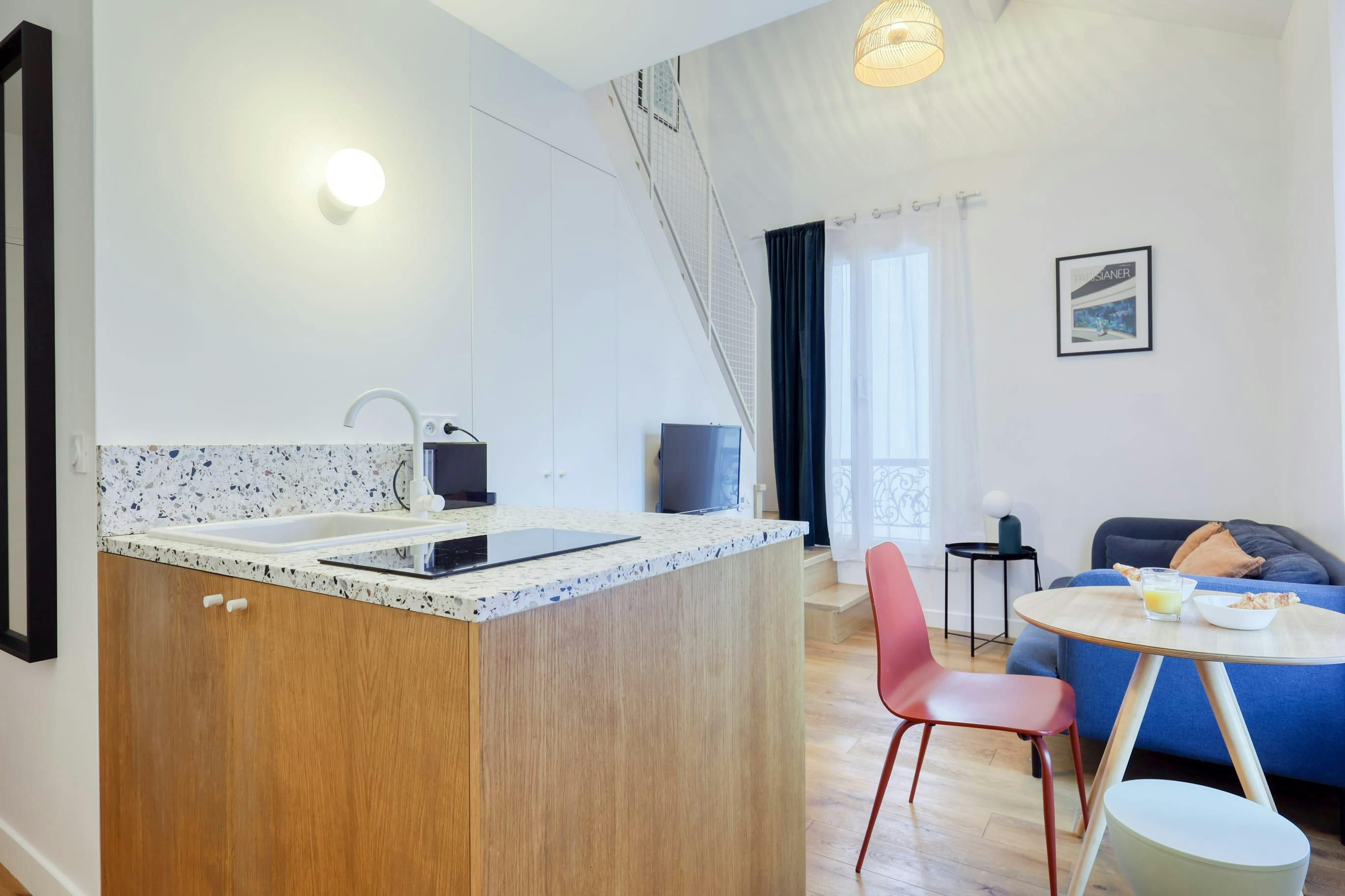 Cosy and comfortable for two, you’ll find this apartment in the heart of Montmartre. The open plan living and kitchen area feels quite spacious courtesy of the cathedral ceiling – by contrast, you’ll need to mind your head on the sloping ceiling of the bedroom which is tucked in the eaves. The courtyard is a quaint spot for a glass of wine of an evening, albeit shared with the building’s other guests. And while there’s no oven here, you’re surrounded by restaurants, so dining out is always on the menu.