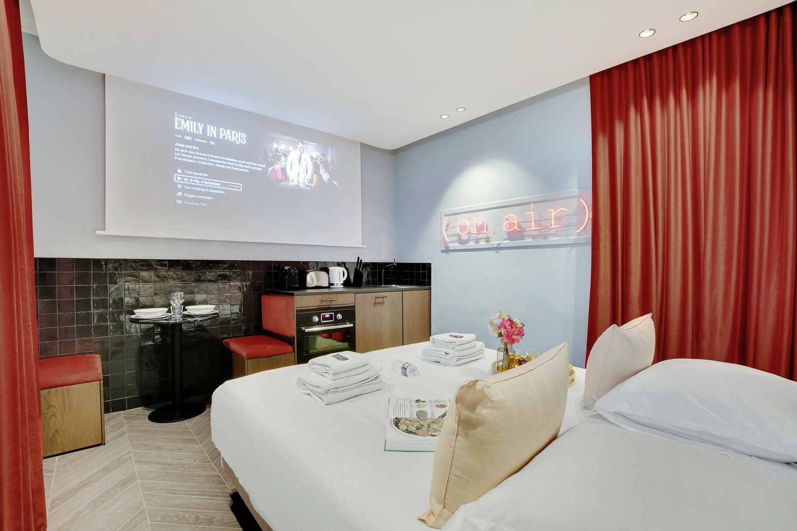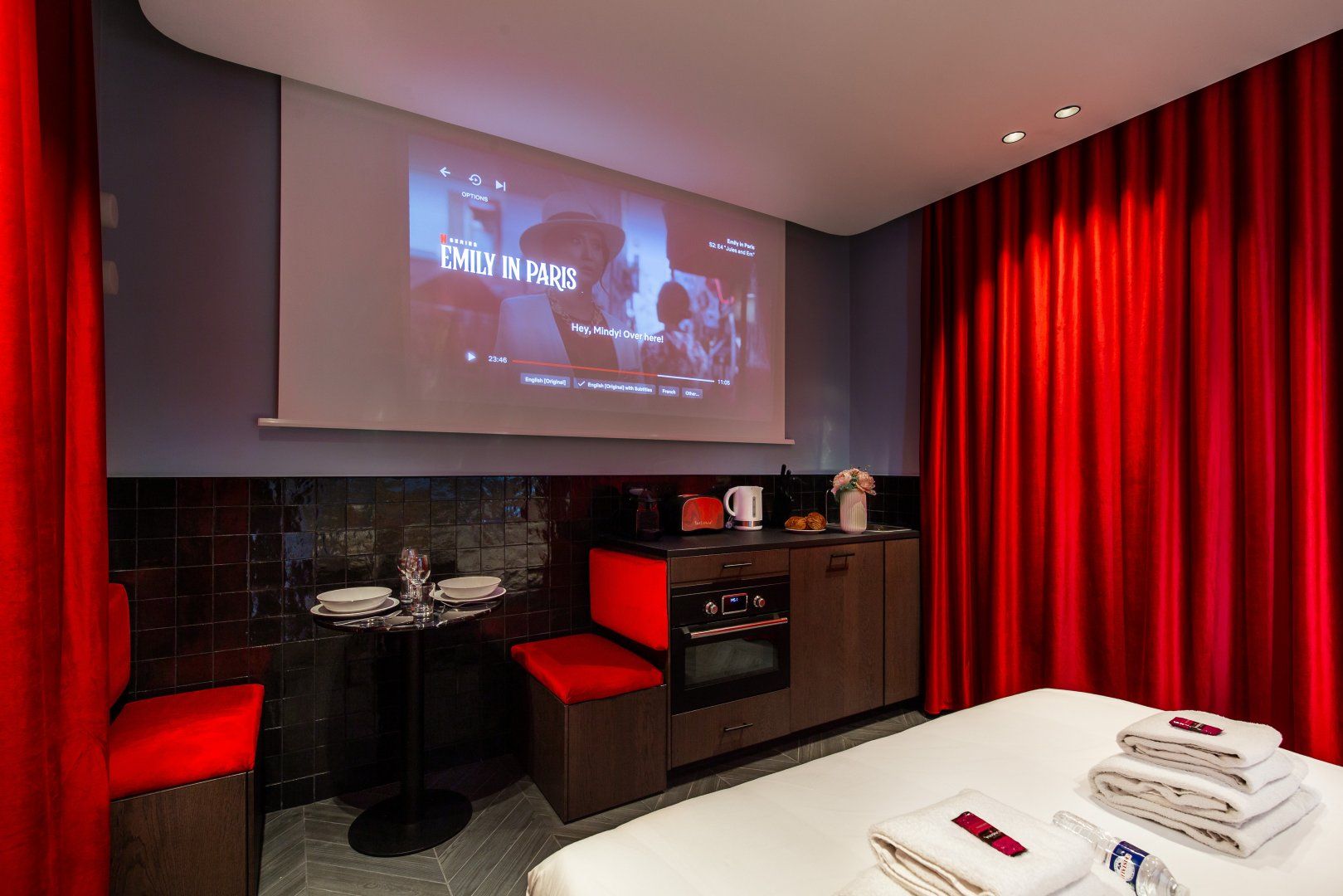 Take the best seat in the house for sightseeing and film night with this unique Paris studio apartment which offers its own home cinema and whirlpool bathtub. See the city from the Montparnasse Tower – reachable in a short fourteen-minute walk from your door – and explore all the bucket list attractions including the Eiffel Tower – which is roughly thirty minutes away on the metro.